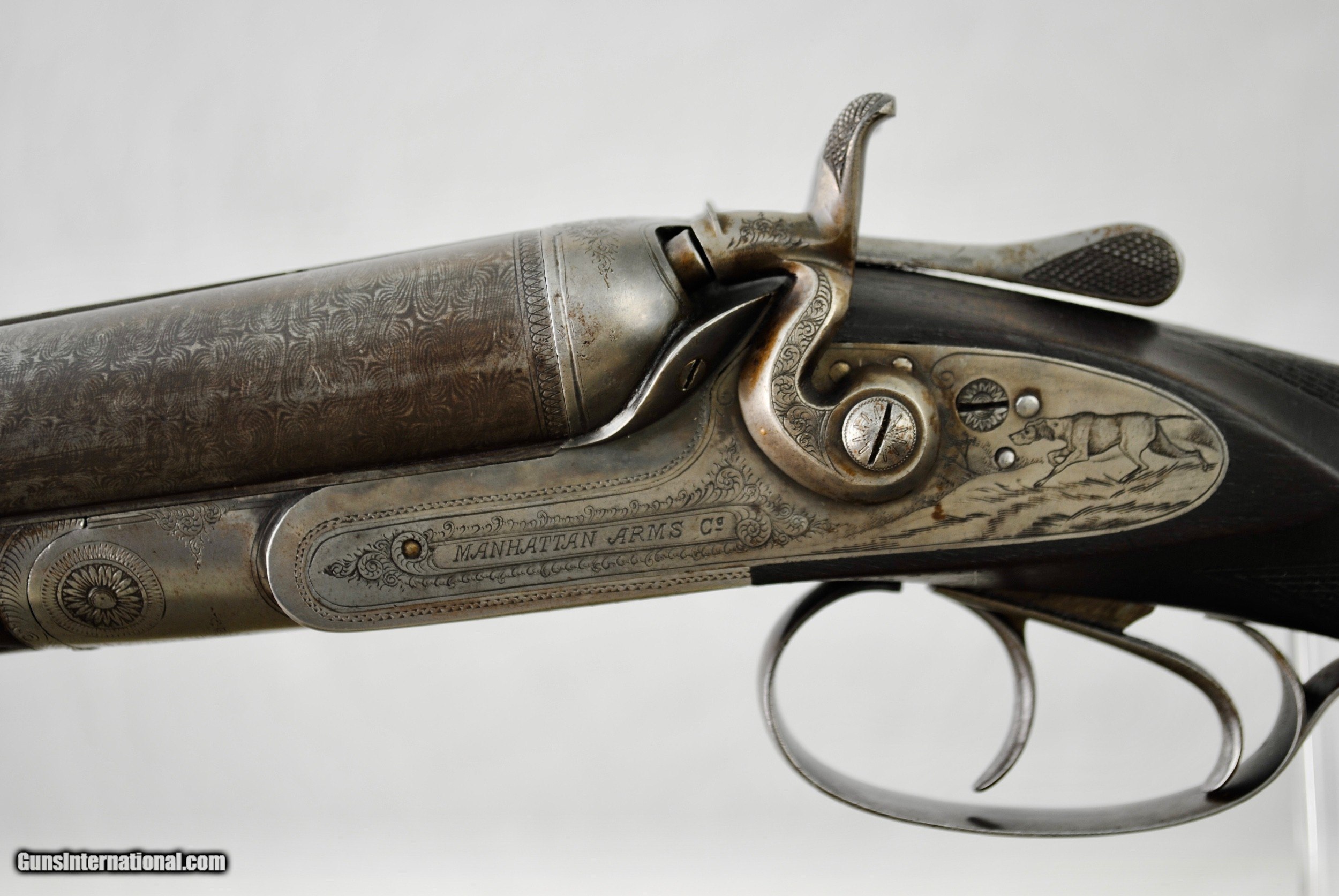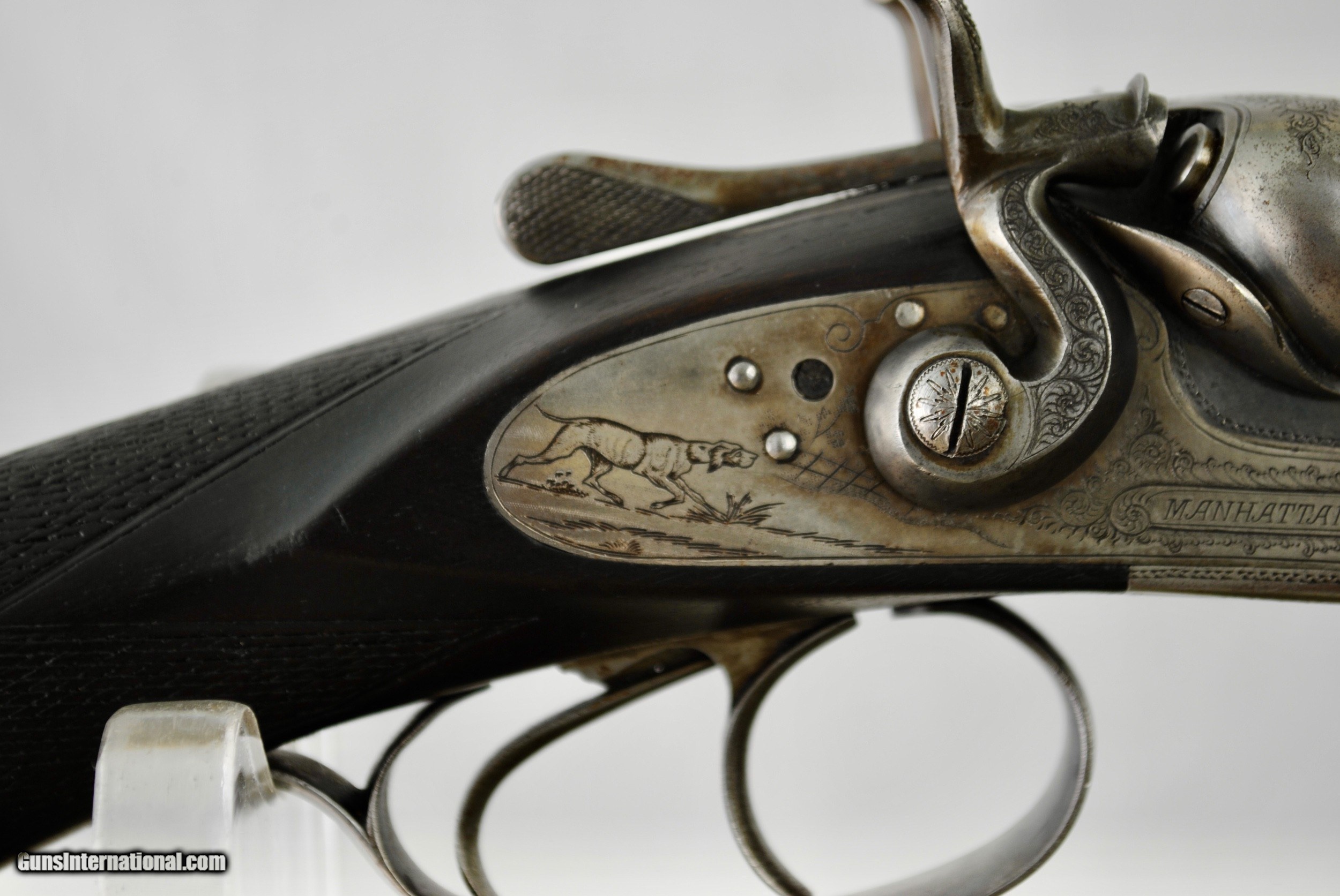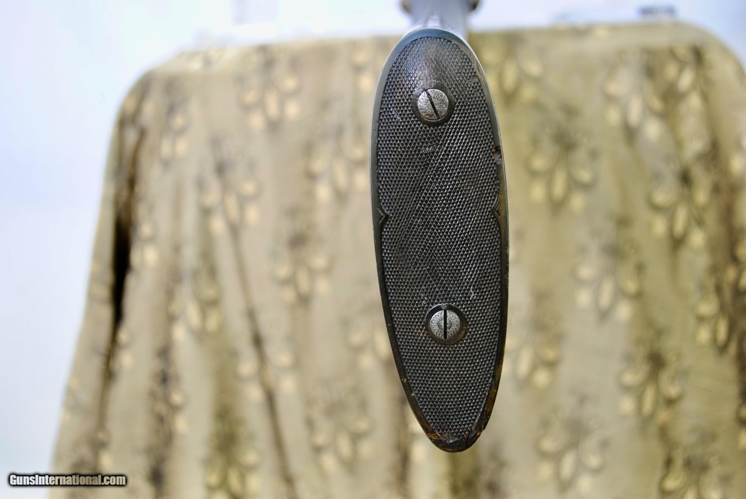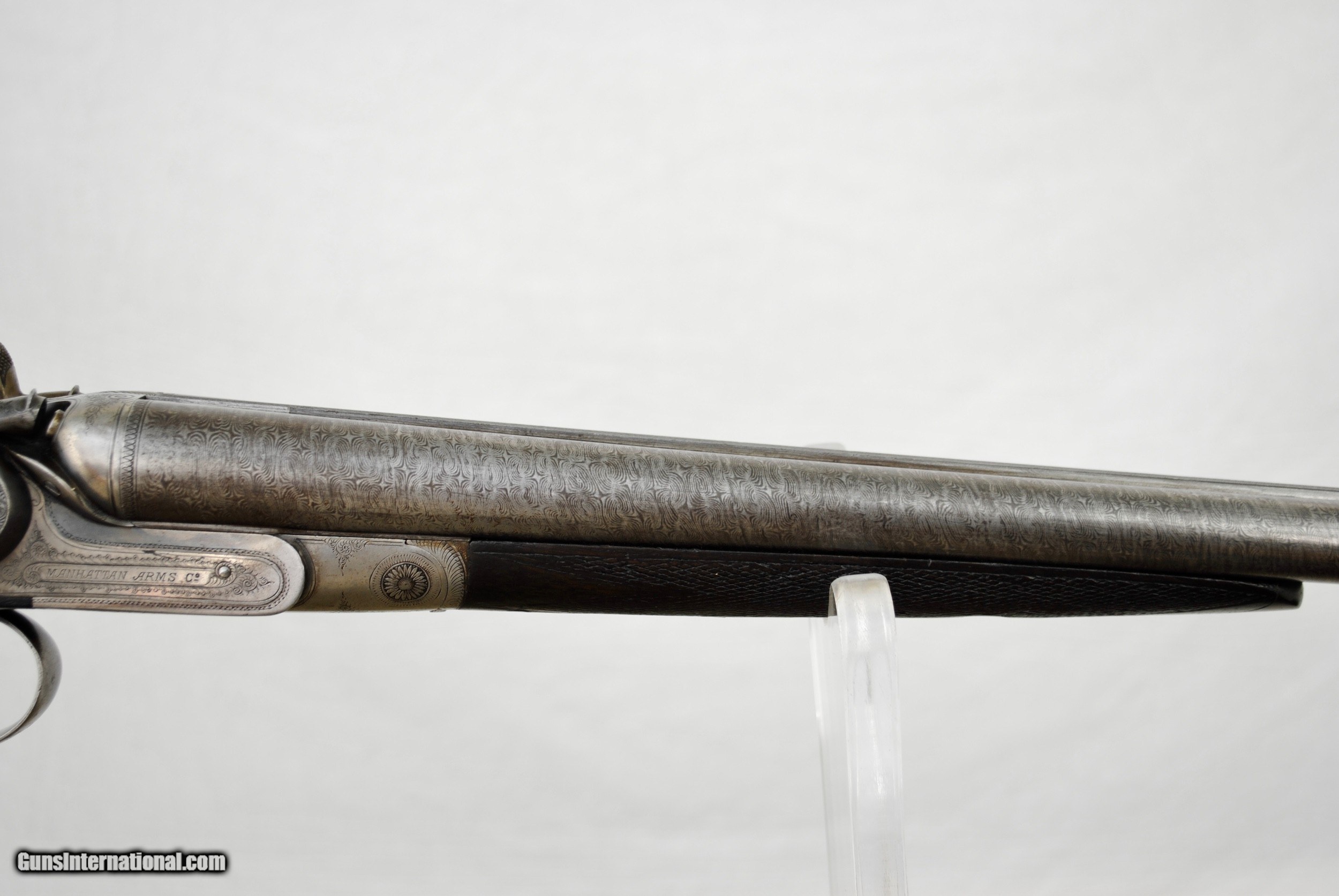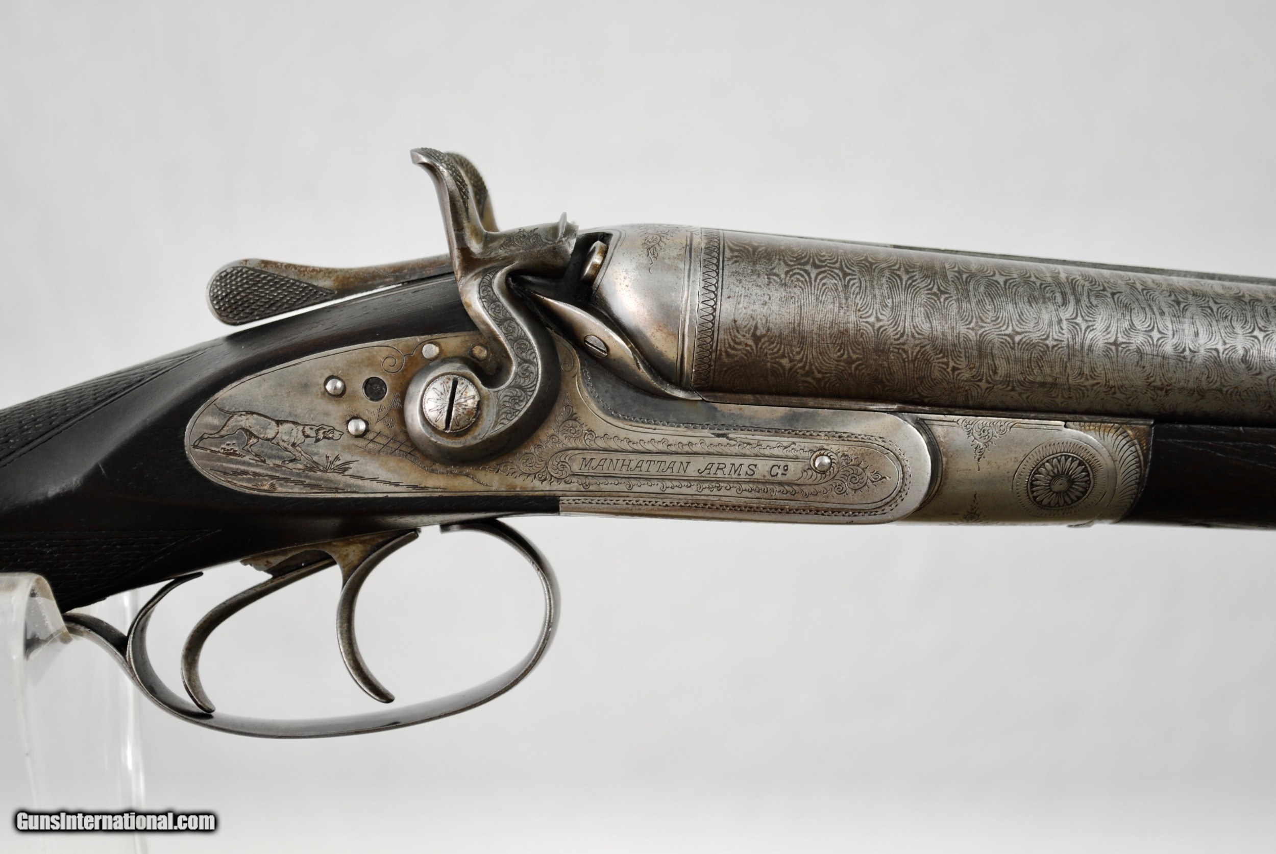 Description: Manhatten Arms 16 gauge hammer shotgun. Attractive game scene and scroll engraved. Manhattaan Arms was a trade name used by both Schoverling, Daly & Gates as well as Von Lengerke & Detmold both of New York City. The Belgian guns imported under this name were Neumann Freres and Dumoulin, both quality makers. This gun appears to be a presentation piece with an carved inset in the wood "Williamsport, Penn, ALS, 1887". Gun is fully functional. Bores have some internal light surface pitting but are very bright overall. Chambers measure 2 5/8". Externally the Belgian Star Damascus pattern is quite vibrant and attractive. Barrels measure 28". Gun is very slightly loose on face. If a rejointing is requested I can undertake this for a nominal fee. Small toe repair - see last photo. Gun has rebounding hammers. Ribs are solid and barrels ring nicely. All serial numbers numbers. Shipping is $50 and can be sent directly as local law allows. Weight of gun is 6 LBS 5 OZ. LOP is 14 1/8". Drop at comb - 1 10/16". Drop at heel - 2 3/4". SOLD Antique: Yes Shotgun Gauge: 16 Gauge |