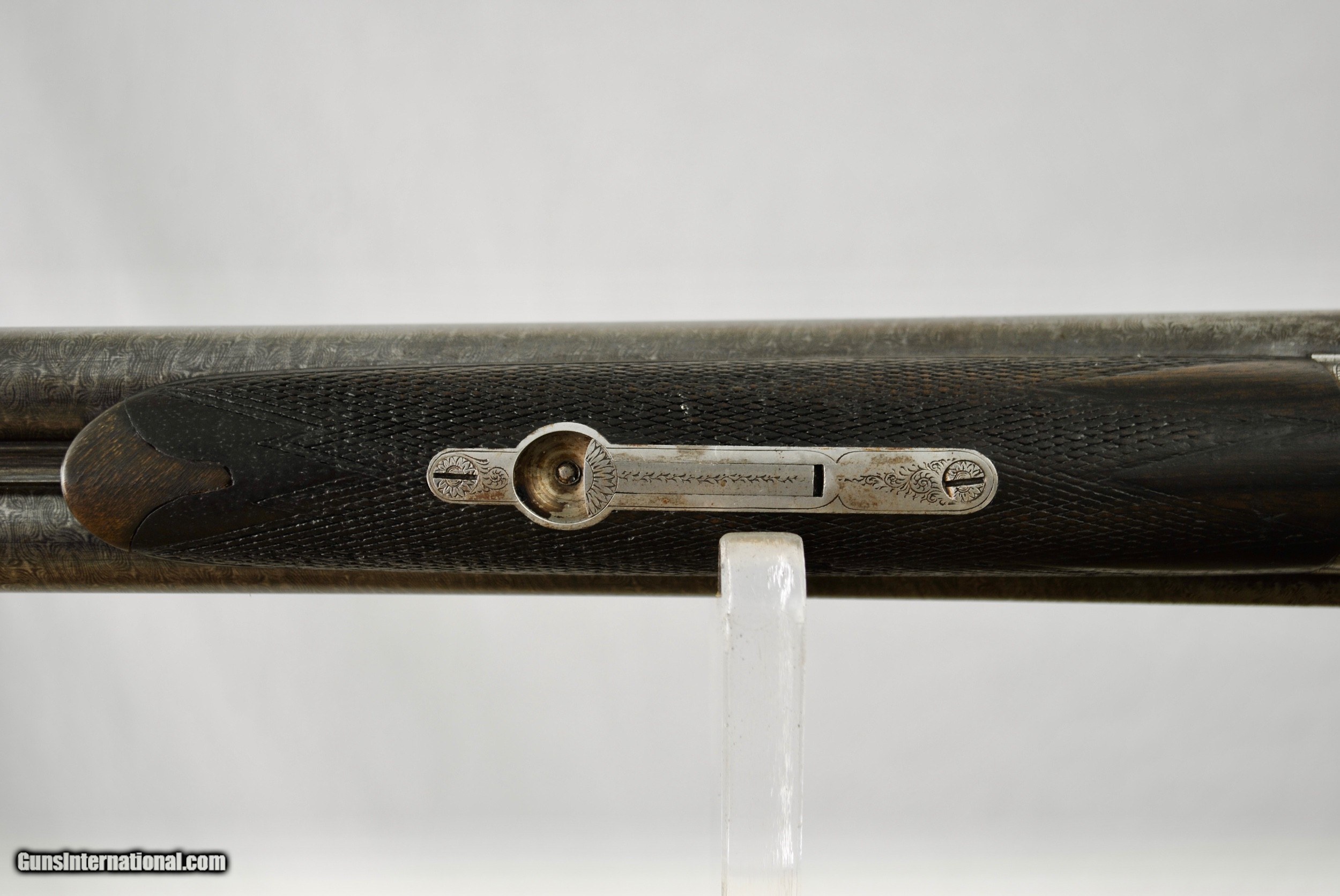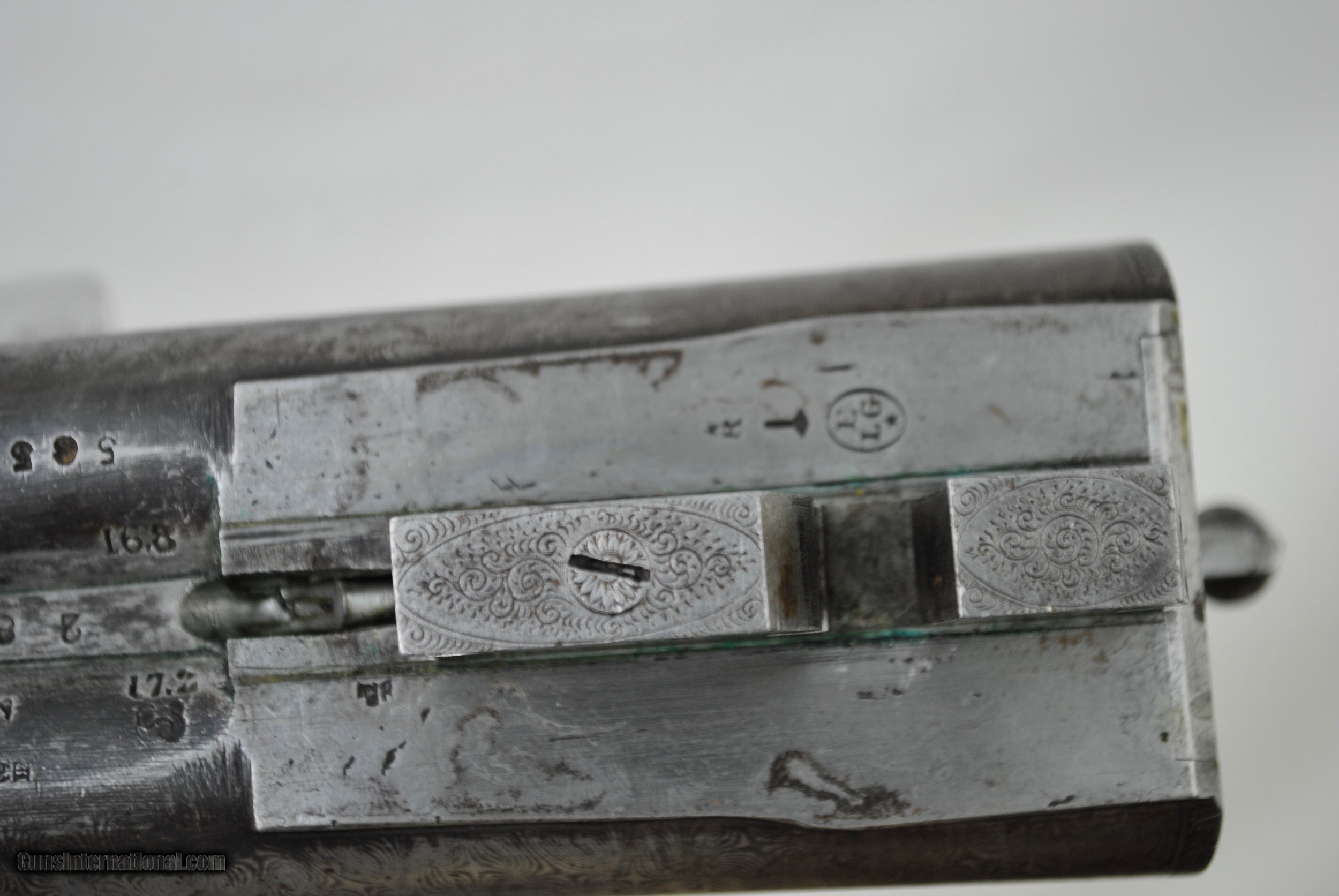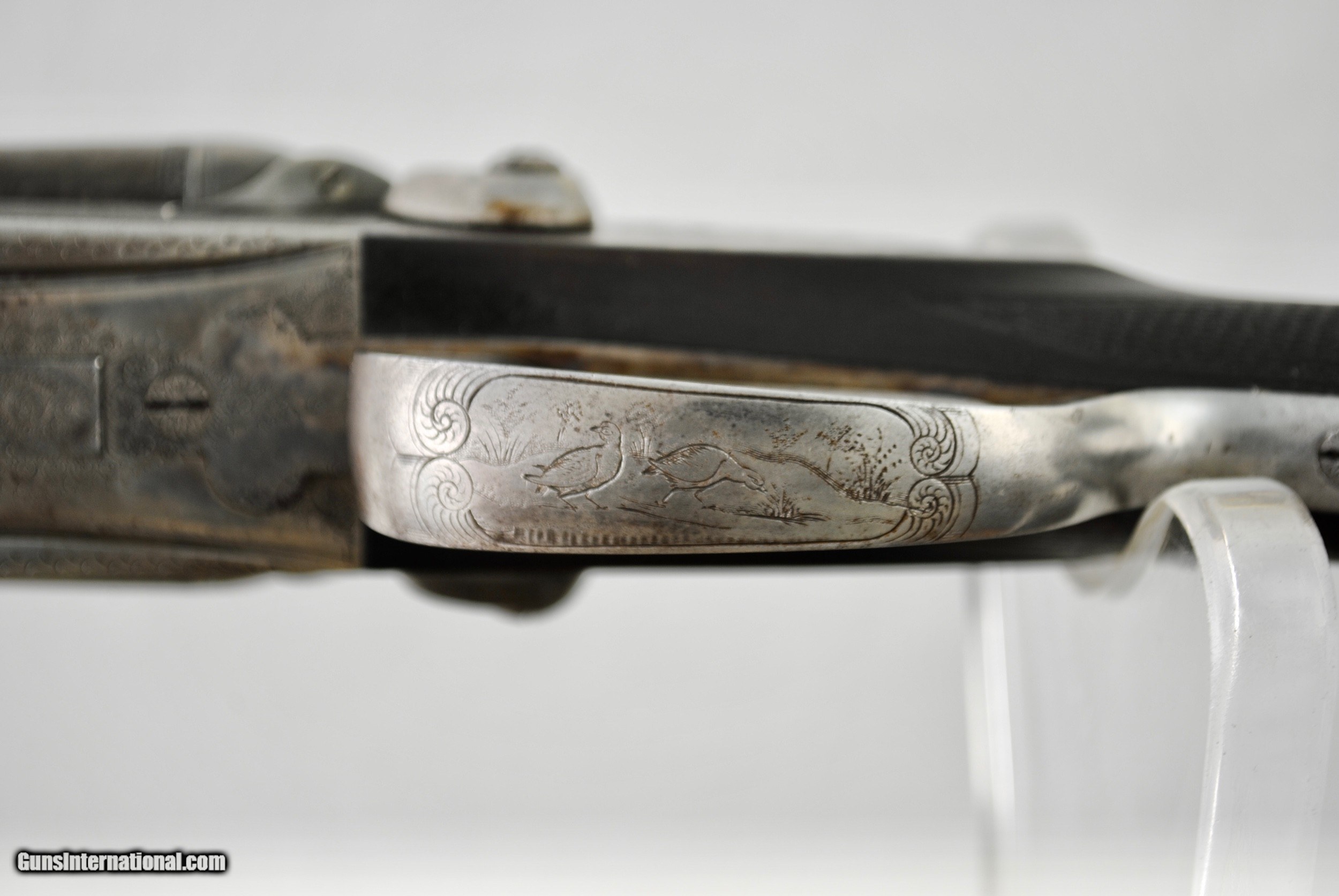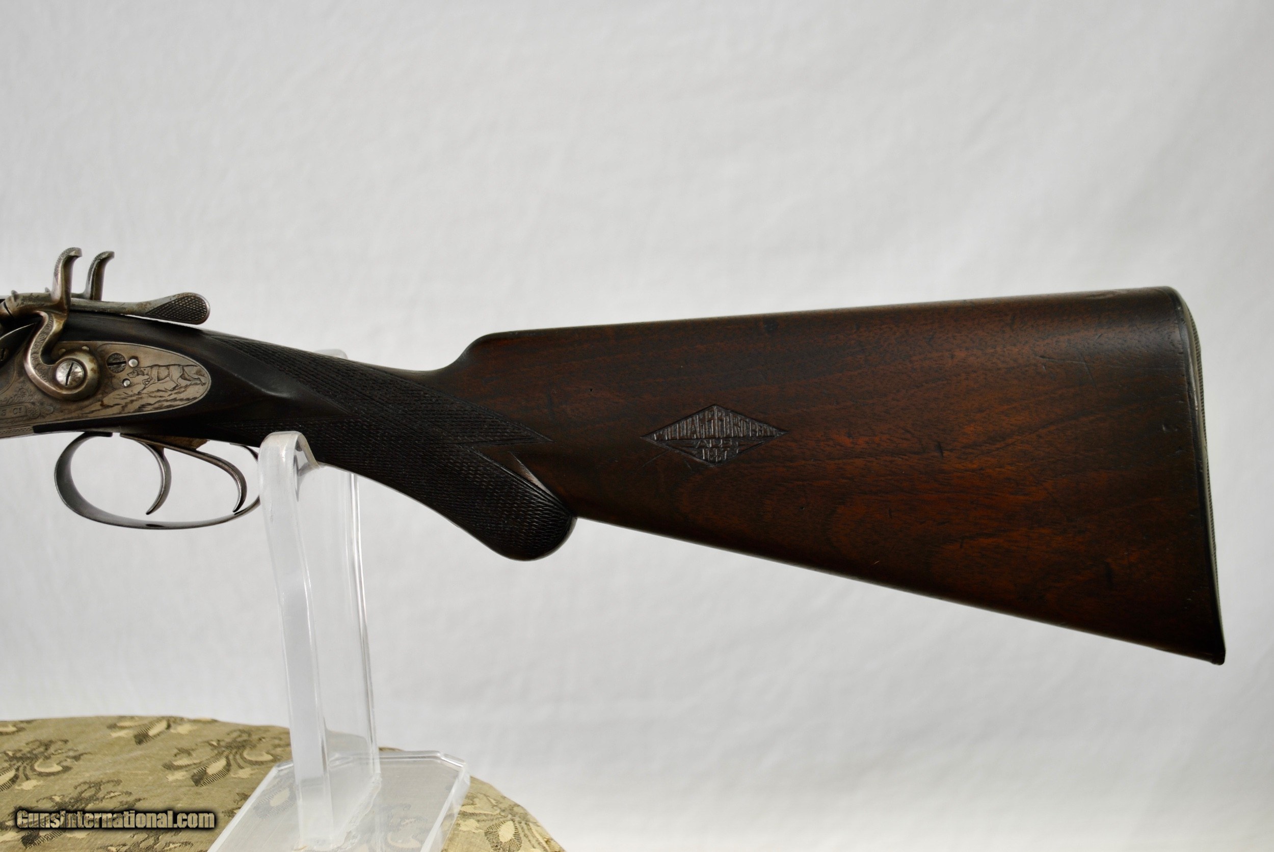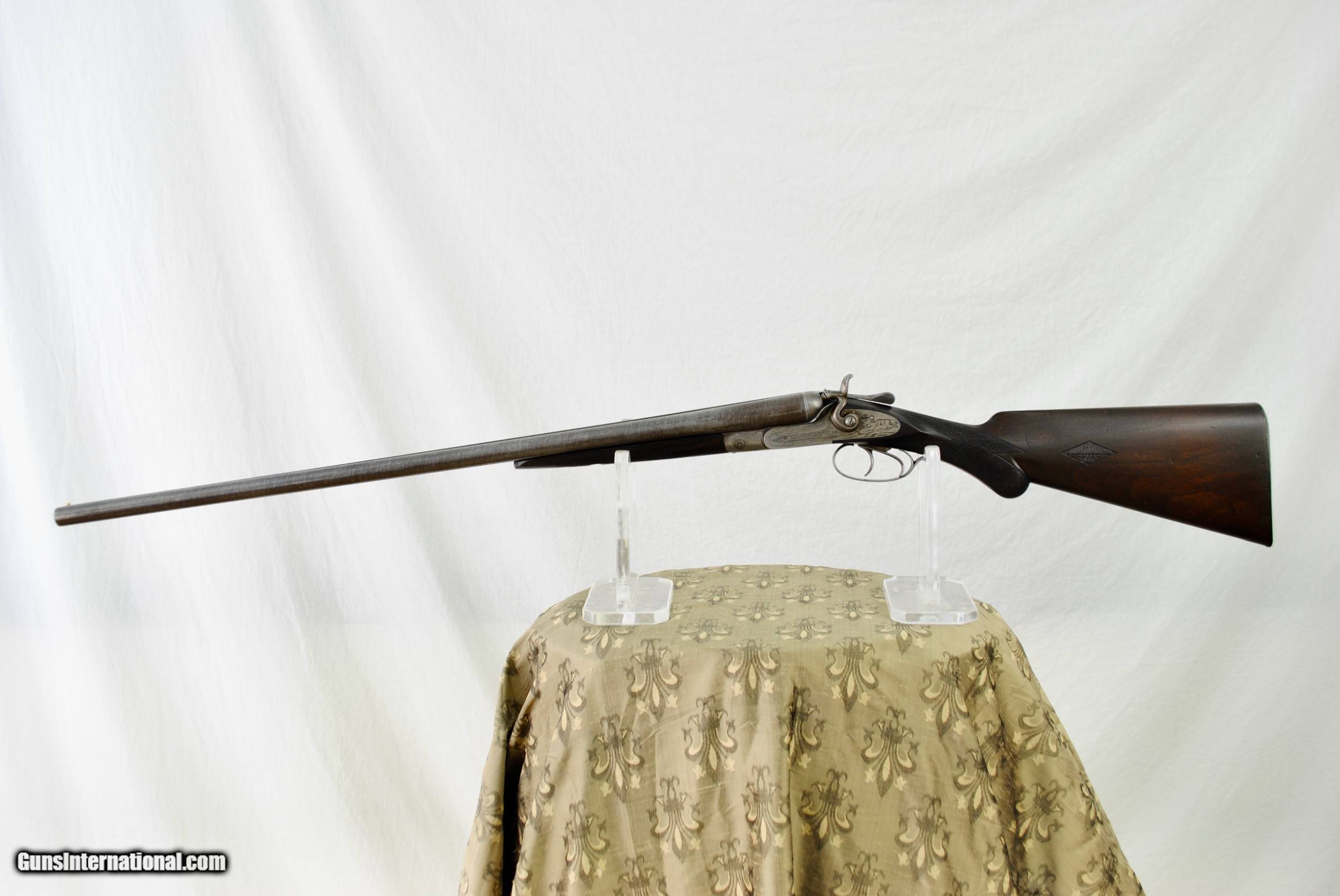 Description: Manhatten Arms 16 gauge hammer shotgun. Attractive game scene and scroll engraved. Manhattaan Arms was a trade name used by both Schoverling, Daly & Gates as well as Von Lengerke & Detmold both of New York City. The Belgian guns imported under this name were Neumann Freres and Dumoulin, both quality makers. This gun appears to be a presentation piece with an carved inset in the wood "Williamsport, Penn, ALS, 1887". Gun is fully functional. Bores have some internal light surface pitting but are very bright overall. Chambers measure 2 5/8". Externally the Belgian Star Damascus pattern is quite vibrant and attractive. Barrels measure 28". Gun is very slightly loose on face. If a rejointing is requested I can undertake this for a nominal fee. Small toe repair - see last photo. Gun has rebounding hammers. Ribs are solid and barrels ring nicely. All serial numbers numbers. Shipping is $50 and can be sent directly as local law allows. Weight of gun is 6 LBS 5 OZ. LOP is 14 1/8". Drop at comb - 1 10/16". Drop at heel - 2 3/4". SOLD Antique: Yes Shotgun Gauge: 16 Gauge |