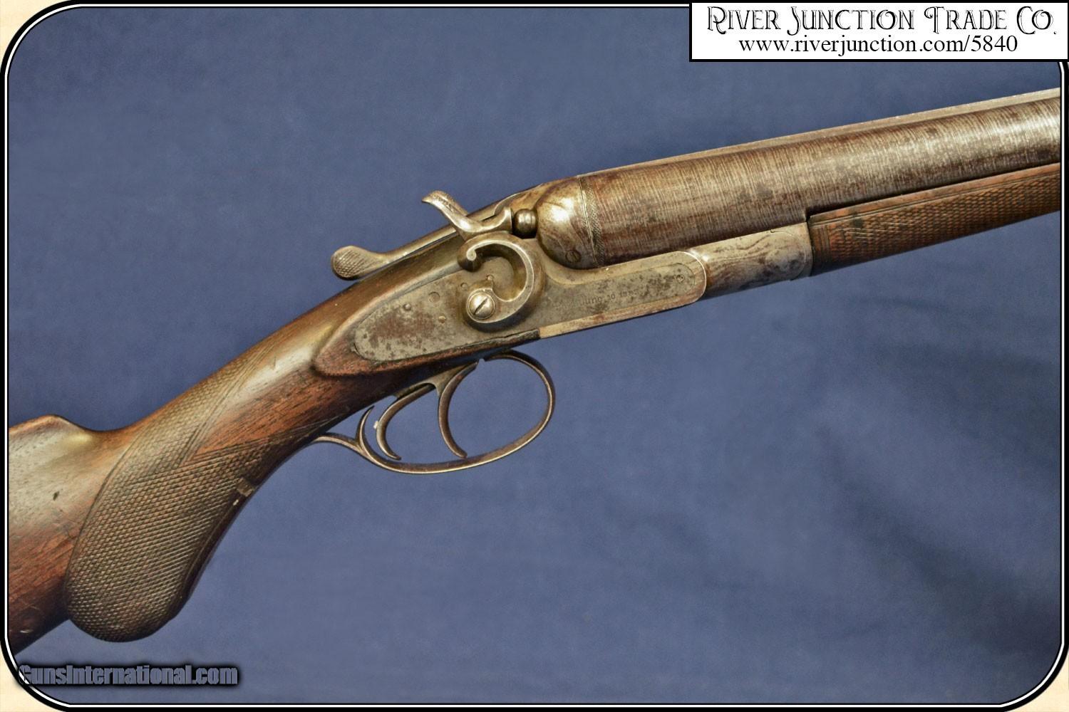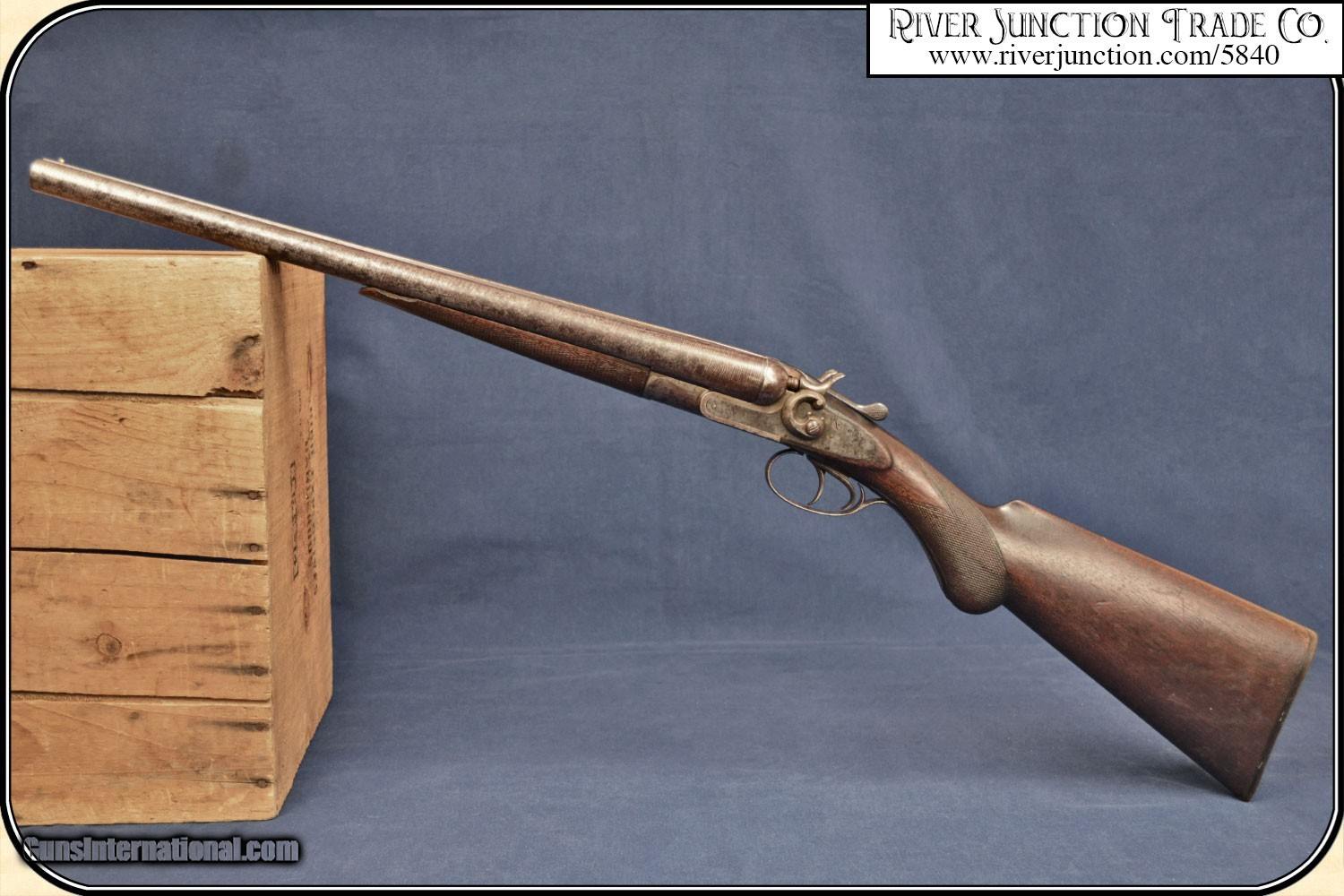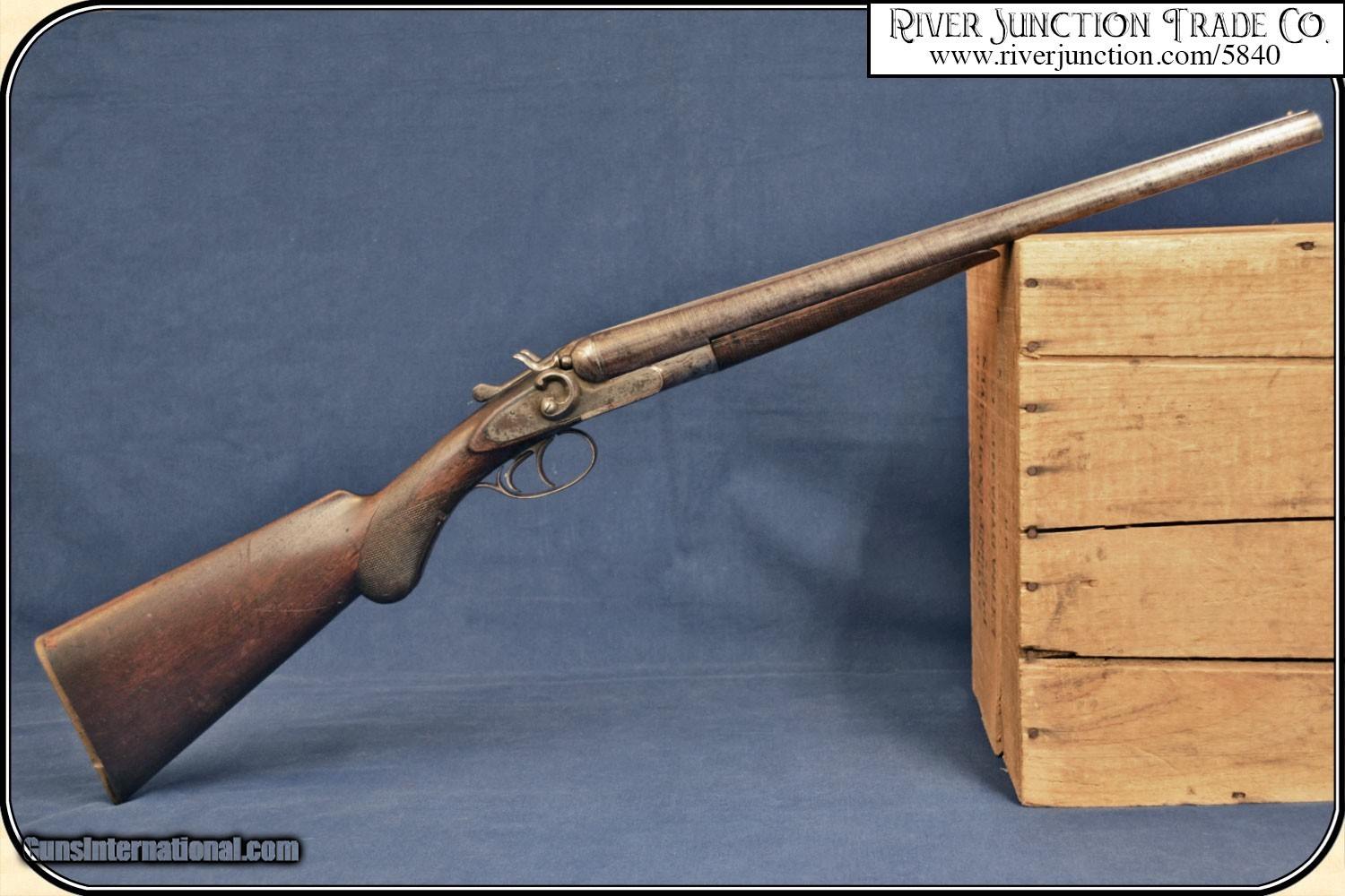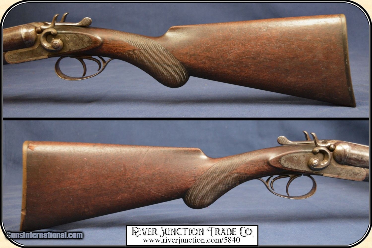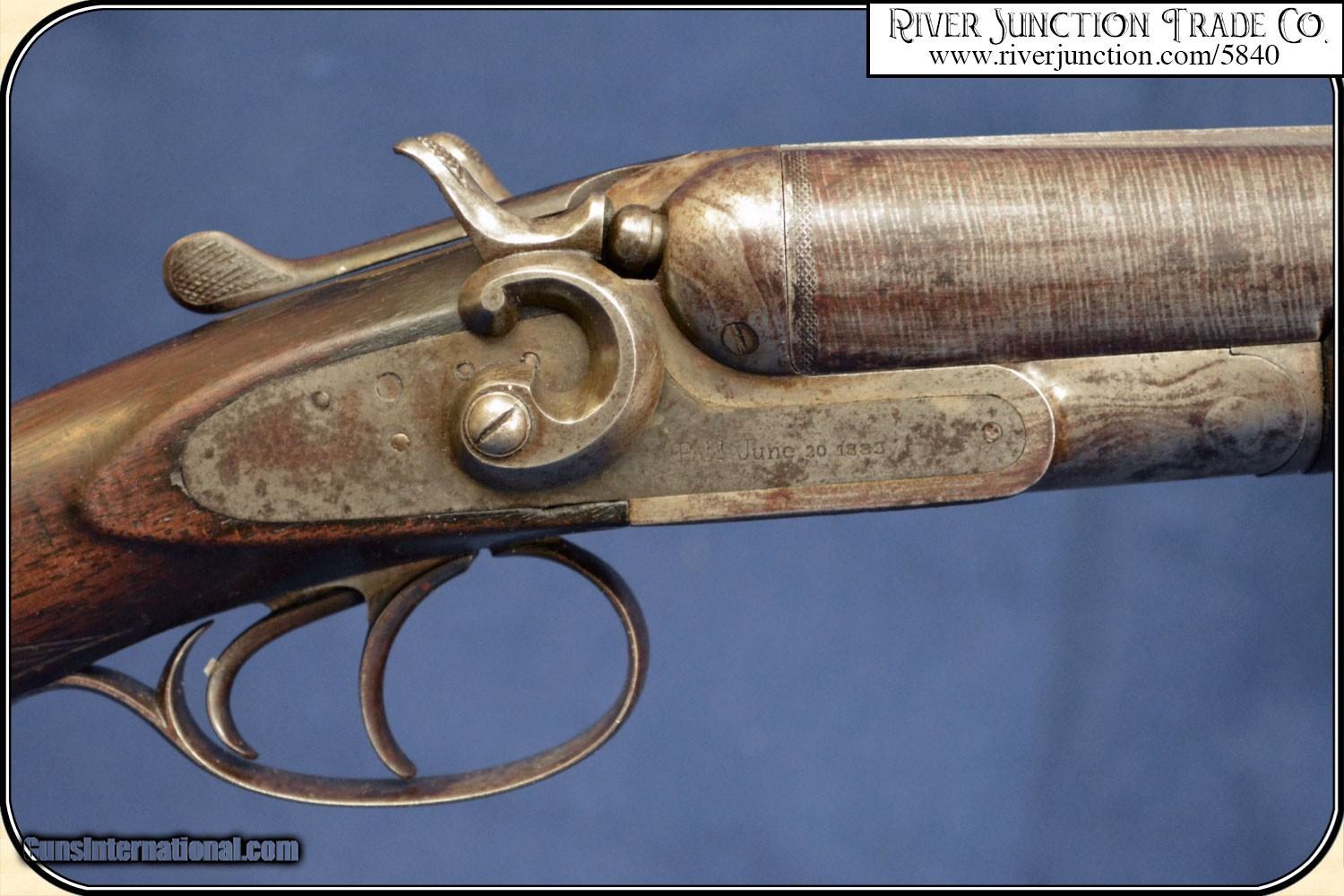 Description: Coach Gun / Saw off shot gun / Street Howitzer / Scatter Gun. The Coach Gun received its many monikers on the stagecoaches and streets of the Wild West. Stagecoach companies quickly implemented the use of guards to ride along side the driver carrying a weapon that allowed for some leeway in accuracy as they bounced along the bumpy trails. Cut-down versions of the Stagecoach Shotgun were also popular among Marshals and Sheriffs for their mobility and lenient accuracy at close quarters. Thumb the locking lever and you can break open the gun to reveal the lead-spitting barrels of this close-quarters defense weapon. The barrels show some light pitting, but much less than most of these antique shotguns. Close and lock the barrels and cock both hammers. Finger the double triggers one at a time and the hammers will fall. On the plains of the late 19th century there was nothing else like the sound of a shotgun hammer. The feel and action of this legendary Old West tool will transport you back to the Dakota Territory, when your trusty shotgun was your last and best line of defense. Features Overall Length: 35", barrels 19 inches with 2 1/2 inch chambers. Lock up is very tight and secure. On the top of the left barrel it is marked TRAP GUN MACHINE MADE LAMINATED STEEL. There is a NICE brown patina on the damascus steel barrels. The hard rubber butt plate shows a browning tone from age without any cracks. The stock has a chip near the heal of the butt plate. Marked on the left lock "MACHINE MADE". On the right lock is marked "Pat'd June 10 1883" Both locks show a brownish patina, slight traces of case color. This Coach Gun is in good shape. Great for cowboy loads or blanks. SOLD Shotgun Gauge: 12 Gauge |