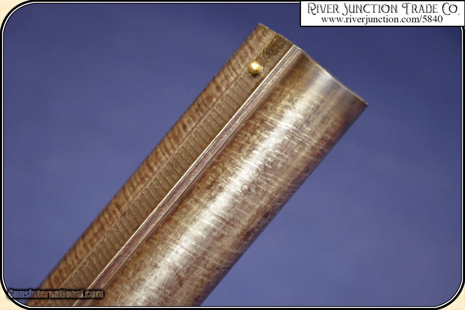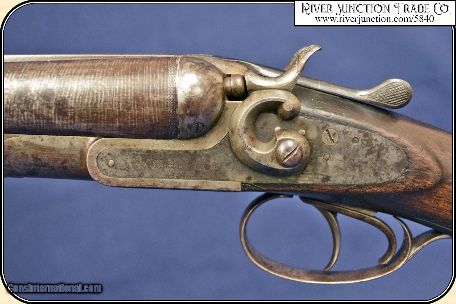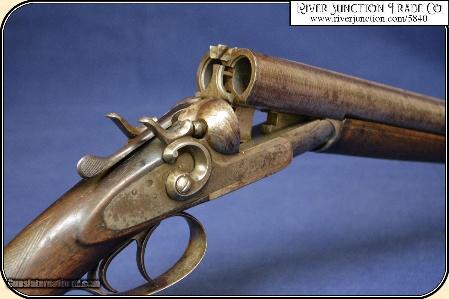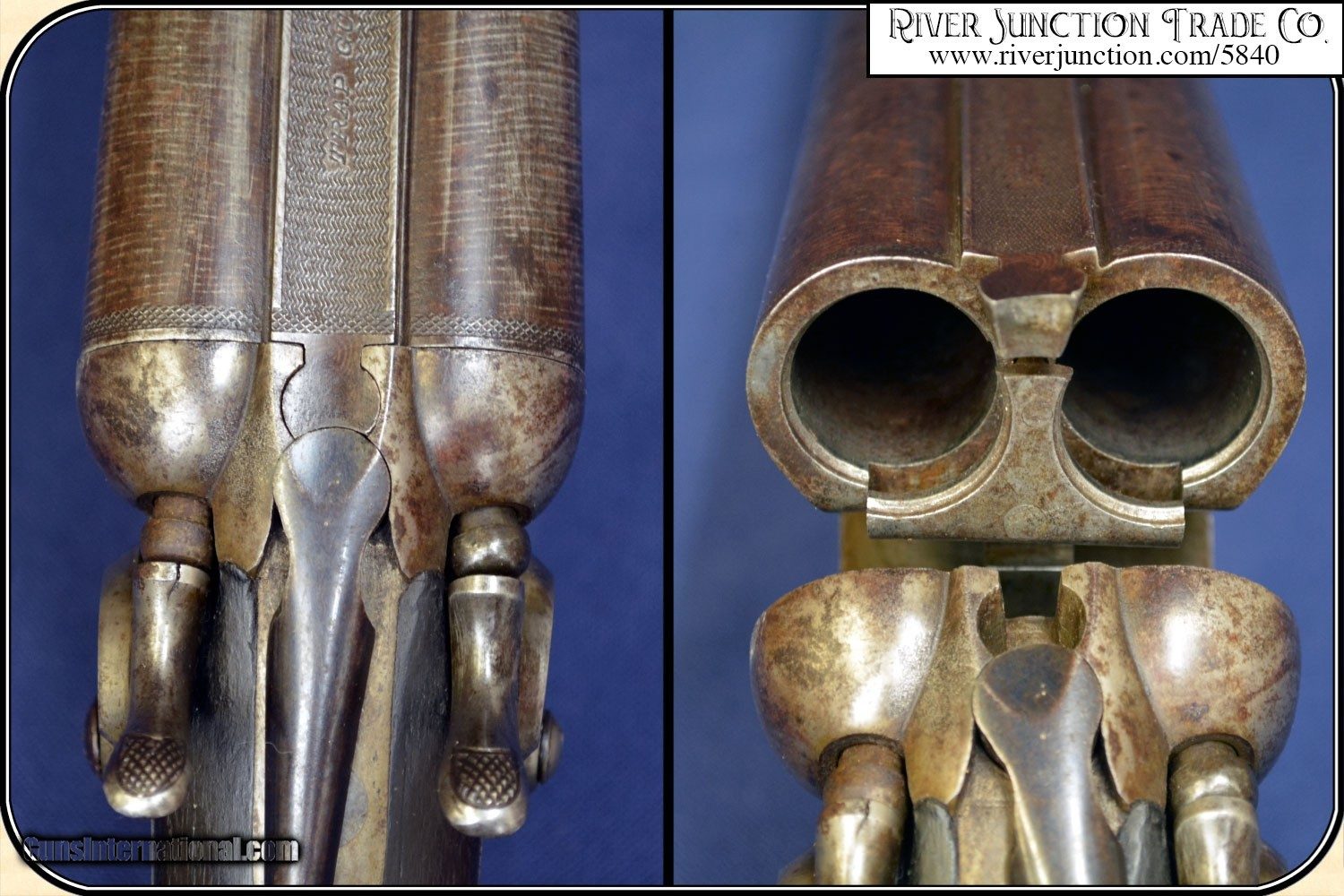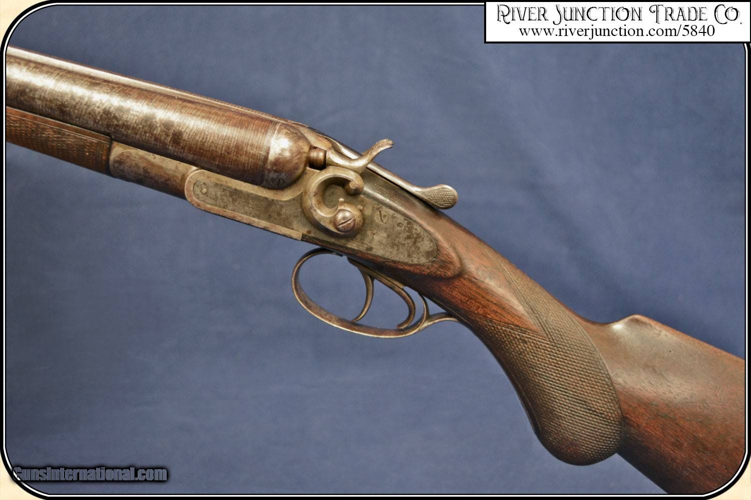 Description: Coach Gun / Saw off shot gun / Street Howitzer / Scatter Gun. The Coach Gun received its many monikers on the stagecoaches and streets of the Wild West. Stagecoach companies quickly implemented the use of guards to ride along side the driver carrying a weapon that allowed for some leeway in accuracy as they bounced along the bumpy trails. Cut-down versions of the Stagecoach Shotgun were also popular among Marshals and Sheriffs for their mobility and lenient accuracy at close quarters. Thumb the locking lever and you can break open the gun to reveal the lead-spitting barrels of this close-quarters defense weapon. The barrels show some light pitting, but much less than most of these antique shotguns. Close and lock the barrels and cock both hammers. Finger the double triggers one at a time and the hammers will fall. On the plains of the late 19th century there was nothing else like the sound of a shotgun hammer. The feel and action of this legendary Old West tool will transport you back to the Dakota Territory, when your trusty shotgun was your last and best line of defense. Features Overall Length: 35", barrels 19 inches with 2 1/2 inch chambers. Lock up is very tight and secure. On the top of the left barrel it is marked TRAP GUN MACHINE MADE LAMINATED STEEL. There is a NICE brown patina on the damascus steel barrels. The hard rubber butt plate shows a browning tone from age without any cracks. The stock has a chip near the heal of the butt plate. Marked on the left lock "MACHINE MADE". On the right lock is marked "Pat'd June 10 1883" Both locks show a brownish patina, slight traces of case color. This Coach Gun is in good shape. Great for cowboy loads or blanks. SOLD Shotgun Gauge: 12 Gauge |
