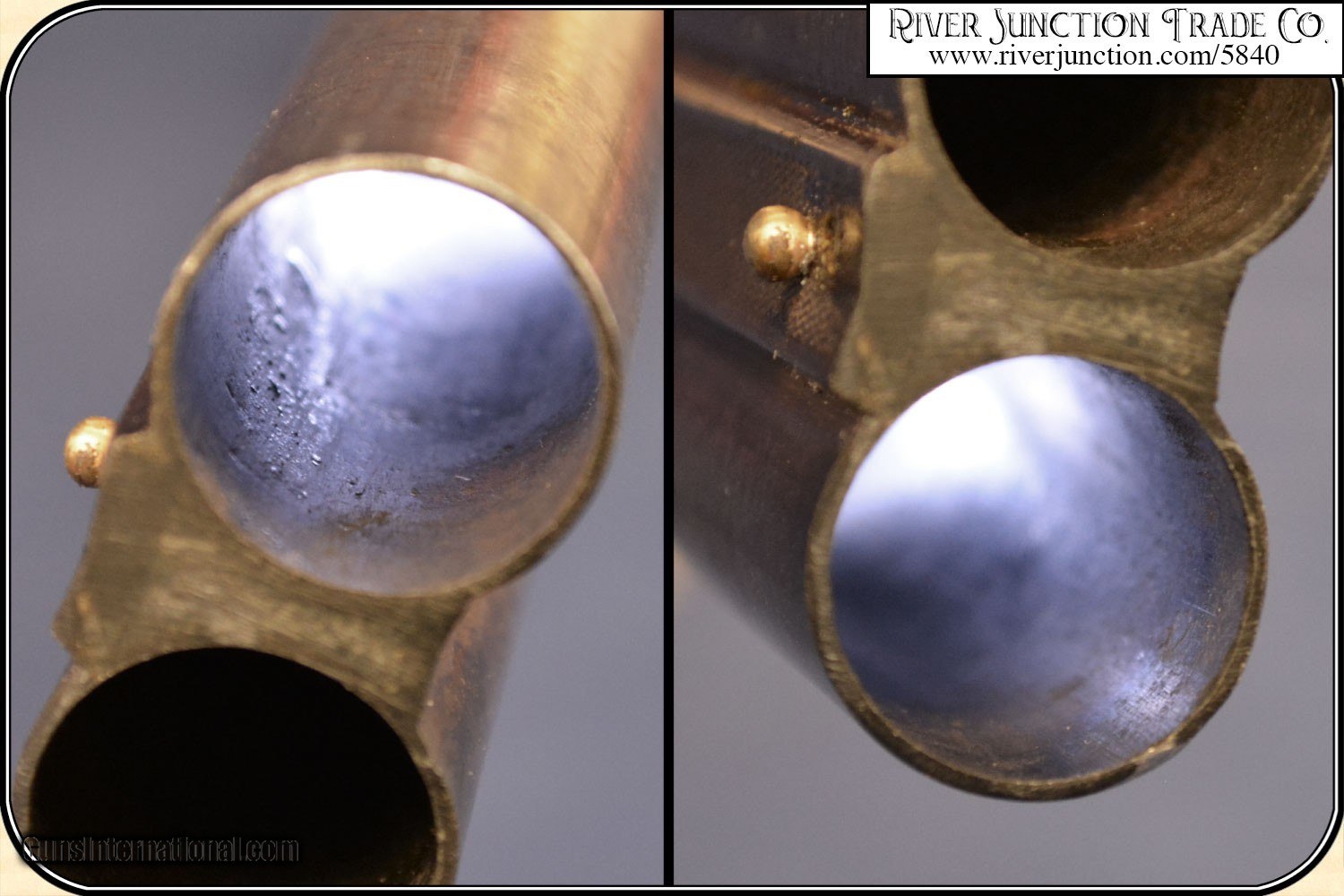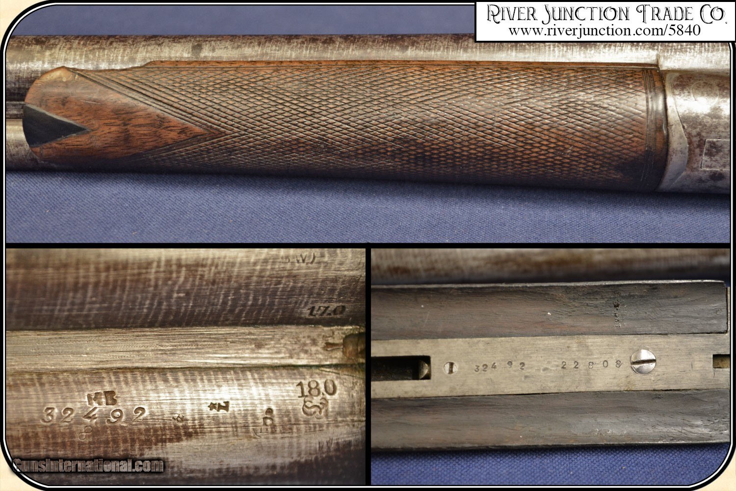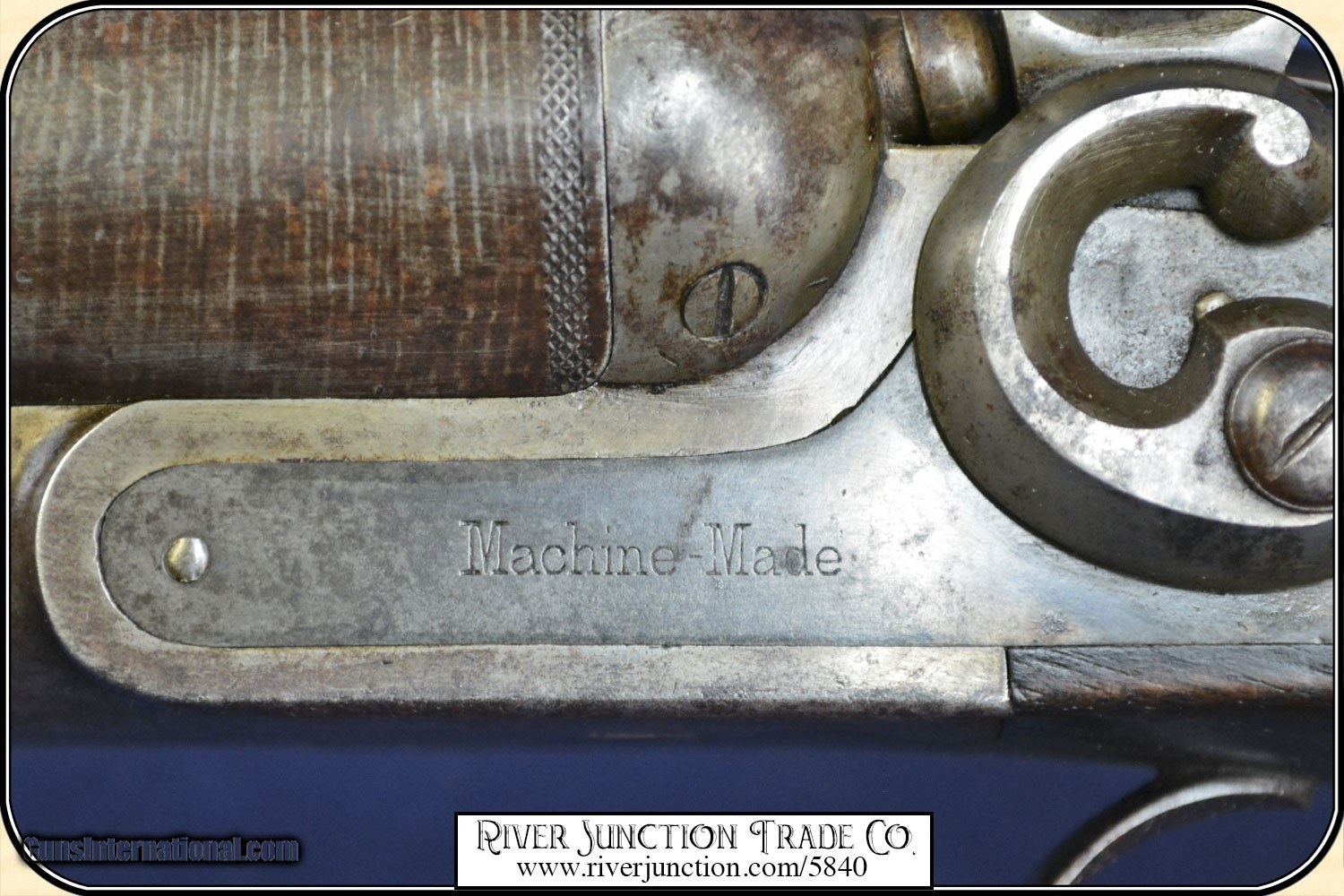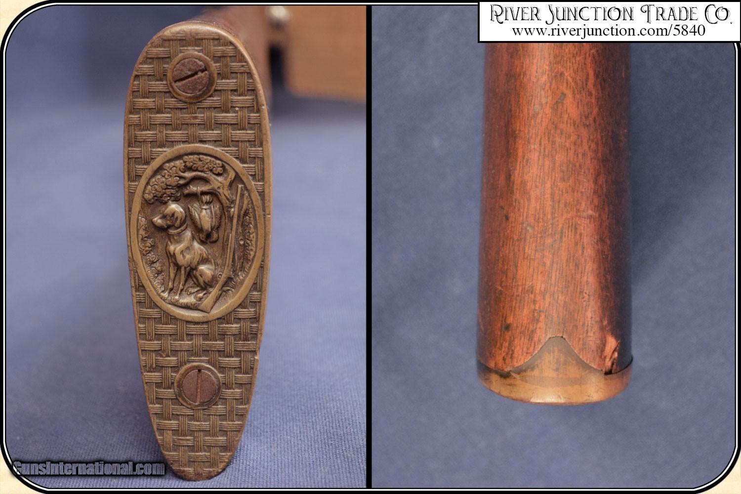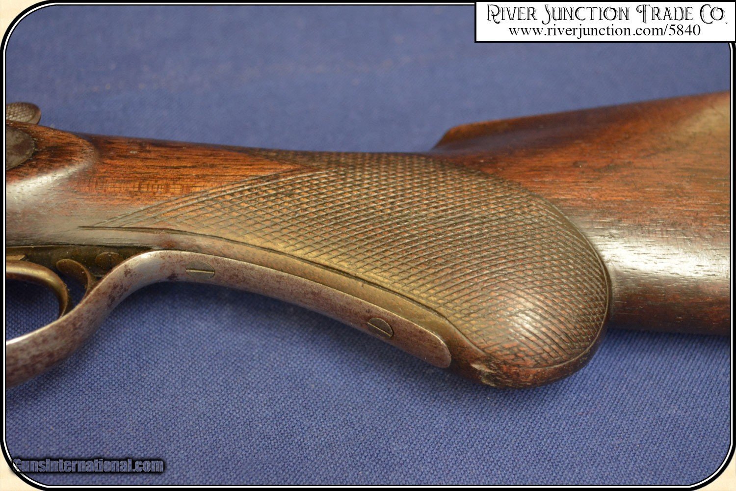 Description: Coach Gun / Saw off shot gun / Street Howitzer / Scatter Gun. The Coach Gun received its many monikers on the stagecoaches and streets of the Wild West. Stagecoach companies quickly implemented the use of guards to ride along side the driver carrying a weapon that allowed for some leeway in accuracy as they bounced along the bumpy trails. Cut-down versions of the Stagecoach Shotgun were also popular among Marshals and Sheriffs for their mobility and lenient accuracy at close quarters. Thumb the locking lever and you can break open the gun to reveal the lead-spitting barrels of this close-quarters defense weapon. The barrels show some light pitting, but much less than most of these antique shotguns. Close and lock the barrels and cock both hammers. Finger the double triggers one at a time and the hammers will fall. On the plains of the late 19th century there was nothing else like the sound of a shotgun hammer. The feel and action of this legendary Old West tool will transport you back to the Dakota Territory, when your trusty shotgun was your last and best line of defense. Features Overall Length: 35", barrels 19 inches with 2 1/2 inch chambers. Lock up is very tight and secure. On the top of the left barrel it is marked TRAP GUN MACHINE MADE LAMINATED STEEL. There is a NICE brown patina on the damascus steel barrels. The hard rubber butt plate shows a browning tone from age without any cracks. The stock has a chip near the heal of the butt plate. Marked on the left lock "MACHINE MADE". On the right lock is marked "Pat'd June 10 1883" Both locks show a brownish patina, slight traces of case color. This Coach Gun is in good shape. Great for cowboy loads or blanks. SOLD Shotgun Gauge: 12 Gauge |