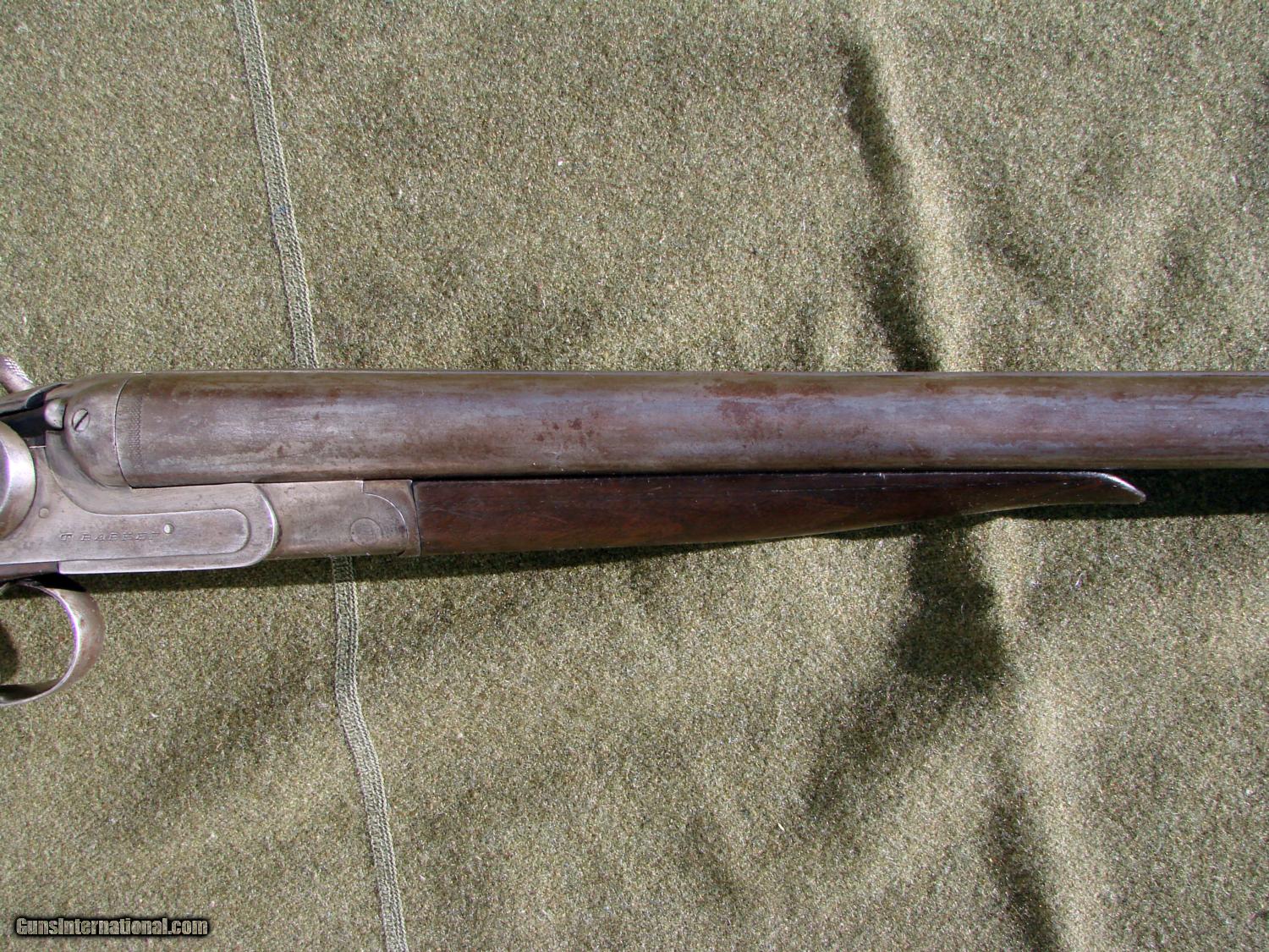 Description: T. Barker "fine-Twist" 30" barrels produced in the late 1800's with ORIGINAL STOCKS that are in superb shape! I had a gunsmith tune up the hammers for fine shooting at the cost of $80. Locks up solid with almost zero play/less than a mm to the barrel/receiver. 2.75" chambers that I have fired Blackpowder substitute (Pyrodex) in MagTech Brass Casings with wax cap. AMAZING patterning shotgun - best I have actually even over my modern guns. Metal Buttplate, brass bead. This is a fantastic option for true traditional hunting with Dove, Quail, Chuckers, etc. Shotguns marked 'T BARKER' are shotguns made by Simonis, Janssen, Dumoulin and Company of Liege, Belgium in the period 1883-1894. In the US, they were sold by various hardware store and catalog stores. They were generally imported from Belgium and distributed by the H&D Folsom Co. The proofmark is the letter 'E' over 'LG' in an oval or variant thereof. Please contact me with questions. I hate to sell this, but I've got college tuition to pay for my son. For payment, USPS MONEY ORDER ONLY and MUST be sent within two days of winning close - tuition is DUE ;-). I will send you a PRE-PAID shipping label so you can simply drop the USPS Money Order into a Priority mail envelope and send to me. This way we can both track the payment as it travels through the postal system. Upon arrival, I will deposit and ship Insured via my ffl with signature required delivery to the FFL of your choice. Payment MUST be mailed within 3 Business days of close. NO SALES TO CA from SF south, NY City, Chicago, Detroit, Cincinatti, CT, NJ, HI, or any other gun-prohibitive socialist jurisdiction or one that prohibits transfer of "High Capacity" magazines over 7 rounds. All sales final, no warranty expressed or implied. Of course, it is an agreed requirement by you through contacting me for you to have this item evaluated by a gunsmith prior to any kind or form of use due to its age. By contacting me, you agree by sworn oath that you hold the Listing Seller, Seller's Family, Associates, Beneficiaries, and Acquaintances harmless from ANY and ALL Harm, Damage of any kind, Mental Distress, Mental and/or Cognitive impairment, Emotional Distress, or ANY OTHER FORM OR KIND of physical, property, cognitive, emotional, etc. harm or damage whatsoever. Now that that's done - Happy Days ahead with a beautiful T. Barker :-) SOLD Manufacturer: T. Barker Bore: 12 Condition: Fine Metal Condition: Fine for Period Wood Condition: excellent for period Bore Condition: Very Good Barrels: 30 Barrel Type: Belgian laminated Steel (damascus) Action: SxS Triggers: 2 Gauge Info: 12 Finish: Hand Rubbed Original Finish Sights: Bead Manufacture Date: 1880's-1898 Choke Left: F Choke Right: M Item Location: Idaho |