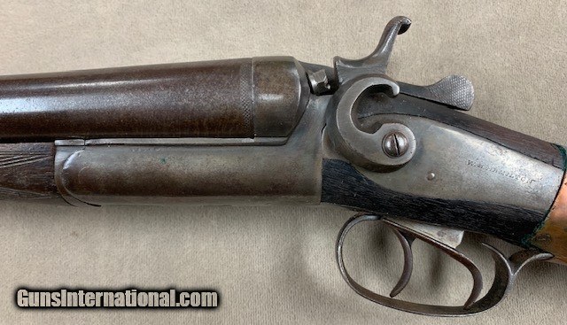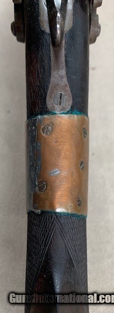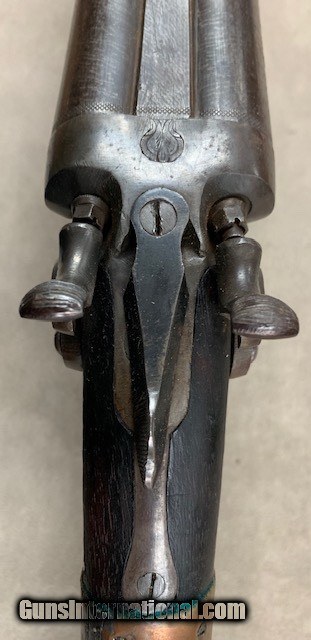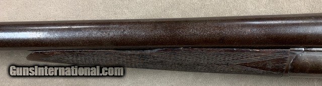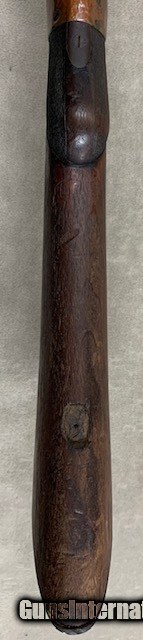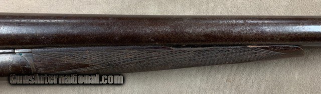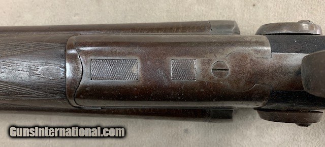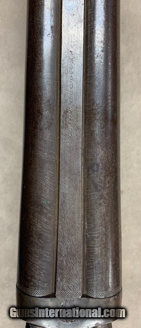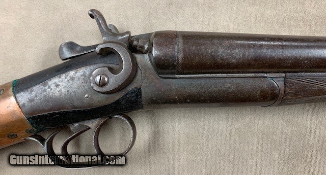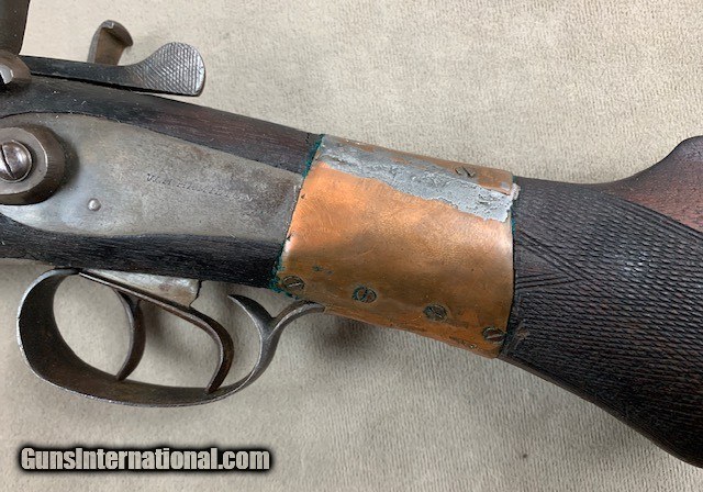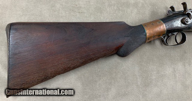 Description: Not much finish on the metal or wood, but wood is solid and metal a dark patina with 30 inch twist barrels marked TWIST BELGIUM. Chambers are 2.5 inches and bores are excellent. Stock has a very old repair to the wrist with sheet copper. Forearm has a small sliver missing but mostly all there. A great and reasonably priced wall hanger or shoot at your own risk with the proper black powder loads only. This gun is an antique and required no ffl or c&r to purchase - buyer must be over 21 and not live in a prohibited purchase area. SOLD Curio/Relic: Yes Antique: Yes |