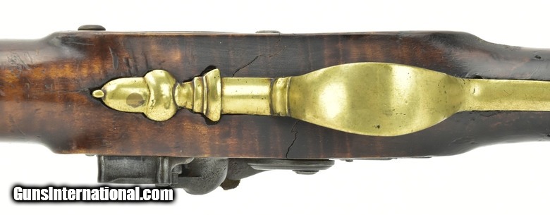 American flintlock fowler 12 ore. Barrel length is 40½”, overall length is 56”. Bore is excellent. This fowler has a Ketland lock with roller frizzen. Barrel wedge escutcheons are silver, as is the initialed silver roundel behind the upper breech tang. This is a very handsome Fowler with pleasing lines and very good length, while not being heavy or clumsy. The wrist has an old repair which was well done.