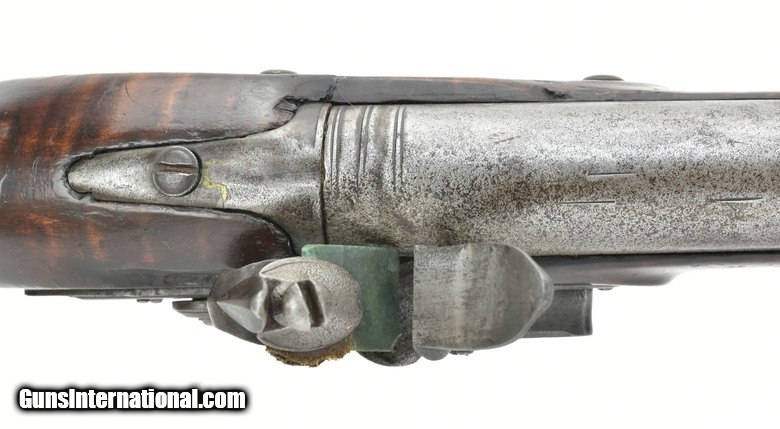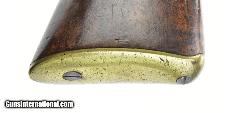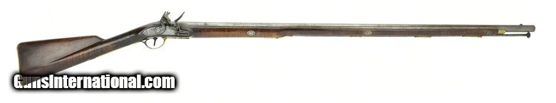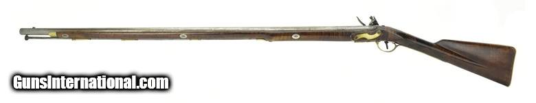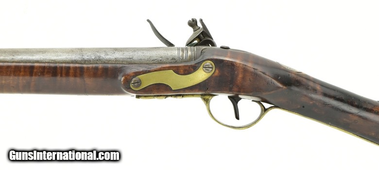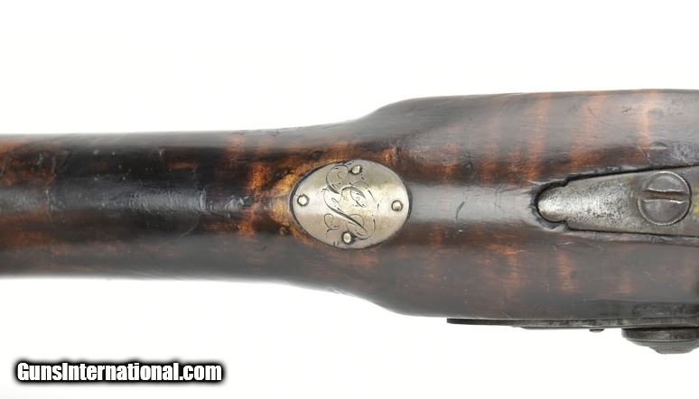 Description: American flintlock fowler 12 ore. Barrel length is 40½”, overall length is 56”. Bore is excellent. This fowler has a Ketland lock with roller frizzen. Barrel wedge escutcheons are silver, as is the initialed silver roundel behind the upper breech tang. This is a very handsome Fowler with pleasing lines and very good length, while not being heavy or clumsy. The wrist has an old repair which was well done. SOLD Antique: Yes |