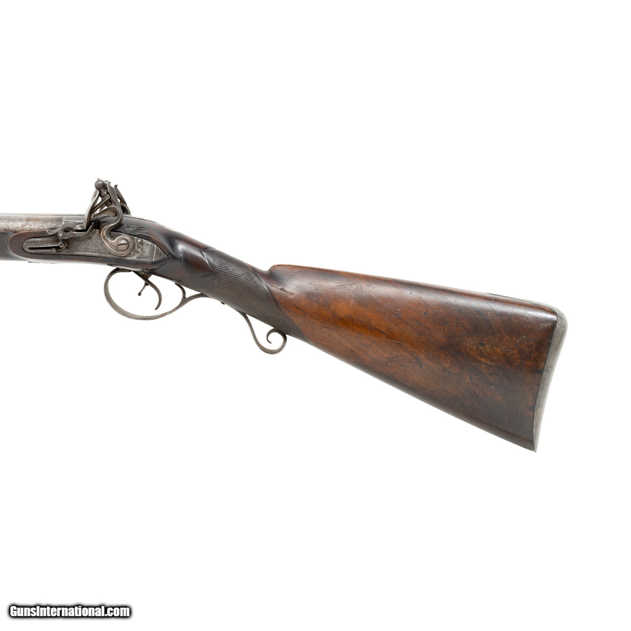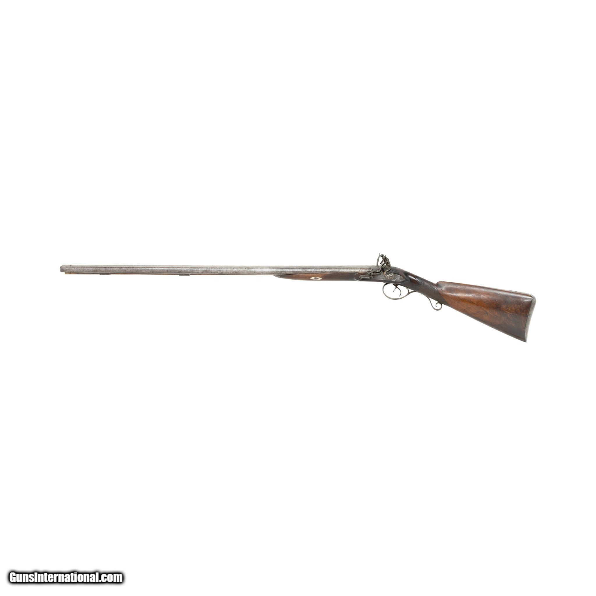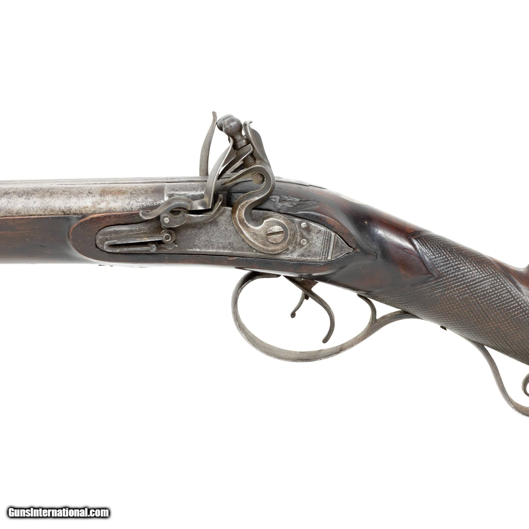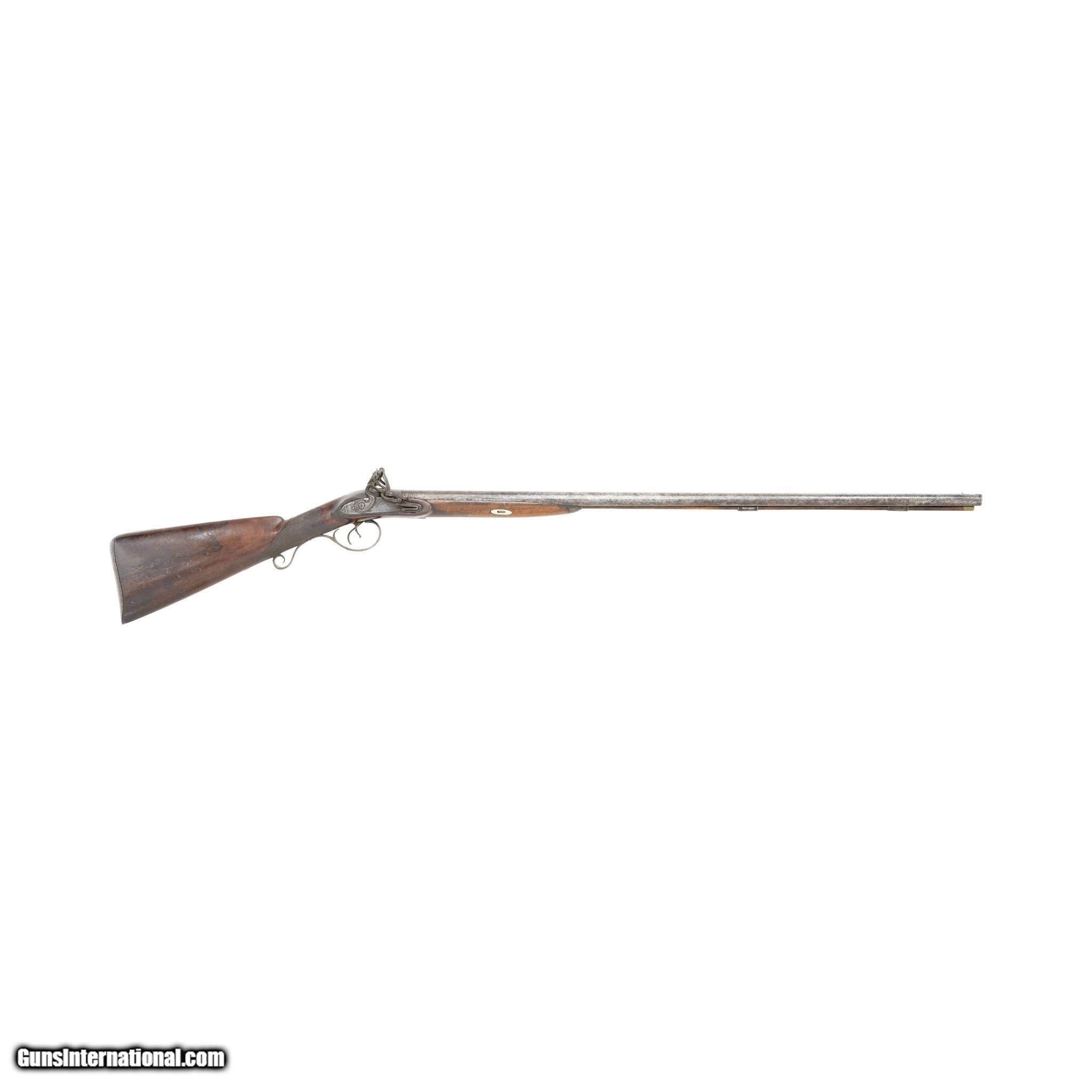 Description: English double barrel flintlock fowler shotgun. Gauge unknown. Two - 34” Barrels. Barrel is marked on the underside with post 1813 Birmingham Proof Company proof marks and view marks (crossed scepters and crown mark, incorporating the letters BPC, together with the crossed scepters over a V.) Between the Birmingham marks is a “tombstone” mark of a number 1 over a bird. The significance of the marks is unclear. A possible explanation might be that a barrel maker (or a group of barrel makers) marked their barrels in this way before supplying individual gunmakers or retailers. Given the positioning of the marks, it appears likely that this was done at the same time as the proof marks were struck (quite possibly by the Proof House staff). There is also the word STURM stamped on each barrel. It is believed to be the mark of a private manufacturer, but no such manufacturer has been identified. The walnut stock features checkering at the grip. The barrels, lock plates, trigger guard, and buttplate are all steel. Much of the hardware is engraved with floral designs and other decorative motifs including a German silver inlay engraved “AB” at the grip. Includes the original ramrod. Manufactured 1813-1830. There was very little demand in England for flintlocks after that date. Condition The shotgun is mechanically functional. Both hammers cock and hold. Cosmetically, the shotgun is in good condition. The hardware has acquired a brown patina consistent with age. The bore has not been visually inspected (requires a borescope.) The stock shows signs of period wear (nicks, dents, scratches.) removing the barrels from the stock reveals an old repair made to the stock. A break in the stock was stabilized with a color matched epoxy. Enhancements The only enhancement done to this antique fowler was the addition of the German silver monogram plate. This may have been done at the time of manufacture or sometime after. Family Owned & Operated Cisco’s Gallery deals in the rare, exceptional, and one-of-a-kind pieces that define the history of America and the Old West. Our pieces range from American Indian to Cowboy Western and include original items of everyday life, commerce, art, and warfare that tamed America’s frontier. Our 14,000 square foot gallery opened in 1996 in beautiful Coeur d’Alene, Idaho. Personal Service Cisco’s operates on old fashioned values – honesty and integrity, and all of our items are backed by our money back guarantee. We appreciate the opportunity to earn your business. Whether you desire assistance with a jewelry purchase, choosing a gift, identification, or even selling – we hope to be your trusted source. Price: $900.00 Contact Seller |