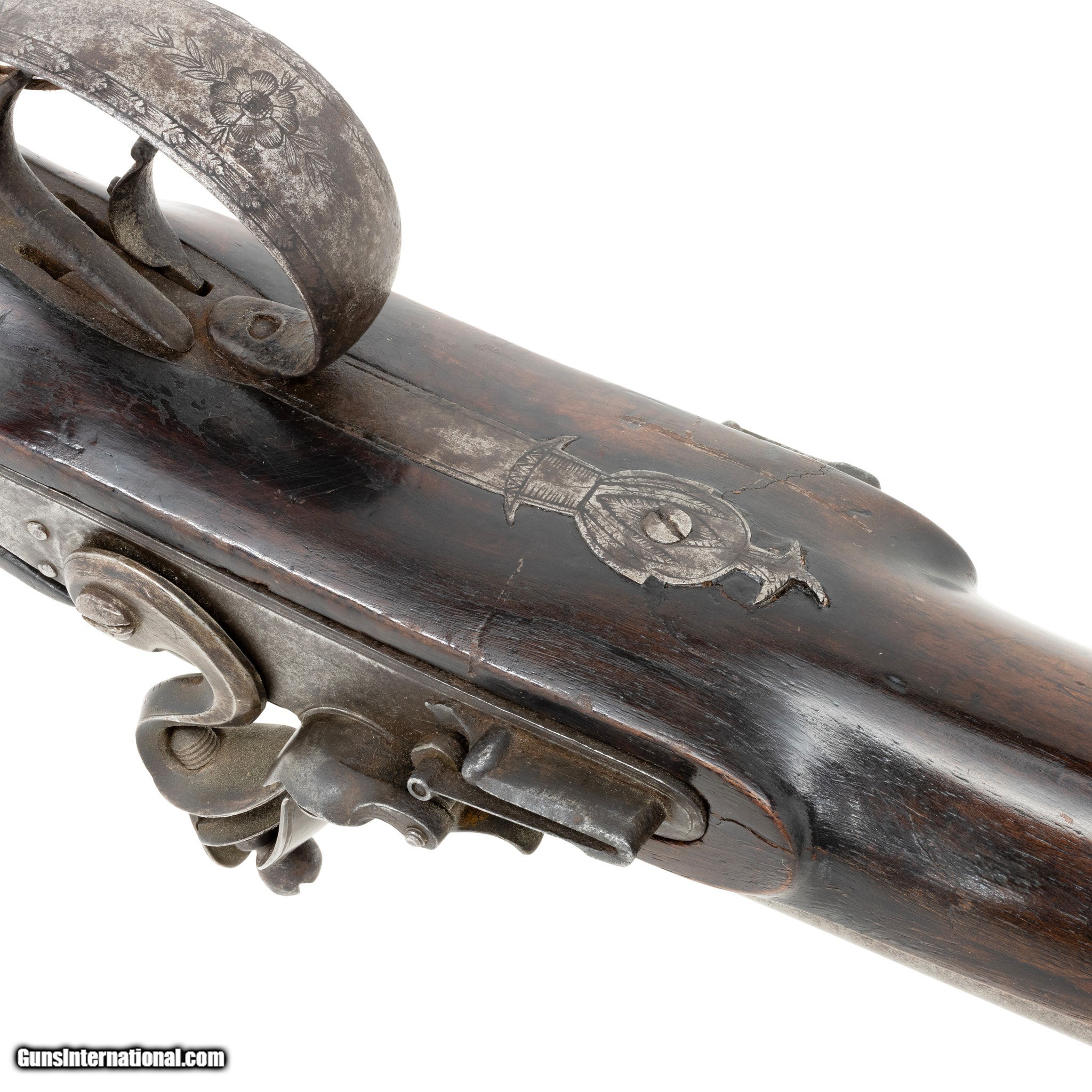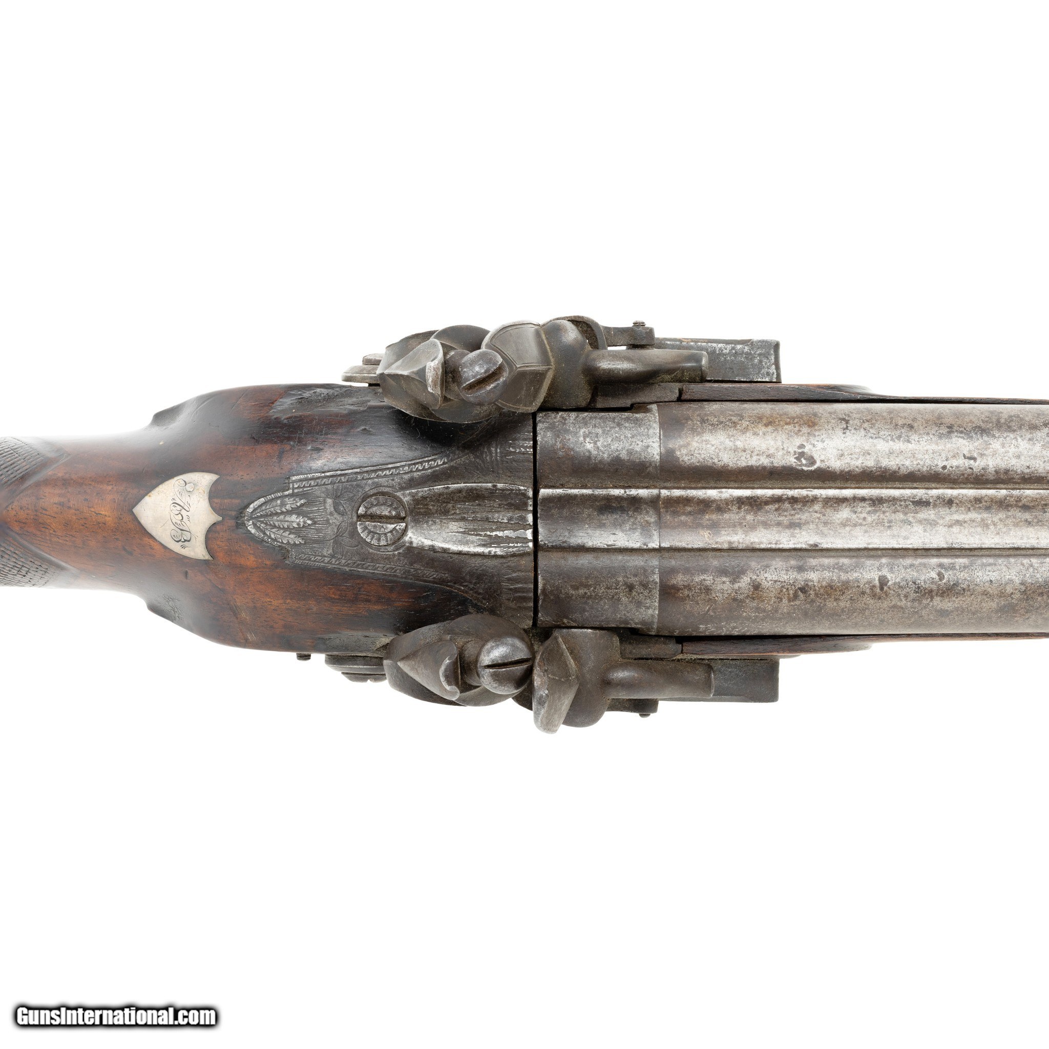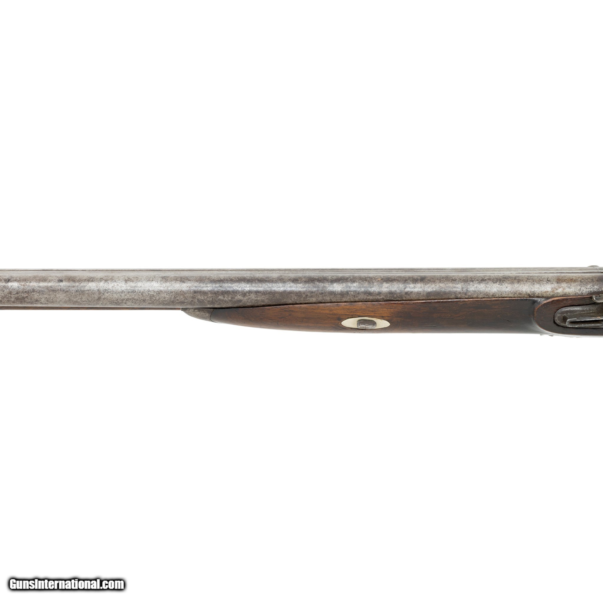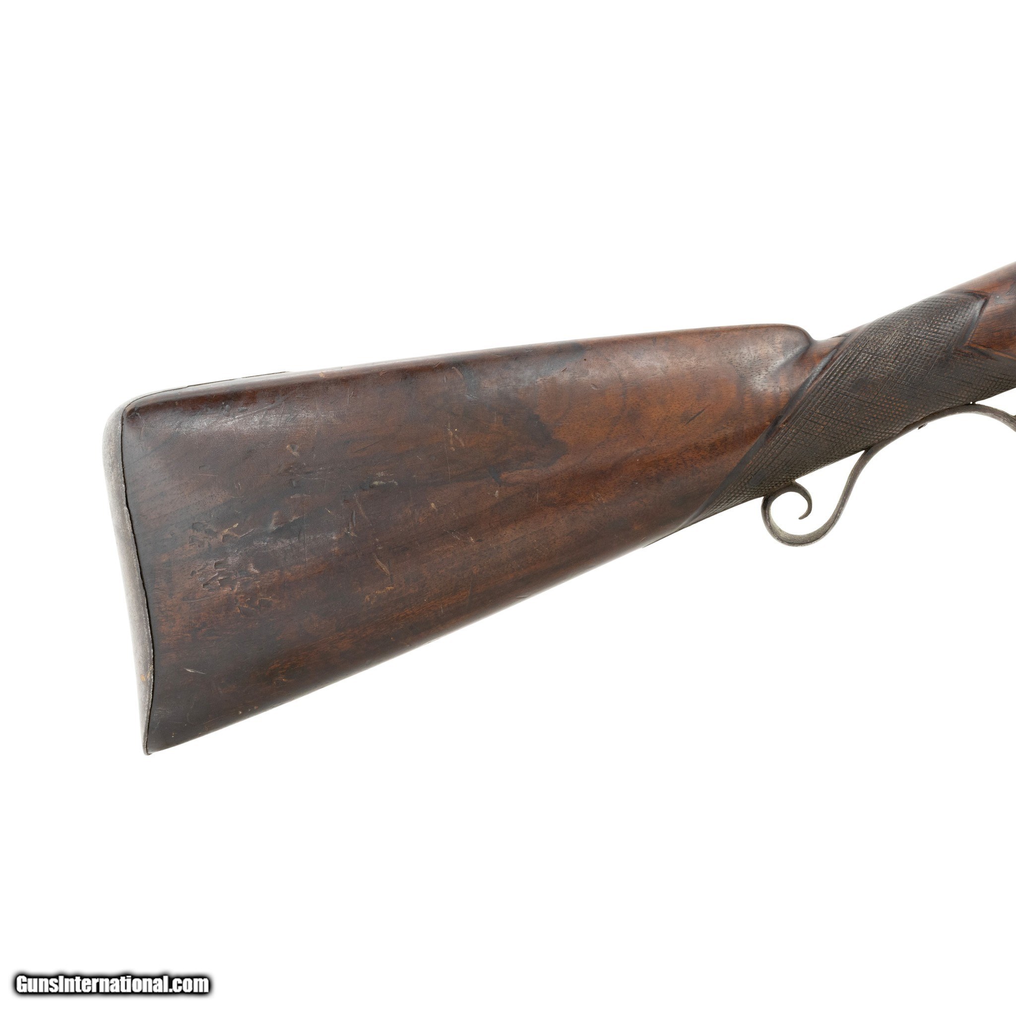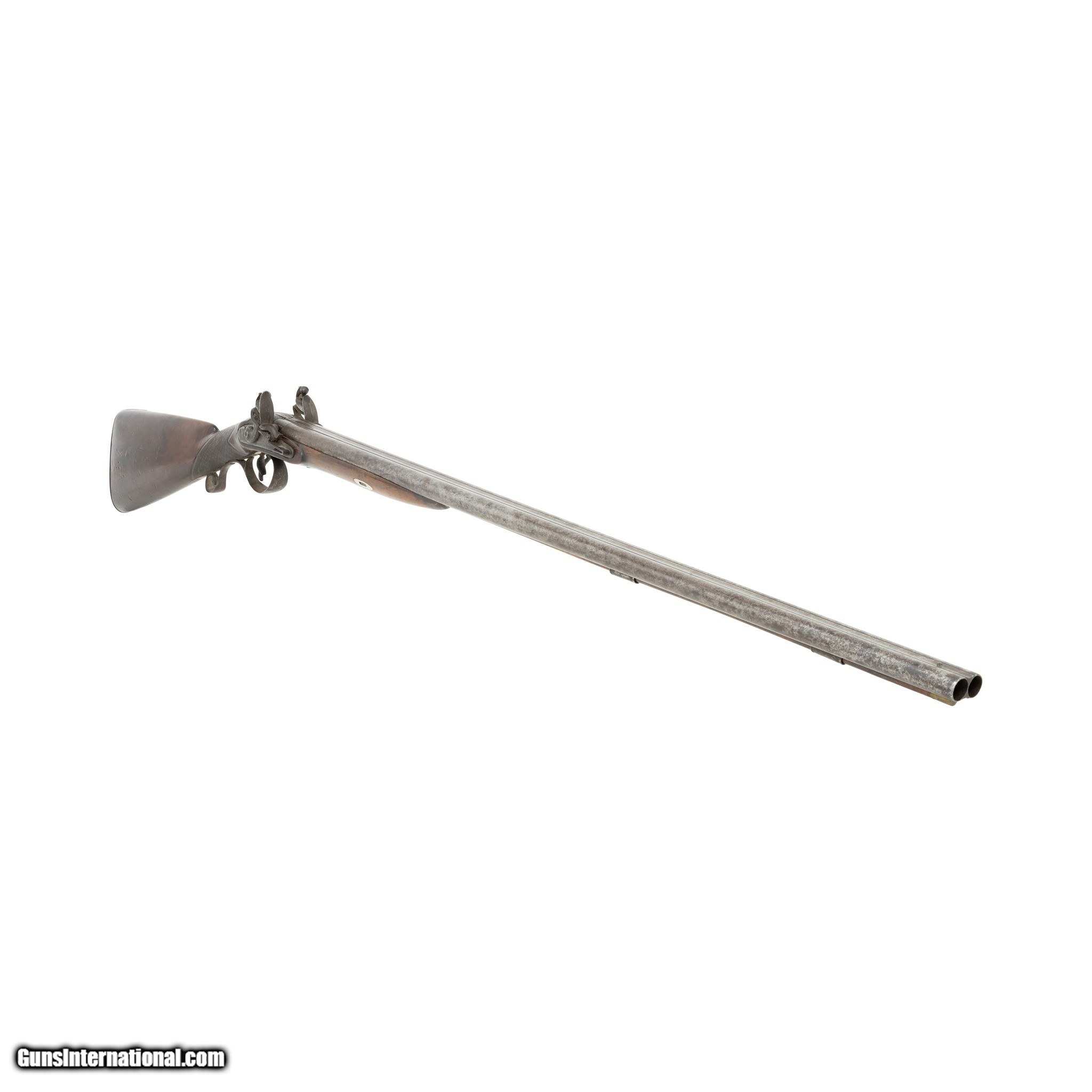 Description: English double barrel flintlock fowler shotgun. Gauge unknown. Two - 34” Barrels. Barrel is marked on the underside with post 1813 Birmingham Proof Company proof marks and view marks (crossed scepters and crown mark, incorporating the letters BPC, together with the crossed scepters over a V.) Between the Birmingham marks is a “tombstone” mark of a number 1 over a bird. The significance of the marks is unclear. A possible explanation might be that a barrel maker (or a group of barrel makers) marked their barrels in this way before supplying individual gunmakers or retailers. Given the positioning of the marks, it appears likely that this was done at the same time as the proof marks were struck (quite possibly by the Proof House staff). There is also the word STURM stamped on each barrel. It is believed to be the mark of a private manufacturer, but no such manufacturer has been identified. The walnut stock features checkering at the grip. The barrels, lock plates, trigger guard, and buttplate are all steel. Much of the hardware is engraved with floral designs and other decorative motifs including a German silver inlay engraved “AB” at the grip. Includes the original ramrod. Manufactured 1813-1830. There was very little demand in England for flintlocks after that date. Condition The shotgun is mechanically functional. Both hammers cock and hold. Cosmetically, the shotgun is in good condition. The hardware has acquired a brown patina consistent with age. The bore has not been visually inspected (requires a borescope.) The stock shows signs of period wear (nicks, dents, scratches.) removing the barrels from the stock reveals an old repair made to the stock. A break in the stock was stabilized with a color matched epoxy. Enhancements The only enhancement done to this antique fowler was the addition of the German silver monogram plate. This may have been done at the time of manufacture or sometime after. Family Owned & Operated Cisco’s Gallery deals in the rare, exceptional, and one-of-a-kind pieces that define the history of America and the Old West. Our pieces range from American Indian to Cowboy Western and include original items of everyday life, commerce, art, and warfare that tamed America’s frontier. Our 14,000 square foot gallery opened in 1996 in beautiful Coeur d’Alene, Idaho. Personal Service Cisco’s operates on old fashioned values – honesty and integrity, and all of our items are backed by our money back guarantee. We appreciate the opportunity to earn your business. Whether you desire assistance with a jewelry purchase, choosing a gift, identification, or even selling – we hope to be your trusted source. Price: $900.00 Contact Seller |