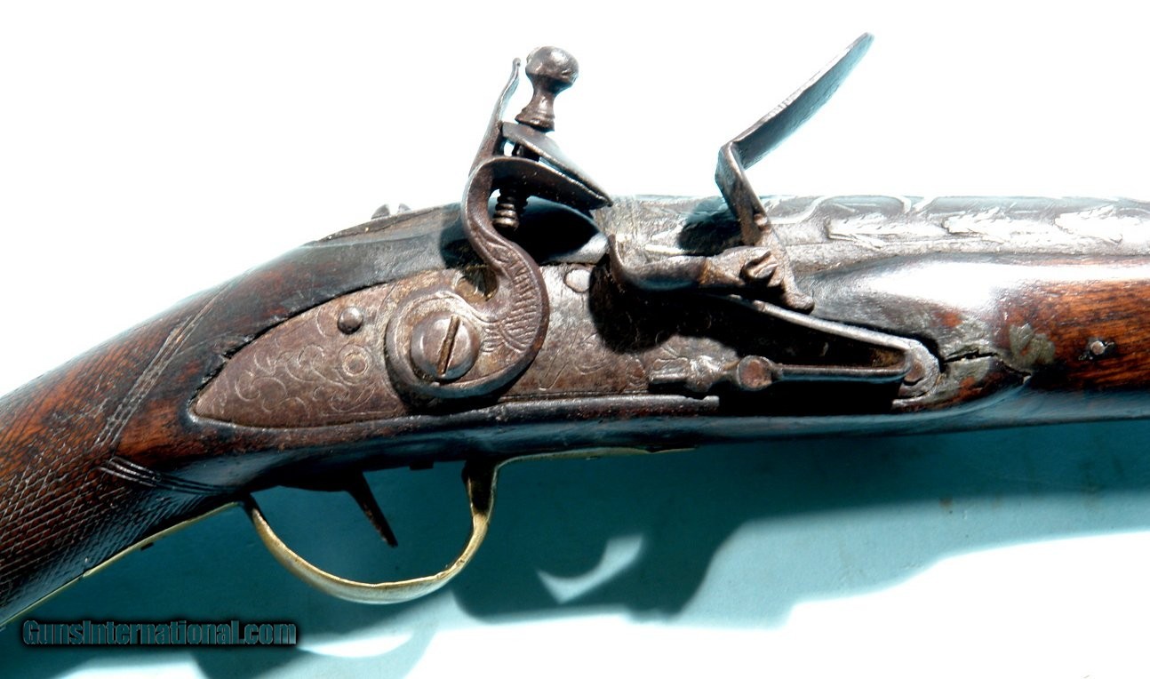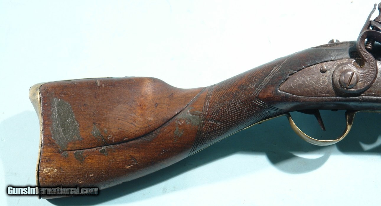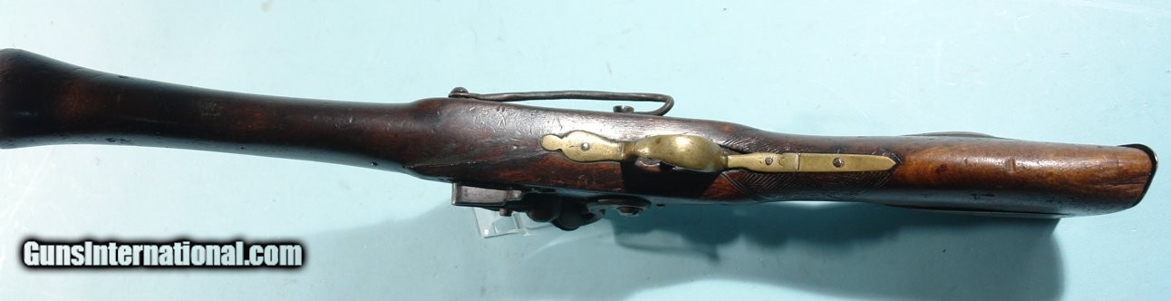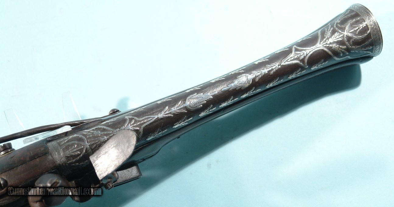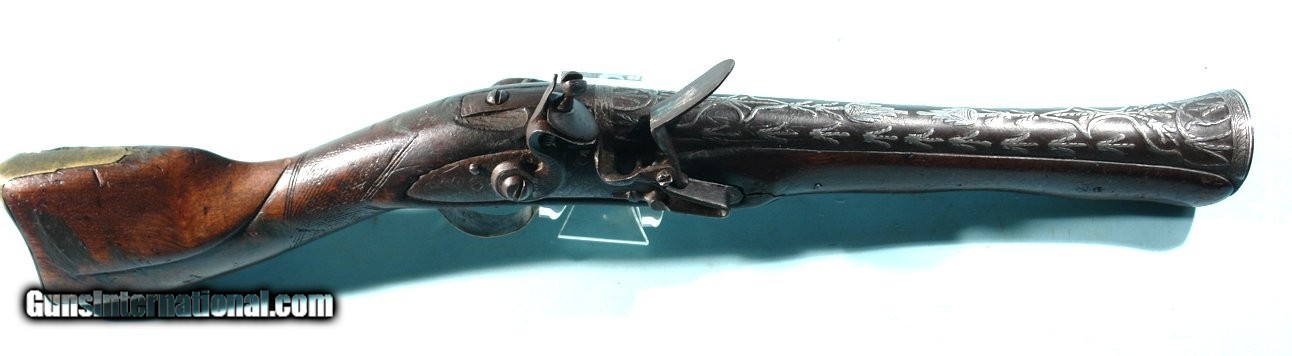 Description: ORNATE LIEGE OTTOMAN TURKISH SILVER INLAID FLINTLOCK KNEE BLUNDERBUSS CIRCA EARLY 1800’S. 22” o/a with 11” barrel i with floral and vine silver inlay. Walnut stock with short butt and known as “KNEE” blunderbusses. Saddle ring bar on left side panel. All original and very good with dark original metal patina and the original wood finish. Working order. Made in Liege for the Ottoman trade. Very handsome. SOLD Antique: Yes |