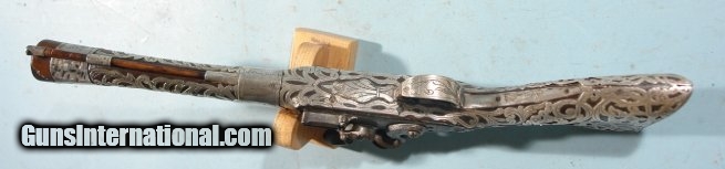 Description: ROYALTY QUALITY OTTOMAN TURKISH FLINTLOCK KNEE BLUNDERBUSS CIRCA 1800. 20” o/a with 12” barrel with 1 ¼” muzzle and having profuse silver inlays and signed “DB” in a pear shaped barrel maker’s touchmark at the top breech. Heavy solid silver engraved floral stock inlays and mounts with four Turkish silversmith’s hallmarks and an Arabic inscription on the butt plate tang. The two large silver barrel bands are engraved with floral sprays and the rear band has two well struck Turkish silversmith’s hallmarks as well. Lock plate stamped below the pan with lock maker’s touchmark. Highest quality workmanship and complete and original in every respect with 100% of the inlay retained with no loss. Lock in working order. Very probably made at the Sultan’s Armories for presentation to a dignitary or a member of the Royal entourage. SOLD Antique: Yes |