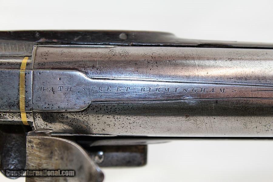 Description: WILLIAM HOLLIS Single Barrel FLINTLOCK Shotgun Nicely Engraved Early 19th Century British Shotgun Here we present an antique William Hollis Single Barrel Flintlock Shotgun, manufactured in Birmingham, England circa 1816. Records show that William Hollis ran his business on Bath Street in Birmingham from 1814 through 1818. Though not known for sure, it is believed that the more famous Birmingham gunmaker Isaac Hollis descended from William Hollis. The lock is marked “WILLm HOLLIS”. The top of the barrel is marked “BATH STREET BIRMINGHAM”. There are nice engravings throughout this shotgun along with gold bands, features that make this a step above the average hunting gun of the day. The stock has a straight grip with a trigger guard that forms a pistol grip. The trigger guard is round at the back and square at the front as well as oversized, making it ideal for use with gloves. The overall condition is good. The iron parts are bright. The markings are clear. The stock is mostly smooth and solid. It does have the handling marks you would expect, along with a stable crack on the underside just forward of the trigger guard. The bore is smooth and clean, semi-bright. The action is excellent. Own the original! This is a legitimate antique and not a reproduction. Barrel is 33 inches. Gauge: .80 Overall condition as seen in photos. Very Fast. Very Safe. FREE SHIPPING WORLDWIDE. Delivered directly to your door by express mail! Guaranteed AUTHENTIC & Includes CERTIFICATE OF AUTHENTICITY. ancestryguns $1650 #8088 SOLD Antique: Yes |