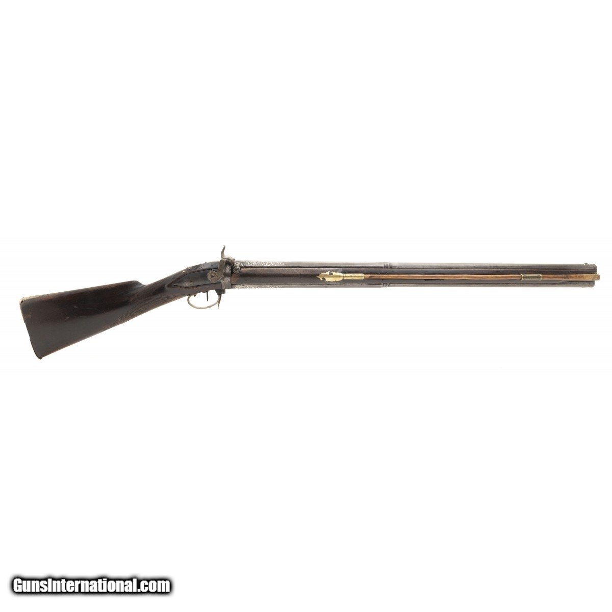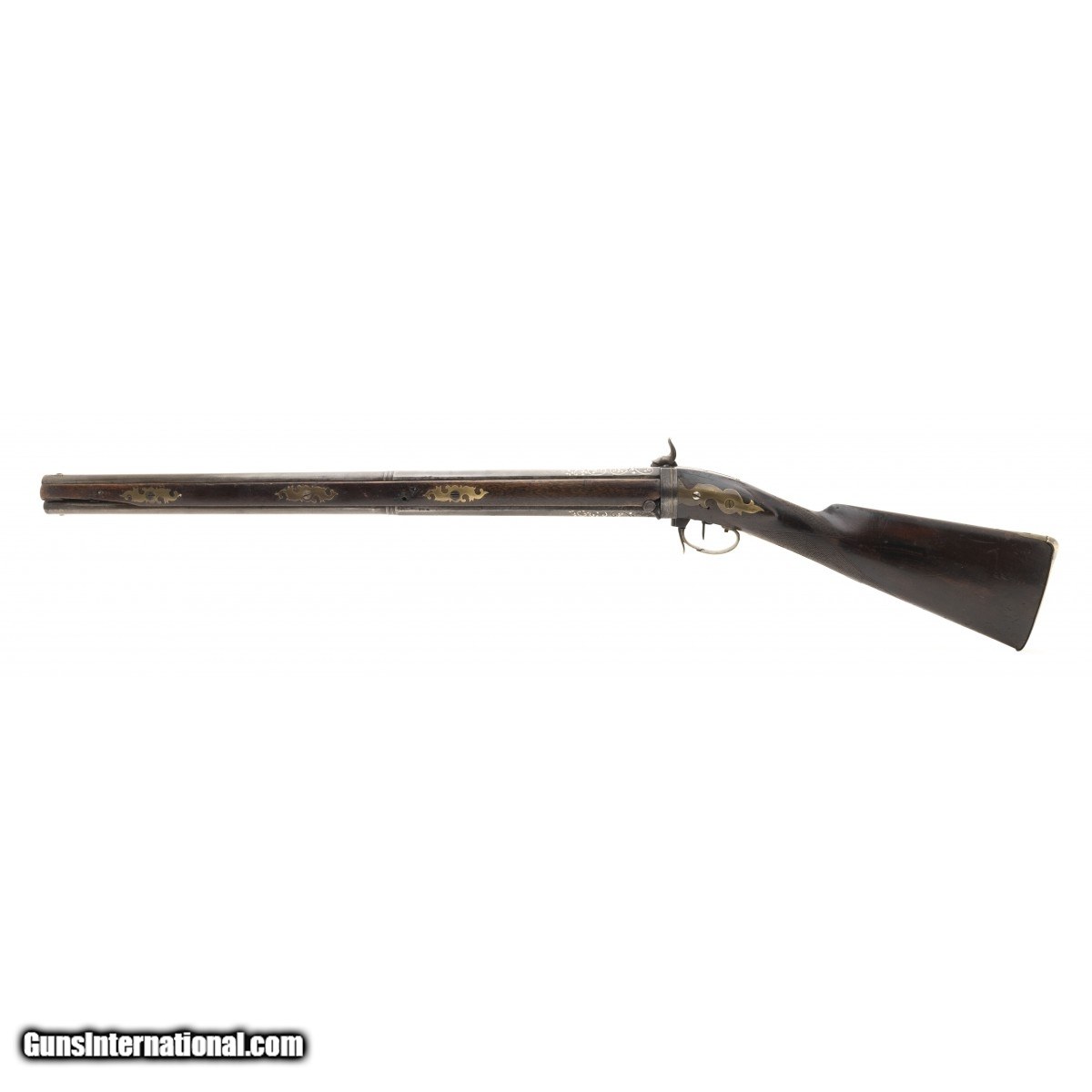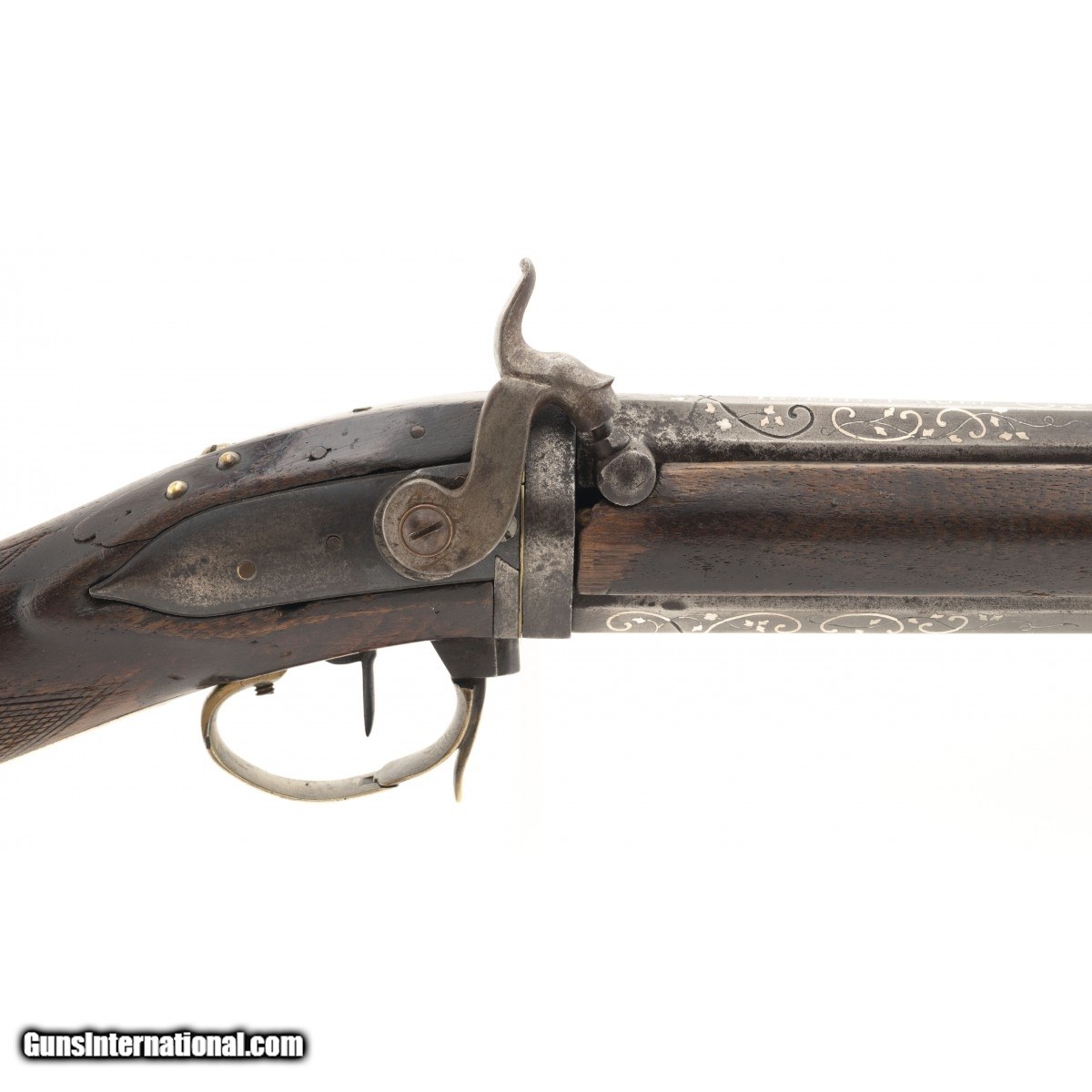 Description: " The overall length of this turn barrel over-under German 16 gauge percussion shotgun is approx. 42.5"". The 26 7/8"" part round, part octagon barrels have very good bores. The octagon rear portions are engraved and silver inlaid for approx. 4.5"" with one reading JOSEPH BAUER and the other IN CRONACH. Cronach is in upper Franconia with the capital of the district being Kronach. The barrels and action have a smooth brown patina. The brass and German silver trim have an even age patina. The wood is good with a repair on the right at the rear of the action, wear along the sides and bottom, and worn checkering. The butt plate has a break at the top at the tang. The ramrod is present. The action functions correctly. With just a little effort, you could make this interesting German percussion over-under shotgun look much better. SOLD Antique: Yes |