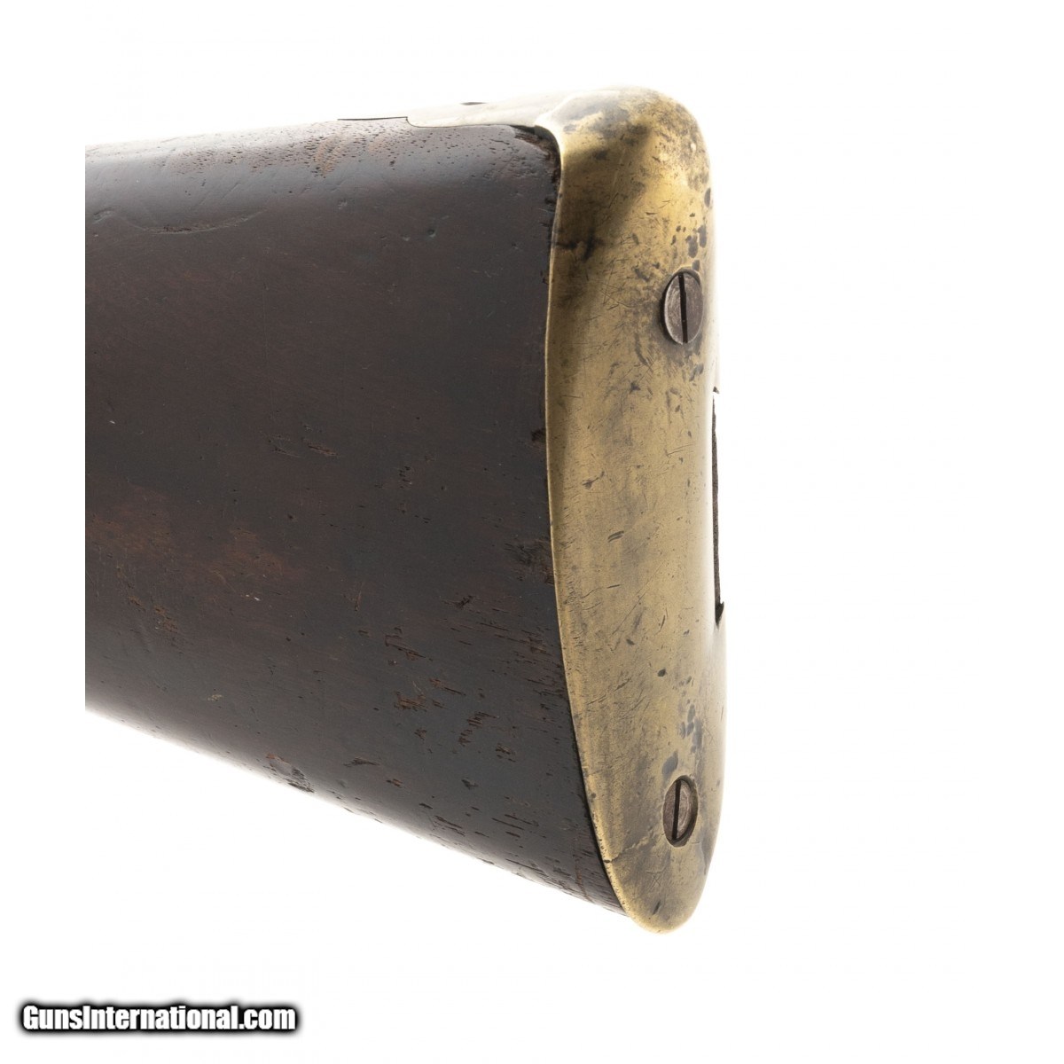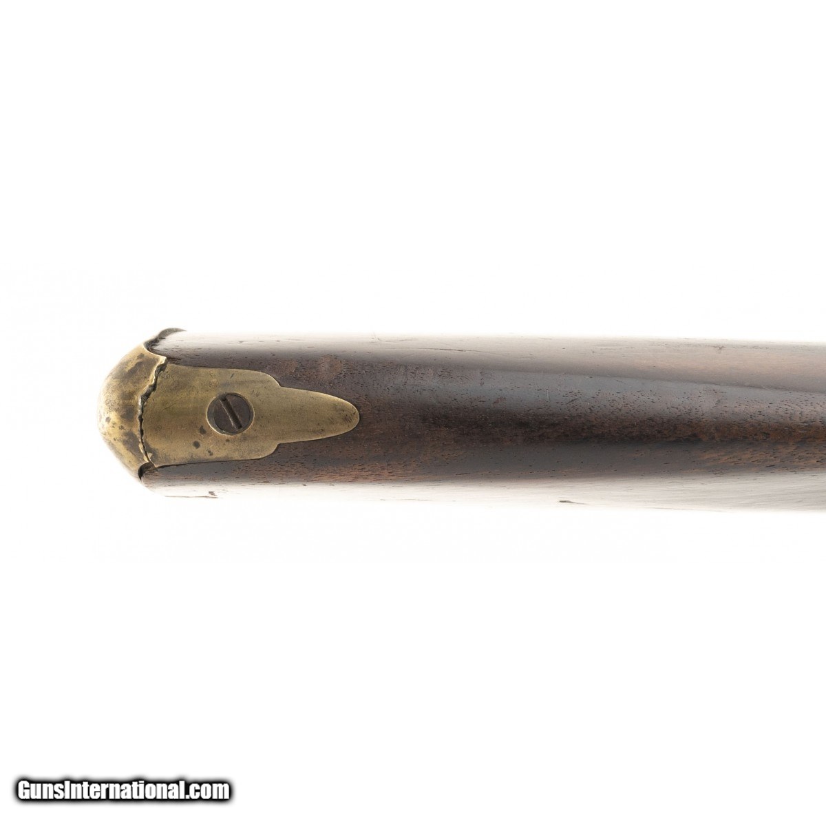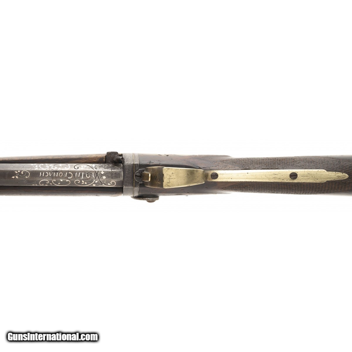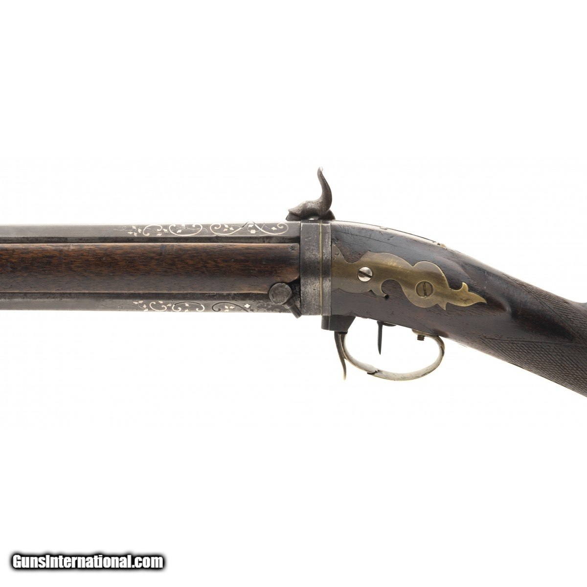 Description: " The overall length of this turn barrel over-under German 16 gauge percussion shotgun is approx. 42.5"". The 26 7/8"" part round, part octagon barrels have very good bores. The octagon rear portions are engraved and silver inlaid for approx. 4.5"" with one reading JOSEPH BAUER and the other IN CRONACH. Cronach is in upper Franconia with the capital of the district being Kronach. The barrels and action have a smooth brown patina. The brass and German silver trim have an even age patina. The wood is good with a repair on the right at the rear of the action, wear along the sides and bottom, and worn checkering. The butt plate has a break at the top at the tang. The ramrod is present. The action functions correctly. With just a little effort, you could make this interesting German percussion over-under shotgun look much better. SOLD Antique: Yes |