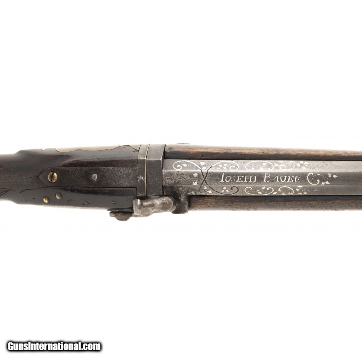 The overall length of this turn barrel over-under German 16 gauge percussion shotgun is approx. 42.5"". The 26 7/8"" part round, part octagon barrels have very good bores. The octagon rear portions are engraved and silver inlaid for approx. 4.5"" with one reading JOSEPH BAUER and the other IN CRONACH. Cronach is in upper Franconia with the capital of the district being Kronach. The barrels and action have a smooth brown patina. The brass and German silver trim have an even age patina. The wood is good with a repair on the right at the rear of the action, wear along the sides and bottom, and worn checkering. The butt plate has a break at the top at the tang. The ramrod is present. The action functions correctly. With just a little effort, you could make this interesting German percussion over-under shotgun look much better.