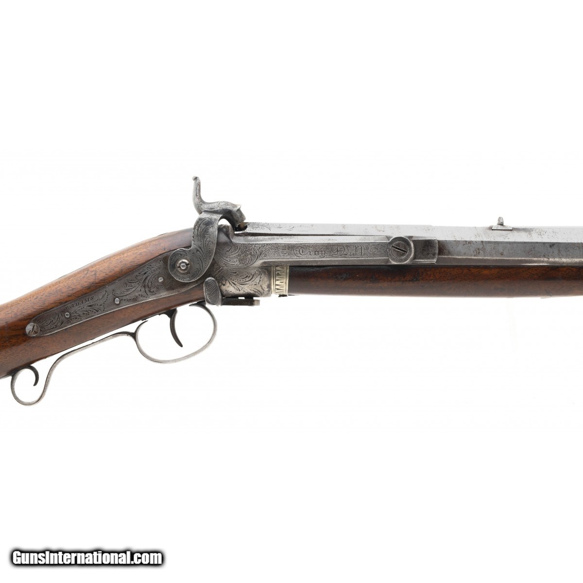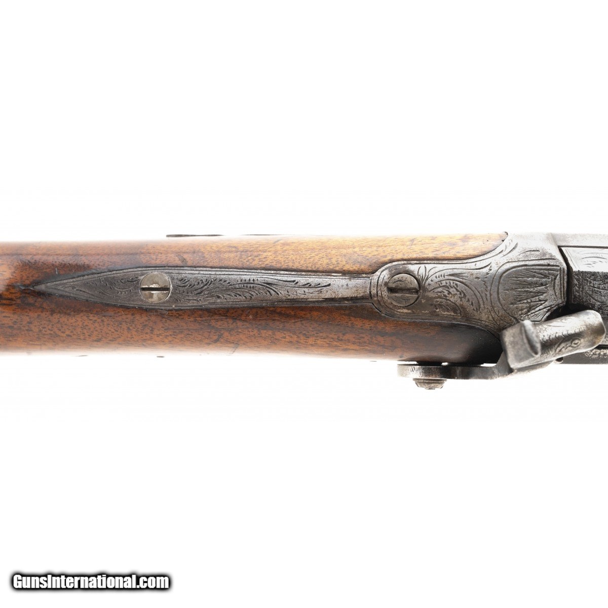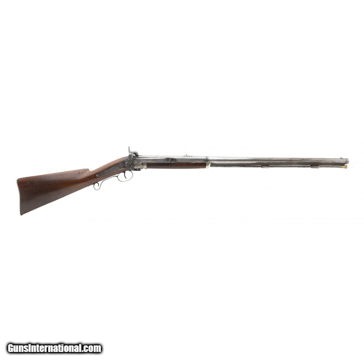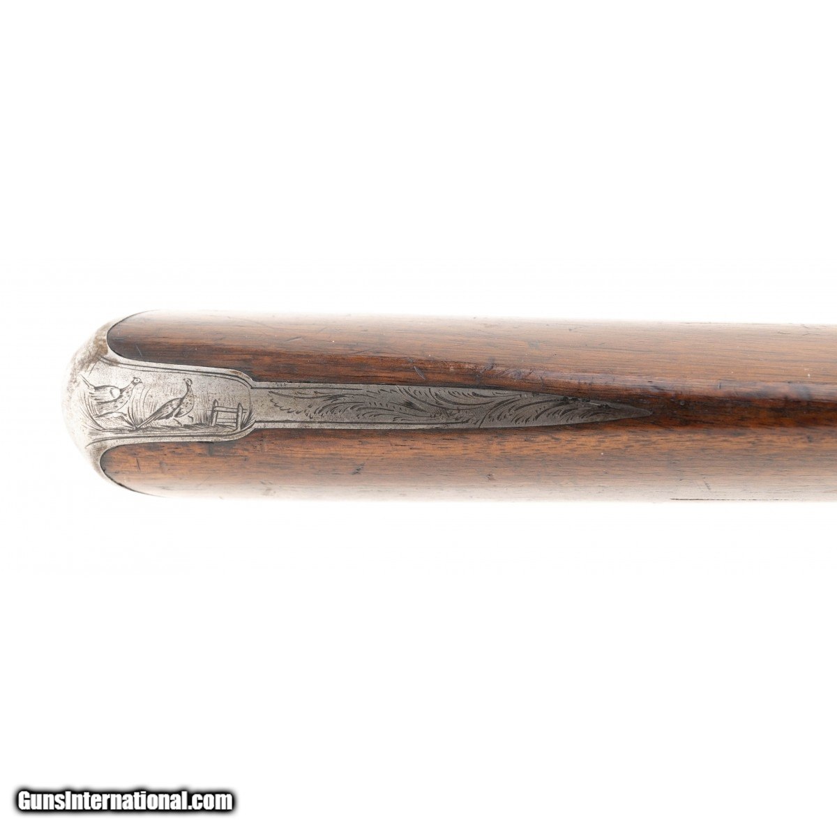 Description: " This rare Samuel Adams Patent combination break-open sporting percussion rifle-shotgun is most unusual. Samuel Adams was issued US Patent 960 on October 3, 1838, for a break-open combination rifle-shotgun that is almost identical to this rifle-shotgun. It is approx. 48 caliber and 10 gauge. The 29.5"" rifle barrel is inserted in the shotgun barrel. It is threaded on the muzzle end and is held in place by a threaded muzzle cap. It precisely fits the shotgun barrel. THe bore has bright sharp rifling with scattered light frosting and some very light pitting in the grooves. The shotgun barrel is very good with some light oxidation and light pitting. Each barrel requires a chamber insert with a percussion nipple to function. A very nicely made chamber insert is present for the rifle barrel. A shotgun insert could be easily made. The barrel shows traces of a damascus twist pattern its full length, now primaly a smooth pewter gray patina, with light oxidation staining and some light pitting in the breech area. The balance of the metal surfaces are similar with light oxidation staining. They feature light foliate engraving overall. It has a bead front and v-notch rear sight. It is marked Samuel Adams Patent just to the rear of the rear sight. Troy NY is marked on the right barrel pivot arm and the back action lock is marked S Adams. There is light foliate engraving on the long buttplate tang with gamebirds at the very heel and a bit of engraving on the bow of the triggerguard. The American black walnut stock is very good with much original varnish and the expected light dents and dings of a gun that was used in the fiels. There is a small divot at the point of the comb. The forend is similar with a bit more wear and with a small chip forming at the rear, which may have been repaired. There is a lightly engraved German silver nosecap and a lightly engraved German silver ferrule at the rear of the forearm. The lock functions mechanically and the gun locks up tightly. It is equipped with a brass-tipped steel ramrod. The barrel insert and barrel proper are both numbered 14, the serial number. Samuel Adams is first listed in Springfield, MA, in the 1830s. He later moved to Troy, NY, and, possibly, later to Battle Creek, MI. It is reported (American Gunsmiths by Sellers) the his guns were manufactured by C.B. Allen. Here's your chancce to own a very early percussion cartridge tyoe gun that is also a combination rifle-shotgun and that is also covered by a very early U.S. Patent. If you like unusual early US firearms, this Samel Adams patent rifle-shotgun is for you! SOLD Antique: Yes |