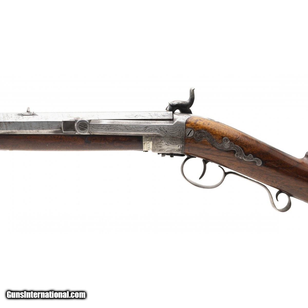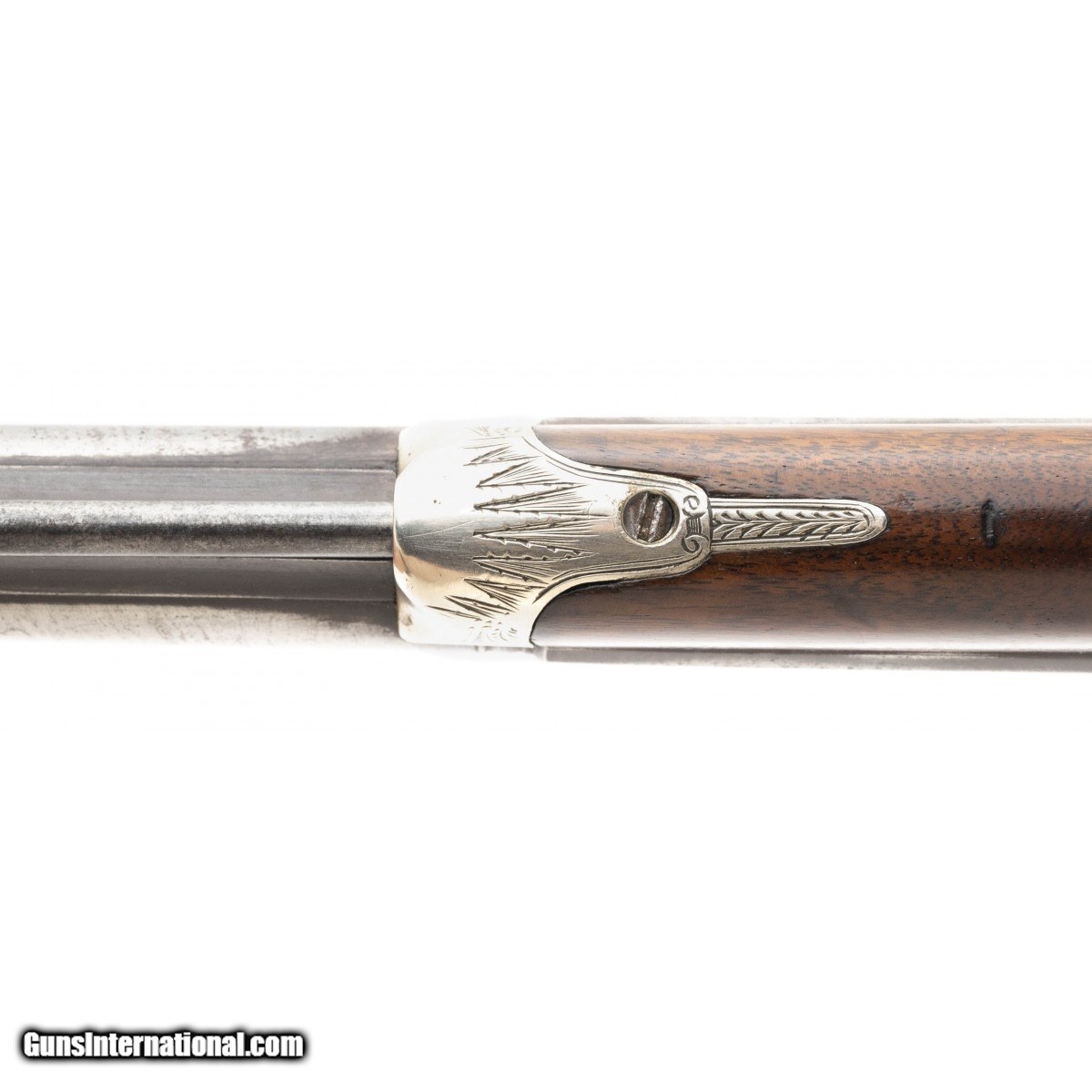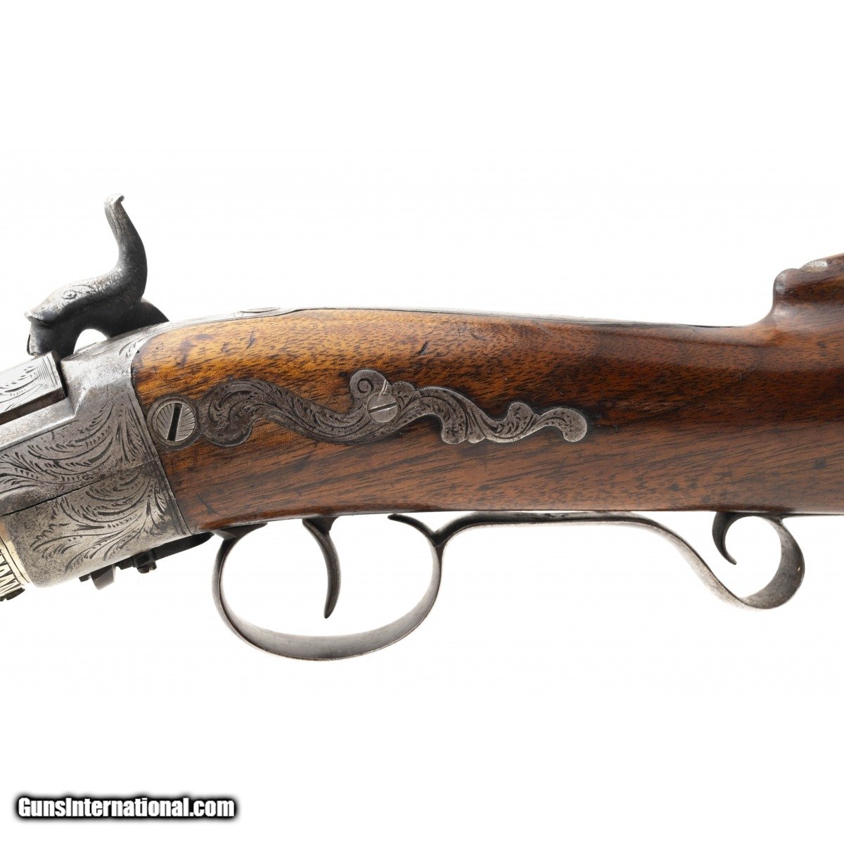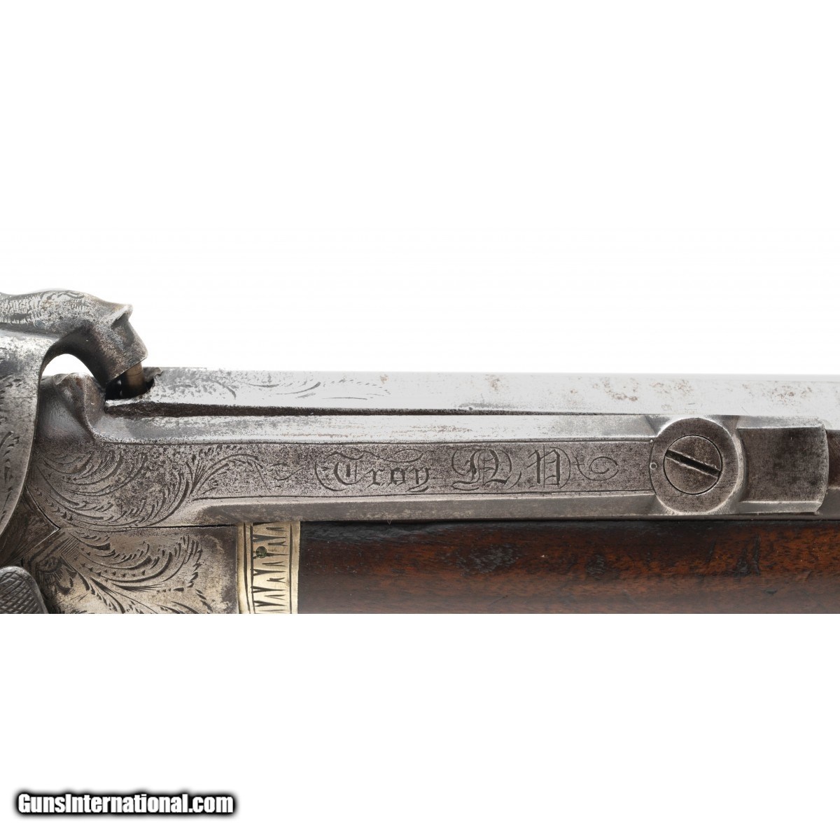 Description: " This rare Samuel Adams Patent combination break-open sporting percussion rifle-shotgun is most unusual. Samuel Adams was issued US Patent 960 on October 3, 1838, for a break-open combination rifle-shotgun that is almost identical to this rifle-shotgun. It is approx. 48 caliber and 10 gauge. The 29.5"" rifle barrel is inserted in the shotgun barrel. It is threaded on the muzzle end and is held in place by a threaded muzzle cap. It precisely fits the shotgun barrel. THe bore has bright sharp rifling with scattered light frosting and some very light pitting in the grooves. The shotgun barrel is very good with some light oxidation and light pitting. Each barrel requires a chamber insert with a percussion nipple to function. A very nicely made chamber insert is present for the rifle barrel. A shotgun insert could be easily made. The barrel shows traces of a damascus twist pattern its full length, now primaly a smooth pewter gray patina, with light oxidation staining and some light pitting in the breech area. The balance of the metal surfaces are similar with light oxidation staining. They feature light foliate engraving overall. It has a bead front and v-notch rear sight. It is marked Samuel Adams Patent just to the rear of the rear sight. Troy NY is marked on the right barrel pivot arm and the back action lock is marked S Adams. There is light foliate engraving on the long buttplate tang with gamebirds at the very heel and a bit of engraving on the bow of the triggerguard. The American black walnut stock is very good with much original varnish and the expected light dents and dings of a gun that was used in the fiels. There is a small divot at the point of the comb. The forend is similar with a bit more wear and with a small chip forming at the rear, which may have been repaired. There is a lightly engraved German silver nosecap and a lightly engraved German silver ferrule at the rear of the forearm. The lock functions mechanically and the gun locks up tightly. It is equipped with a brass-tipped steel ramrod. The barrel insert and barrel proper are both numbered 14, the serial number. Samuel Adams is first listed in Springfield, MA, in the 1830s. He later moved to Troy, NY, and, possibly, later to Battle Creek, MI. It is reported (American Gunsmiths by Sellers) the his guns were manufactured by C.B. Allen. Here's your chancce to own a very early percussion cartridge tyoe gun that is also a combination rifle-shotgun and that is also covered by a very early U.S. Patent. If you like unusual early US firearms, this Samel Adams patent rifle-shotgun is for you! SOLD Antique: Yes |