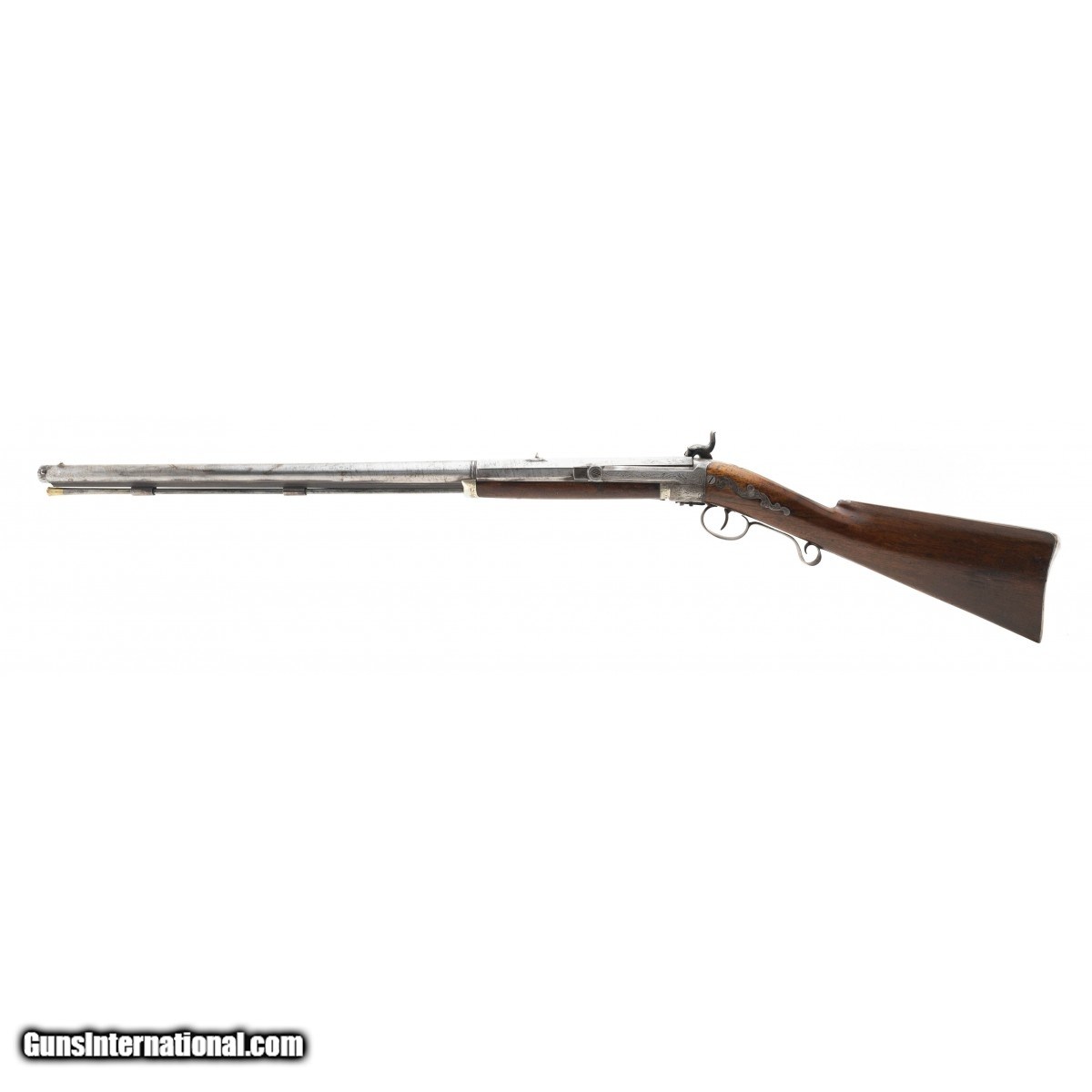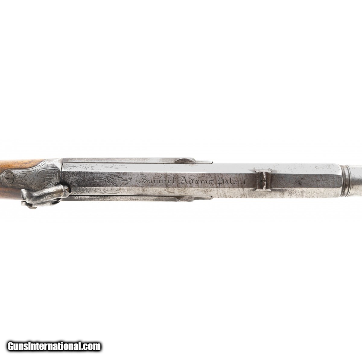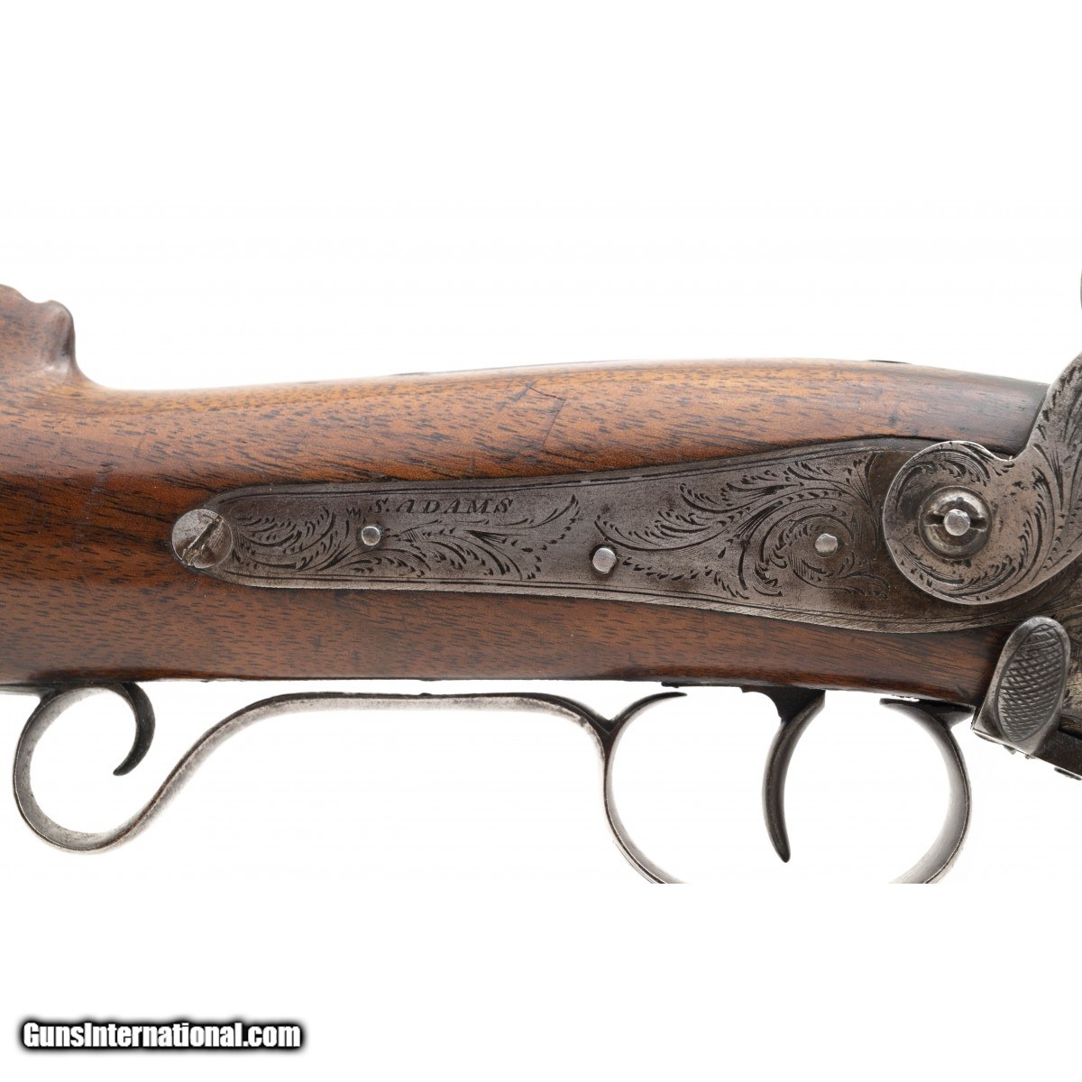 This rare Samuel Adams Patent combination break-open sporting percussion rifle-shotgun is most unusual. Samuel Adams was issued US Patent 960 on October 3, 1838, for a break-open combination rifle-shotgun that is almost identical to this rifle-shotgun. It is approx. 48 caliber and 10 gauge. The 29.5"" rifle barrel is inserted in the shotgun barrel. It is threaded on the muzzle end and is held in place by a threaded muzzle cap. It precisely fits the shotgun barrel. THe bore has bright sharp rifling with scattered light frosting and some very light pitting in the grooves. The shotgun barrel is very good with some light oxidation and light pitting. Each barrel requires a chamber insert with a percussion nipple to function. A very nicely made chamber insert is present for the rifle barrel. A shotgun insert could be easily made. The barrel shows traces of a damascus twist pattern its full length, now primaly a smooth pewter gray patina, with light oxidation staining and some light pitting in the breech area. The balance of the metal surfaces are similar with light oxidation staining. They feature light foliate engraving overall. It has a bead front and v-notch rear sight. It is marked Samuel Adams Patent just to the rear of the rear sight. Troy NY is marked on the right barrel pivot arm and the back action lock is marked S Adams. There is light foliate engraving on the long buttplate tang with gamebirds at the very heel and a bit of engraving on the bow of the triggerguard. The American black walnut stock is very good with much original varnish and the expected light dents and dings of a gun that was used in the fiels. There is a small divot at the point of the comb. The forend is similar with a bit more wear and with a small chip forming at the rear, which may have been repaired. There is a lightly engraved German silver nosecap and a lightly engraved German silver ferrule at the rear of the forearm. The lock functions mechanically and the gun locks up tightly. It is equipped with a brass-tipped steel ramrod. The barrel insert and barrel proper are both numbered 14, the serial number. Samuel Adams is first listed in Springfield, MA, in the 1830s. He later moved to Troy, NY, and, possibly, later to Battle Creek, MI. It is reported (American Gunsmiths by Sellers) the his guns were manufactured by C.B. Allen. Here's your chancce to own a very early percussion cartridge tyoe gun that is also a combination rifle-shotgun and that is also covered by a very early U.S. Patent. If you like unusual early US firearms, this Samel Adams patent rifle-shotgun is for you!