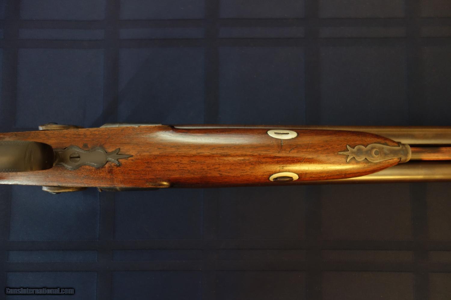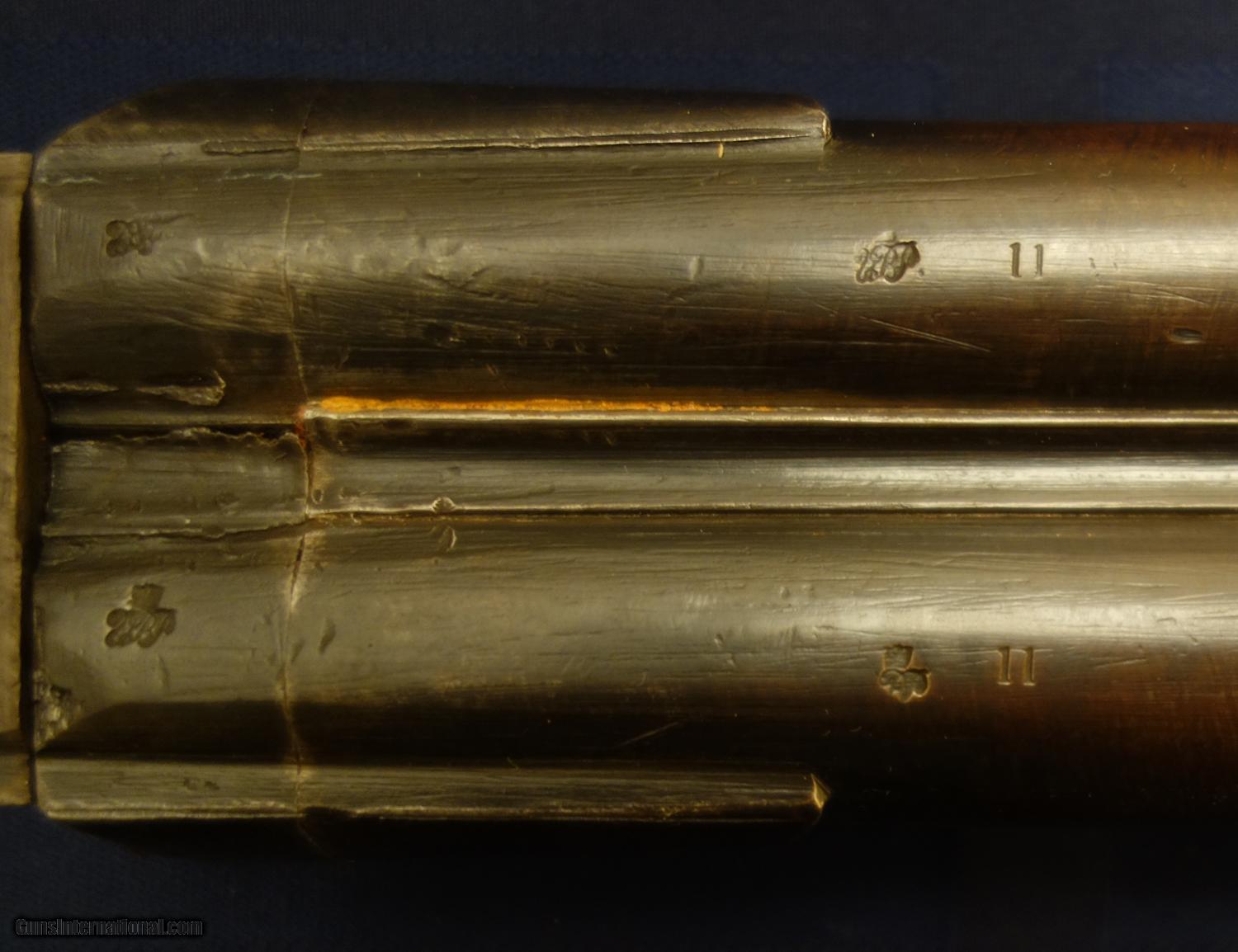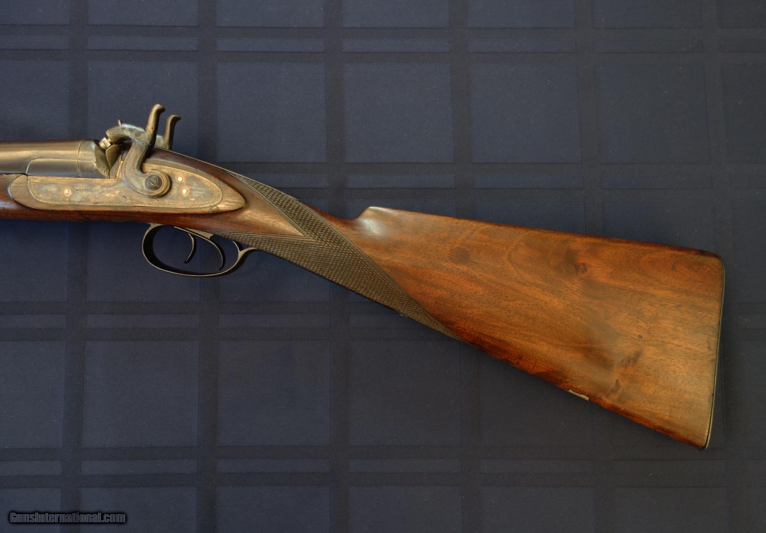 Description: SOLD PENDING ARRIVAL OF FUNDS This quality English double-gun was bought by my great grandfather for fowling in the early 1870s. Progresssive farmer, then later both schoolteacher and co-founder of the Huron Valley Bank, George Benton wrote several times of the pleasure he took in this firearm. As a boy, George Benton had been impressed by Prince Albert, Victoria's husband, and knew that this was the marque favored by Albert. It is a "William Moore & Co." percussion shotgun, 11 gauge, moderately heavy, with a "London Fine Twist" Damascus barrel, renewed by Brad Bachelder in 2000 and just about perfect. I have always assumed George Benton bought the gun new between 1870 and 1874, when his diaries first mentioned his successes with the gun in duck hunting. The marks on the underside of the barrel support this belief. The crowned VBP proof mark pictured was used by the Birmingham Gun Proof House from 1854. This, plus the absence of the "Not for Ball" mark that appeared on Damascus barrels in 1875, places the gun between 1854 and 1874. In 1999, reading the Double Gun Journal article mentioned below, I noted Franck's tribute to Brad Bachelder, "a master gunmaker in Grand Rapids" that rebrowned Franck's own William Moore. My own Moore was fundamentally in excellent condition, but in one spot on the barrel there was quarter's worth of surface rust, and the original ramrod was missing. I sent it to Bachelder, who rebrowned the barrel, case hardened lock and metal furnishings, and replicated the ramrod. The price was substantial ($800, and the bill accompanies the gun). The result is remarkable. My daughters being entirely uninterested in guns, even family guns, I am offering it to someone who wants an unusually fine example of the percussion double guns that made England famous in the Victorian era. WILLIAM MOORE, GUNMAKER As Michael S. Franck tells Moore's story in The Double Gun Journal in Winter, 1999, "William Moore was the son of Charles Moore, one of the foremost gunmakers in his day who ran a shop from 1780-1835 at 77 St. James Street. This was in the heart of the London gun quarter that produced the finest gunmakers in the world during the eighteenth, nineteenth, and early part of the twentieth Century... "Moore was apprenticed in the shop of the famous Joseph Manton, who ran and leased a shop at 315 Oxford Street. First as a stocker [who made and fitted stocks], Moore worked with other craftsmen who later became the first generation of modern gunmakers -- James Purdey, Joseph Lang, William Greener, Charles Lancaster, and others... A contemporary once described Moore as a 'very ingenious workman and an excellent shot...'" Legendary sportsman Colonel Peter Hawker, despite the fact he was wed to Lancaster's guns, regularly praised Moore. In his famous "Instructions to Young Sportsman" he wrote, "Also Mr. Charles Moore, who was an old hand at Joe's [Joseph Manton's], and knew, to a hair, how to fit a man's shoulder to a gun. I have often stood over him when he was a journeyman, and no man better pleased me with a job. Depend on it he will do well [as a gunmaker], and get to the top of the tree... 'Billy Moore' is a right-hand man with the 'knobs,' or crack pigeon shooters, and their patronage is a host in itself toward a good lift in business." (p.4 in the 1830 edition.) Hawker was on good terms with both the Duke of Clarence, who became King William IV, and also Victoria's husband Prince Albert. It is possible that Hawker's opinion contributed to the fact that Moore later became both "gunmaker to William IV" and "gunmaker to Prince Albert." Before 1833 Moore did strike out on his own, selling guns under William Moore and Company at 78 Edgware Road in London. Between 1847 and 1853, he partnered with William Gray at the Edgware Road shop, and the firm was rechristened William Moore and William Grey Gunmakers. Albert again awarded the credit "gunmaker to Prince Albert" to the Moore and Gray partnership. The partners and their employees then moved to Bond Street, Mayfair, the center of the best gunmakers in England at the time. (Old Bond Street and New Bond Street are one, by the way, the old distinction kept only in the postal addresses.) There the business was again titled "William Moore & Company," although the partnership with Gray persisted. There is speculation but no certainty on the death of William Moore, but most consider it likely soon before 1870, although it also may be signaled by the 1873 renaming of the company to William Moore, Gray & Co. in 1873. In any case, it is certain that Gray survived Moore, and continued to produce fine shotguns at the Bond Street address, with their crew of internal craftsmen, outworkers, and apprentices. Among the those who worked for Moore and Gray of 43 Old Bond Street were Henry Atkin jr., son of Henry Atkin, the first craftsman Purdey had hired when he set up shop. The younger Atkin was first apprenticed to his father, at Purdey, and then worked for Moore and Gray from 1862 to approximately 1874. (See G.T. Teasdale-Buckell, in his Experts on Guns and Shooting, who actually interviewed the younger Atkin.) When Atkin set up his own shop, the firm he founded eventually became Atkin, Grant & Lang Ltd. A Moore and Gray apprentice who became particularly important in the trade was Frederick Beesley, whose company also survives today. Among several important innovations, he invented the so-called "self opening action" that was purchased by Purdey. As the Beesley company tells his story: "In 1861, upon reaching his 15th birthday, Frederick secured an [10 year] apprenticeship with the London gunmaking firm of William Moore & Grey, indentured to William Grey, at 43 Old Bond Street. It is probable that Moore died during Frederick’s apprenticeship. Grey however was a canny businessman who had helped Joseph Manton run his firm. He passed on to Frederick some of those skills that would prove so useful to him when he came to run his own business