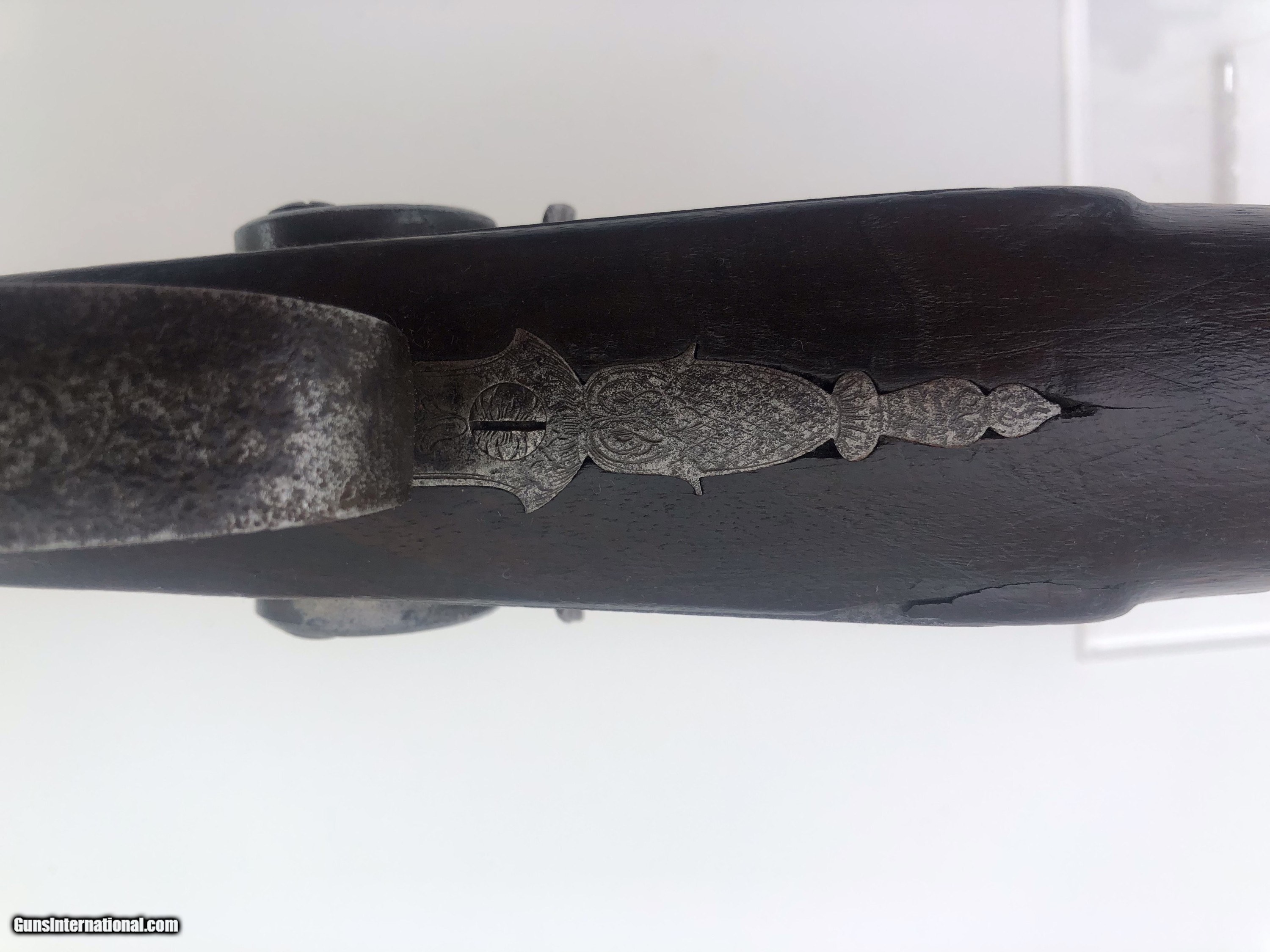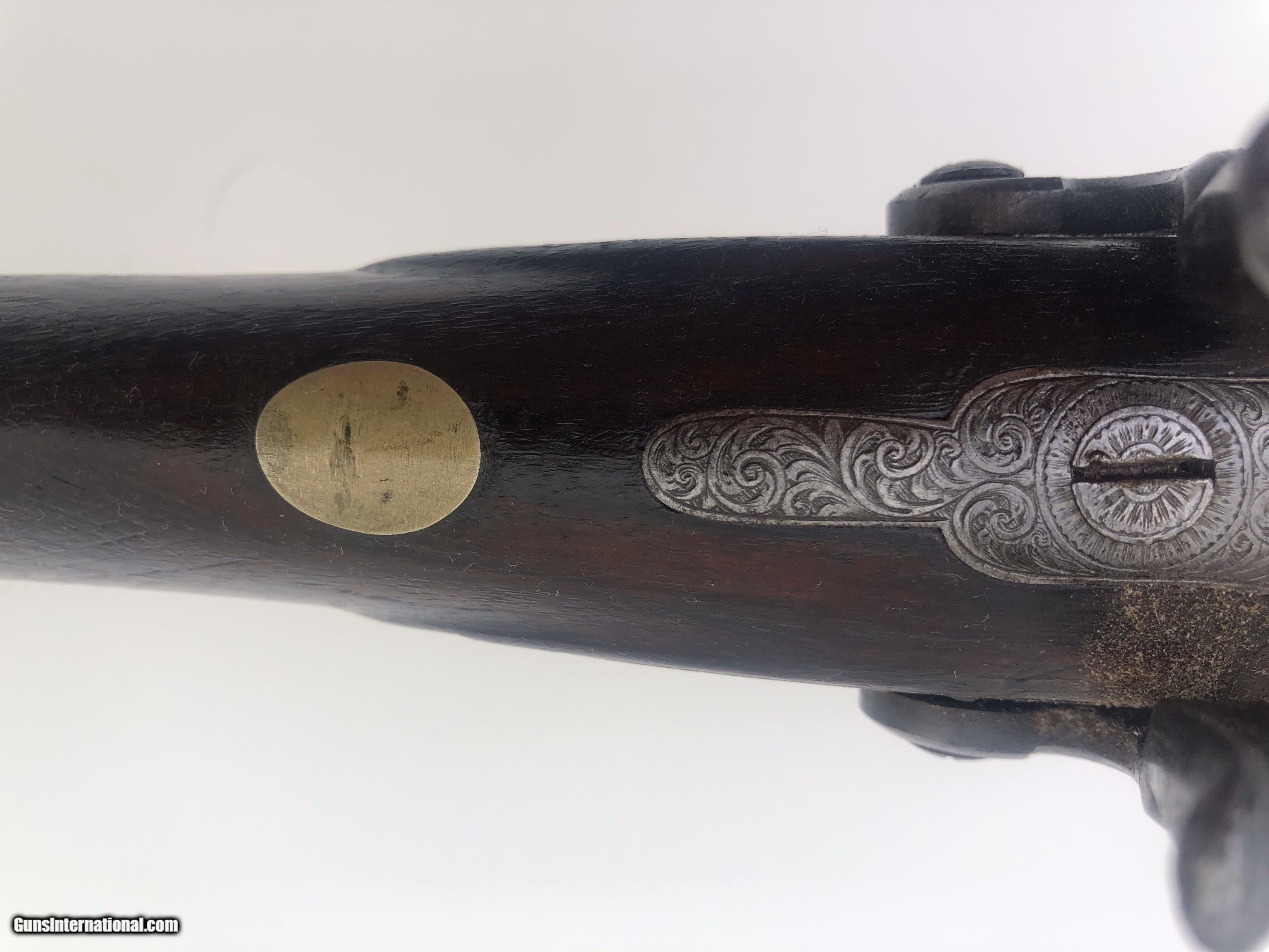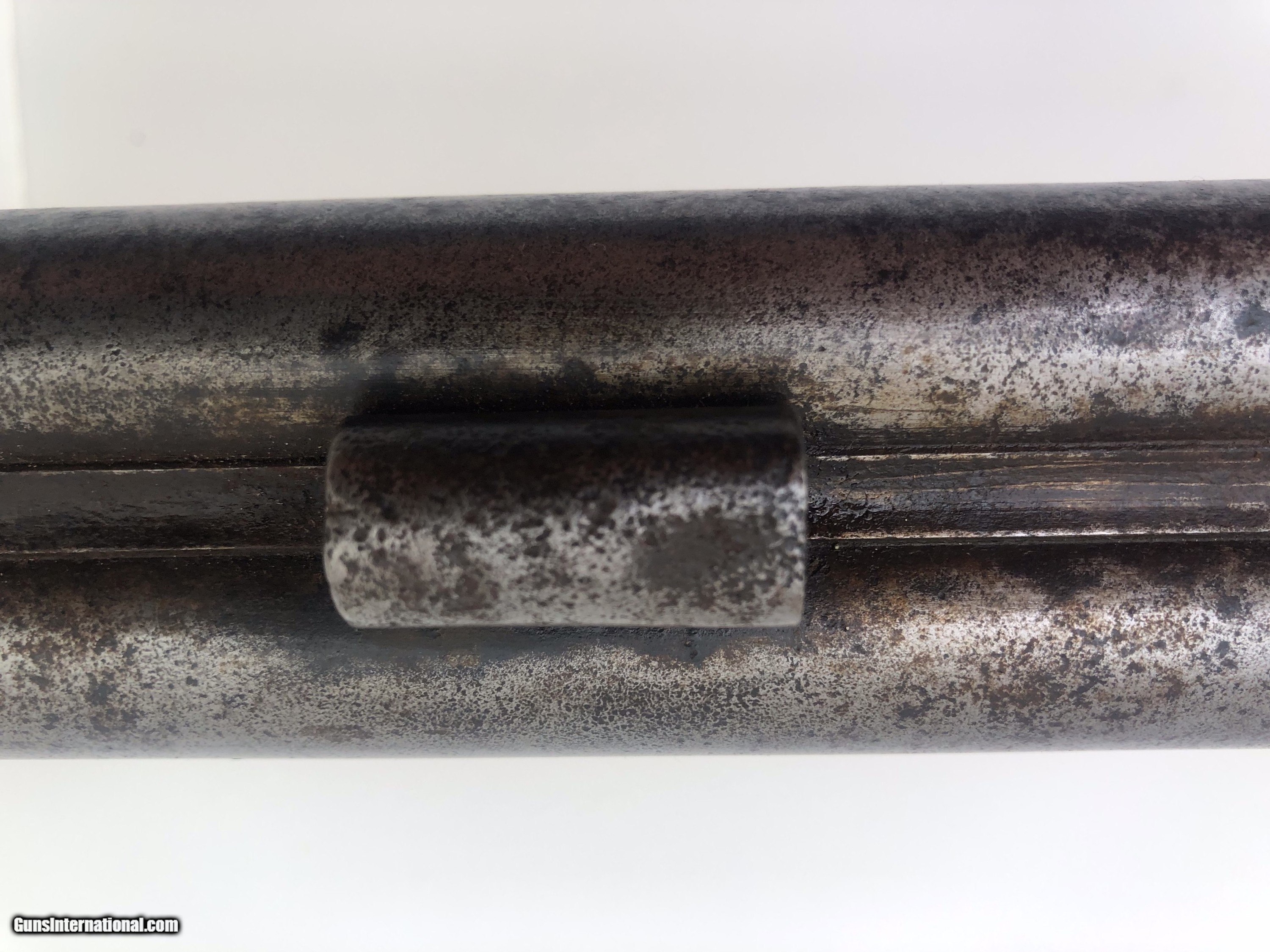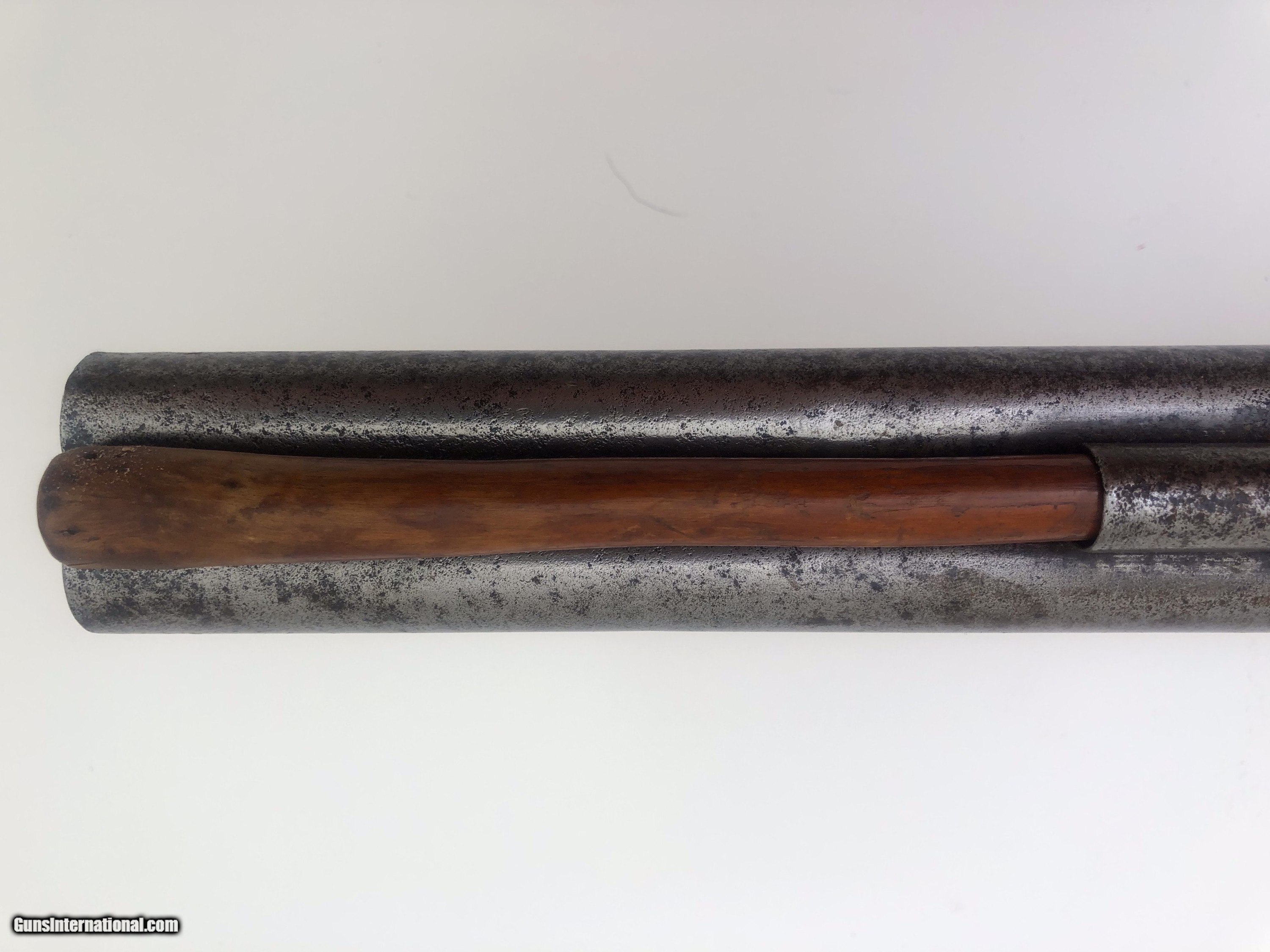 Description: A Charles Playfair double barrel 12 gsuge percussion shotgun. The center barrel rib is marked "Charles Playfair Maker 92 Parliament Street, London. Fine Laminated Steel Industructable By Gunpowder" Dimensions-- Overall 45.5" Barrel 29.0" Condition--Overall dark age patina with scattered pitting. The wood is sound, the bore is good with some spotting and the action is excellent. SOLD Antique: Yes Manufacturer: Charles Playfair Serial Number: 4296 |
