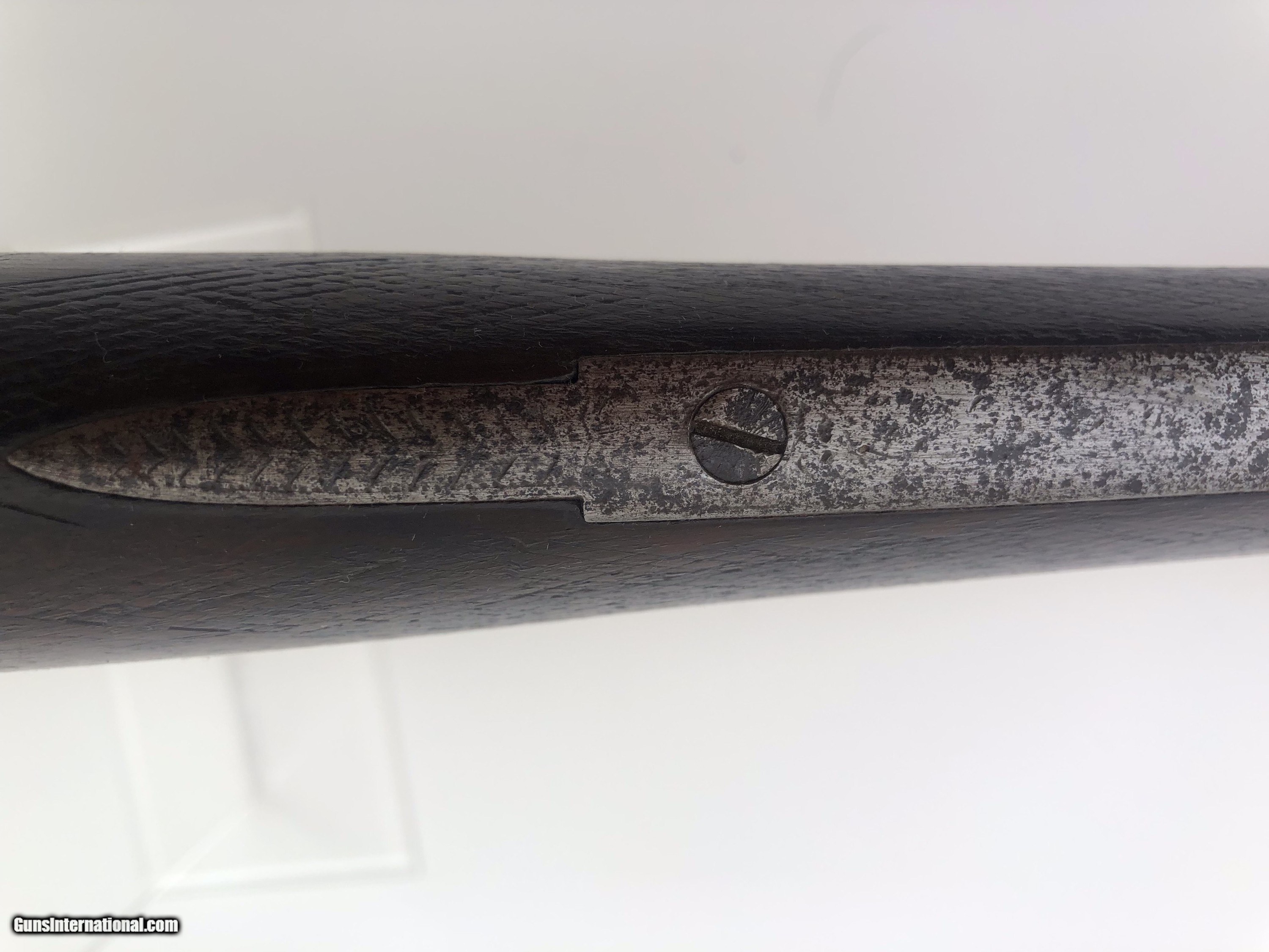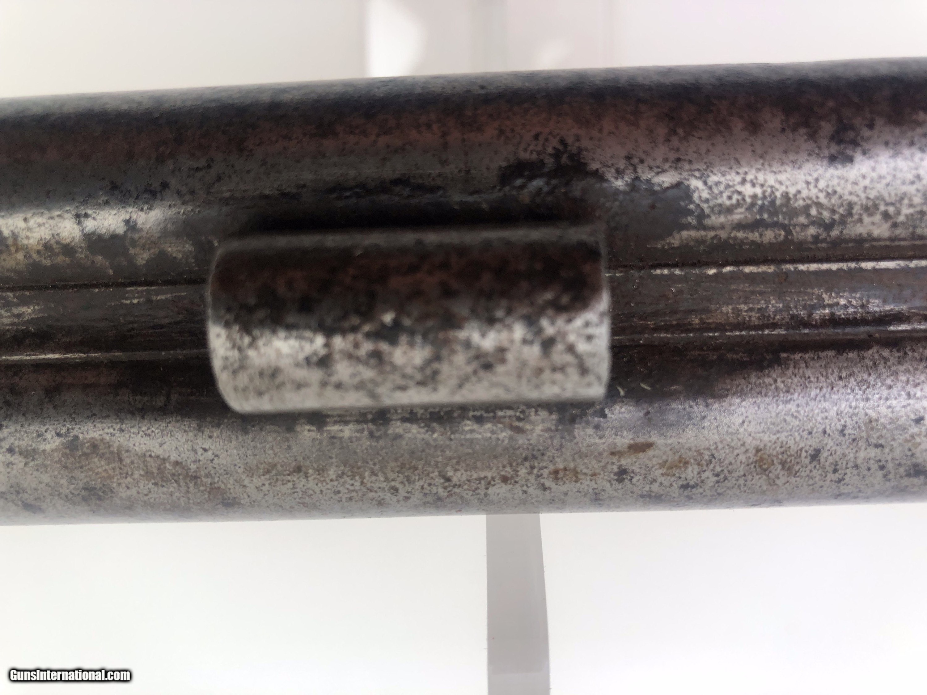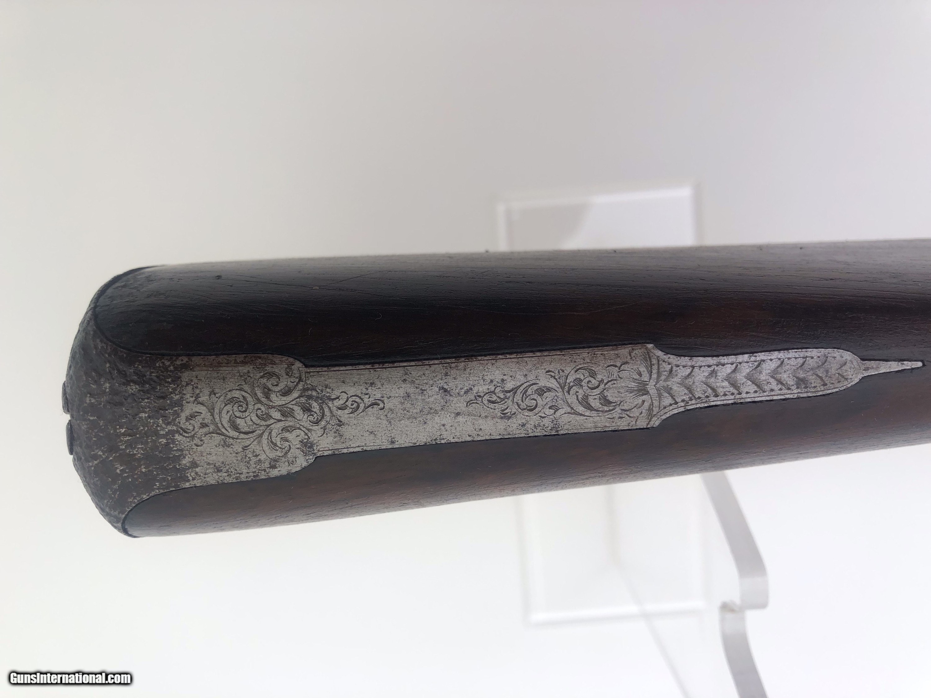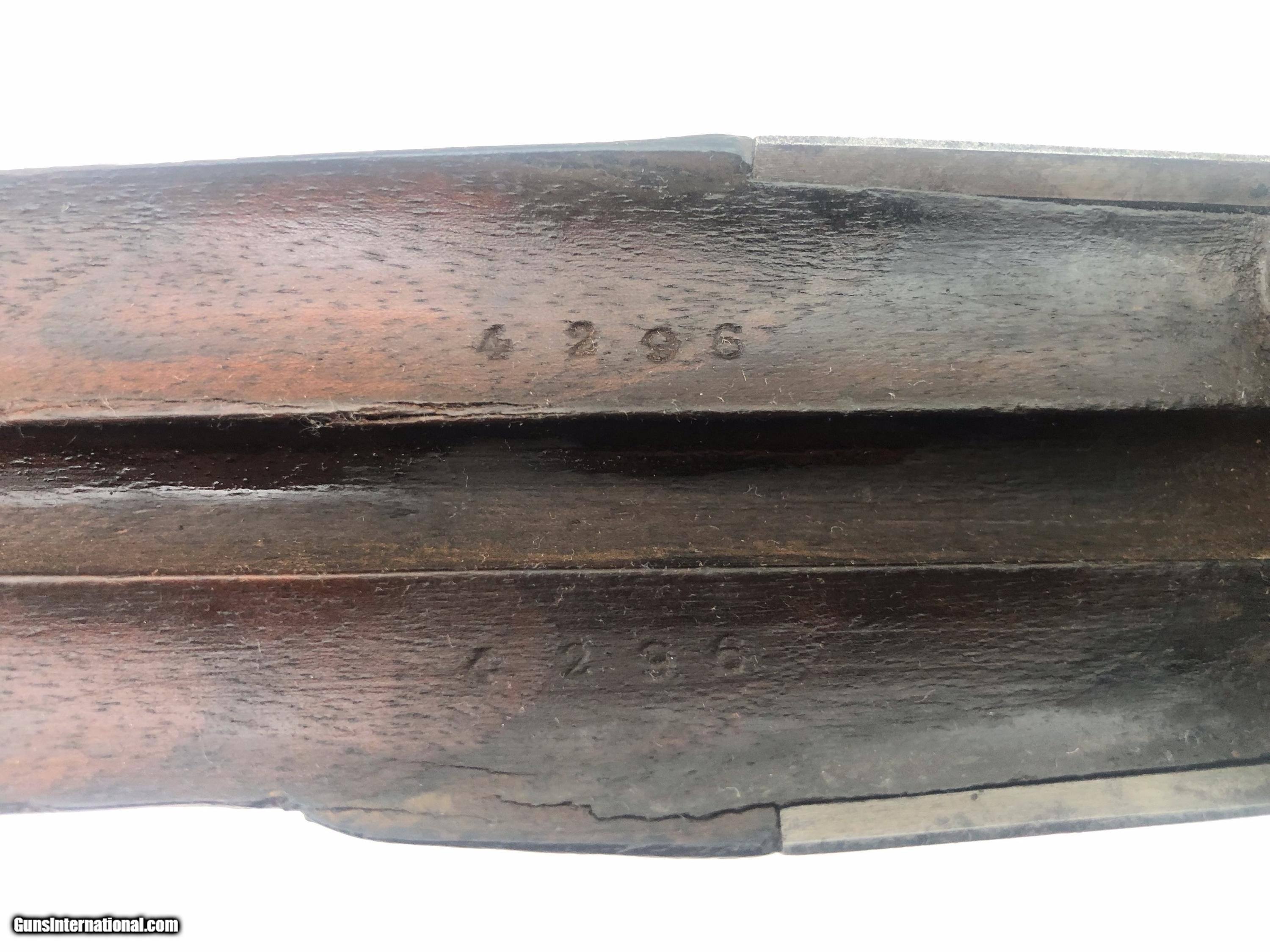 Description: A Charles Playfair double barrel 12 gsuge percussion shotgun. The center barrel rib is marked "Charles Playfair Maker 92 Parliament Street, London. Fine Laminated Steel Industructable By Gunpowder" Dimensions-- Overall 45.5" Barrel 29.0" Condition--Overall dark age patina with scattered pitting. The wood is sound, the bore is good with some spotting and the action is excellent. SOLD Antique: Yes Manufacturer: Charles Playfair Serial Number: 4296 |