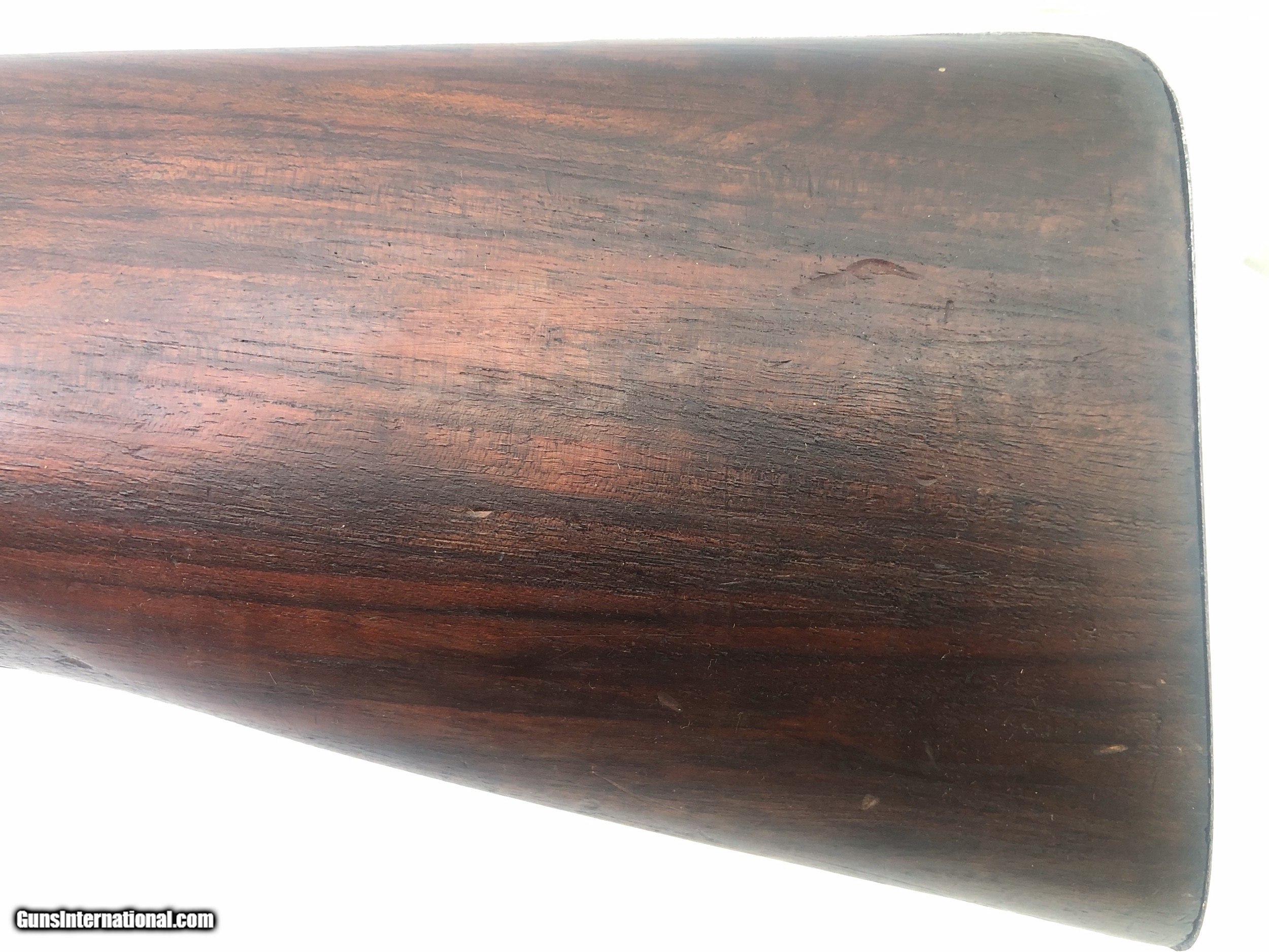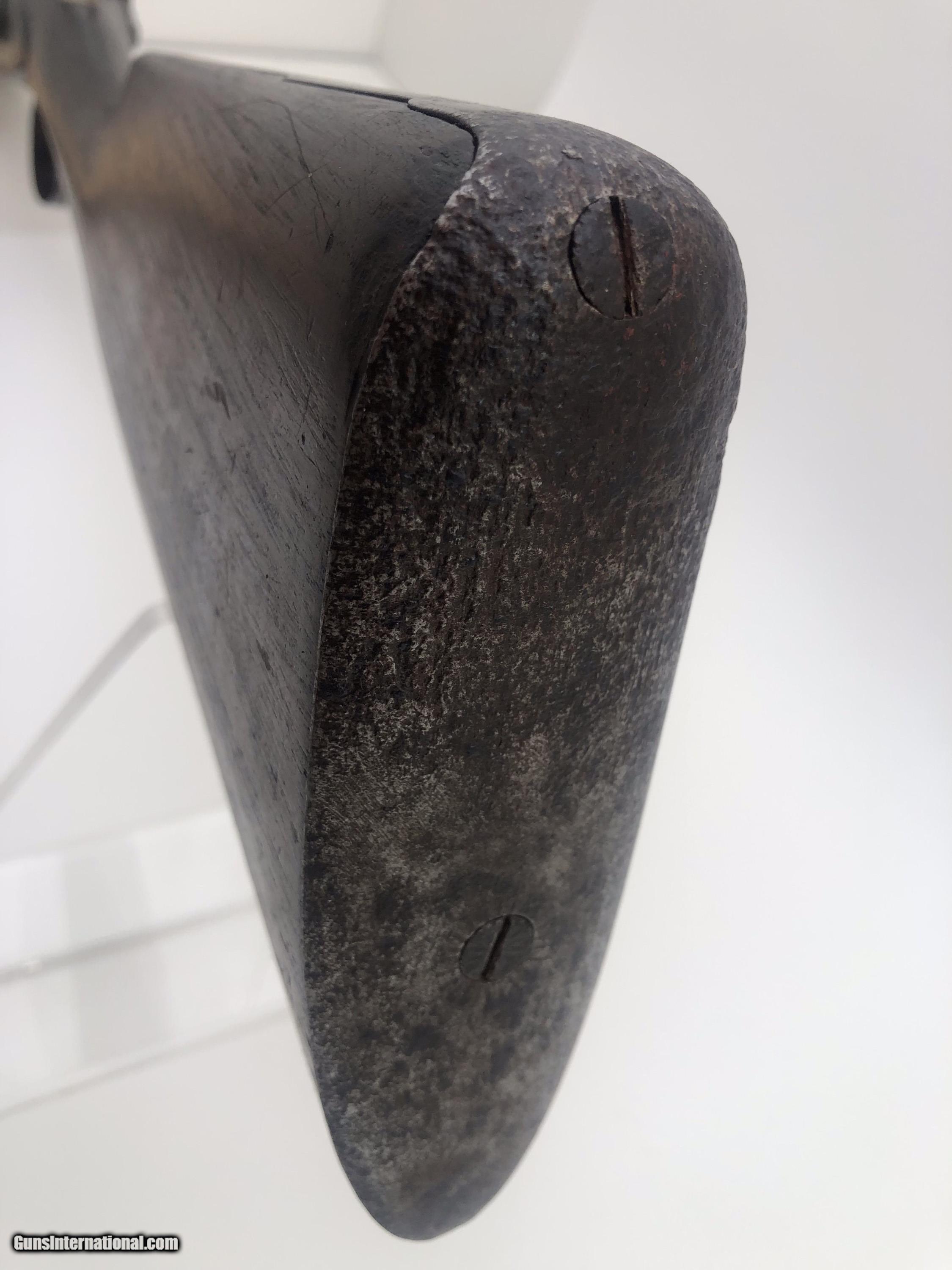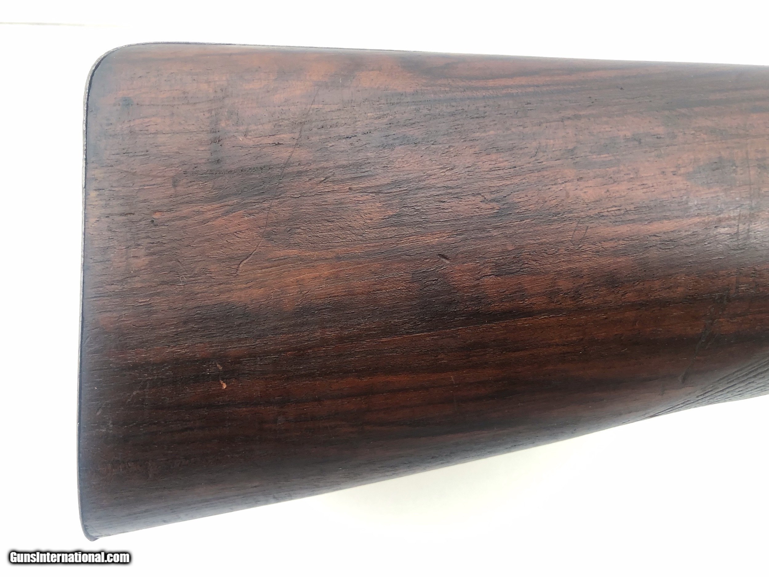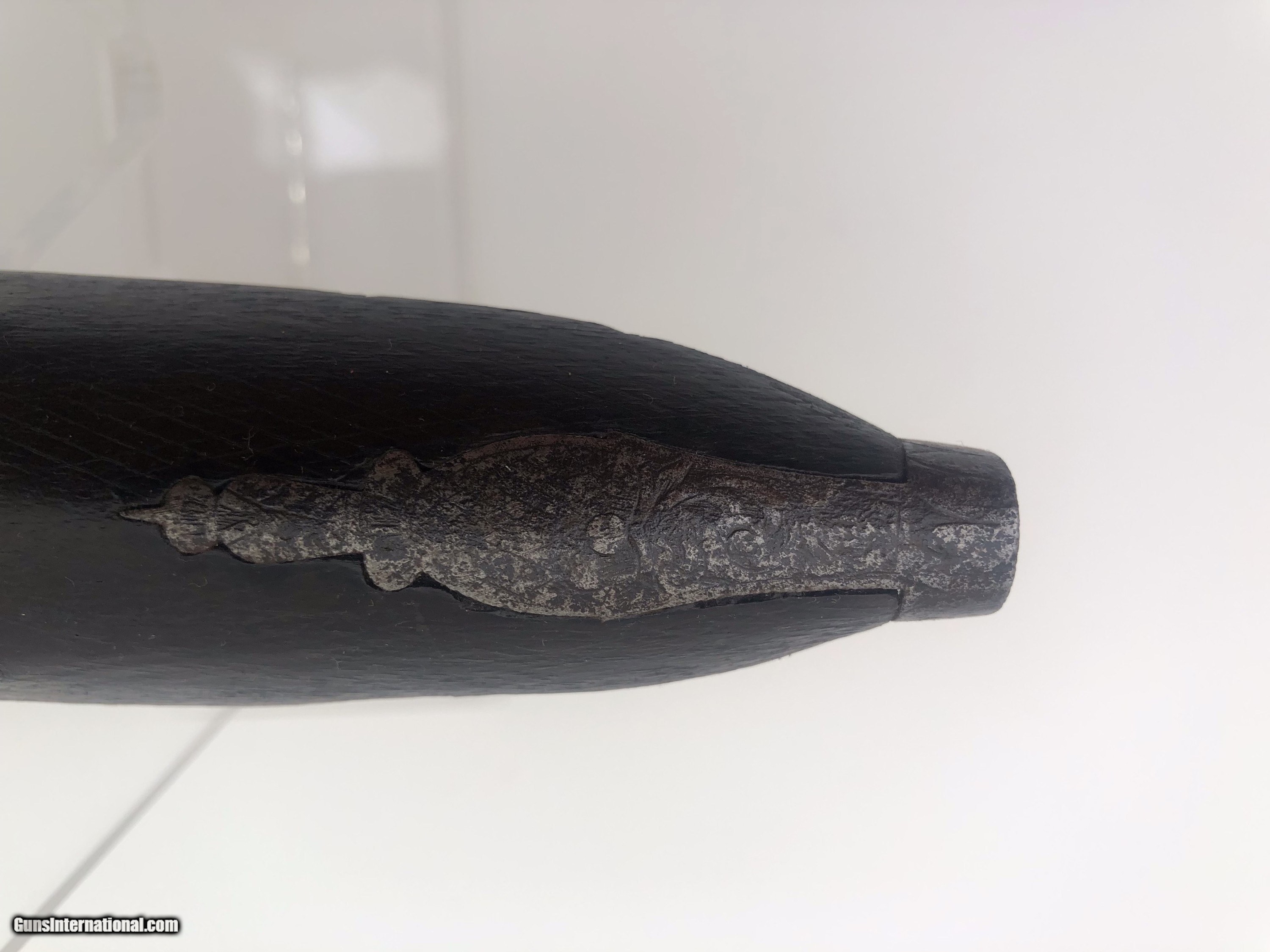 Description: A Charles Playfair double barrel 12 gsuge percussion shotgun. The center barrel rib is marked "Charles Playfair Maker 92 Parliament Street, London. Fine Laminated Steel Industructable By Gunpowder" Dimensions-- Overall 45.5" Barrel 29.0" Condition--Overall dark age patina with scattered pitting. The wood is sound, the bore is good with some spotting and the action is excellent. SOLD Antique: Yes Manufacturer: Charles Playfair Serial Number: 4296 |