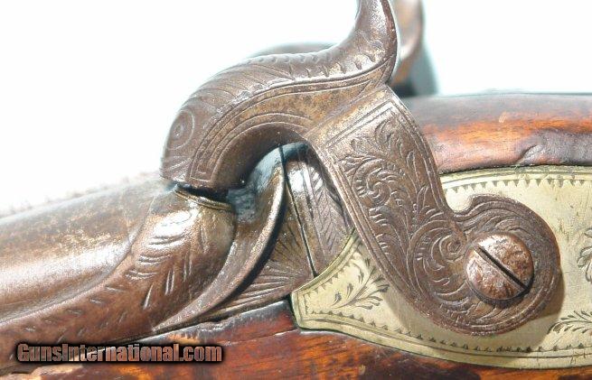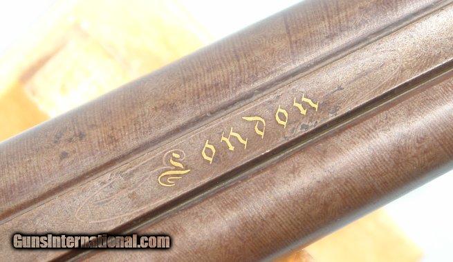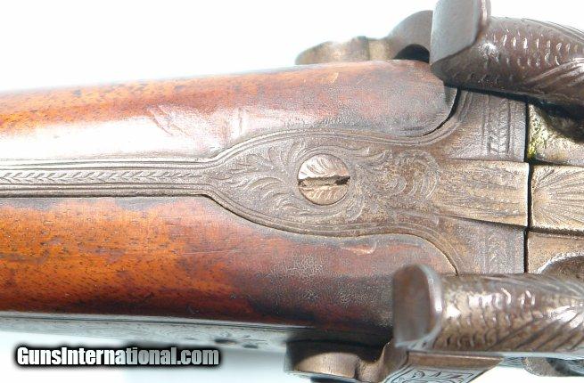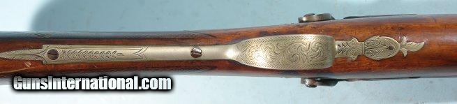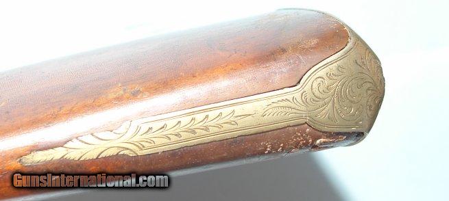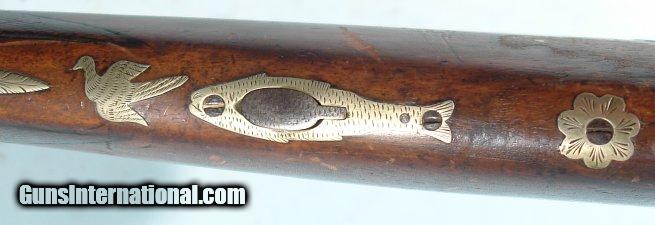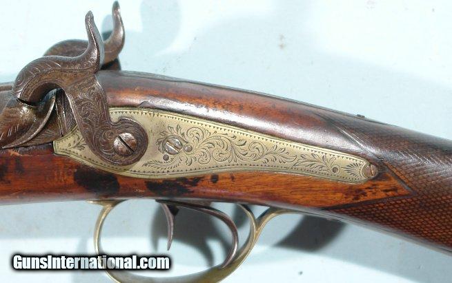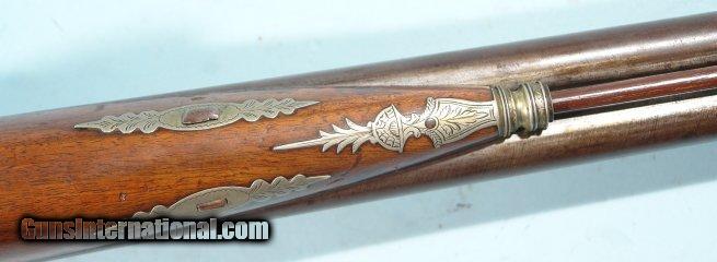 Description: AMERICAN SILVER INLAID PERCUSSION DOUBLE SHOTGUN, CIRCA 1840-50. 35" damascus barrels with gold 'London" inlaid in rib. Profusely inlaid with nickel german silver hardware including buttplate and back action locks as well as triggerguard. Ramrod pipes nickel silver with pineapple spray engraved ornate finial. Wedge sideplates also engraved. Extra long and wide ornately engraved triggerguard also nickel silver. Behind triggerguard are nickel silver dove or pigeon, large 3" fish with integral nipple trap and floral rosette. Large buttplate in nickel silver as well with same engraving. Although barrels stamped with Liege Belgian proofs this type of shotgun was popular in America and higher grade ones finished here in the Philadelphia style engraving pattern similar to Henry Deringer and Krider. Back action locks are solid silver with original engraved hammers. Perfect working order. Original checkering neVer touched up or recut. Bit of water staining to finish at left buttstock but not a concern. Original ramrod with screw type tip. About 14ga. Original nipples. No dents or dings in barrels and crown of muzzles excellent. Would make a nice addition to early American shotgun collection or just hang above a mantle. SOLD Antique: Yes |
