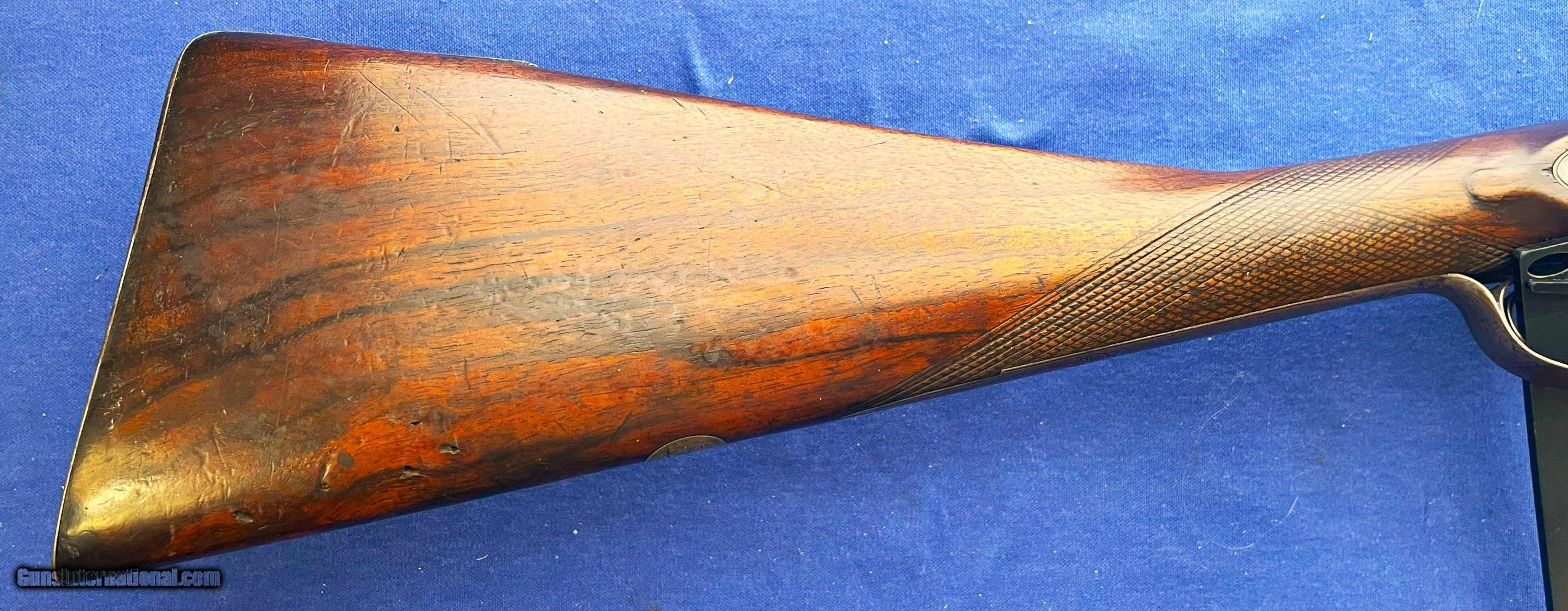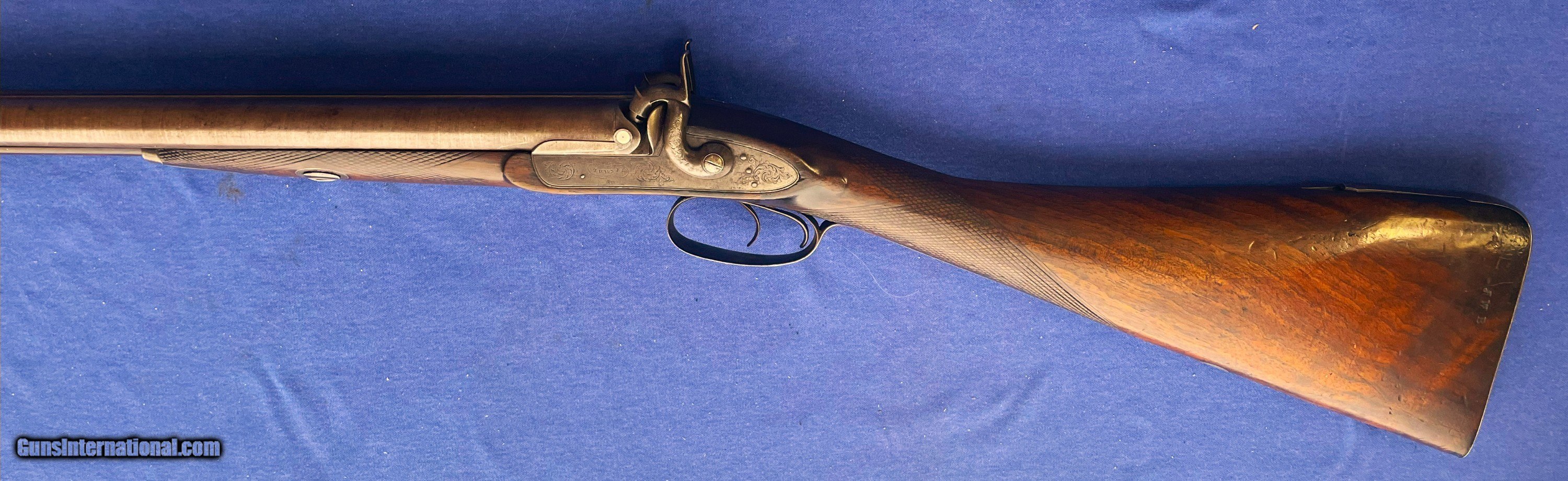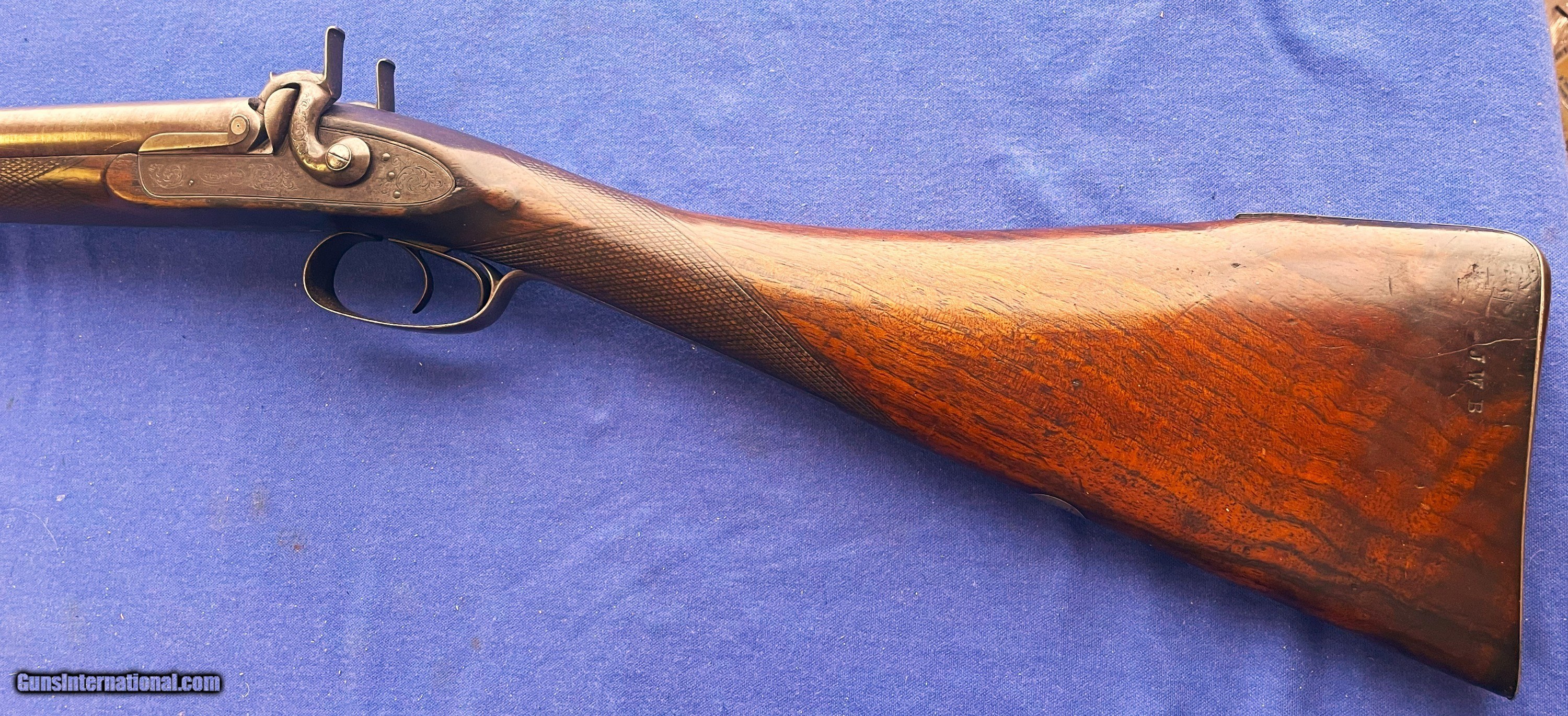 Description: 1860s CIVIL WAR ERA THOMAS TURNER 14 ga. ENGLISH SxS DOUBLE BARREL PERCUSSION SHOTGUN. 28" BARRELS, FINE BRIGHT PIT FREE BORES. RIB MARKED "THOs. TURNER. 3. MIDDLE ROW. READING." (A LISTED ENGLISH MAKER) IT STILL SHOWING GOOD TWIST PATTERN WITH SOME MINOR SCATTERED BLEMISHES. METAL SURFACES A NICE EVEN BROWINISH COLOR. LOCK PLATES, HAMMERS, TRIGGERGUARD, NOSE PLATE & BUTTPLATE HAVE FINE QUALITY FOLATE ENGRAVING. LOCKS ARE CRISP WITH 2 CLICK HAMMERS. WALNUT STOCK SHOWS EXTRA GRAIN FIGURE, NO CRACKS or CHIPS WITH SOME EXPECTED WEAR & USE MARKS. OVERALL THIS IS A QUALITY DOUBLE THAT SHOULD BE A QUICK HANDLING BIRD GUN IF WANTED WITH A WEIGHT OF ONLY ABOUT 5 1/2 POUNDS. $50.00 S&H DIRECT TO YOU IN U.S. ANYWHERE THAT'S OK, NO LICENSE NEEDED. NO SALES TO NEW YORK STATE ! SOLD Antique: Yes Shotgun Gauge: 14 Gauge Manufacturer: THOMAS TURNER Model: PERCUSSION Barrel Length: 28 Bore: BRIGHT Chambers: 2 Condition: NEAR EXCELLENT Metal Condition: ORIGINAL Wood Condition: EXCELLENT Bore Condition: EXCELLENT Barrels: FINE TWIST Barrel Type: SxS Action: CRISP & TIGHT Triggers: DOUBLE Stock: WALNUT Fore End: WALNUT Butt Pad: METAL LOP: 14 Rib: MAKER MARKED Finish: ORIGINAL Weight: 5 lb 8oz Manufacture Date: 1860s ERA Choke Left: .72 Choke Right: .72 |