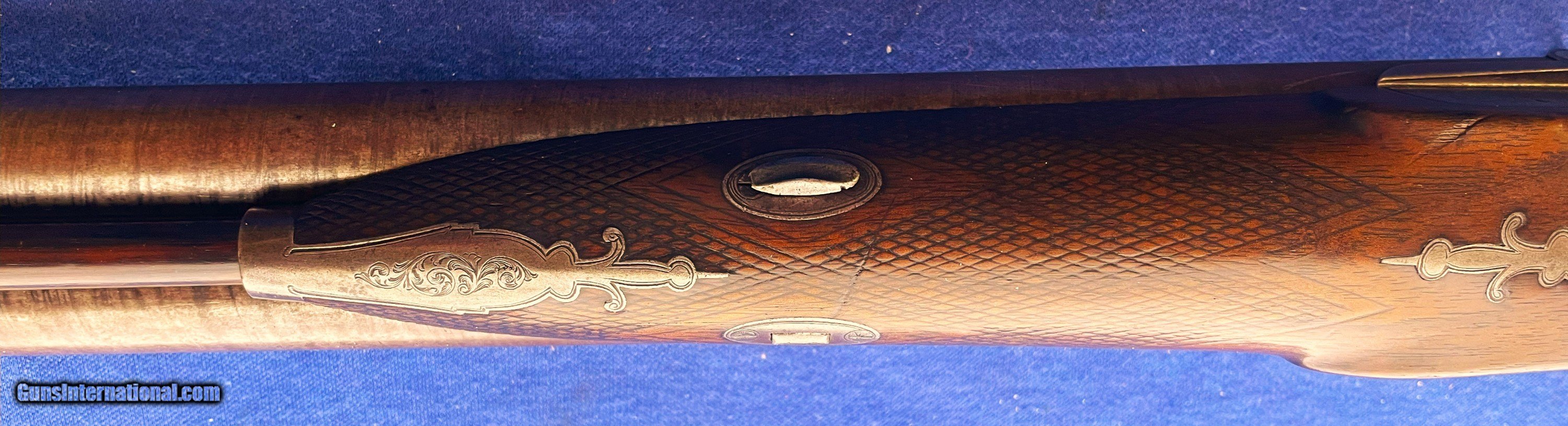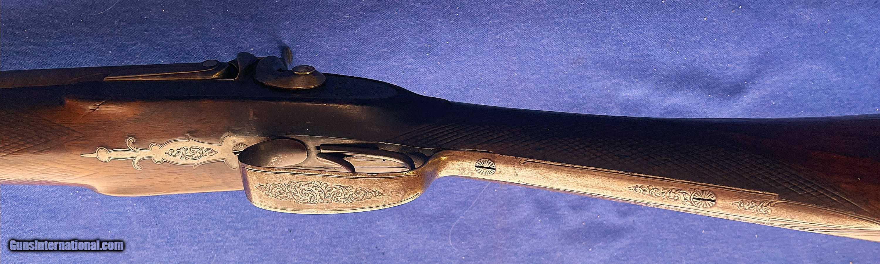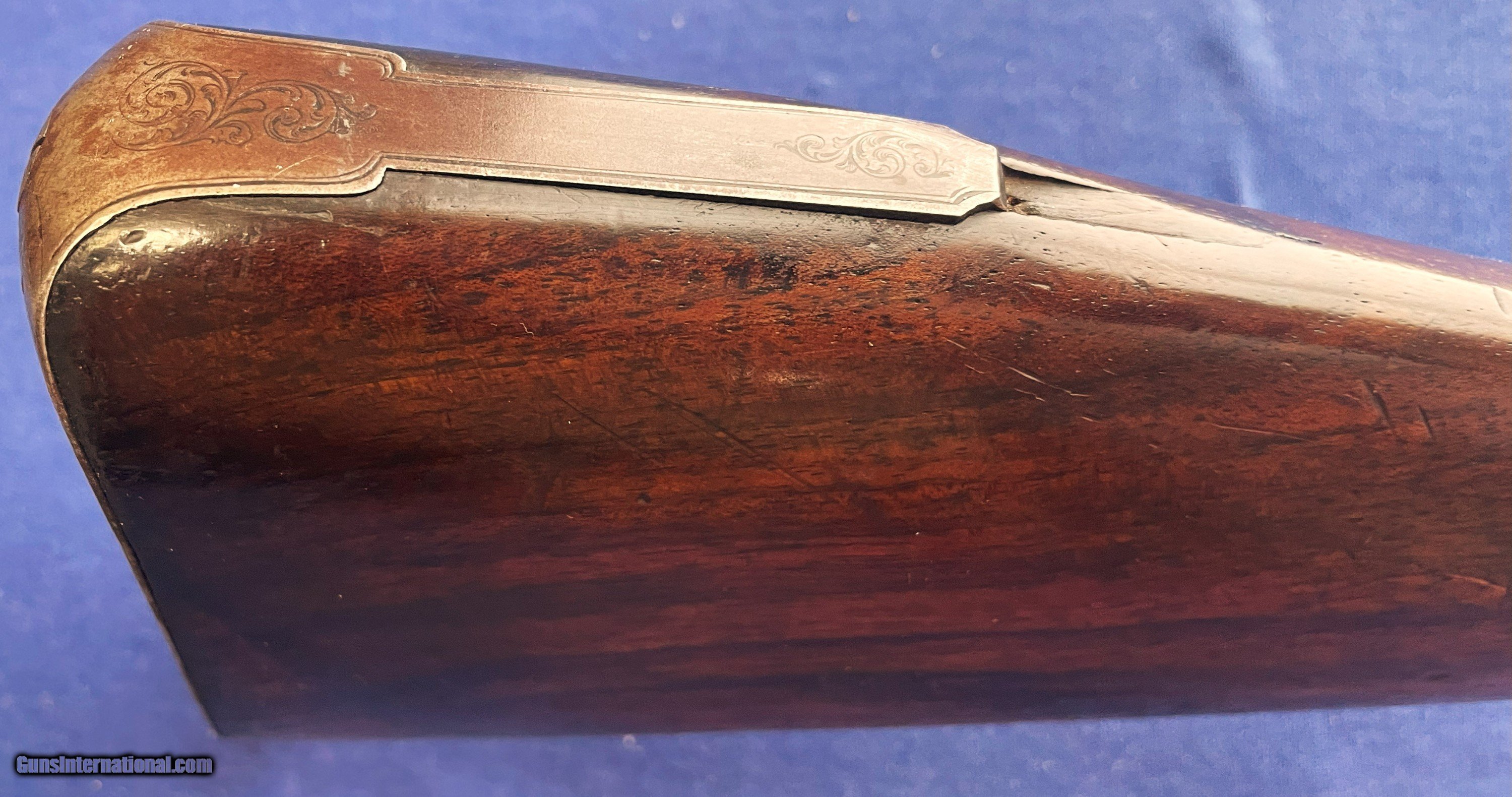 Description: 1860s CIVIL WAR ERA THOMAS TURNER 14 ga. ENGLISH SxS DOUBLE BARREL PERCUSSION SHOTGUN. 28" BARRELS, FINE BRIGHT PIT FREE BORES. RIB MARKED "THOs. TURNER. 3. MIDDLE ROW. READING." (A LISTED ENGLISH MAKER) IT STILL SHOWING GOOD TWIST PATTERN WITH SOME MINOR SCATTERED BLEMISHES. METAL SURFACES A NICE EVEN BROWINISH COLOR. LOCK PLATES, HAMMERS, TRIGGERGUARD, NOSE PLATE & BUTTPLATE HAVE FINE QUALITY FOLATE ENGRAVING. LOCKS ARE CRISP WITH 2 CLICK HAMMERS. WALNUT STOCK SHOWS EXTRA GRAIN FIGURE, NO CRACKS or CHIPS WITH SOME EXPECTED WEAR & USE MARKS. OVERALL THIS IS A QUALITY DOUBLE THAT SHOULD BE A QUICK HANDLING BIRD GUN IF WANTED WITH A WEIGHT OF ONLY ABOUT 5 1/2 POUNDS. $50.00 S&H DIRECT TO YOU IN U.S. ANYWHERE THAT'S OK, NO LICENSE NEEDED. NO SALES TO NEW YORK STATE ! SOLD Antique: Yes Shotgun Gauge: 14 Gauge Manufacturer: THOMAS TURNER Model: PERCUSSION Barrel Length: 28 Bore: BRIGHT Chambers: 2 Condition: NEAR EXCELLENT Metal Condition: ORIGINAL Wood Condition: EXCELLENT Bore Condition: EXCELLENT Barrels: FINE TWIST Barrel Type: SxS Action: CRISP & TIGHT Triggers: DOUBLE Stock: WALNUT Fore End: WALNUT Butt Pad: METAL LOP: 14 Rib: MAKER MARKED Finish: ORIGINAL Weight: 5 lb 8oz Manufacture Date: 1860s ERA Choke Left: .72 Choke Right: .72 |