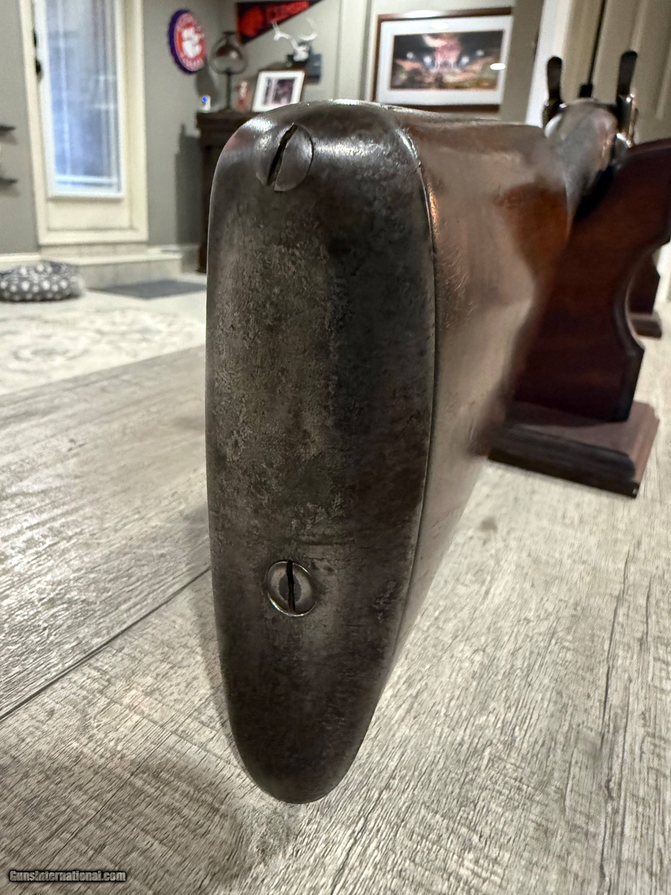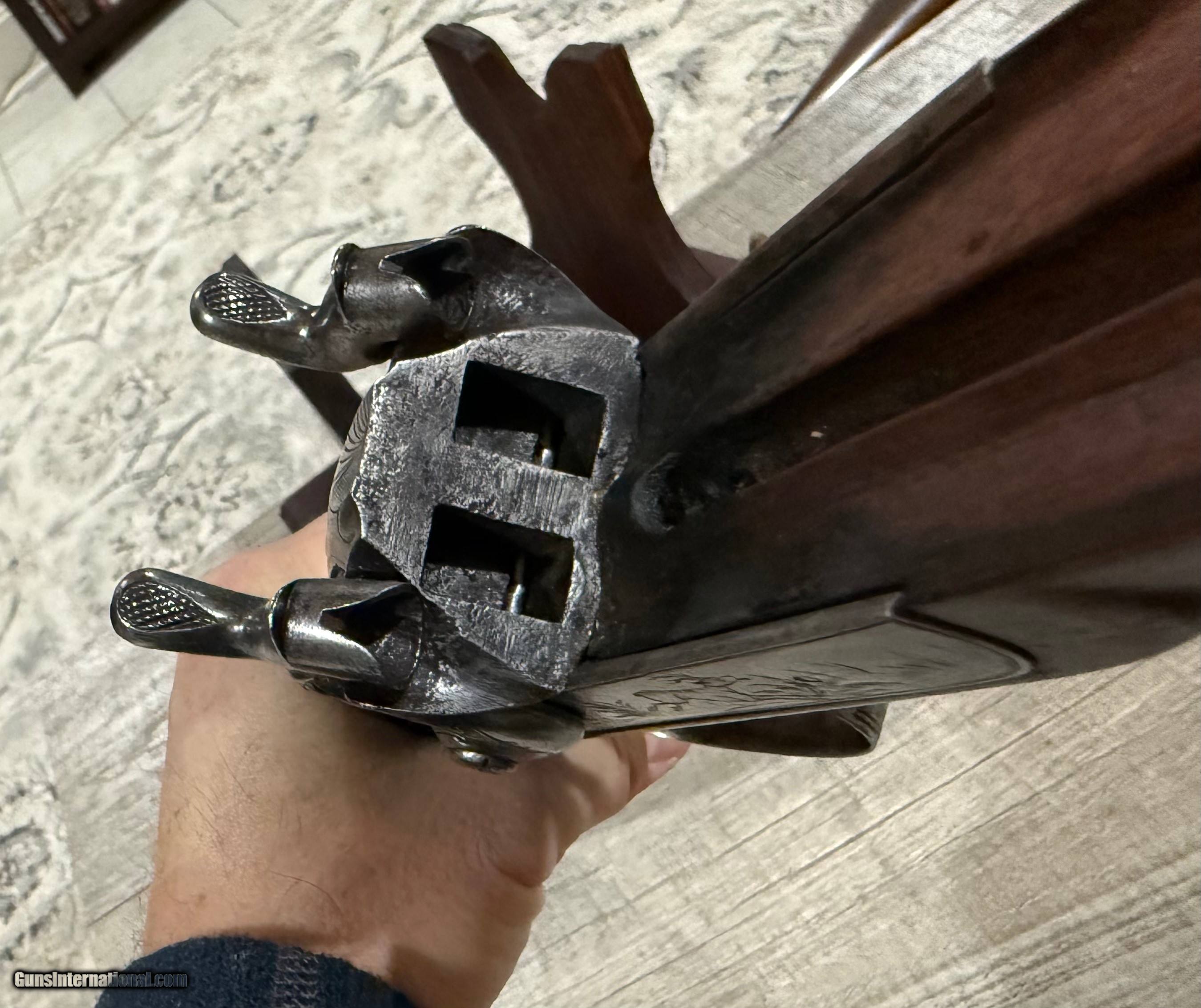 Description: Up for your consideration is a very nice 10 ga percussion shotgun. Very pretty 31 inch Damascus barrels, tall hammers and engraved lock plates featuring dogs. LOP is 13.5 inches and the drop is 1 1/2" and 2 1/4" at the comb and heel respectively. Good weight with this gun at almost 10 pounds! No cracks in the stock. Please review the pictures for condition and don't hesitate to reach out with any questions. $900. Ships directly to your door for $70 with no FFL required. Antique: Yes Shotgun Gauge: 10 Gauge Price: $900.00 Shipping: $70.00 Contact Seller |