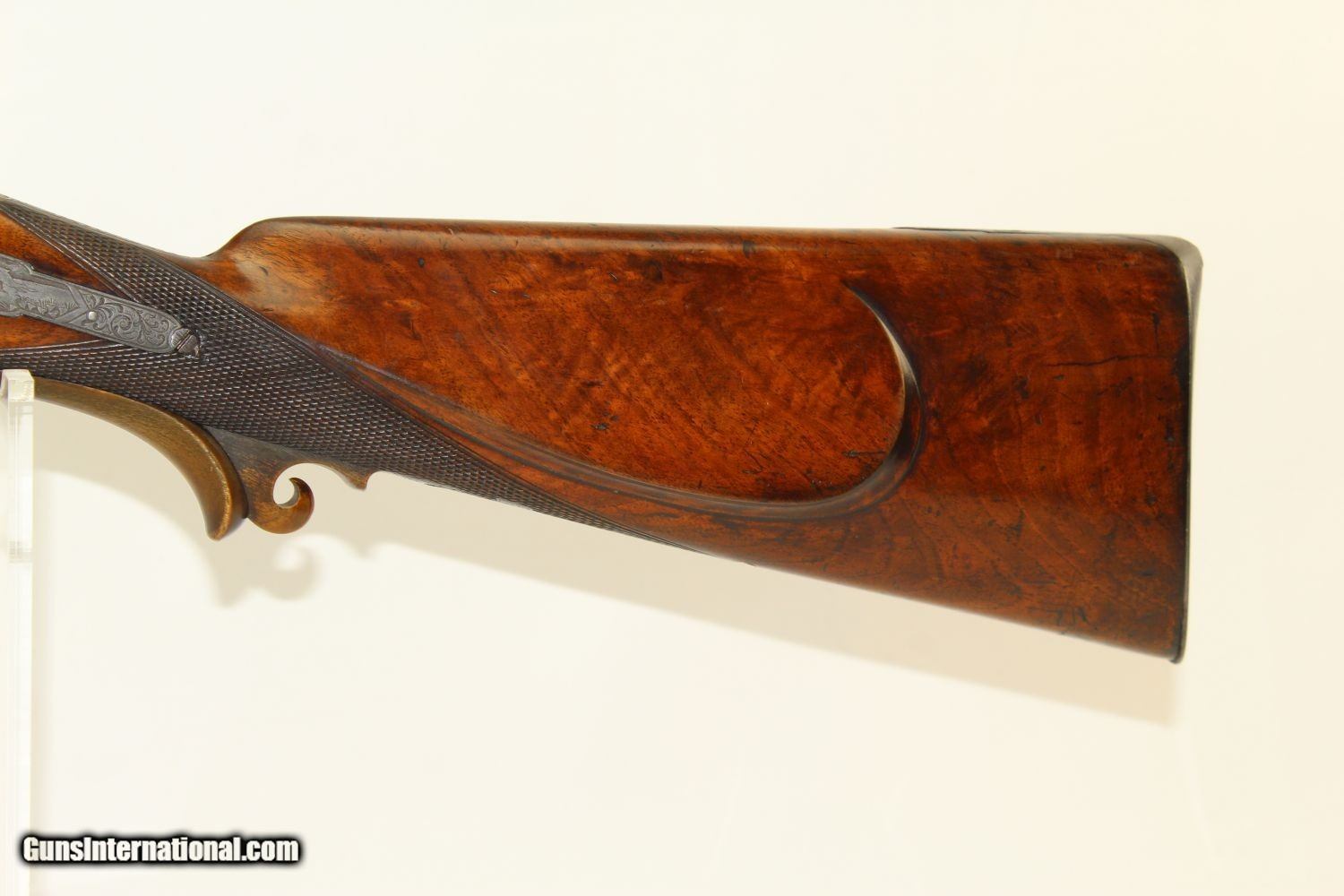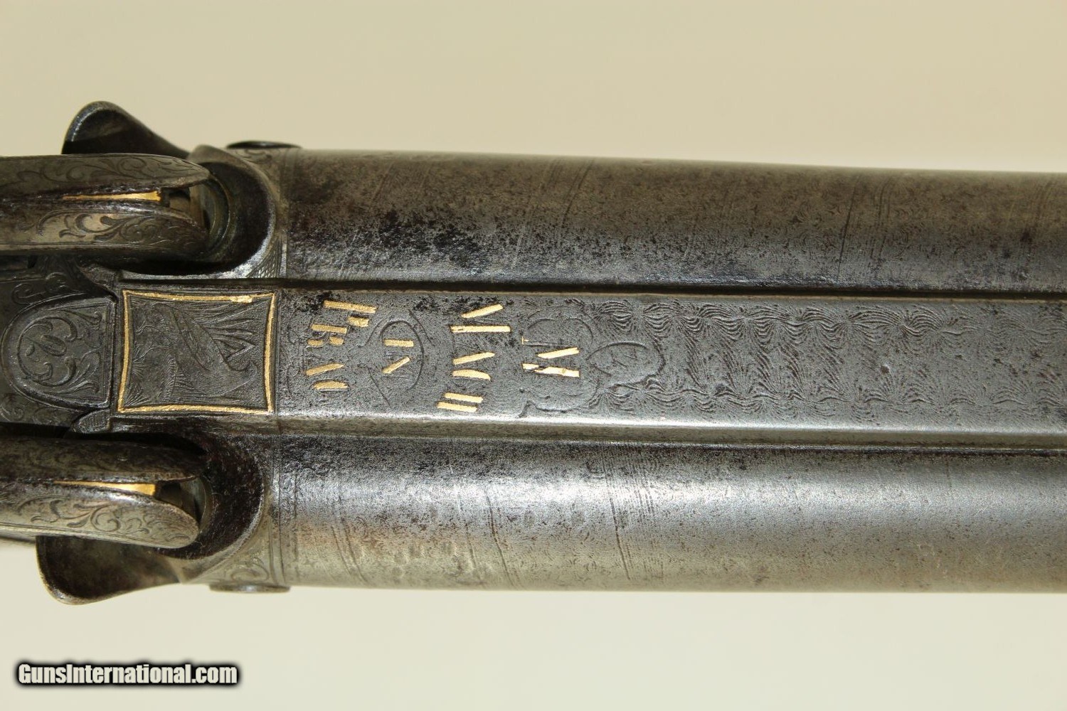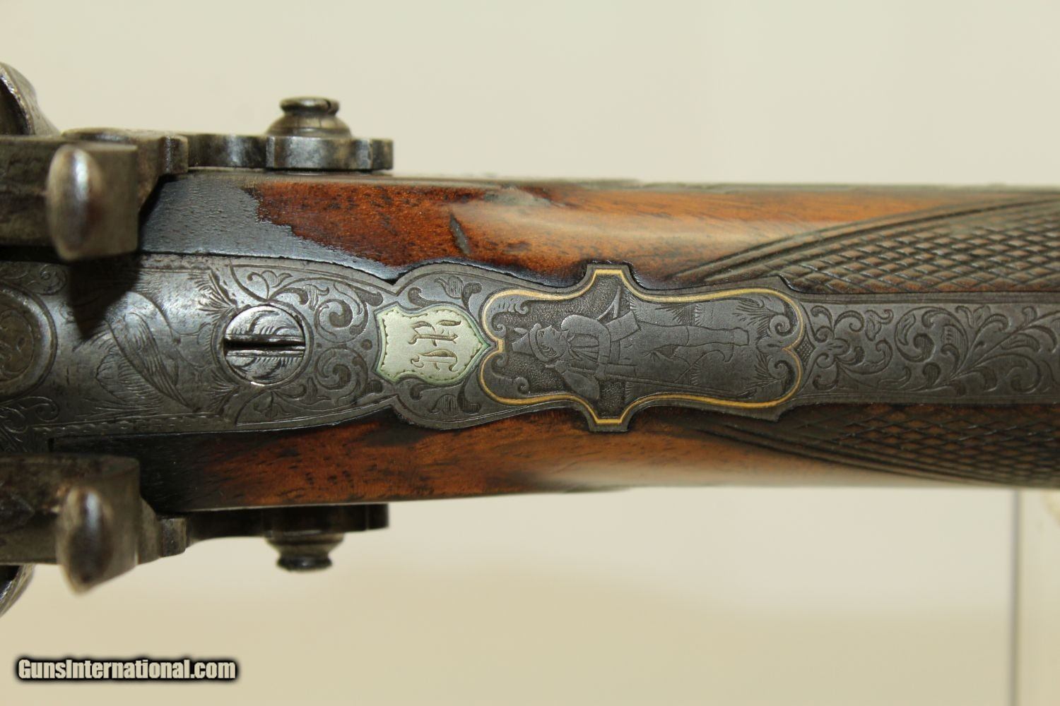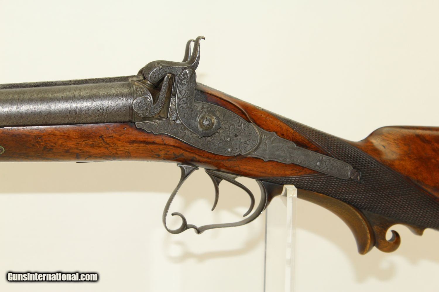 Description: BOHEMIAN Antique MATTHIAS MACH SidexSide HAMMER Shotgun MATYAS Prague Prag Gorgeous Engraved and GOLD INLAID Double Gun Here we present an Antique Percussion Side by Side Shotgun by Matthias (also spelled Matyas) Mach, made sometime in the mid-19th Century in Prague (Prag). Bohemia is the westernmost and largest historical region of the Czech lands in the present-day Czech Republic. In a broader meaning, Bohemia sometimes refers to the entire Czech territory. Prague was the capital of the region. Mach was a prestigious maker of high-end firearms in the mid-to-late 19th Century, his work featuring exquisite engraving as you can see here. This elegant shotgun features twin Damascus twist barrels with a full-length Damascene rib. The stock has a beautiful grain and a generous cheek rest on the left side. All the steel hardware is excellently scroll engraved and panels of game scenes are found on the locks (right: fox; left: rabbit), trigger guard (duck), barrel (game birds), and top tang (Bohemian man). “M MACH IN PRAG” can be observed on each lock and gilt on the top of the barrel. The trigger guard is large and curvaceous and is coupled with an extension off the back in horn. This is a very classy shotgun and one that would still perform beautifully on any of the game described above. The overall condition is fine. The barrels show their fine Damascene twist pattern. Fantastic gold accents. The stock has an excellent grain and remains smooth and solid. The bores are smooth and bright. The actions are excellent, strong and crisp. A very high-quality double gun from mid-19th Century Prague! Own the original! This is a legitimate antique and not a reproduction. Barrels are 28-3/4 inches. Caliber: 12 Gauge LOP: 14 inches Overall condition as seen in photos. Very Fast. Very Safe. FREE SHIPPING WORLDWIDE. Delivered directly to your door by express mail! Guaranteed AUTHENTIC & Includes CERTIFICATE OF AUTHENTICITY. ancestryguns $2875 #191035 SOLD Antique: Yes |