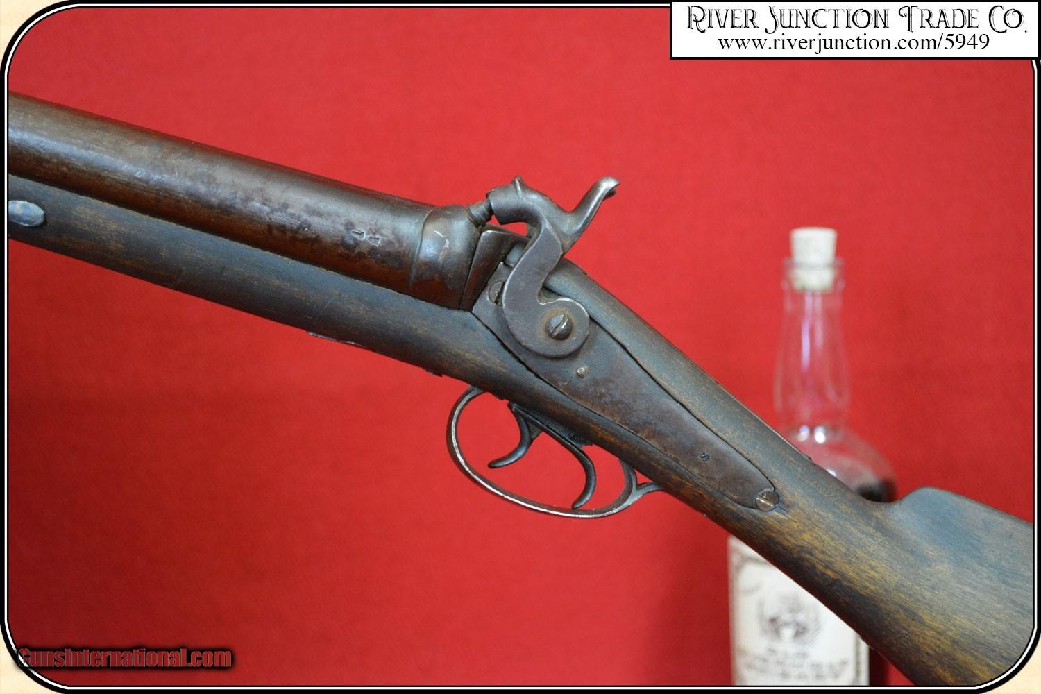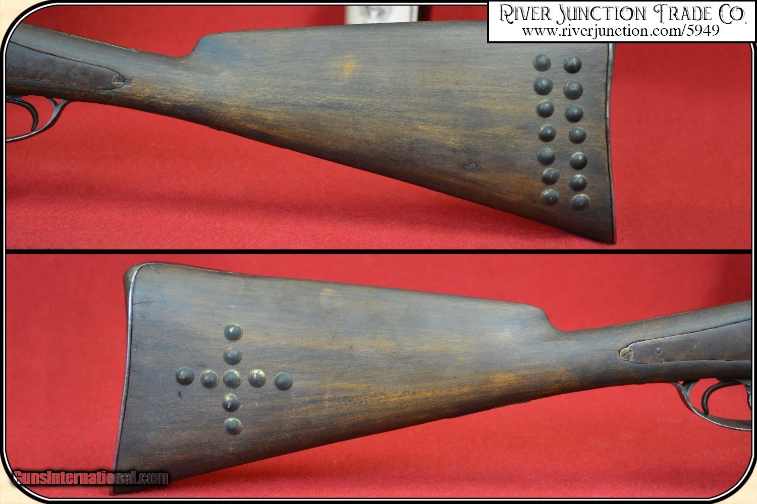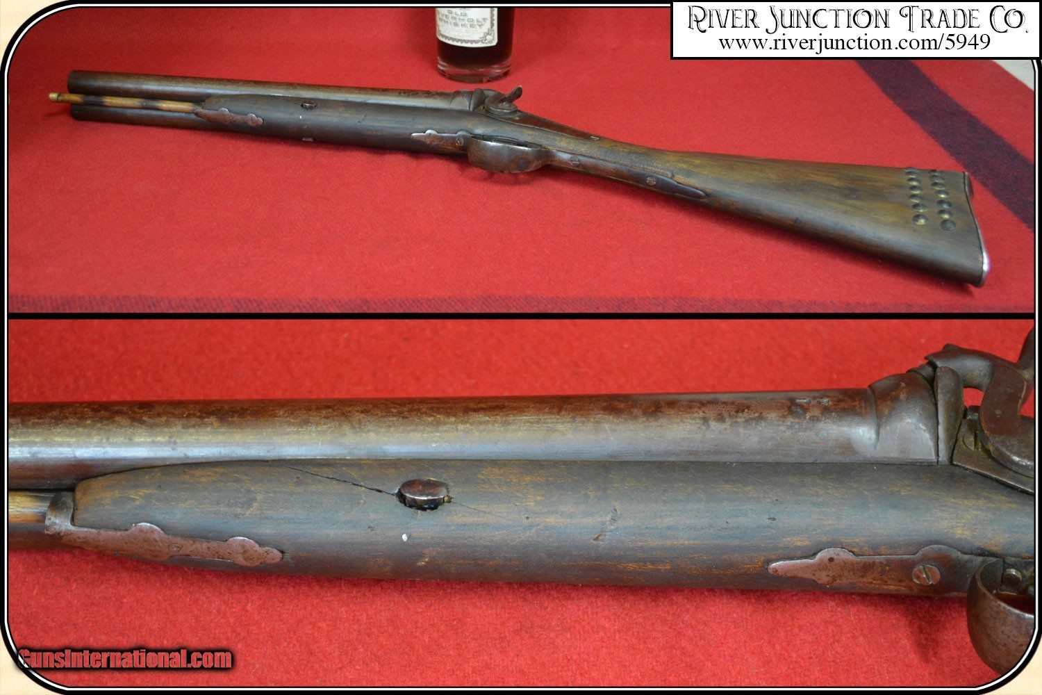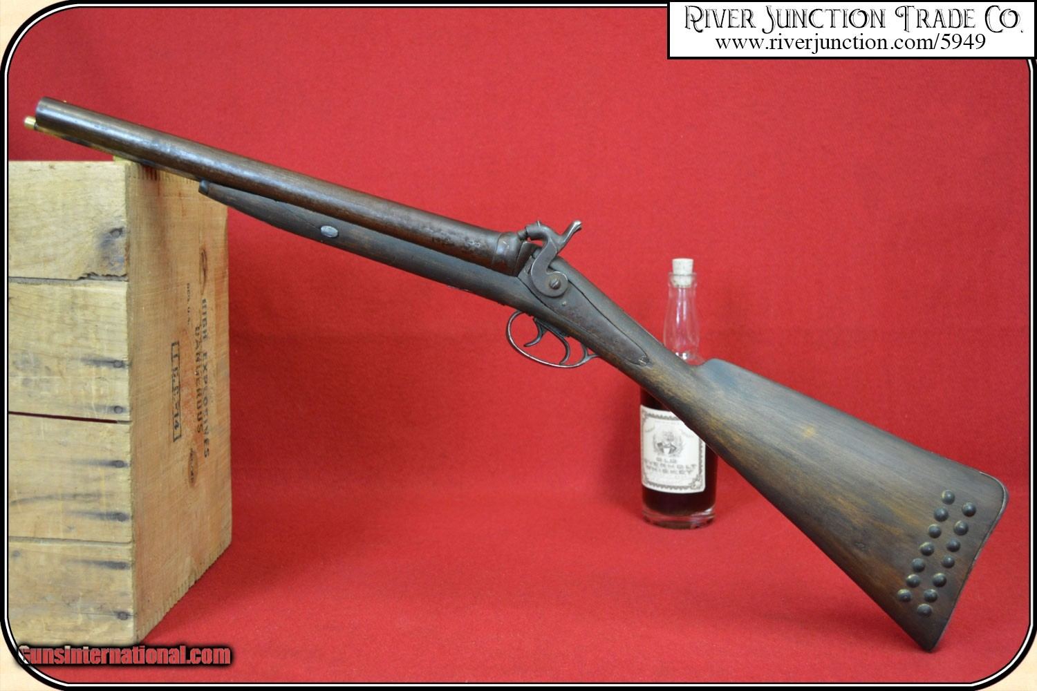 Description: A delightful, Sawed Off Shotgun with 14 inch barrels. (YES IT IS LEGAL ANTIQUE PERCUSSION GUNS DO NOT HAVE A BARREL LENGTH RESTRICTION)It has an overall length of 31 inches. The ramrod is15 inches long. The wood has virtually all its original finish worn off, with a crack on the left side of the forearm, but it seams to be stable no other breaks and a few minor dings and abrasions. The back action locks both left and right, function crisply. The gun has an even, pleasant, brown patina, which is smooth and uncleaned. The locks, hammers, trigger guard, butt plate, tang, etc. are all plain. The gun dates from the late 1850's period. It is not marked in any way, other than 2 proof marks on the left side of the barrel near the breach. This was typical of trade shotguns of the era. It is of good sound solid quality with almost no pitting in the bores. If you ever wanted a sawed off percussion shotgun to compliment your display, this is it. I don't have a clue as to the history of the gun. Could it be Confederate? Sure, or maybe an express agents gun. The tacks on the stock make me think that it might be a Native American canoe gun, It sure is interesting. This is an ANTIQUE and can be shipped directly to you. (adult signature required) Sold as an Antique ~ no guarantees, warranties, or liabilities for any actual usage. If any firearms are to be used for shooting purposes, a qualified gunsmith should inspect them first. We will ship outside the U.S.A. Payment: Item, can be ordered with a credit card or paypal on our sight. Just Google (riverjunction) and type in the River Junction Trade Co. item number (5949) in the search box. Before you checkout you will see shipping cost and total. OR If you prefer: Pay by cash, postal money order, cashiers check, personal & business checks. We wait for checks to clear. Have questions? Call me 563-880-4588. Jim SOLD |