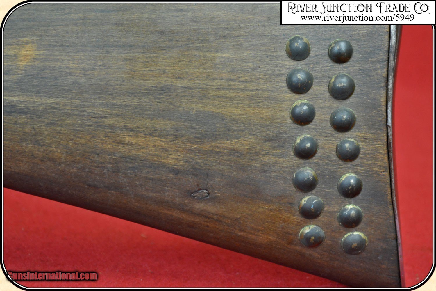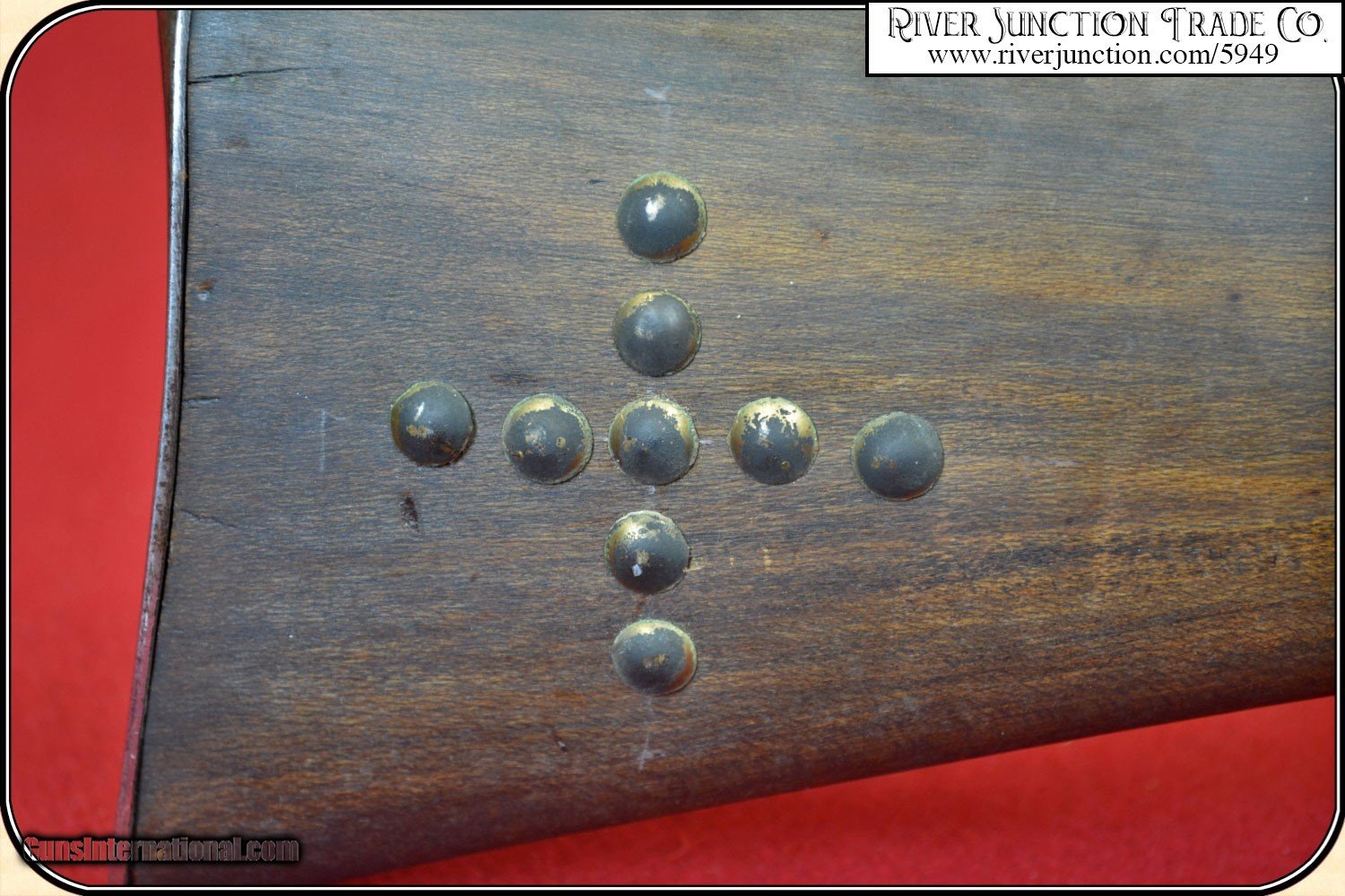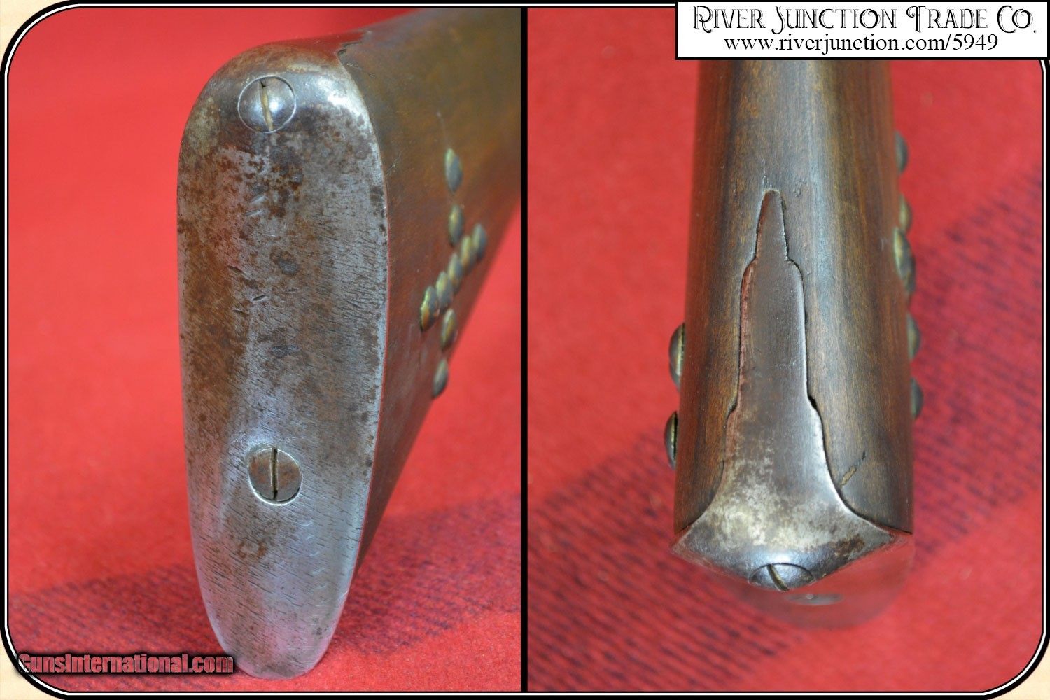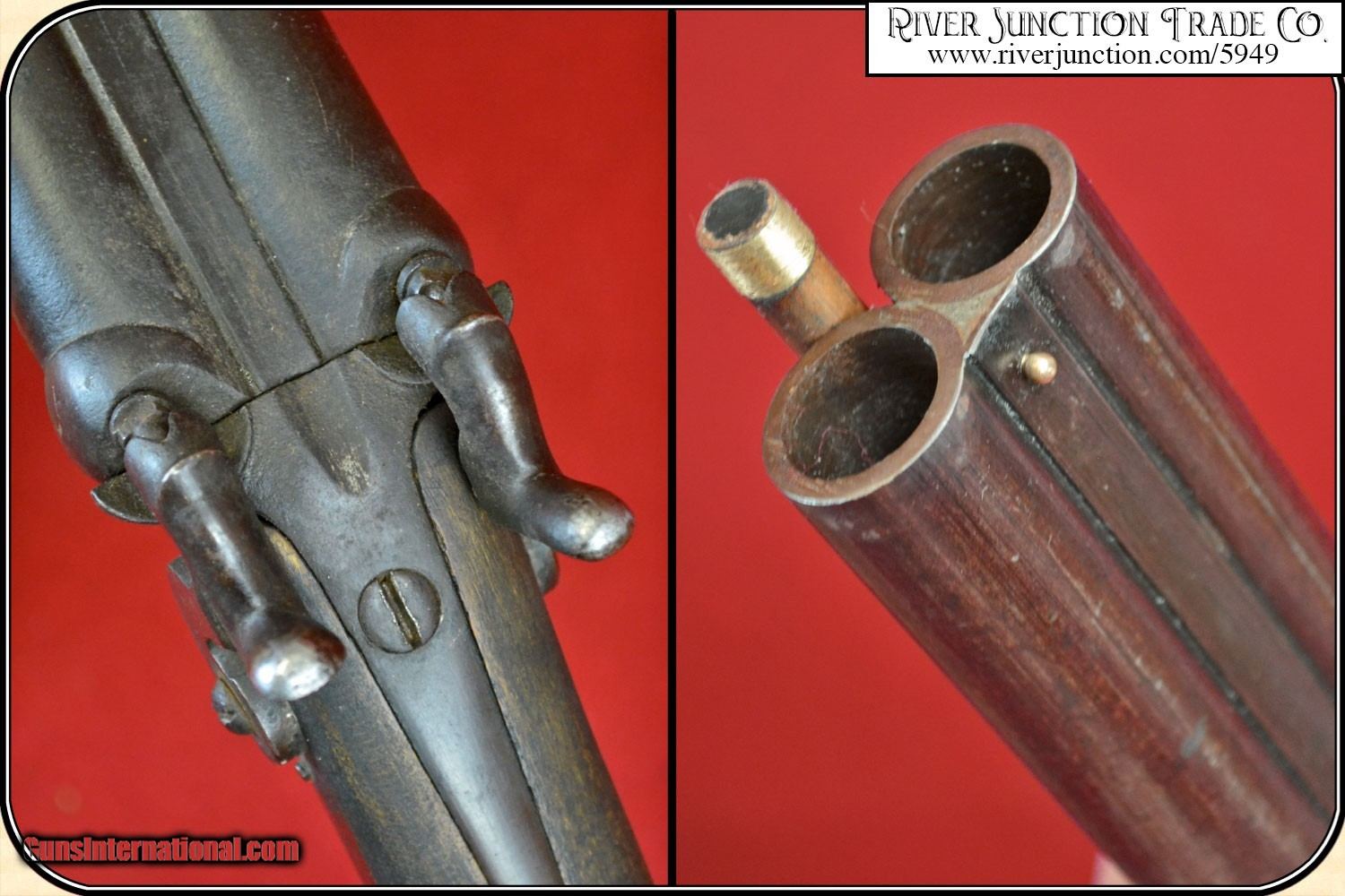Description: A delightful, Sawed Off Shotgun with 14 inch barrels. (YES IT IS LEGAL ANTIQUE PERCUSSION GUNS DO NOT HAVE A BARREL LENGTH RESTRICTION)It has an overall length of 31 inches. The ramrod is15 inches long. The wood has virtually all its original finish worn off, with a crack on the left side of the forearm, but it seams to be stable no other breaks and a few minor dings and abrasions. The back action locks both left and right, function crisply. The gun has an even, pleasant, brown patina, which is smooth and uncleaned. The locks, hammers, trigger guard, butt plate, tang, etc. are all plain. The gun dates from the late 1850's period. It is not marked in any way, other than 2 proof marks on the left side of the barrel near the breach. This was typical of trade shotguns of the era. It is of good sound solid quality with almost no pitting in the bores. If you ever wanted a sawed off percussion shotgun to compliment your display, this is it. I don't have a clue as to the history of the gun. Could it be Confederate? Sure, or maybe an express agents gun. The tacks on the stock make me think that it might be a Native American canoe gun, It sure is interesting. This is an ANTIQUE and can be shipped directly to you. (adult signature required) Sold as an Antique ~ no guarantees, warranties, or liabilities for any actual usage. If any firearms are to be used for shooting purposes, a qualified gunsmith should inspect them first. We will ship outside the U.S.A. Payment: Item, can be ordered with a credit card or paypal on our sight. Just Google (riverjunction) and type in the River Junction Trade Co. item number (5949) in the search box. Before you checkout you will see shipping cost and total. OR If you prefer: Pay by cash, postal money order, cashiers check, personal & business checks. We wait for checks to clear. Have questions? Call me 563-880-4588. Jim SOLD |