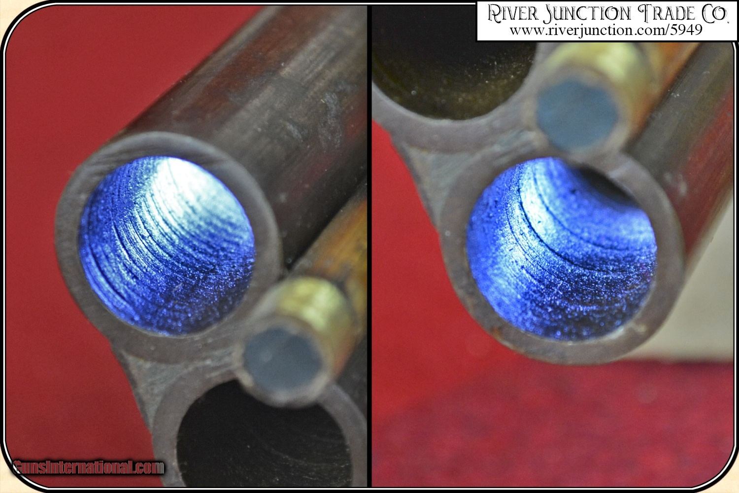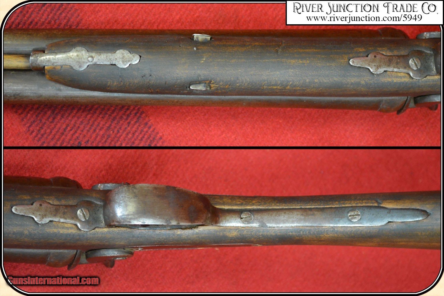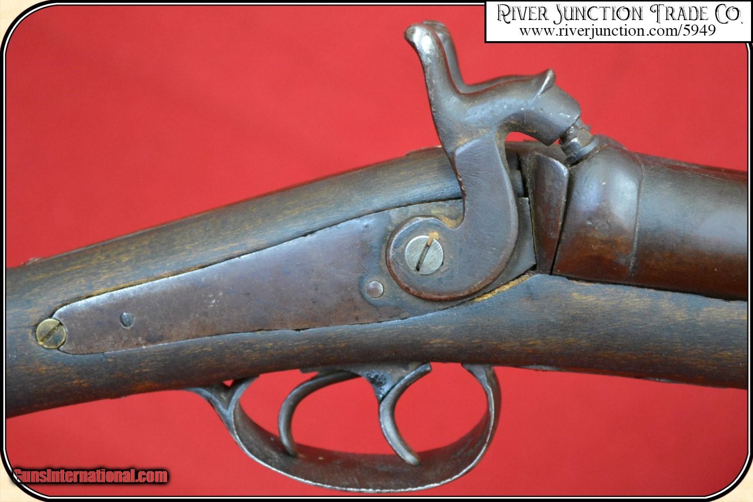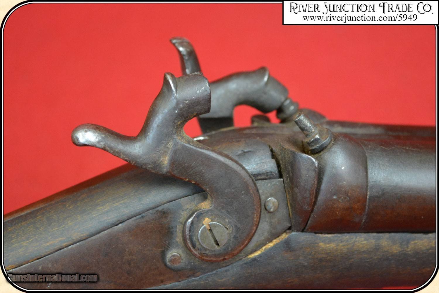 Description: A delightful, Sawed Off Shotgun with 14 inch barrels. (YES IT IS LEGAL ANTIQUE PERCUSSION GUNS DO NOT HAVE A BARREL LENGTH RESTRICTION)It has an overall length of 31 inches. The ramrod is15 inches long. The wood has virtually all its original finish worn off, with a crack on the left side of the forearm, but it seams to be stable no other breaks and a few minor dings and abrasions. The back action locks both left and right, function crisply. The gun has an even, pleasant, brown patina, which is smooth and uncleaned. The locks, hammers, trigger guard, butt plate, tang, etc. are all plain. The gun dates from the late 1850's period. It is not marked in any way, other than 2 proof marks on the left side of the barrel near the breach. This was typical of trade shotguns of the era. It is of good sound solid quality with almost no pitting in the bores. If you ever wanted a sawed off percussion shotgun to compliment your display, this is it. I don't have a clue as to the history of the gun. Could it be Confederate? Sure, or maybe an express agents gun. The tacks on the stock make me think that it might be a Native American canoe gun, It sure is interesting. This is an ANTIQUE and can be shipped directly to you. (adult signature required) Sold as an Antique ~ no guarantees, warranties, or liabilities for any actual usage. If any firearms are to be used for shooting purposes, a qualified gunsmith should inspect them first. We will ship outside the U.S.A. Payment: Item, can be ordered with a credit card or paypal on our sight. Just Google (riverjunction) and type in the River Junction Trade Co. item number (5949) in the search box. Before you checkout you will see shipping cost and total. OR If you prefer: Pay by cash, postal money order, cashiers check, personal & business checks. We wait for checks to clear. Have questions? Call me 563-880-4588. Jim SOLD |