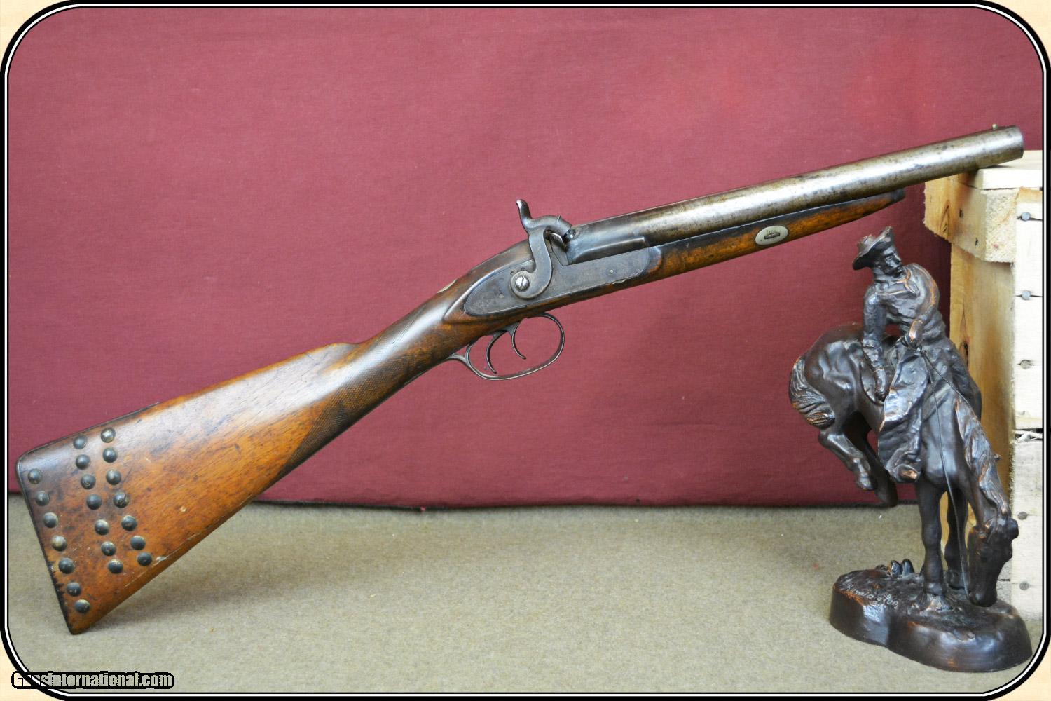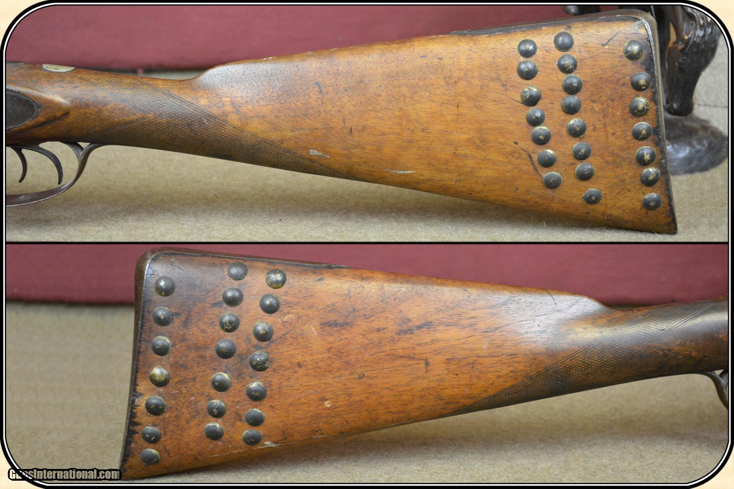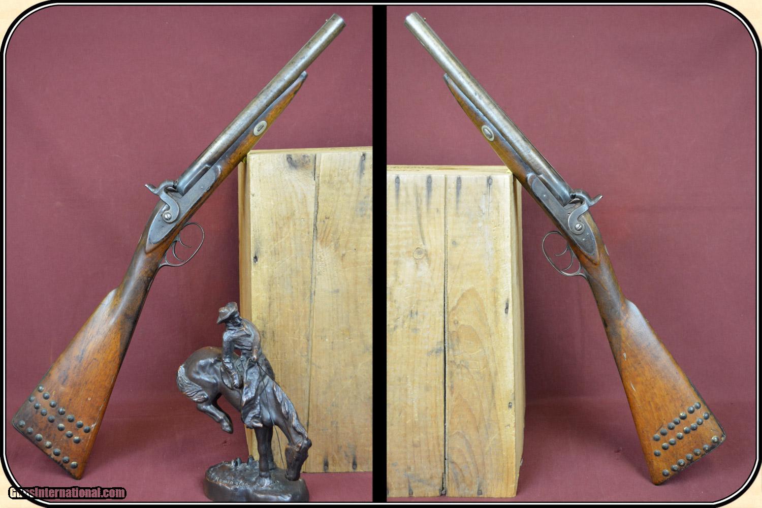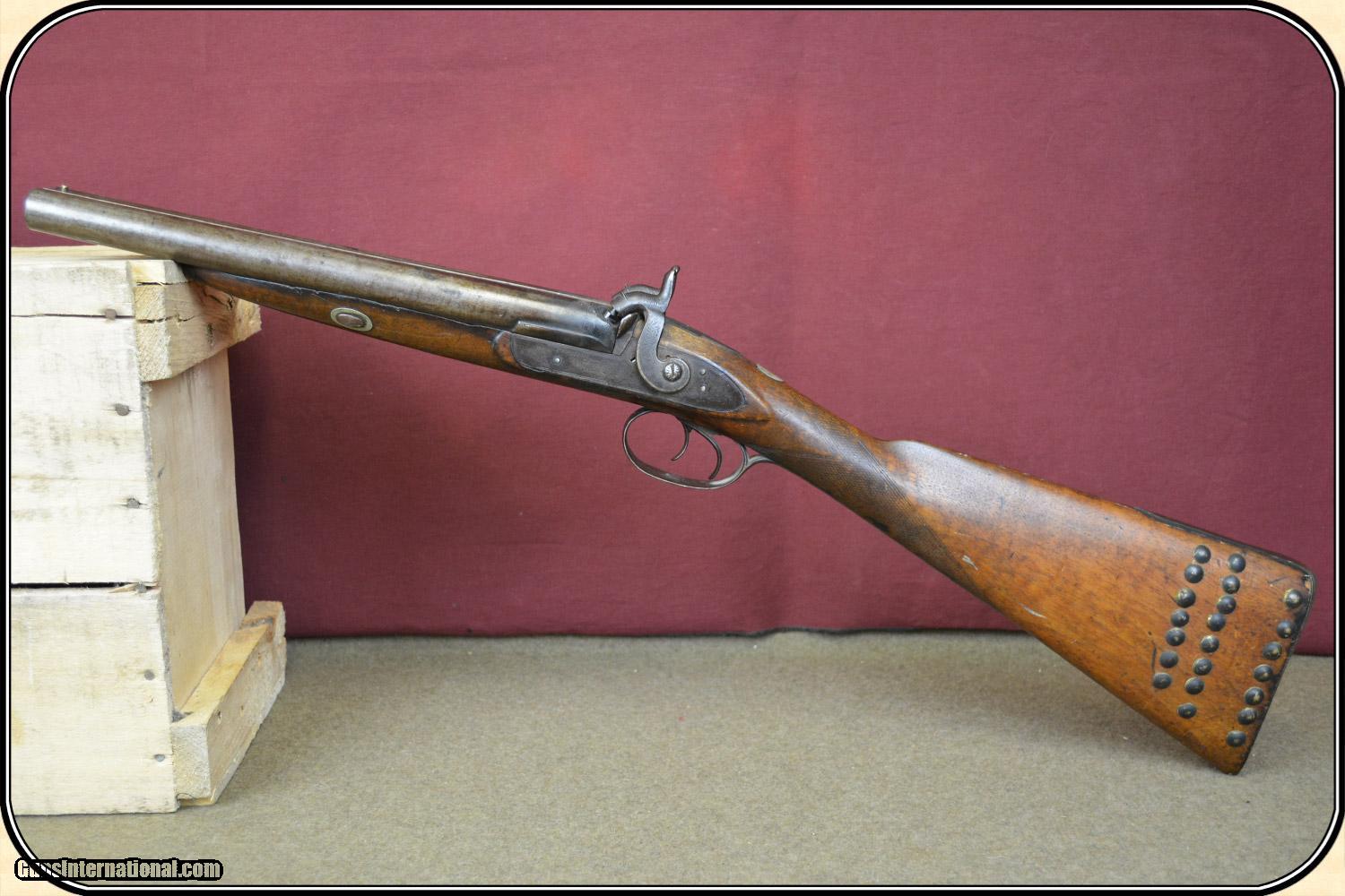 Description: A delightful, Sawed Off Shotgun with 12 inchbarrels. It has an overall length of 29 inches. The ramrod is missing. The wood has virtually all its original finish with no cracks, breaks chips and only minor dings and abrasions. The locks, both left and right, function crisply. The gun has an even, pleasant, brown patina, which is smooth and uncleaned. The locks, hammers, trigger guard, butt plate, tang, etc. have a nice light engraving. The gun dates from the late 1850's to 1860 period. It is marked Perkins on the lock plates and the top of the barrels is marked "Perkin's London Fine Twist". It is of good sound solid quality. If you ever wanted an attractive, sawed off percussion shotgun to compliment your display, this is it. I don't have a clue as to the history of the gun. Could it be Confederate? Sure, or maybe an express agents gun. The tacks on the stock make me think that it might be a canoe gun, It sure is interesting. Payment Cash, postal money order, cashiers check, personal & business checks. Can be ordered with a credit card or paypal at wxx.riverjunction,cxx just type in the number 4465 in the search box. SOLD |