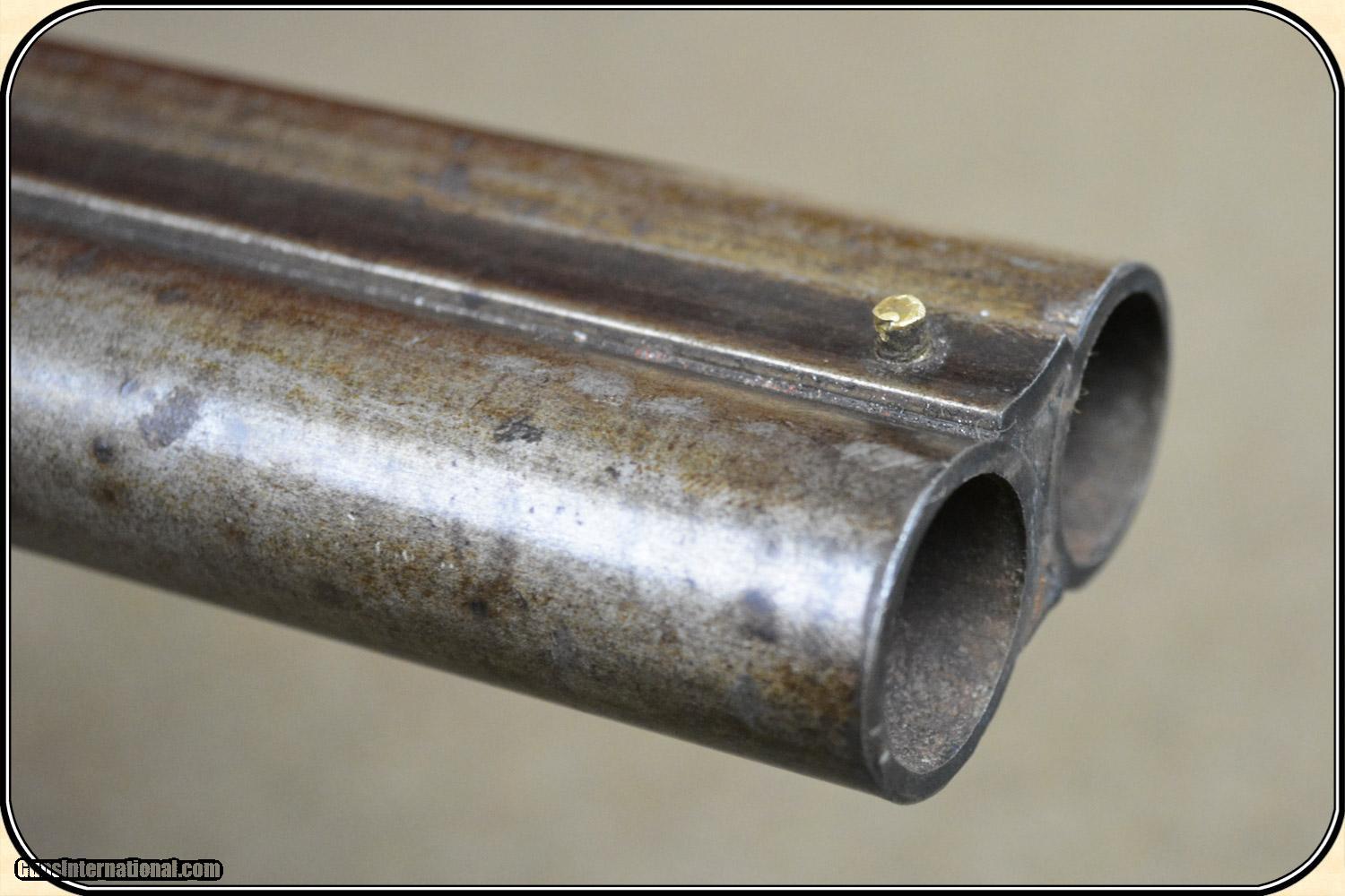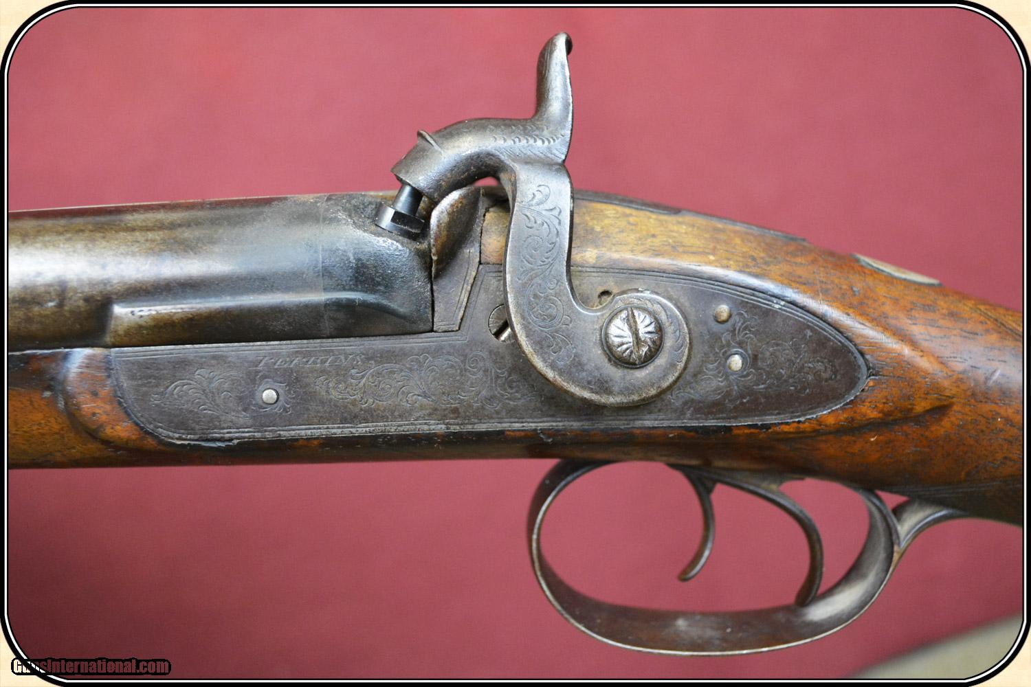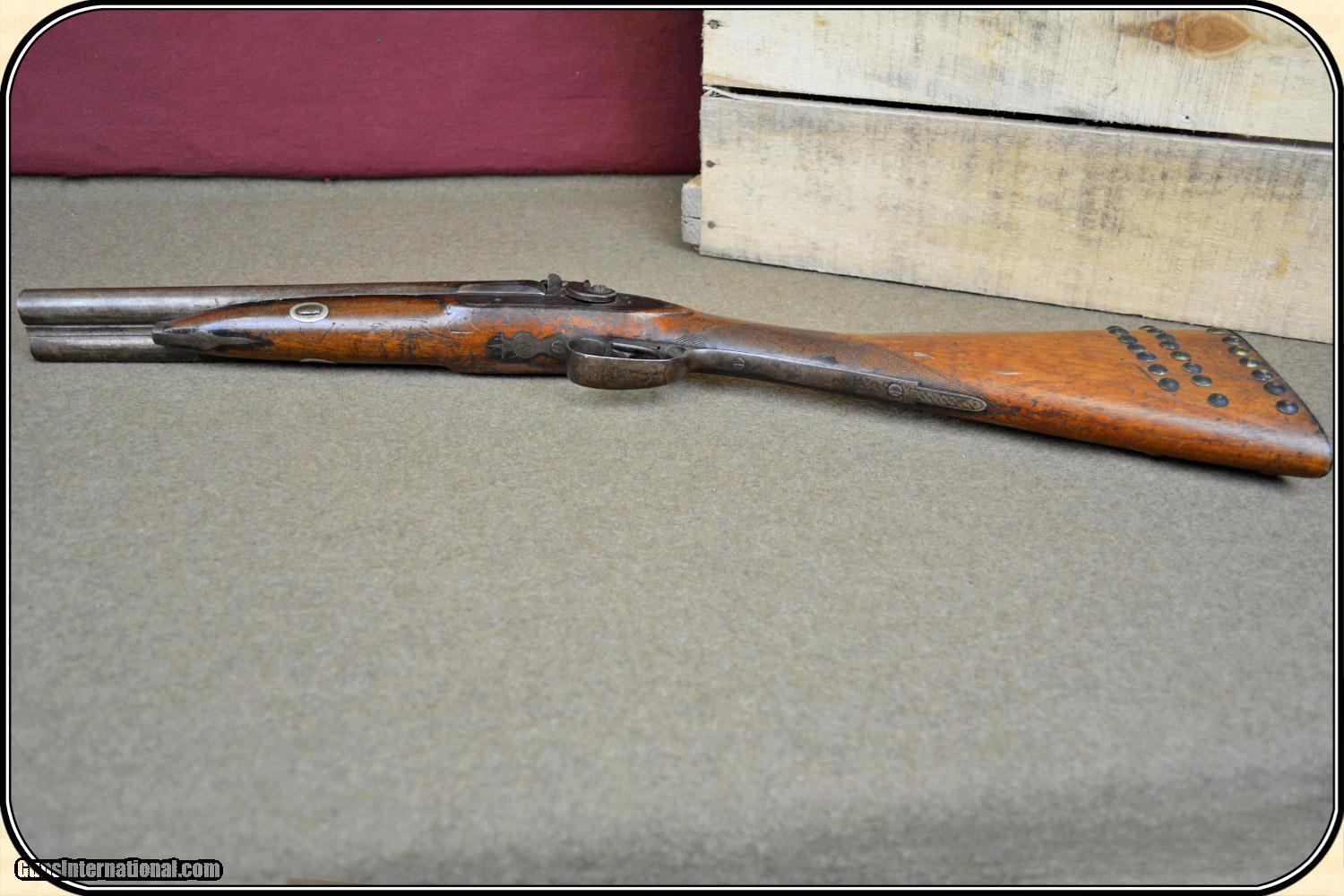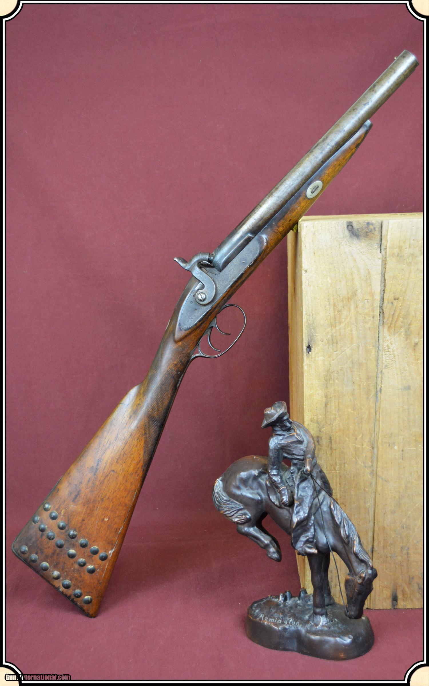 Description: A delightful, Sawed Off Shotgun with 12 inchbarrels. It has an overall length of 29 inches. The ramrod is missing. The wood has virtually all its original finish with no cracks, breaks chips and only minor dings and abrasions. The locks, both left and right, function crisply. The gun has an even, pleasant, brown patina, which is smooth and uncleaned. The locks, hammers, trigger guard, butt plate, tang, etc. have a nice light engraving. The gun dates from the late 1850's to 1860 period. It is marked Perkins on the lock plates and the top of the barrels is marked "Perkin's London Fine Twist". It is of good sound solid quality. If you ever wanted an attractive, sawed off percussion shotgun to compliment your display, this is it. I don't have a clue as to the history of the gun. Could it be Confederate? Sure, or maybe an express agents gun. The tacks on the stock make me think that it might be a canoe gun, It sure is interesting. Payment Cash, postal money order, cashiers check, personal & business checks. Can be ordered with a credit card or paypal at wxx.riverjunction,cxx just type in the number 4465 in the search box. SOLD |