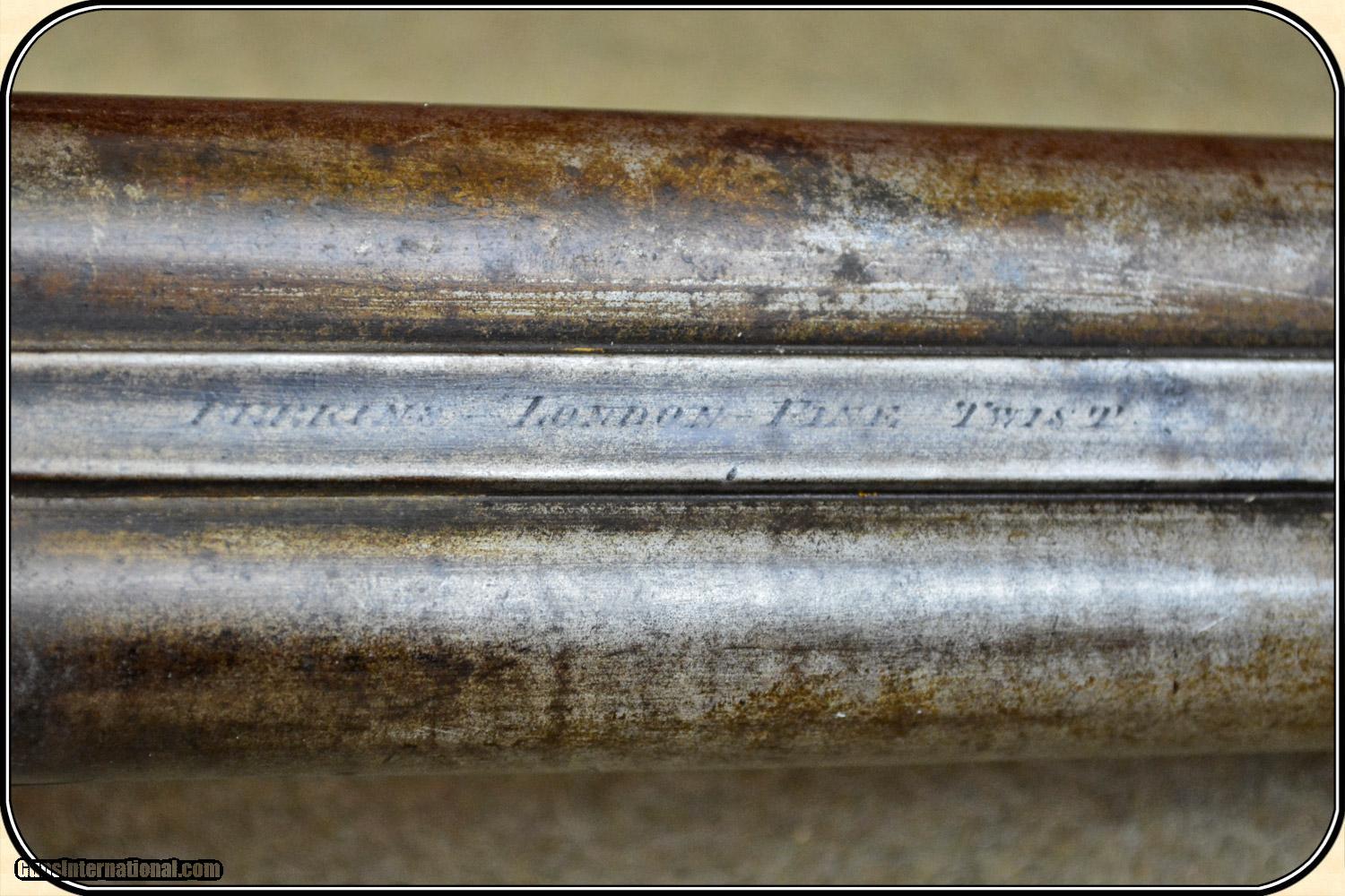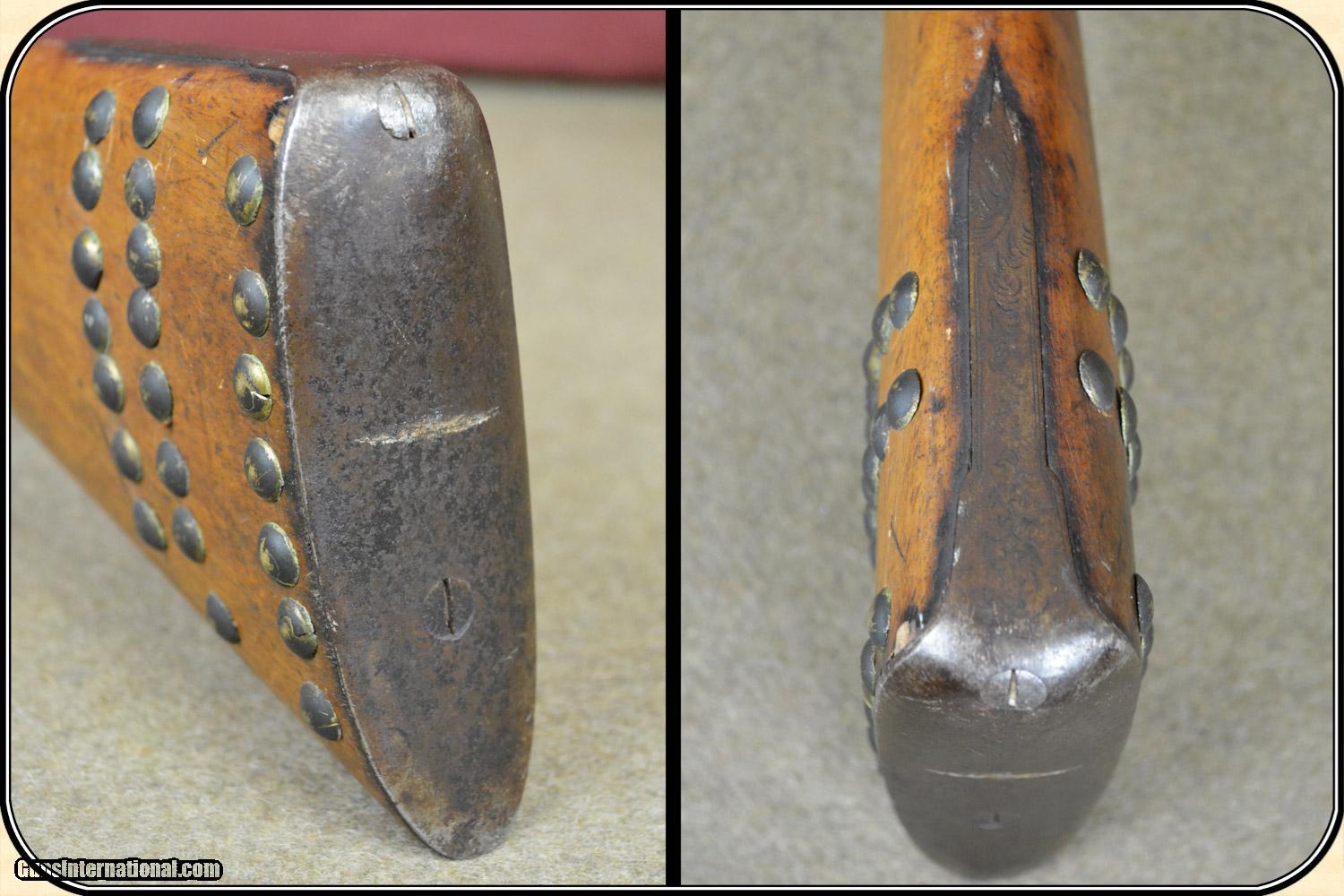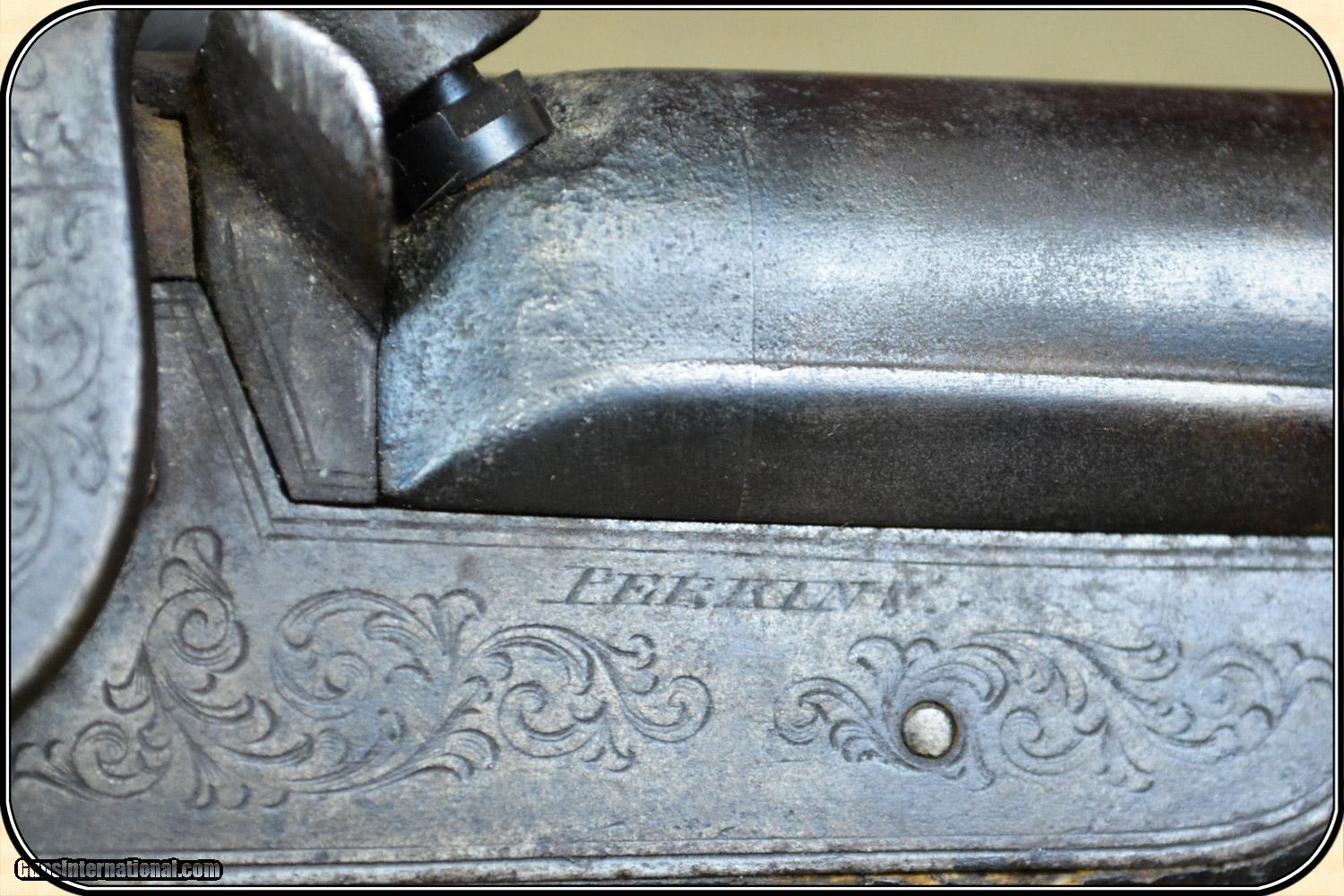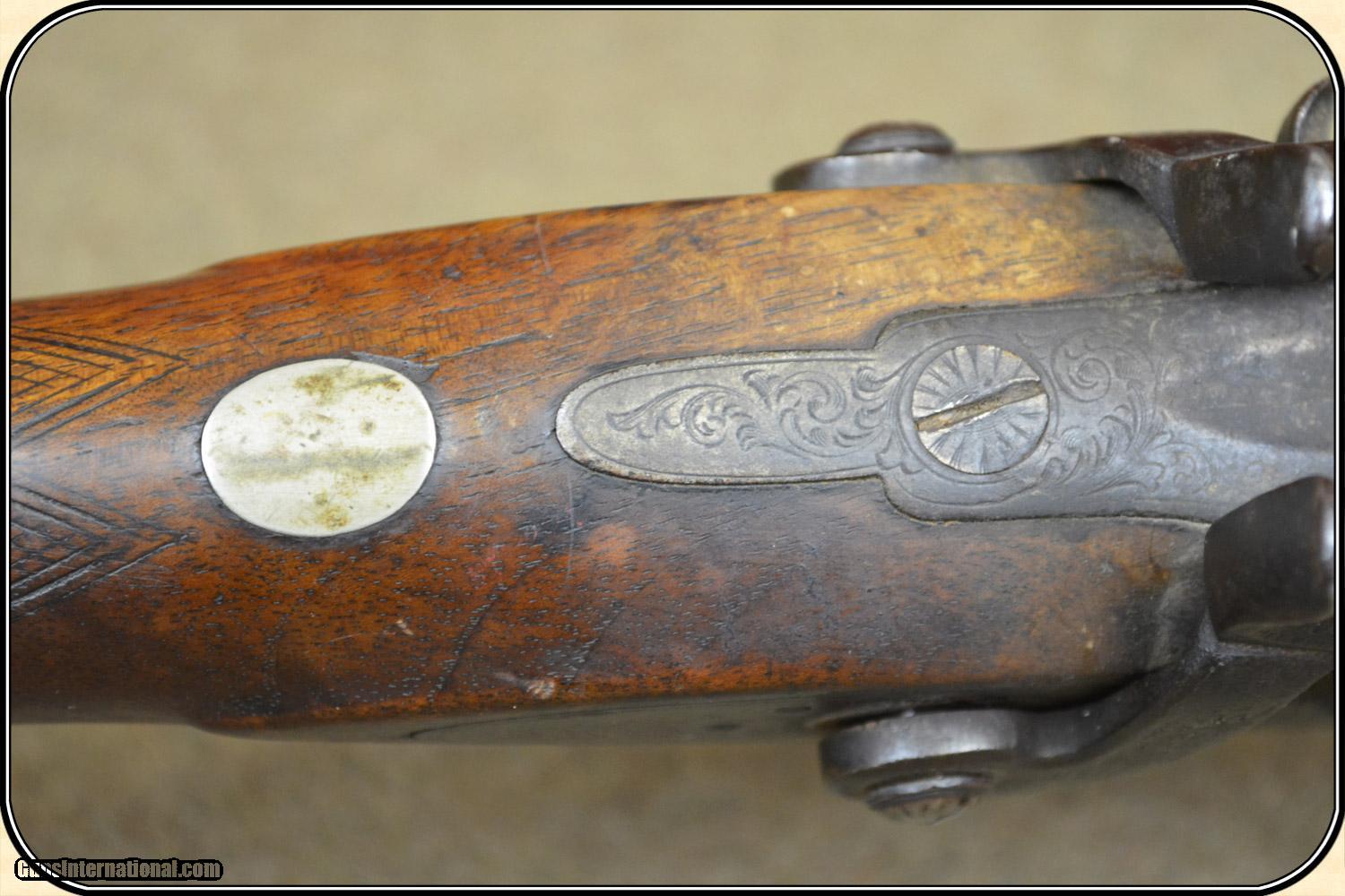 Description: A delightful, Sawed Off Shotgun with 12 inchbarrels. It has an overall length of 29 inches. The ramrod is missing. The wood has virtually all its original finish with no cracks, breaks chips and only minor dings and abrasions. The locks, both left and right, function crisply. The gun has an even, pleasant, brown patina, which is smooth and uncleaned. The locks, hammers, trigger guard, butt plate, tang, etc. have a nice light engraving. The gun dates from the late 1850's to 1860 period. It is marked Perkins on the lock plates and the top of the barrels is marked "Perkin's London Fine Twist". It is of good sound solid quality. If you ever wanted an attractive, sawed off percussion shotgun to compliment your display, this is it. I don't have a clue as to the history of the gun. Could it be Confederate? Sure, or maybe an express agents gun. The tacks on the stock make me think that it might be a canoe gun, It sure is interesting. Payment Cash, postal money order, cashiers check, personal & business checks. Can be ordered with a credit card or paypal at wxx.riverjunction,cxx just type in the number 4465 in the search box. SOLD |