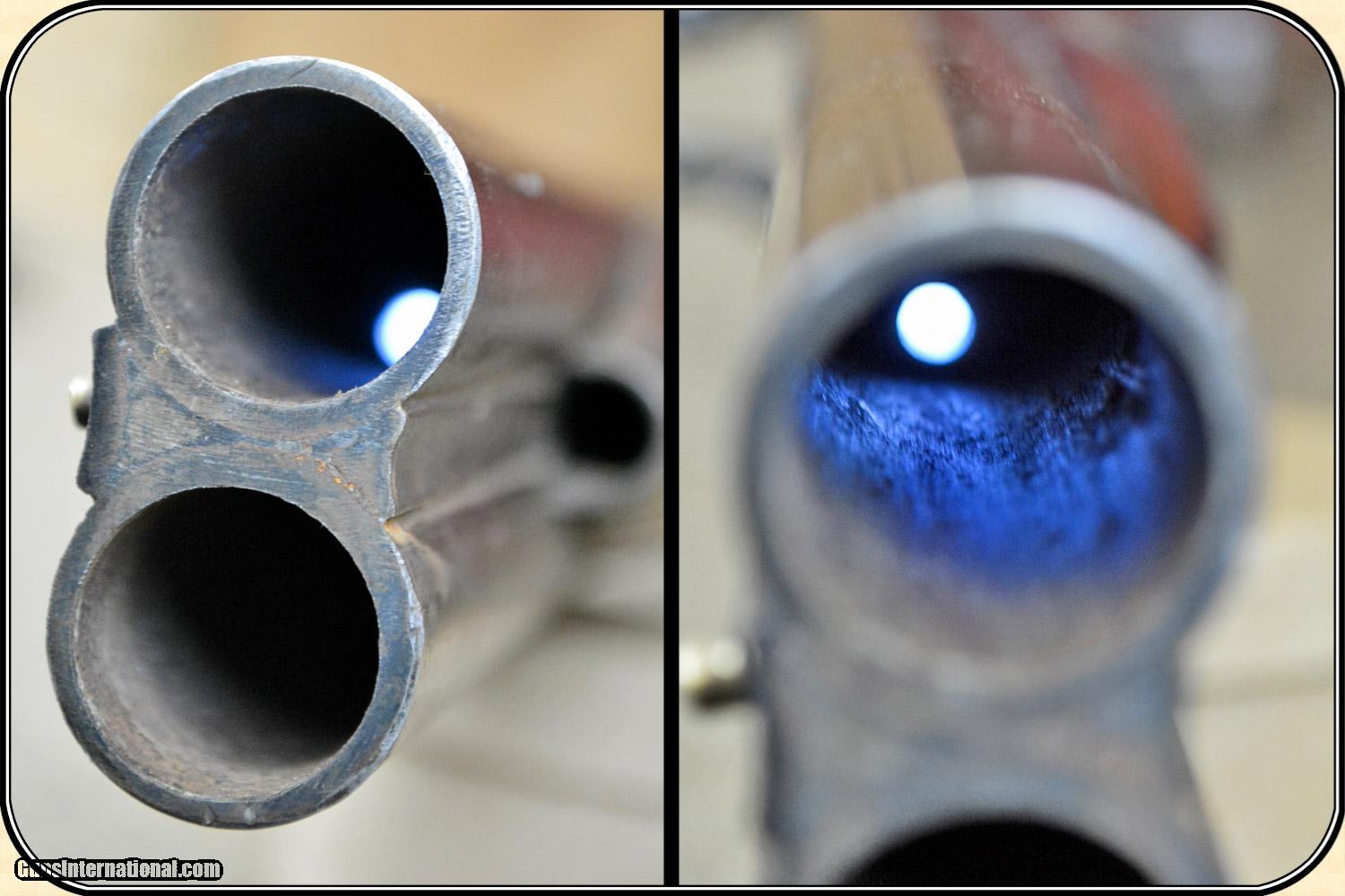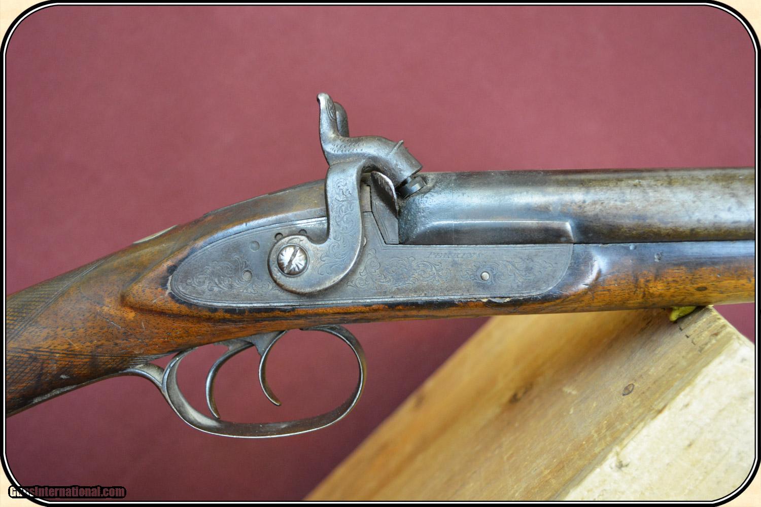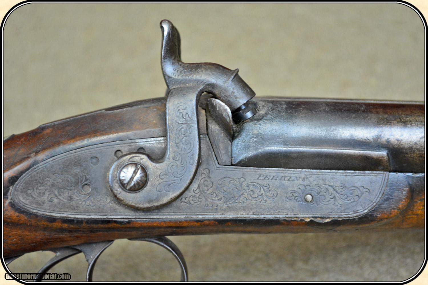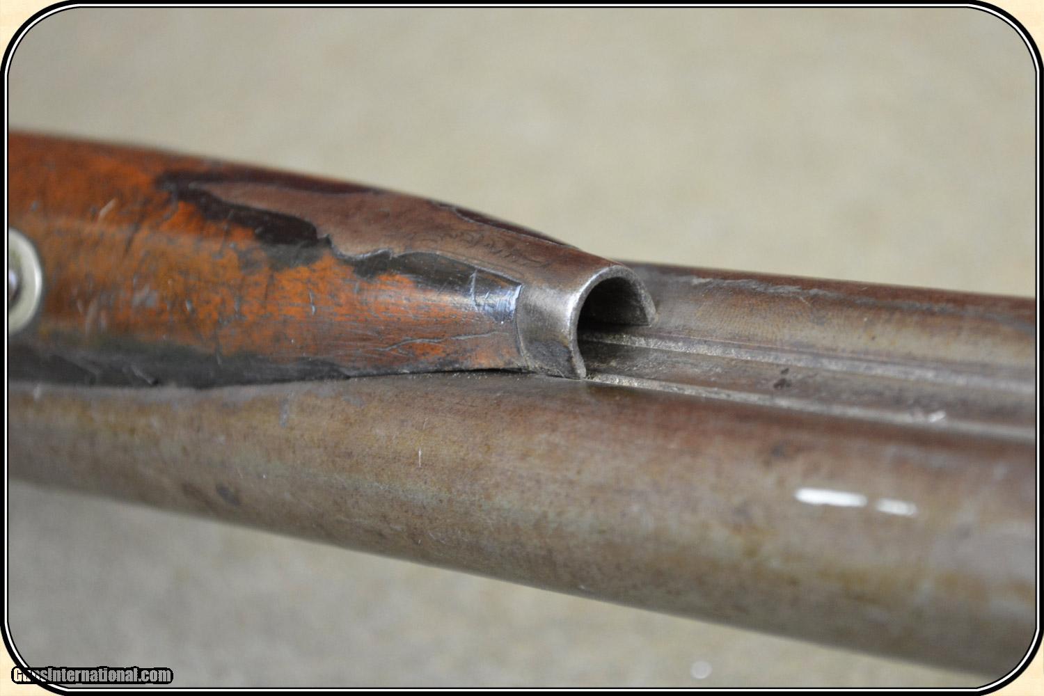 Description: A delightful, Sawed Off Shotgun with 12 inchbarrels. It has an overall length of 29 inches. The ramrod is missing. The wood has virtually all its original finish with no cracks, breaks chips and only minor dings and abrasions. The locks, both left and right, function crisply. The gun has an even, pleasant, brown patina, which is smooth and uncleaned. The locks, hammers, trigger guard, butt plate, tang, etc. have a nice light engraving. The gun dates from the late 1850's to 1860 period. It is marked Perkins on the lock plates and the top of the barrels is marked "Perkin's London Fine Twist". It is of good sound solid quality. If you ever wanted an attractive, sawed off percussion shotgun to compliment your display, this is it. I don't have a clue as to the history of the gun. Could it be Confederate? Sure, or maybe an express agents gun. The tacks on the stock make me think that it might be a canoe gun, It sure is interesting. Payment Cash, postal money order, cashiers check, personal & business checks. Can be ordered with a credit card or paypal at wxx.riverjunction,cxx just type in the number 4465 in the search box. SOLD |