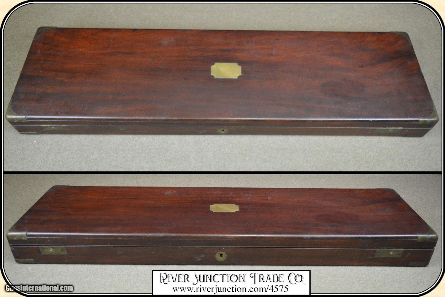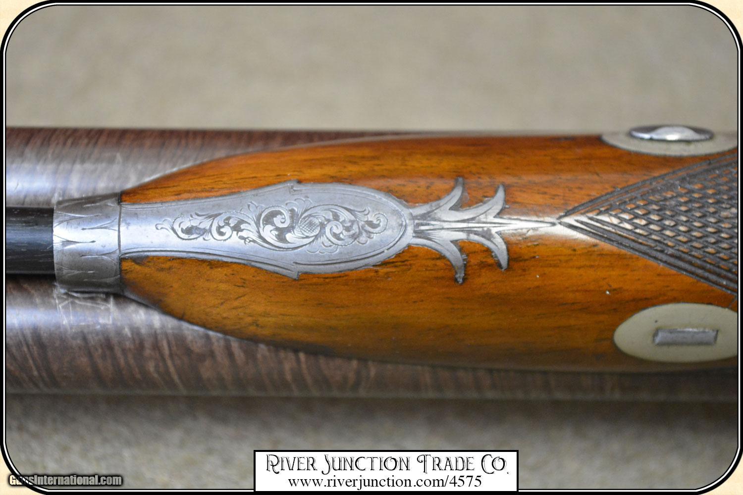 Description: A 14-gauge percussion double gun by William Dooley of Liverpool, England. This Dooley comes in a fitted mahogany case with all manner of accessories: a period cap tin, a nipple wrench, a powder flask and shot pouch made with matching pig skin by "Bartram & Belcher Sheffield ", shot and powder measures, a cleaning rod and gear, an oil bottle, a second shot charger, a card cutter, a ball mold with 7 balls, 2 shot charges and a screwdriver. It made up a complete ensemble. The top rib on the gun is marked: "Dooley, Liverpool,” and the locks are engraved with hunting dogs and “Dooley” on both locks. As with most percussion doubles, the Dooley has a hooked breech and a key, in the fore end allowing for convenient removal of the barrels. The breeches also have platinum blowout plugs on the sides. The ramrod on this gun is quite rare and original to the gun, it is made of straight-grain ebony with a capped brass screw on one end (for pulling wads) and a flared brass loading tip. The percussion locks are beautifully crafted. The high quality can be experienced simply by simply cocking and uncocking the locks. You can feel the mainsprings “stack”—the tension lessening as the hammer is drawn back and increasing as the hammer falls. The bores are as smooth and shinny as the day they left the shop. See the pictures for overall condition. The stock work is excellent, with an attractive and well-laid-out piece of English walnut. The stock is checkered at 16 lines per inch in a flat-topped pattern with grooved borders. The lock inletting is crisp, with just enough wood removed for the locks to function. The stock is well shaped and has a feature from the era that can’t be seen in a profile view: The wrist is as wide as it is tall (1-3/8” x 1-3/8”), giving it a bit more heft and strength than it appears to have. The large buttplate (5-1/2” x 1-7/8”) offers plenty of recoil surface and promotes the angular look of the stock. As to the shootability of the Dooley, the stock dimensions (14-3/8” length of pull, 2-1/8” drop at comb, 2-5/8” drop at the heel, and about 1/4” of cast) and nicely proportioned. The gun is well balanced and feels lively despite it being a tad heavy at just over 7 pounds. This is an ANTIQUE and can be shipped directly to you. (adult signature required) Sold as an Antique ~ no guarantees, warranties, or liabilities for any actual usage. If any firearms are to be used for shooting purposes, a qualified gunsmith should inspect them first. Payment Cash, postal money order, cashiers check, personal & business checks. Can be ordered with a credit card or paypal at wxx.riverjunction,cxx just type in the number 4575 in the search box. SOLD |
