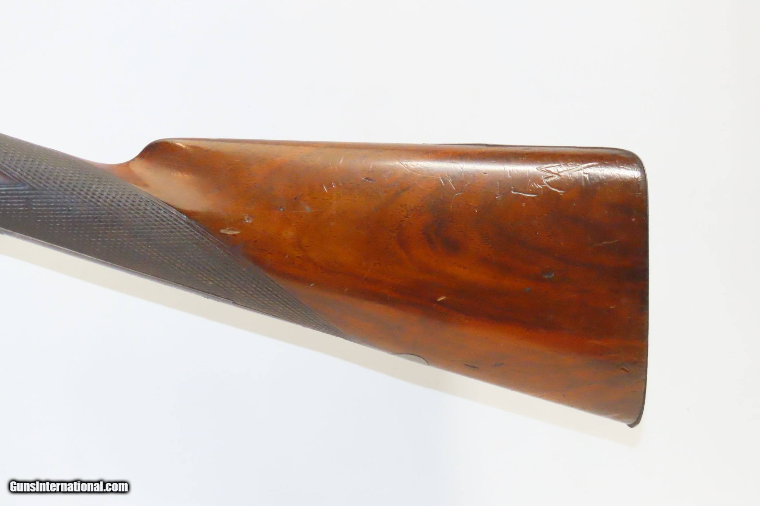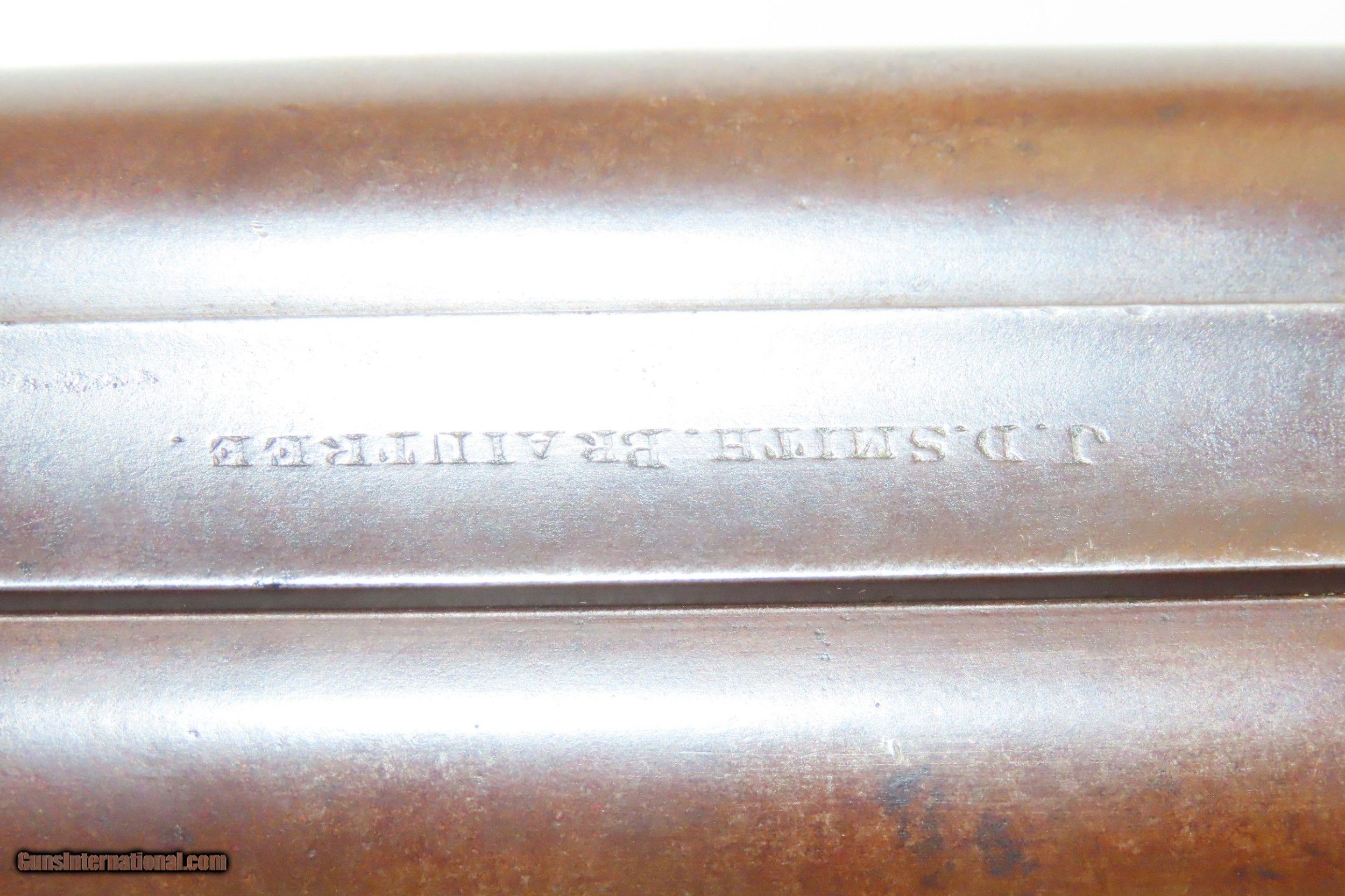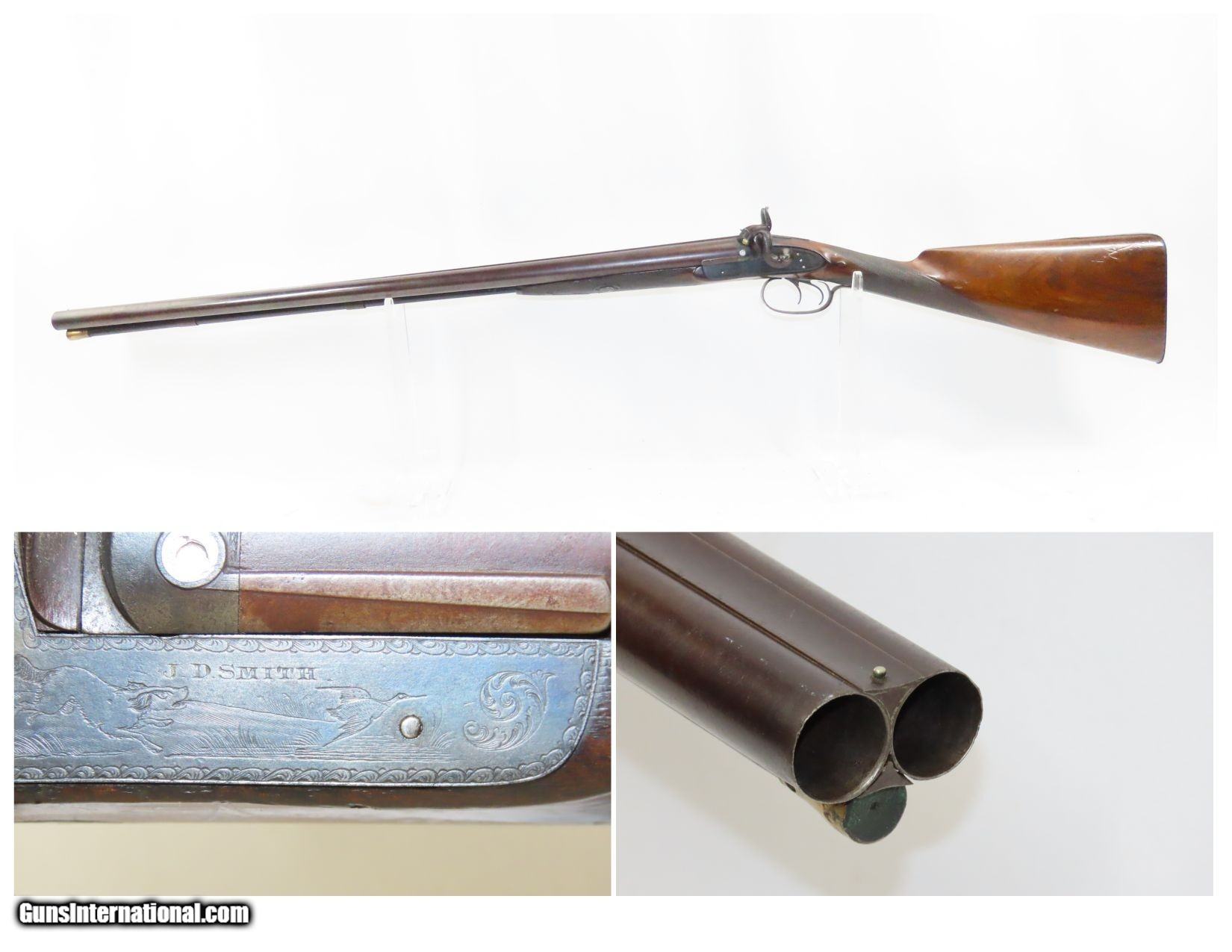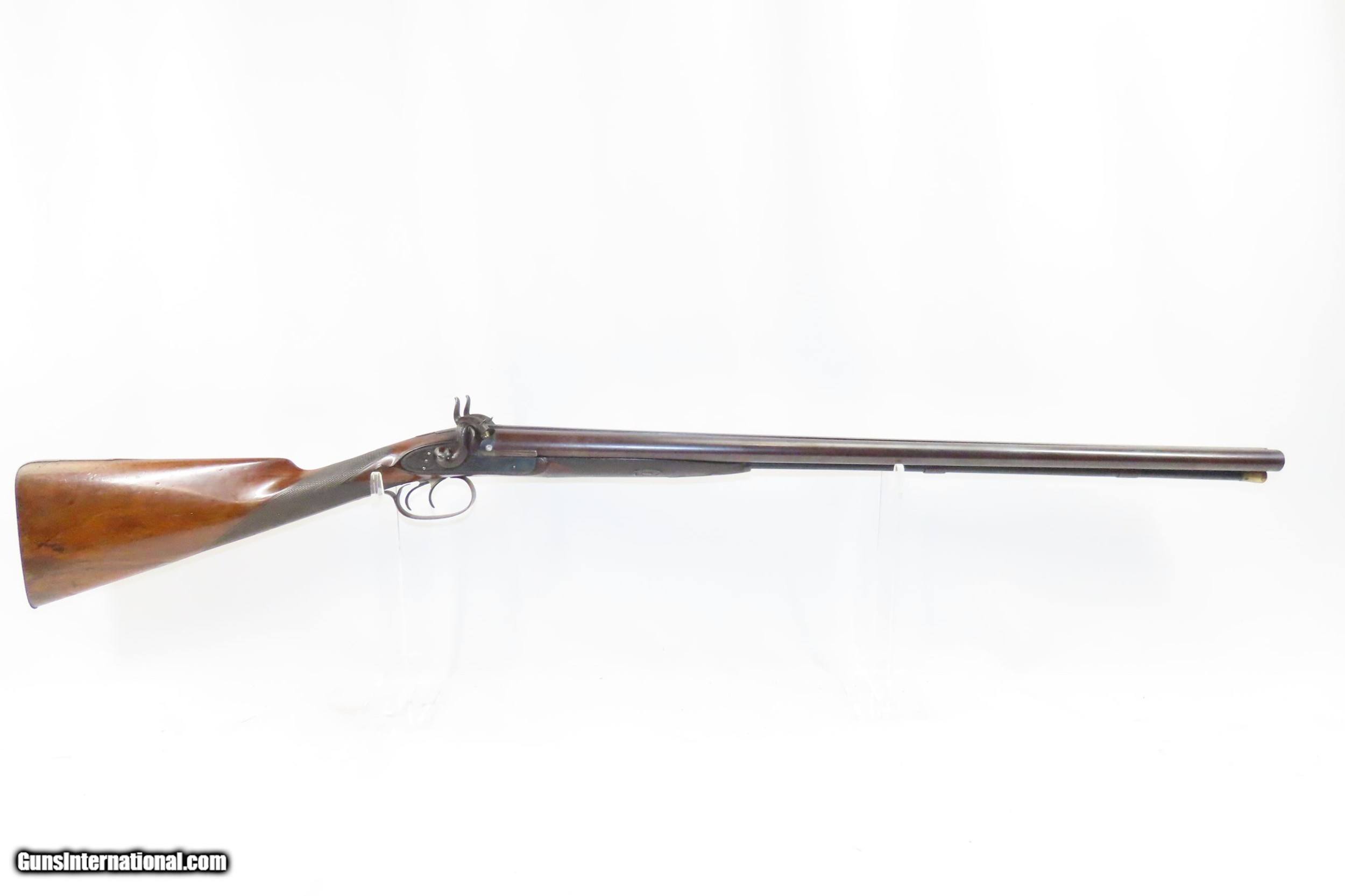 Description: ENGRAVED Antique JD SMITH Percussion Double Barrel 12 Gauge HAMMER Shotgun Engraved SIDE x SIDE Double Barrel Fowling Gun Here we present an antique English J.D. Smith Double Barrel Percussion Side by Side Hammer Shotgun, made sometime in the mid-19th Century in Braintree, England. Braintree is a town in Essex, England located 10 miles northeast of Chelmsford and 15 miles west of Colchester. It features a half-length stock and it is really quite light and handy compared to many of its American contemporaries. This would likely have been exported from England to a country like the United States with a thriving market for all sorts of firearms. As people moved West and settled in remote areas, hunting was especially important to put food on the table and for protecting the homestead. This would have been a good gun for fowl hunting. The rib is marked “J.D. SMITH. BRAINTREE.” and has game scenes on both sides of the lock. The overall condition is nearing fine. Robust action (modern nipples). The bore is clear and remains in good shape for its age. The stock is solid with a nice smooth finish and checkering. Sharp engravings. The left barrel has a few small dents. Own the original! This is a legitimate antique and not a reproduction. Barrels: 28-1/2 inches. Caliber: 12 Gauge Percussion Length of Pull: 14-5/16 inches Overall condition as seen in photos. Very Fast. Very Safe. FREE SHIPPING WORLDWIDE. Delivered directly to your door by express mail! Guaranteed AUTHENTIC & Includes CERTIFICATE OF AUTHENTICITY. ancestryguns $1825 #217481 SOLD Antique: Yes |