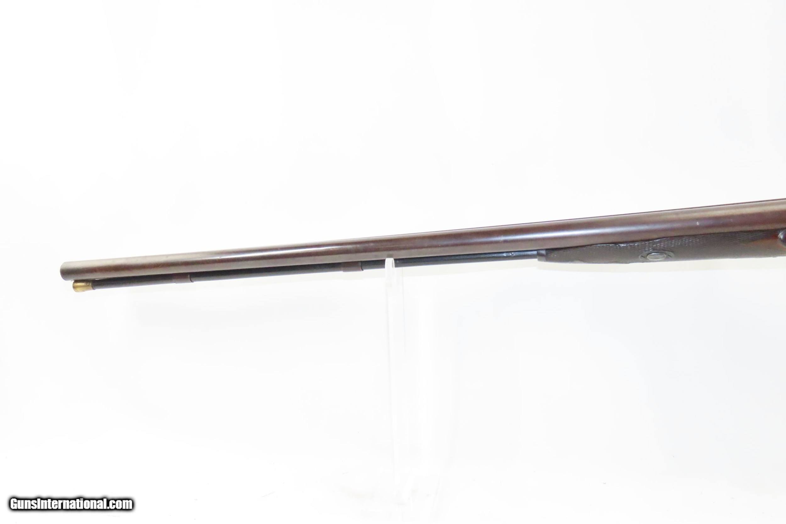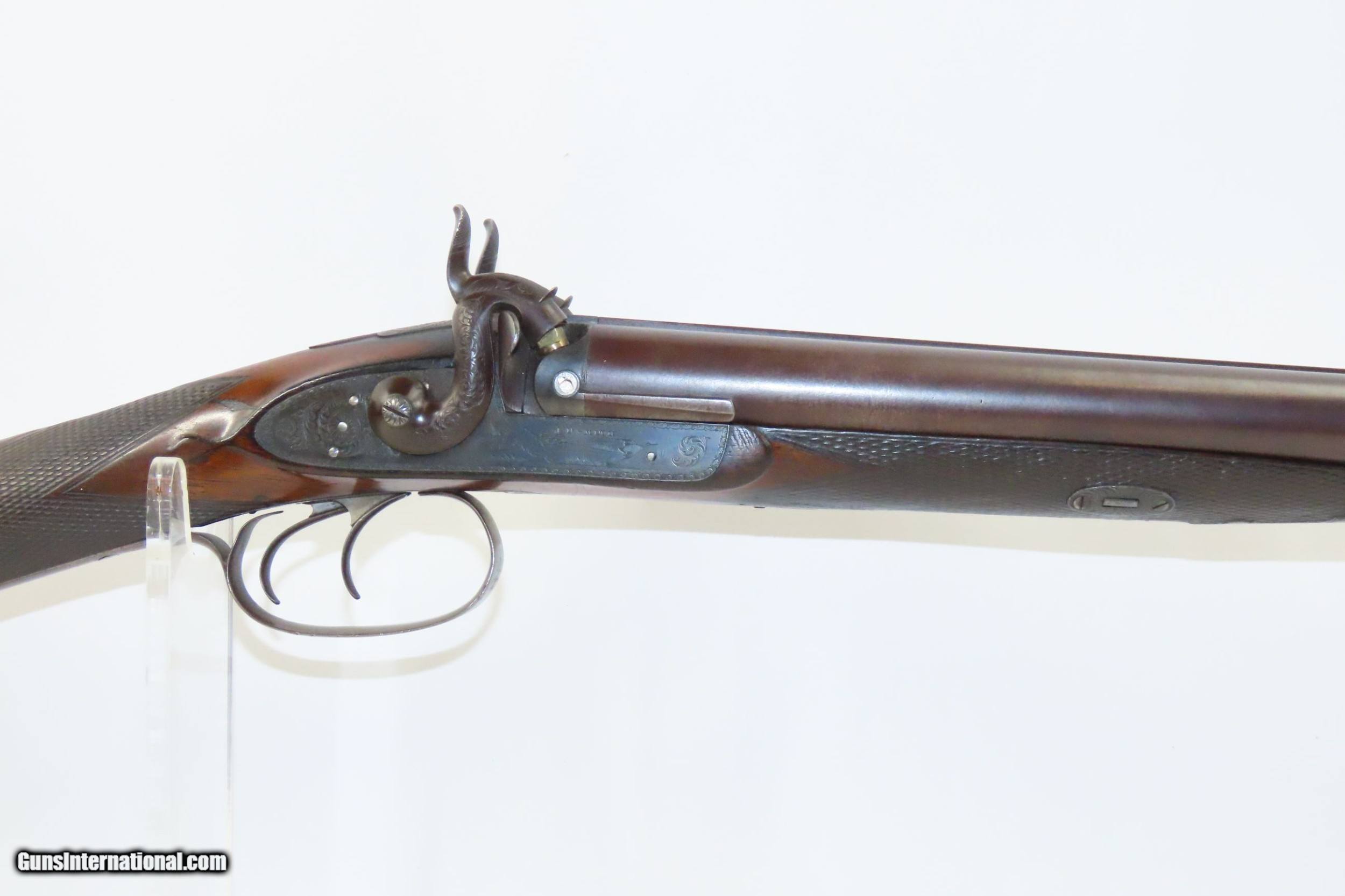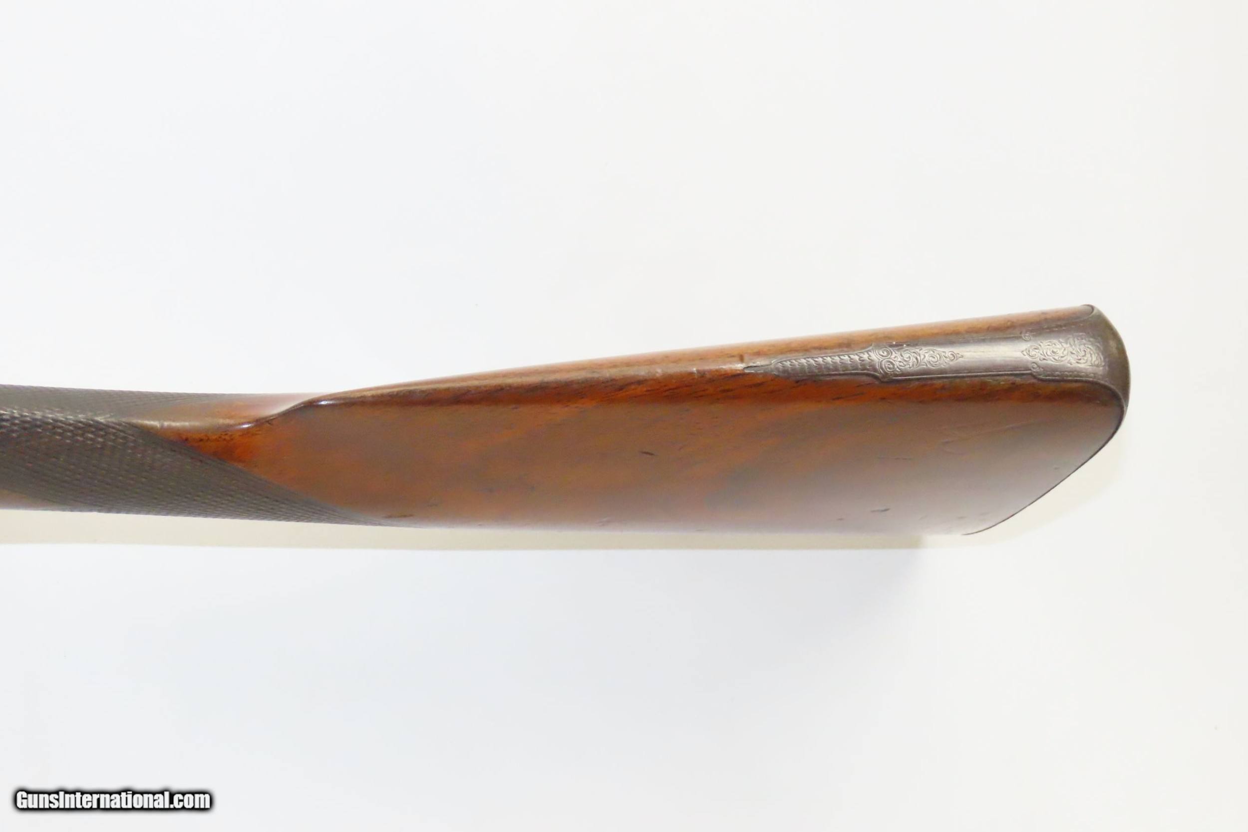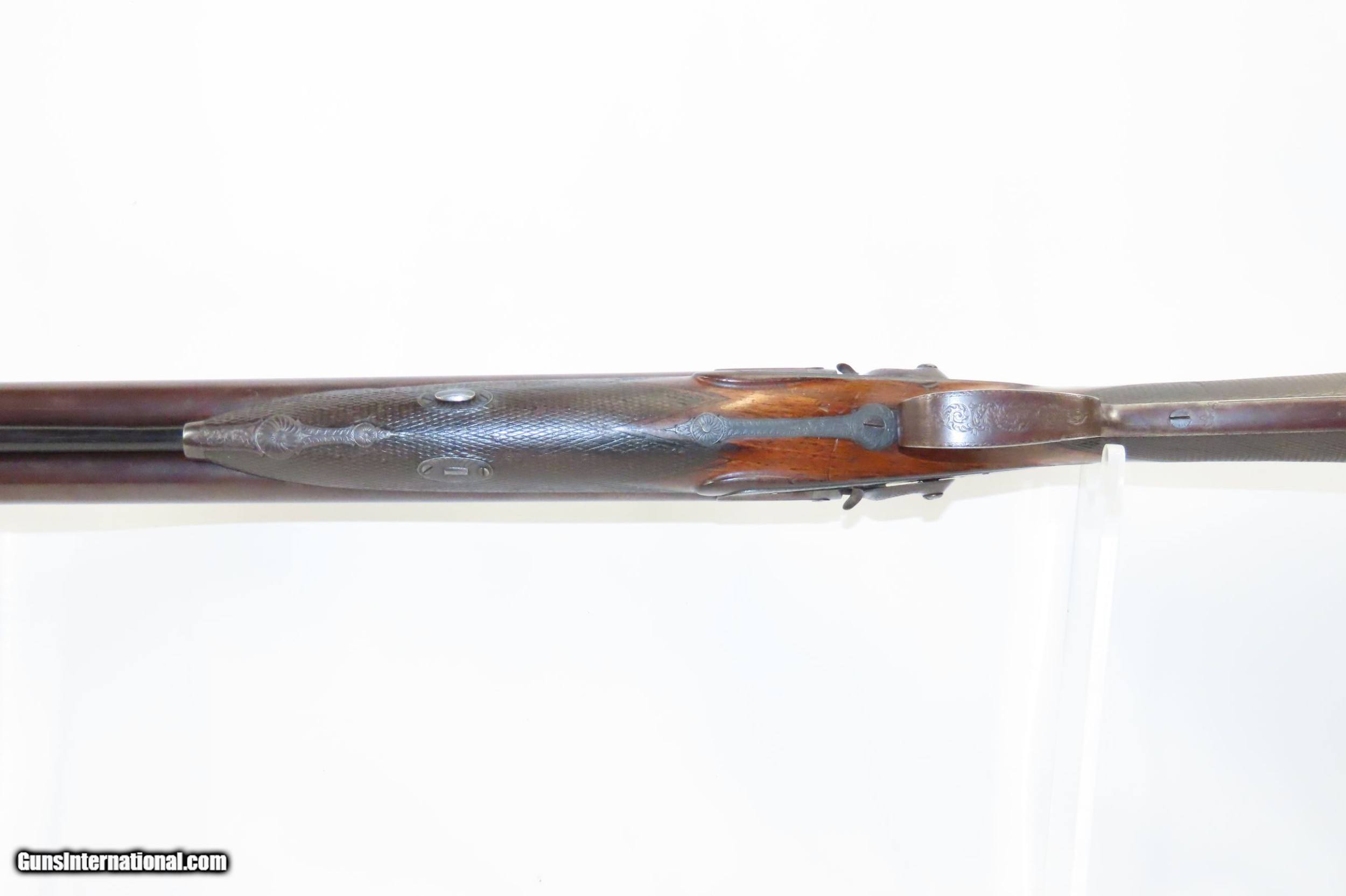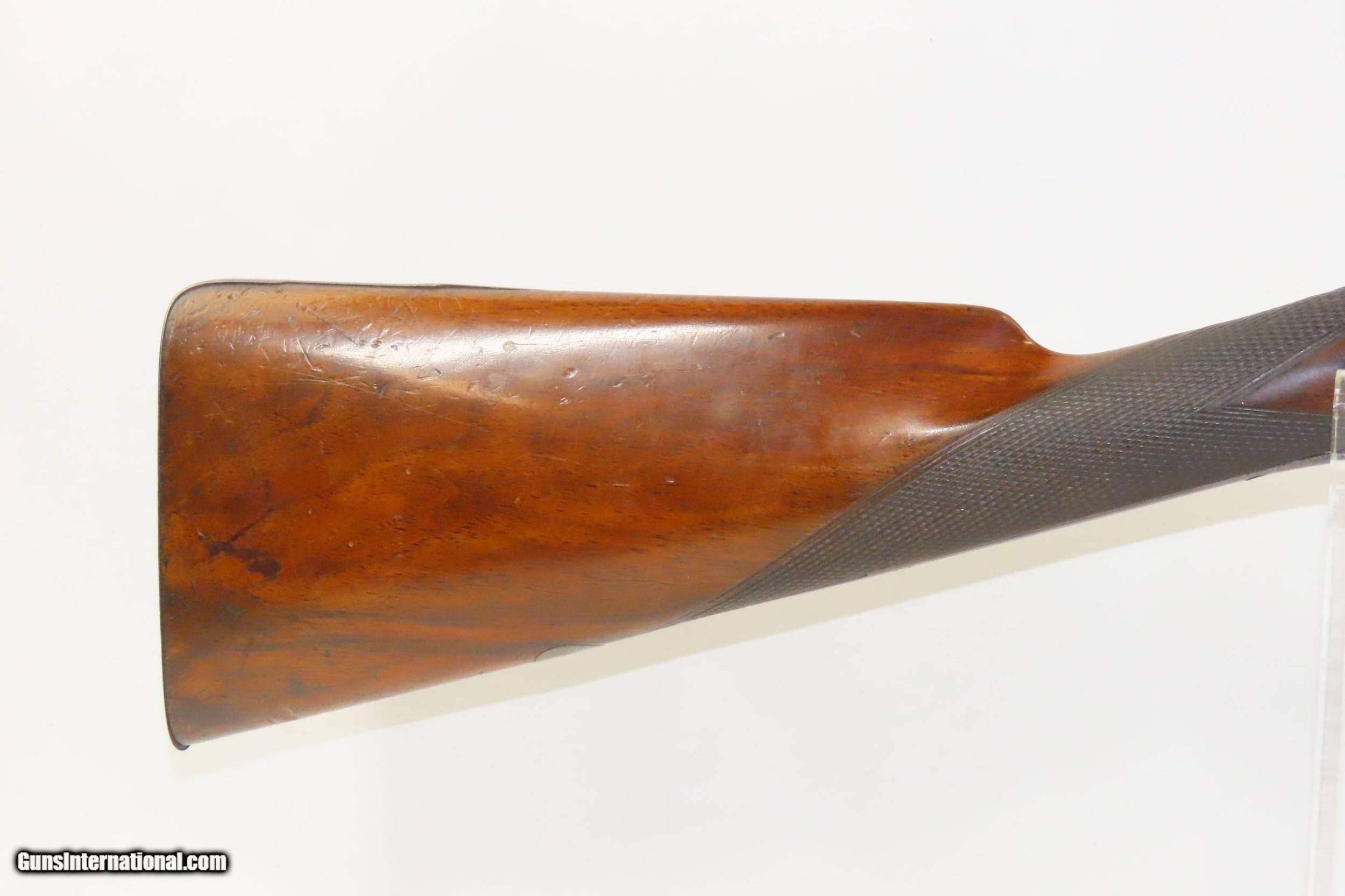 Description: ENGRAVED Antique JD SMITH Percussion Double Barrel 12 Gauge HAMMER Shotgun Engraved SIDE x SIDE Double Barrel Fowling Gun Here we present an antique English J.D. Smith Double Barrel Percussion Side by Side Hammer Shotgun, made sometime in the mid-19th Century in Braintree, England. Braintree is a town in Essex, England located 10 miles northeast of Chelmsford and 15 miles west of Colchester. It features a half-length stock and it is really quite light and handy compared to many of its American contemporaries. This would likely have been exported from England to a country like the United States with a thriving market for all sorts of firearms. As people moved West and settled in remote areas, hunting was especially important to put food on the table and for protecting the homestead. This would have been a good gun for fowl hunting. The rib is marked “J.D. SMITH. BRAINTREE.” and has game scenes on both sides of the lock. The overall condition is nearing fine. Robust action (modern nipples). The bore is clear and remains in good shape for its age. The stock is solid with a nice smooth finish and checkering. Sharp engravings. The left barrel has a few small dents. Own the original! This is a legitimate antique and not a reproduction. Barrels: 28-1/2 inches. Caliber: 12 Gauge Percussion Length of Pull: 14-5/16 inches Overall condition as seen in photos. Very Fast. Very Safe. FREE SHIPPING WORLDWIDE. Delivered directly to your door by express mail! Guaranteed AUTHENTIC & Includes CERTIFICATE OF AUTHENTICITY. ancestryguns $1825 #217481 SOLD Antique: Yes |