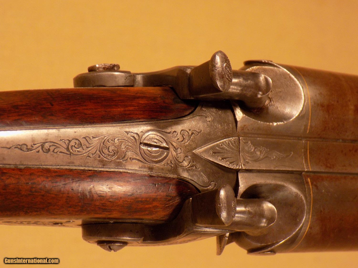 Description: #618A ENGRAVED PERCUSSION SIDE X SIDE 10 GA. SHOTGUN, 32” bbls., inlayed in gold “Super Fine Twist” on the rib, front action locks are engraved with vine type engraving, trigger guard, buttplate, locks, forend tip are all engraved with the same pattern, brown twist pattern on the bbls. is in VG condition, not much for wear, 2 ramrod swivels, one is a replacement, brass tipped wooden ramrod, silver plate in bottom of stock, VG checkered wood, forearm checkering is worn, very nice percussion dbl. shotgun, left hammer screw has been replaced. SOLD Antique: Yes |