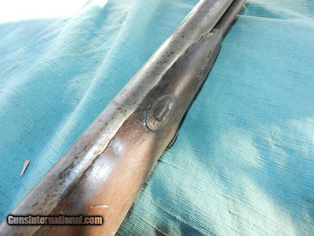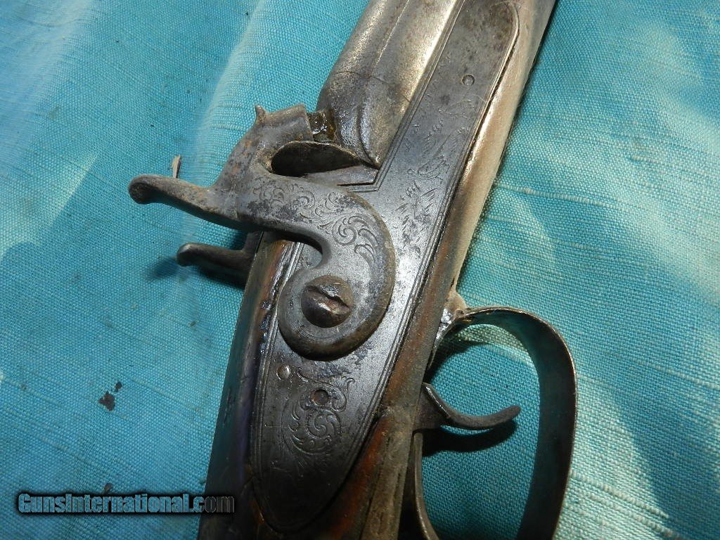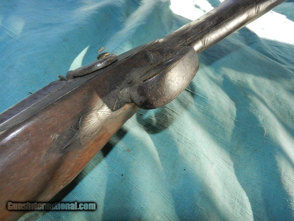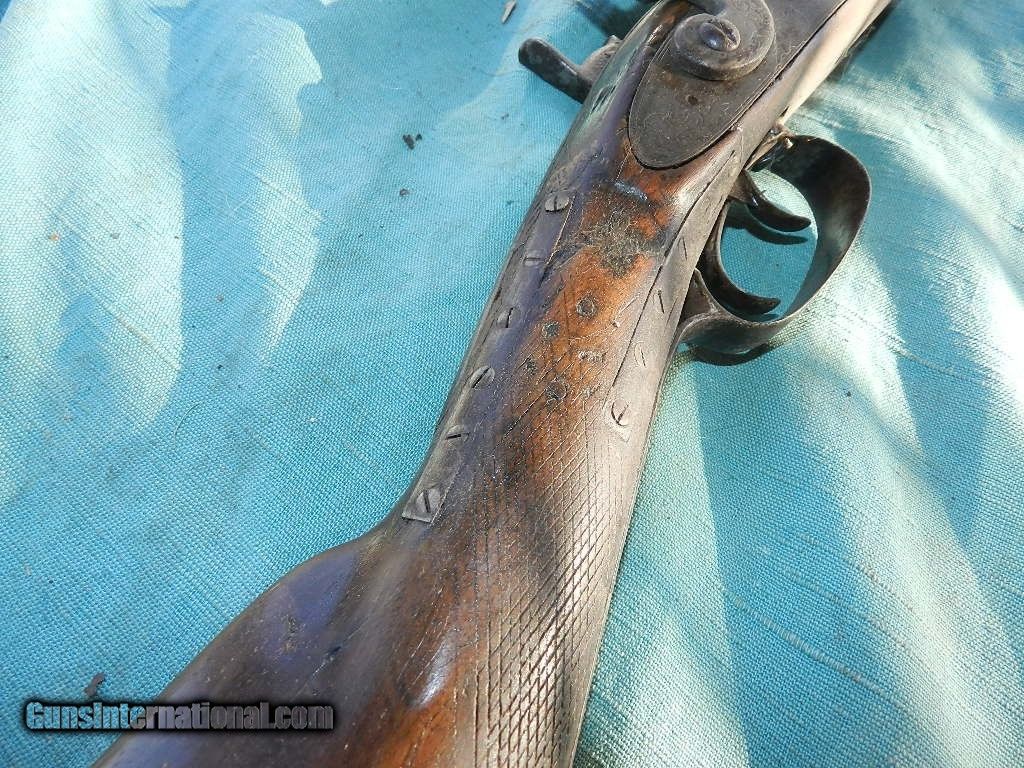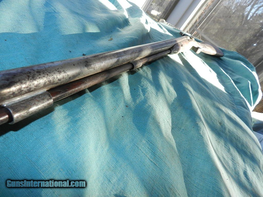 Description: <<<<SOLD>>>Many 12ga double hammer percussion 12ga shotguns found were used in the Civil War mostly by the Confeferacy , calvary use and guard duty as a multi-purpose gun. This H.&J.W. KING with chisel engraved lock-plates with name and game scenes, works well and both hammers are matched. Left nippleis complete and looks good and the right nipple is mashed . Guns over 100 years bot sold as shooters. The exterior metal is greyish woth the barrel having areas of oxidation, patches. Come with a hardwood ram-rod with a abaig brass tip The wrist area , with wekest part of the shorgun had a break wand was repaired solidly long ago and has had rwo long iron stips with several screws. This is surprisingly very solid. The LOP is about 14". The 32" long barrel chokes are right tube: IC and the lefr tube is also IC.Top of barrel states FINE LONDON TWIST.. A very colorful gun that looks lkke it could tell some stories. When buying a gun always have it examined by a competent gunsmith before shooting. To buy a gun from me you must get a direct email for me, with details, and shipping cost. We don’t have a web site .I prefer money orders or a check. Item ships when funds come in. I try to keep guns affordable, which means I make less money than most dealers. You won’t get altitude sickness, or nose bleed, with my prices! I consistently have the best selection of older guns If you attempt to buy, you must still contact us for details . Best to email to buy. Sometimes a local person can stop buy and purchase before the gun is removed. Sometimes not home to get calls. Some guns are required shipment to a gun dealer near you for a transfer to you when it arrives. Otherwise many older or black powder guns ship to your door. With the widest selection of older guns at great prices, We don’t have a store, and sell on the internet only. I’m easy to get along with. Thank You SOLD |