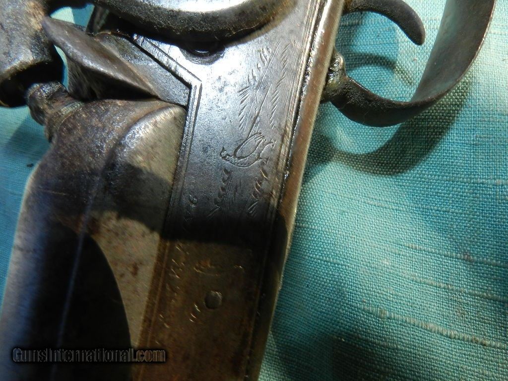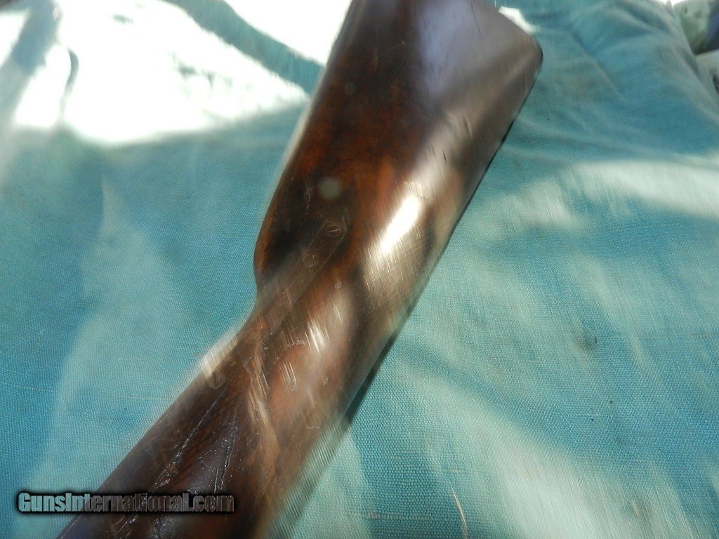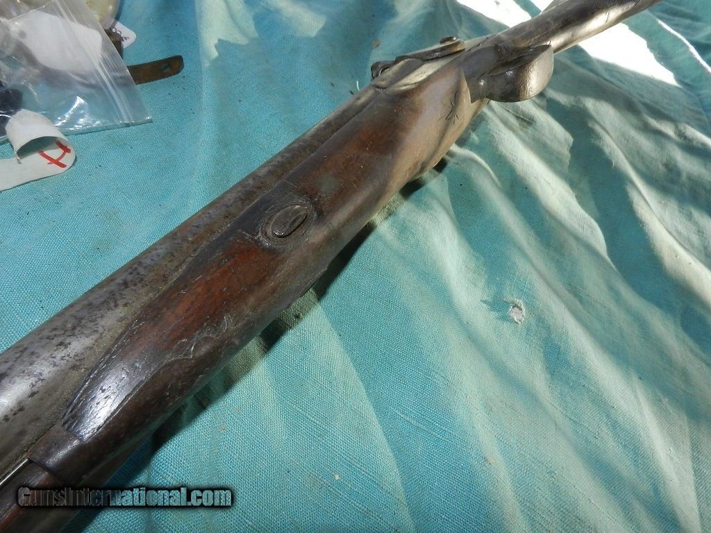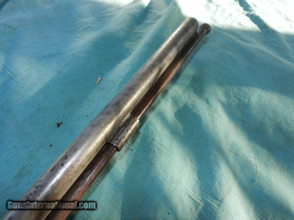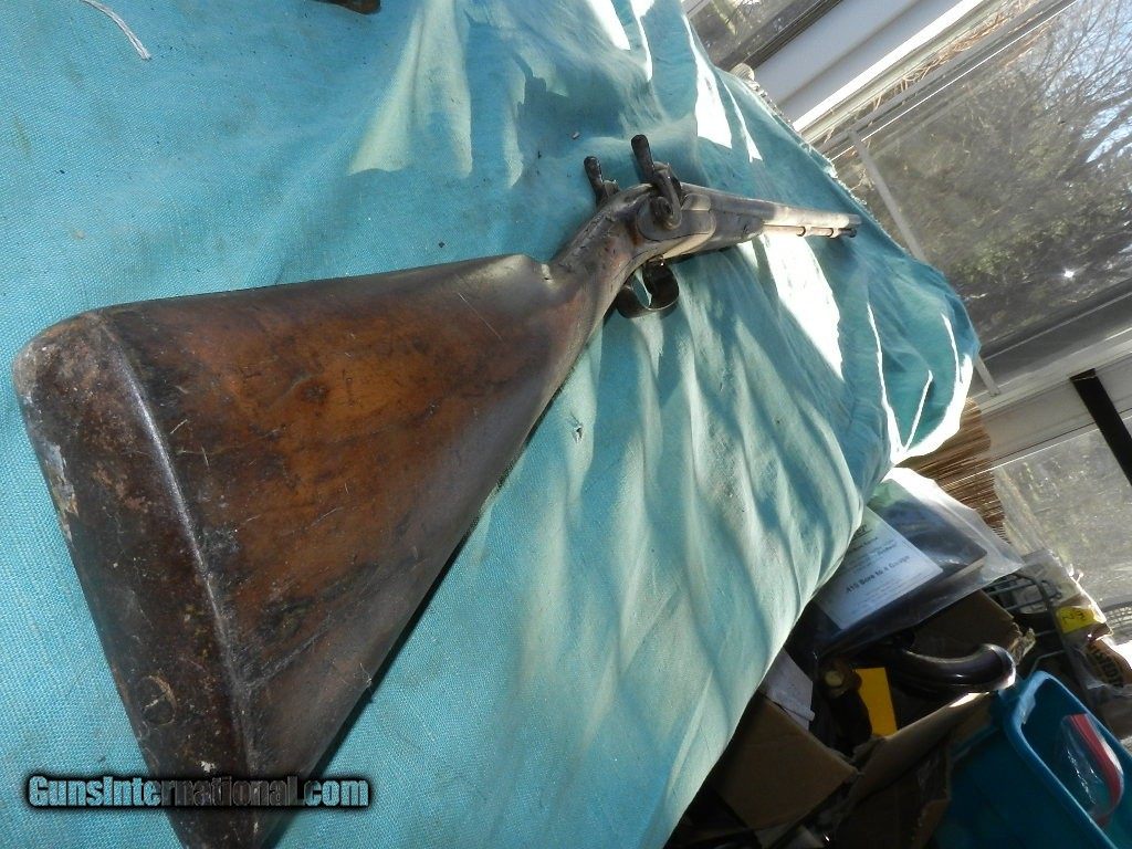 Description: <<<<SOLD>>>Many 12ga double hammer percussion 12ga shotguns found were used in the Civil War mostly by the Confeferacy , calvary use and guard duty as a multi-purpose gun. This H.&J.W. KING with chisel engraved lock-plates with name and game scenes, works well and both hammers are matched. Left nippleis complete and looks good and the right nipple is mashed . Guns over 100 years bot sold as shooters. The exterior metal is greyish woth the barrel having areas of oxidation, patches. Come with a hardwood ram-rod with a abaig brass tip The wrist area , with wekest part of the shorgun had a break wand was repaired solidly long ago and has had rwo long iron stips with several screws. This is surprisingly very solid. The LOP is about 14". The 32" long barrel chokes are right tube: IC and the lefr tube is also IC.Top of barrel states FINE LONDON TWIST.. A very colorful gun that looks lkke it could tell some stories. When buying a gun always have it examined by a competent gunsmith before shooting. To buy a gun from me you must get a direct email for me, with details, and shipping cost. We don’t have a web site .I prefer money orders or a check. Item ships when funds come in. I try to keep guns affordable, which means I make less money than most dealers. You won’t get altitude sickness, or nose bleed, with my prices! I consistently have the best selection of older guns If you attempt to buy, you must still contact us for details . Best to email to buy. Sometimes a local person can stop buy and purchase before the gun is removed. Sometimes not home to get calls. Some guns are required shipment to a gun dealer near you for a transfer to you when it arrives. Otherwise many older or black powder guns ship to your door. With the widest selection of older guns at great prices, We don’t have a store, and sell on the internet only. I’m easy to get along with. Thank You SOLD |