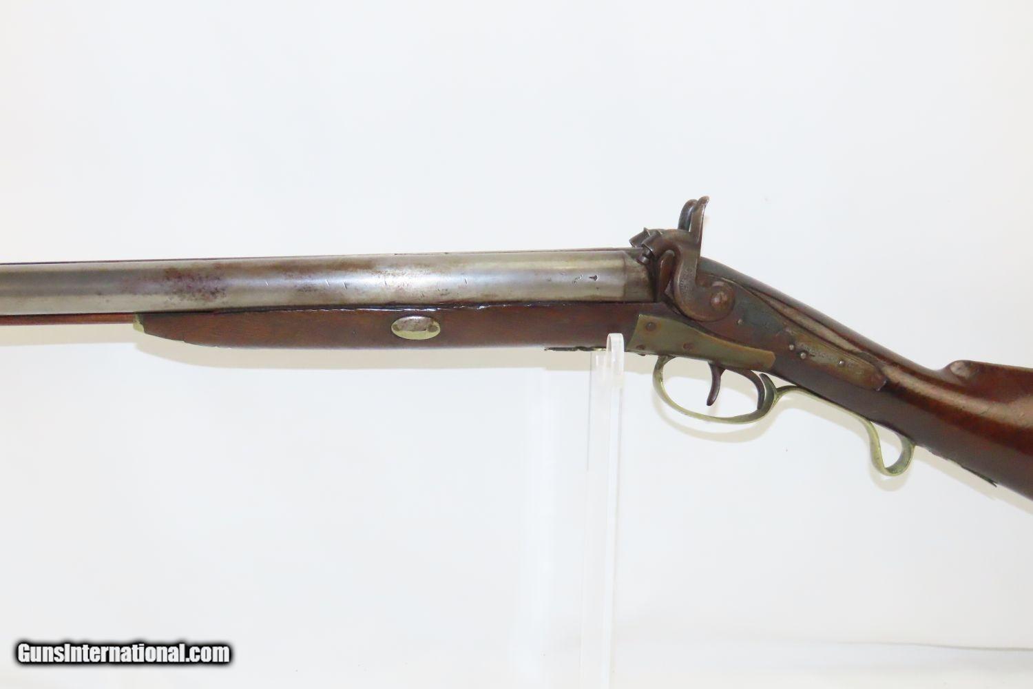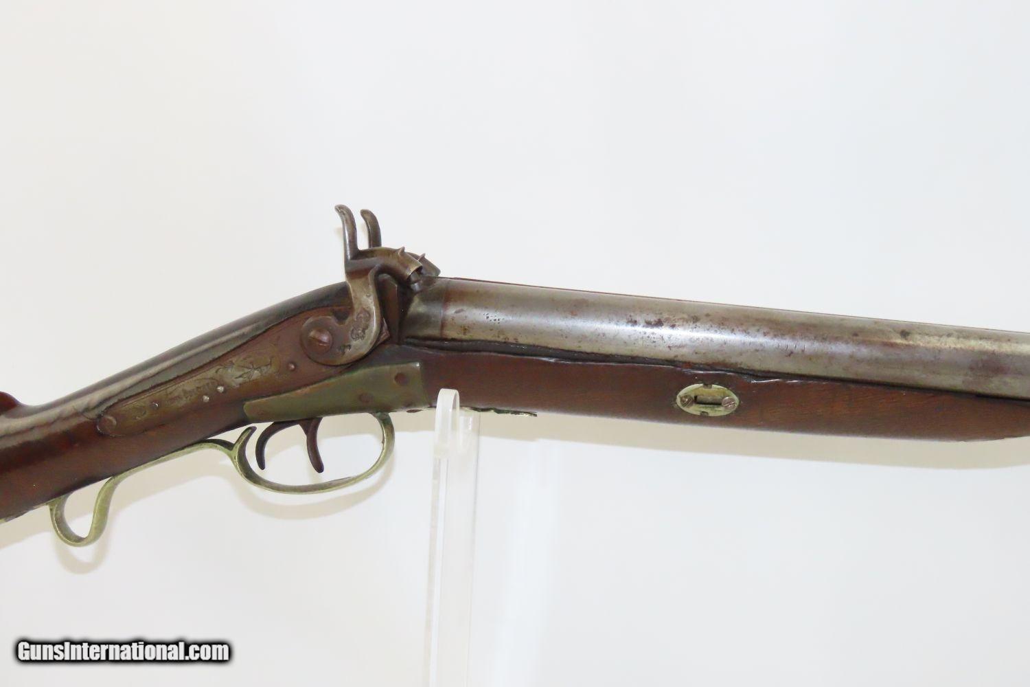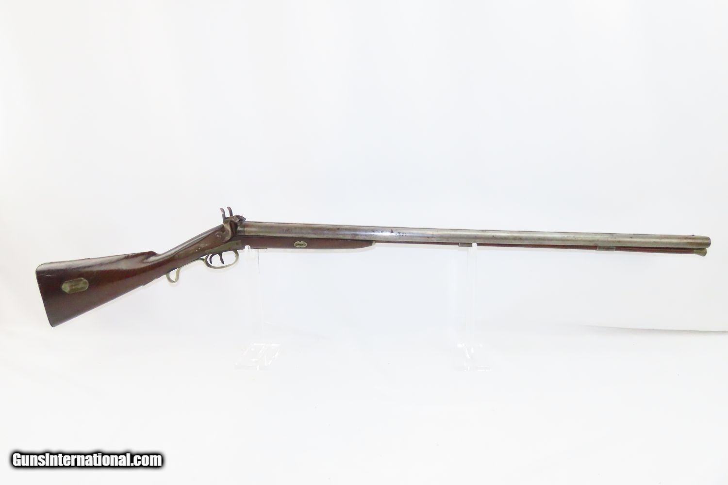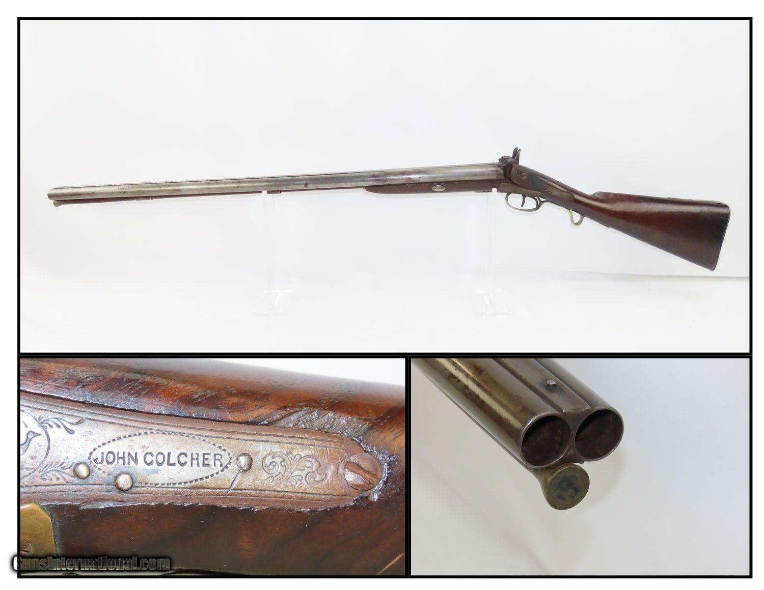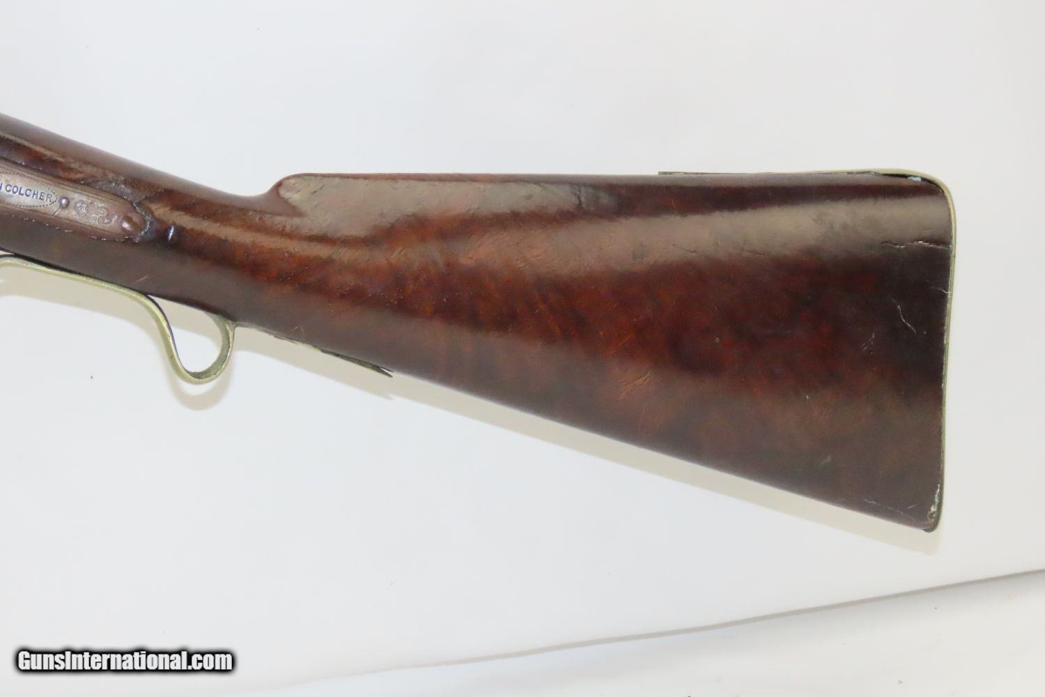 Description: JACKSONVILLE, ILLINOIS “R J RUNKEL” PERCUSSION SxS Shotgun by JOHN COLCHER Mid-to-Late 19th Century Belgian Fowler! Here we present an antique John Colcher Double Barrel Percussion Side by Side Shotgun, made sometime in the mid-19th Century in Liege, Belgium. As people moved West and settled in remote areas, hunting was especially important to put food on the table and for protecting the homestead. This would have been a good gun for fowl hunting. These locks were called “back action” because the mainspring hangs behind the tumbler. The back action is often used in double rifles and occasionally in single barrel shotguns where the need for strength requires as little steel as possible be removed from the bar of the action. This lock was popular on percussion guns made in St. Louis, New York, California, Ohio, England and Belgium. Back Action percussion locks were a “late” developed style of lock. Used primarily on the hardware store line of guns, these locks did, however, show up on some better pieces in the mid-to-late 1800’s. This one features a particularly well-grained piece of wood for the stock. “RJ RUNKEL/JACKSONVILLE/JACKSONVILLE.ILL.” is stamped on the ownership placard proudly affixed to the right side of the butt stock. The Runkel family has a long history in Jacksonville. An old brass plate repair can be observed on the underside of the stock around the triggers. The action is strong on both sides. This example has a solid stock. The barrel wedge keyhole has been repaired and remains a bit loose. There is an old repair using screwed in brass plates to support the stock around the triggers. This old double looks like it was used hard and practically and repaired when the need arose. It will make a great accouterment for above the mantle. Own the original! This is a legitimate antique and not a reproduction. Barrels: 32 inches. Caliber: 12 Gauge Percussion Length of Pull: 14-1/8 inches Overall condition as seen in photos. Very Fast. Very Safe. FREE SHIPPING WORLDWIDE. Delivered directly to your door by express mail! Guaranteed AUTHENTIC & Includes CERTIFICATE OF AUTHENTICITY. ancestryguns $1235 #201289 SOLD Antique: Yes |