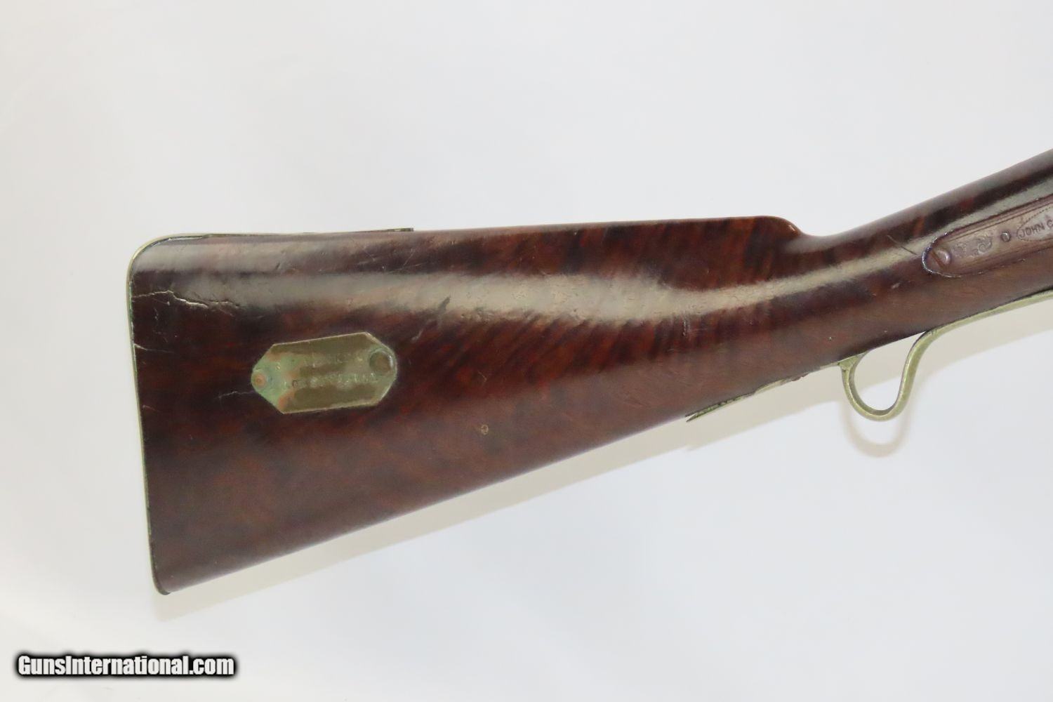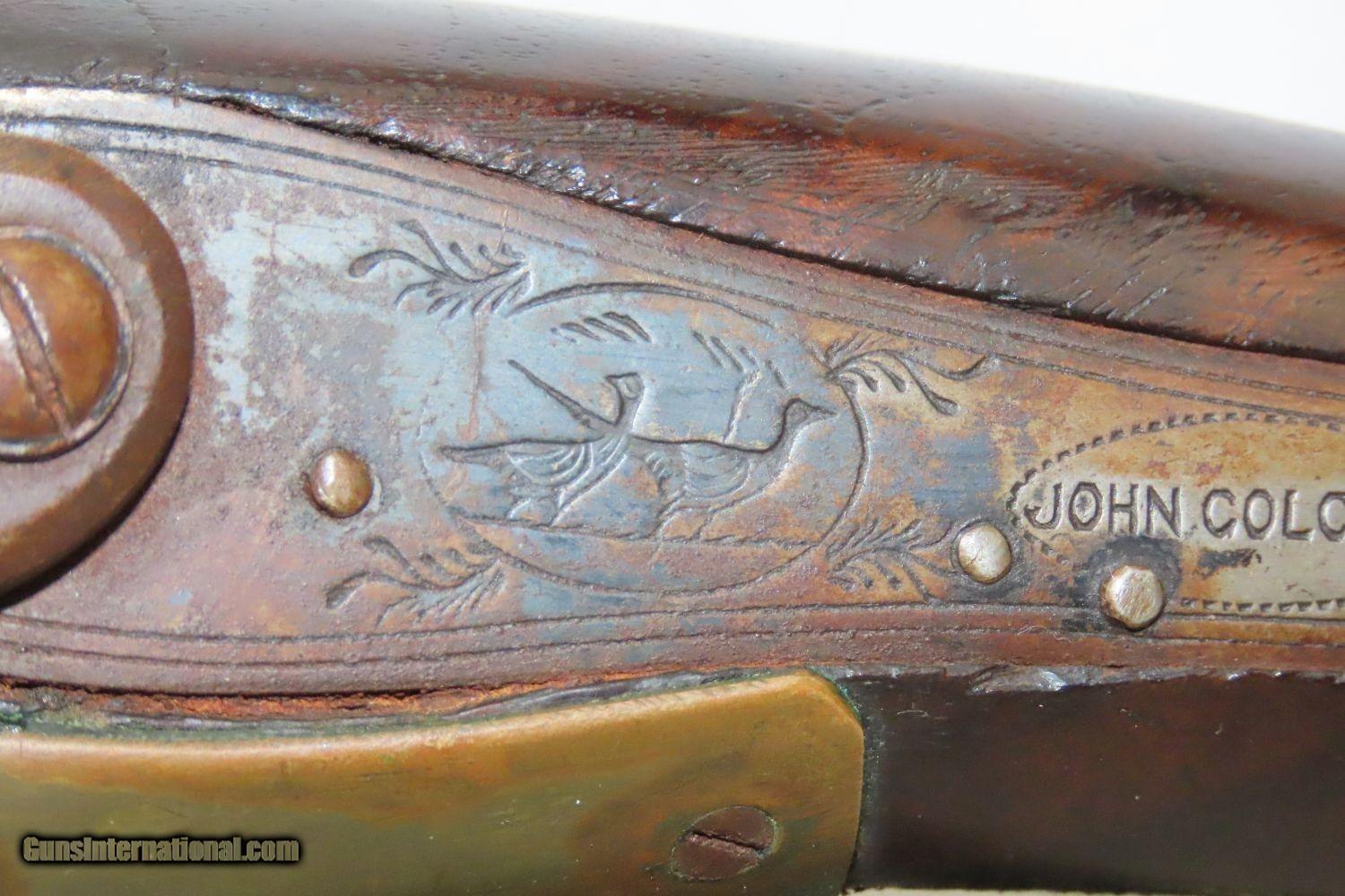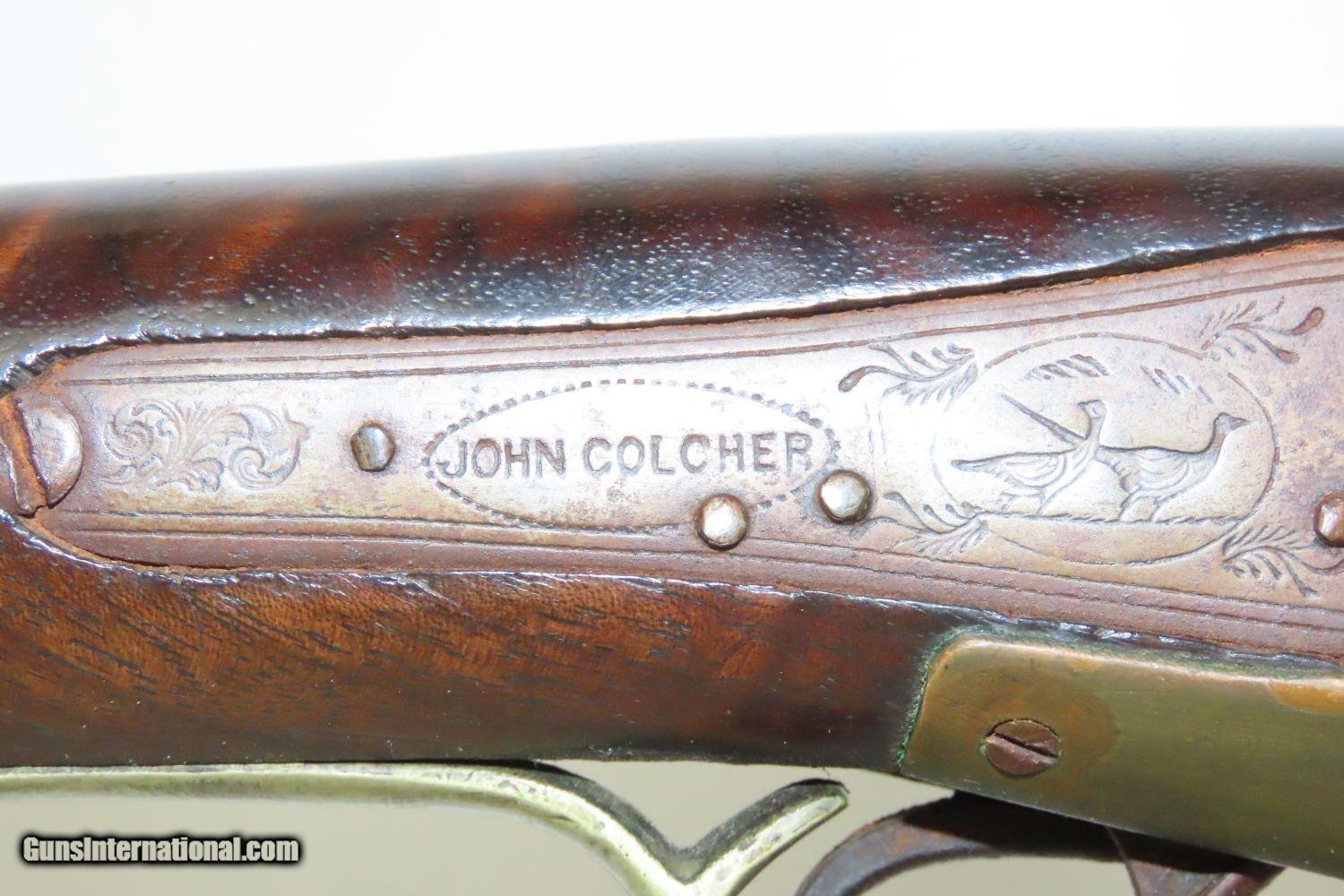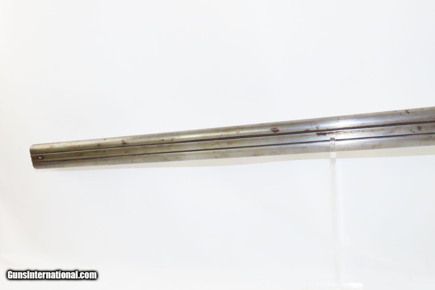 Description: JACKSONVILLE, ILLINOIS “R J RUNKEL” PERCUSSION SxS Shotgun by JOHN COLCHER Mid-to-Late 19th Century Belgian Fowler! Here we present an antique John Colcher Double Barrel Percussion Side by Side Shotgun, made sometime in the mid-19th Century in Liege, Belgium. As people moved West and settled in remote areas, hunting was especially important to put food on the table and for protecting the homestead. This would have been a good gun for fowl hunting. These locks were called “back action” because the mainspring hangs behind the tumbler. The back action is often used in double rifles and occasionally in single barrel shotguns where the need for strength requires as little steel as possible be removed from the bar of the action. This lock was popular on percussion guns made in St. Louis, New York, California, Ohio, England and Belgium. Back Action percussion locks were a “late” developed style of lock. Used primarily on the hardware store line of guns, these locks did, however, show up on some better pieces in the mid-to-late 1800’s. This one features a particularly well-grained piece of wood for the stock. “RJ RUNKEL/JACKSONVILLE/JACKSONVILLE.ILL.” is stamped on the ownership placard proudly affixed to the right side of the butt stock. The Runkel family has a long history in Jacksonville. An old brass plate repair can be observed on the underside of the stock around the triggers. The action is strong on both sides. This example has a solid stock. The barrel wedge keyhole has been repaired and remains a bit loose. There is an old repair using screwed in brass plates to support the stock around the triggers. This old double looks like it was used hard and practically and repaired when the need arose. It will make a great accouterment for above the mantle. Own the original! This is a legitimate antique and not a reproduction. Barrels: 32 inches. Caliber: 12 Gauge Percussion Length of Pull: 14-1/8 inches Overall condition as seen in photos. Very Fast. Very Safe. FREE SHIPPING WORLDWIDE. Delivered directly to your door by express mail! Guaranteed AUTHENTIC & Includes CERTIFICATE OF AUTHENTICITY. ancestryguns $1235 #201289 SOLD Antique: Yes |