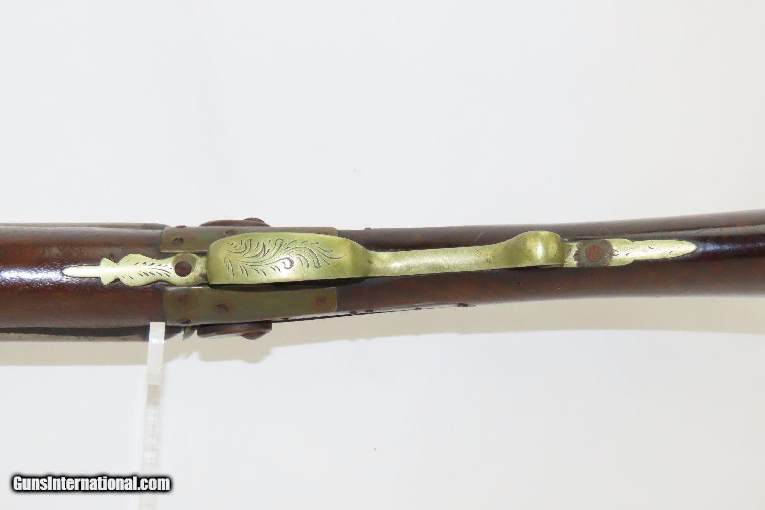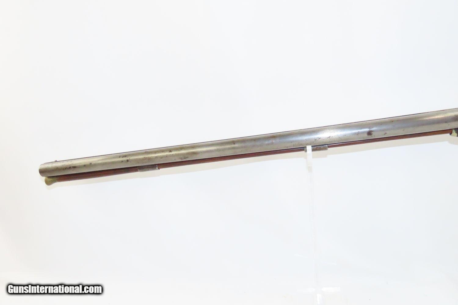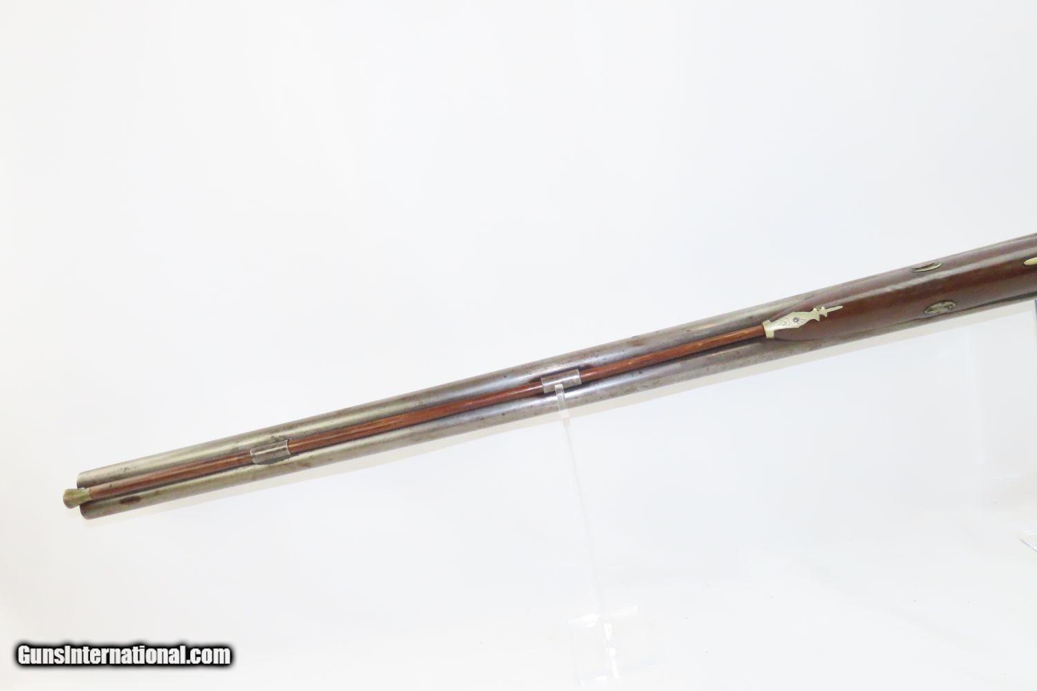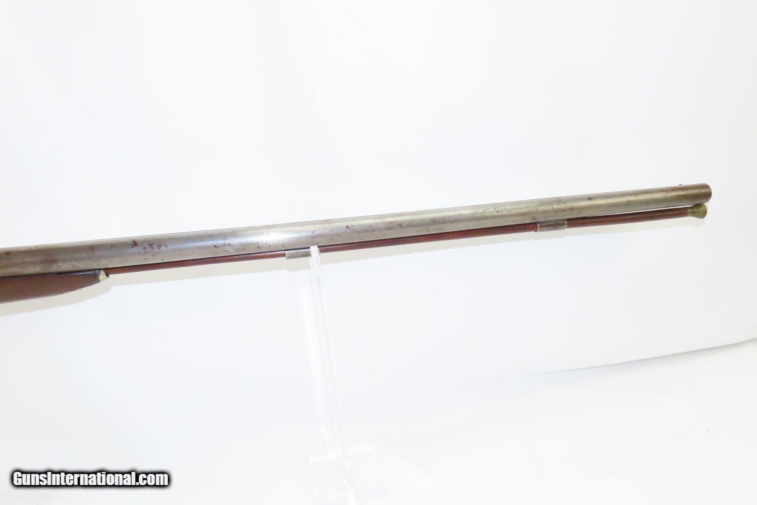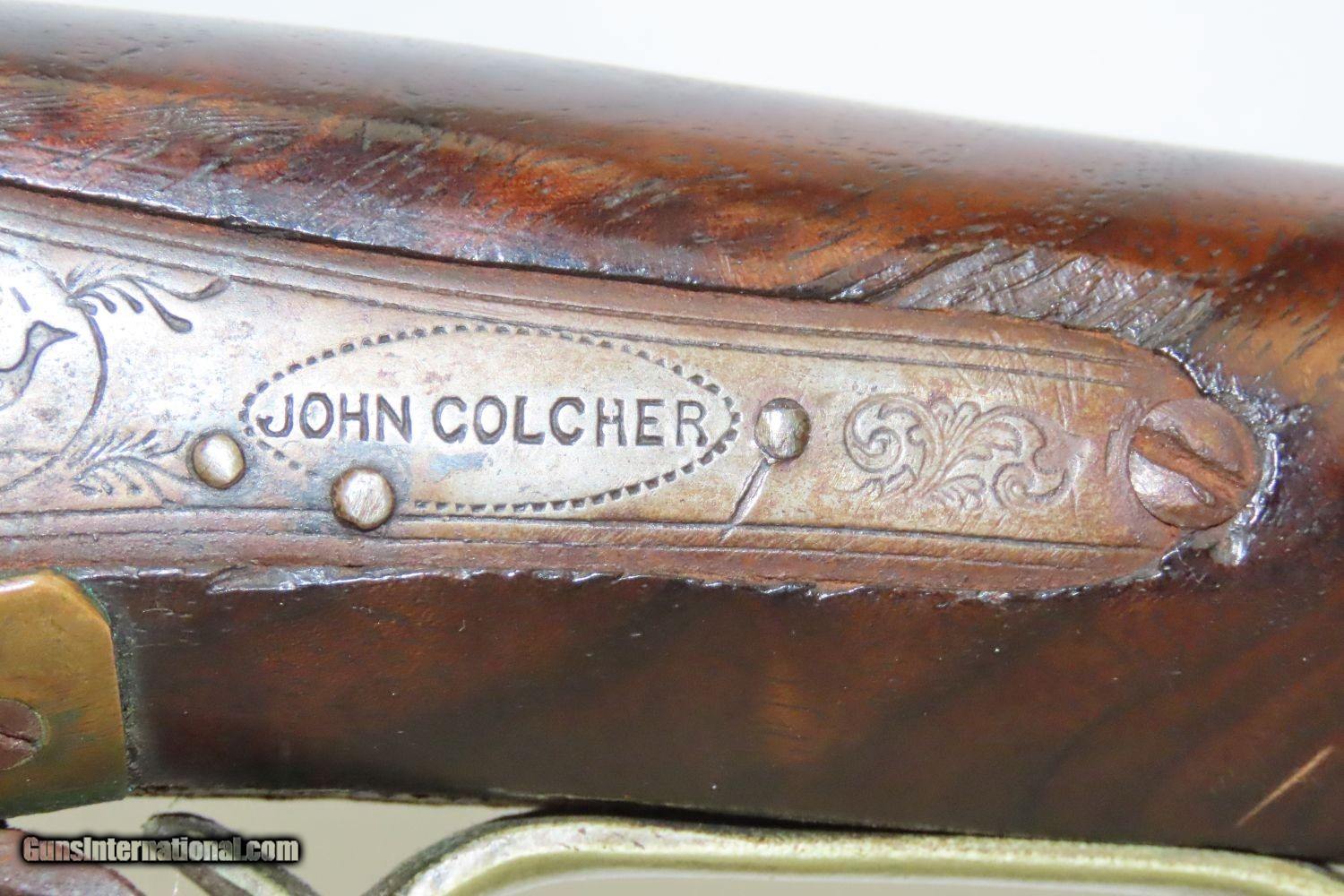 Description: JACKSONVILLE, ILLINOIS “R J RUNKEL” PERCUSSION SxS Shotgun by JOHN COLCHER Mid-to-Late 19th Century Belgian Fowler! Here we present an antique John Colcher Double Barrel Percussion Side by Side Shotgun, made sometime in the mid-19th Century in Liege, Belgium. As people moved West and settled in remote areas, hunting was especially important to put food on the table and for protecting the homestead. This would have been a good gun for fowl hunting. These locks were called “back action” because the mainspring hangs behind the tumbler. The back action is often used in double rifles and occasionally in single barrel shotguns where the need for strength requires as little steel as possible be removed from the bar of the action. This lock was popular on percussion guns made in St. Louis, New York, California, Ohio, England and Belgium. Back Action percussion locks were a “late” developed style of lock. Used primarily on the hardware store line of guns, these locks did, however, show up on some better pieces in the mid-to-late 1800’s. This one features a particularly well-grained piece of wood for the stock. “RJ RUNKEL/JACKSONVILLE/JACKSONVILLE.ILL.” is stamped on the ownership placard proudly affixed to the right side of the butt stock. The Runkel family has a long history in Jacksonville. An old brass plate repair can be observed on the underside of the stock around the triggers. The action is strong on both sides. This example has a solid stock. The barrel wedge keyhole has been repaired and remains a bit loose. There is an old repair using screwed in brass plates to support the stock around the triggers. This old double looks like it was used hard and practically and repaired when the need arose. It will make a great accouterment for above the mantle. Own the original! This is a legitimate antique and not a reproduction. Barrels: 32 inches. Caliber: 12 Gauge Percussion Length of Pull: 14-1/8 inches Overall condition as seen in photos. Very Fast. Very Safe. FREE SHIPPING WORLDWIDE. Delivered directly to your door by express mail! Guaranteed AUTHENTIC & Includes CERTIFICATE OF AUTHENTICITY. ancestryguns $1235 #201289 SOLD Antique: Yes |