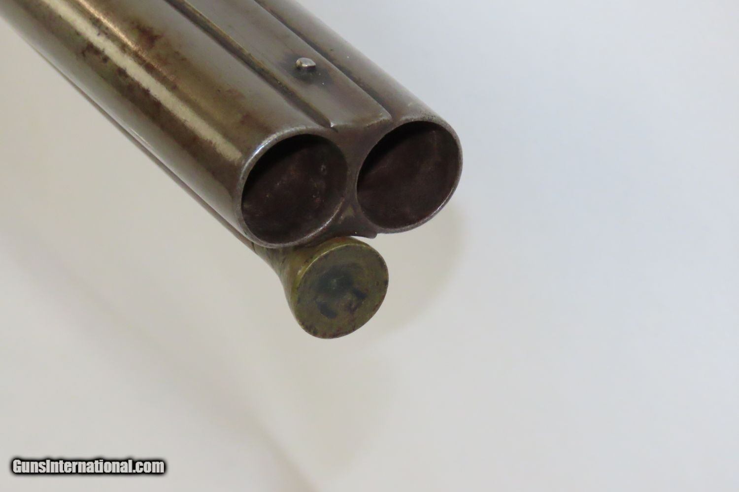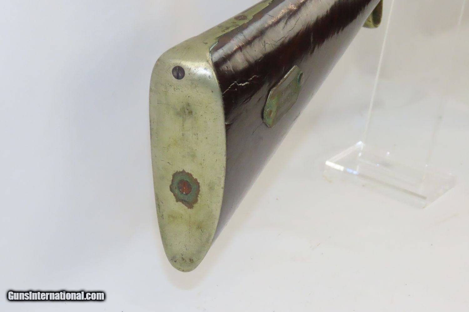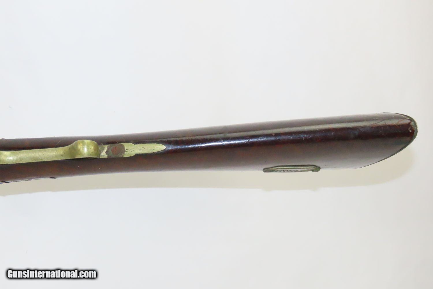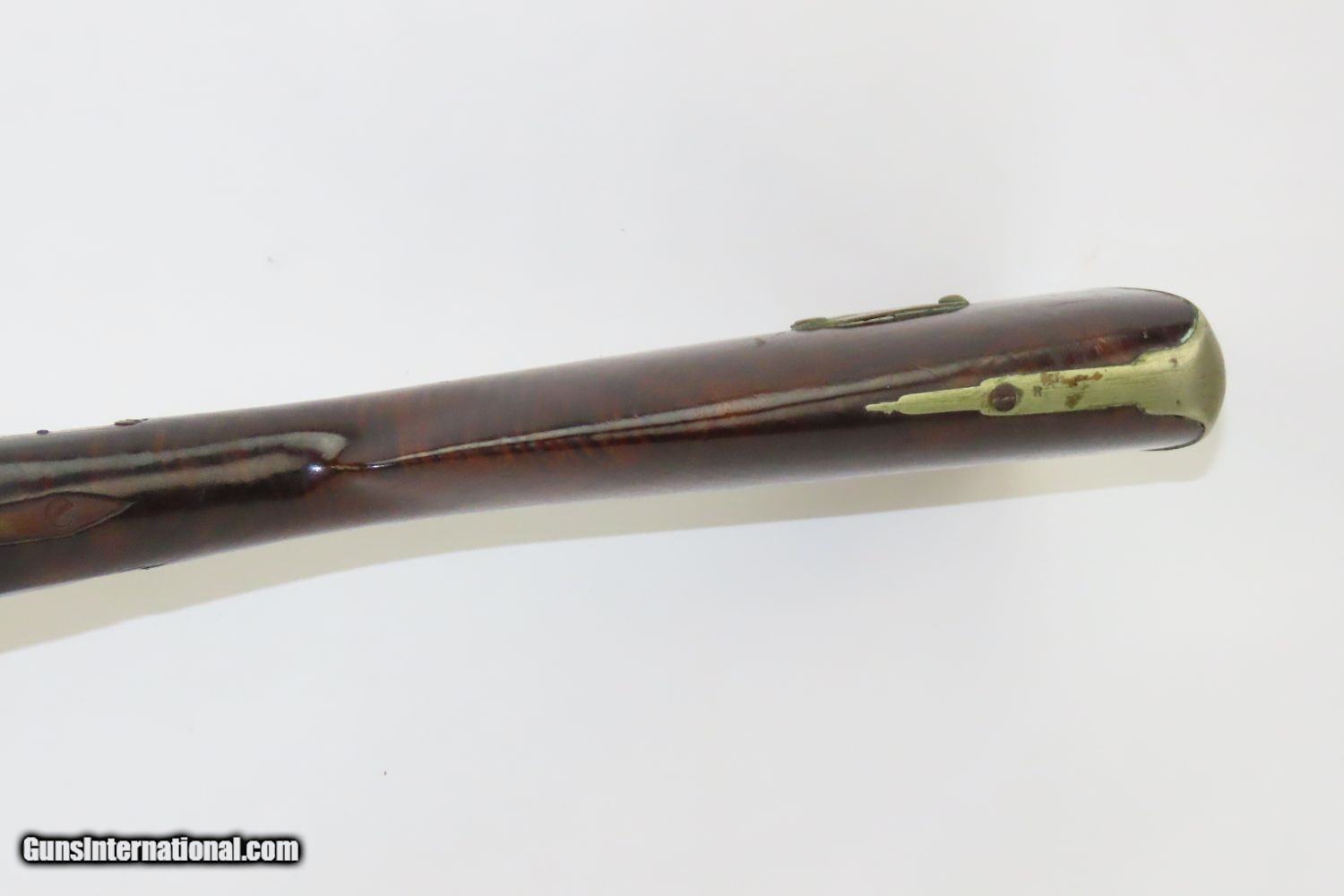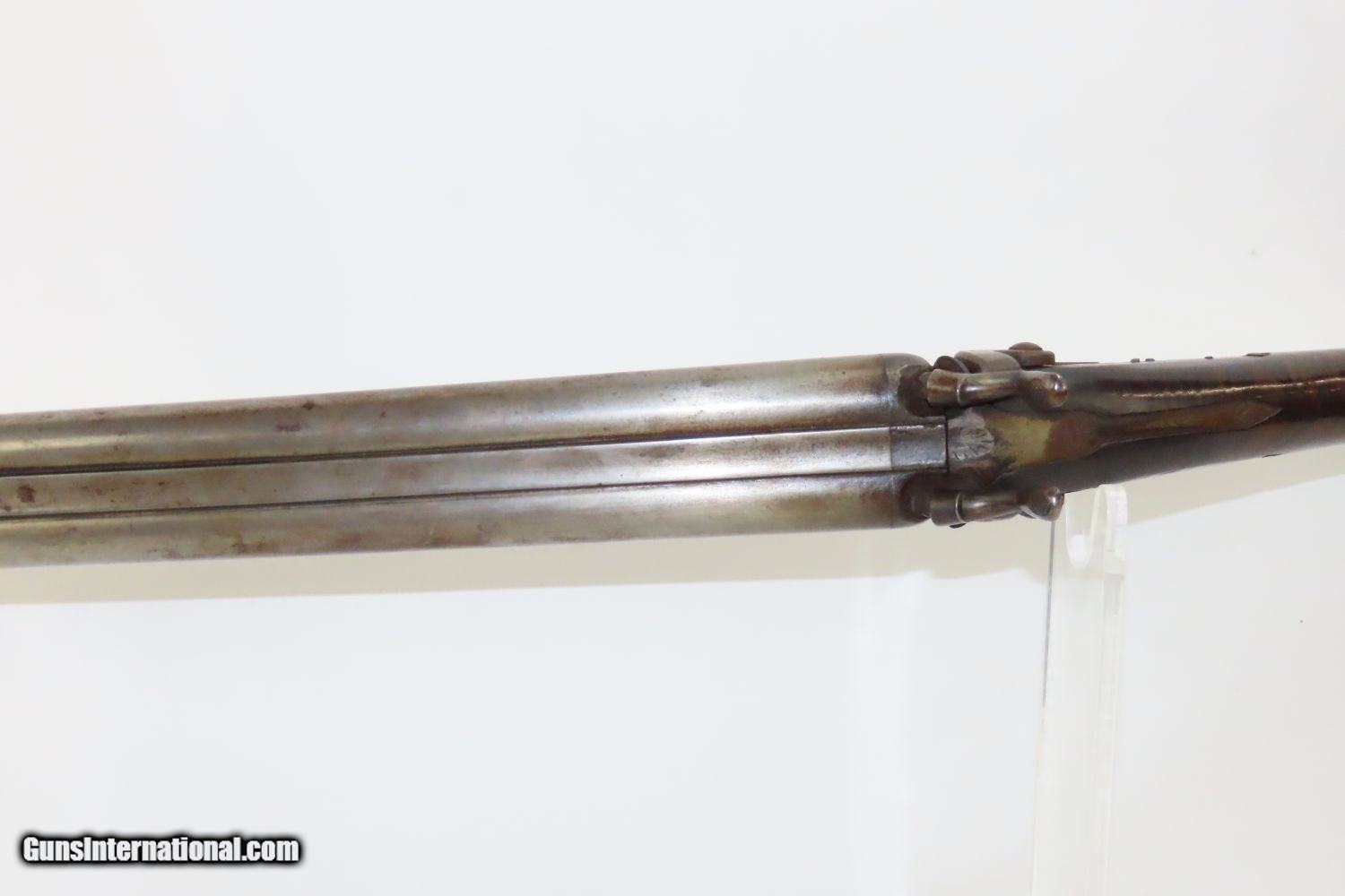 Description: JACKSONVILLE, ILLINOIS “R J RUNKEL” PERCUSSION SxS Shotgun by JOHN COLCHER Mid-to-Late 19th Century Belgian Fowler! Here we present an antique John Colcher Double Barrel Percussion Side by Side Shotgun, made sometime in the mid-19th Century in Liege, Belgium. As people moved West and settled in remote areas, hunting was especially important to put food on the table and for protecting the homestead. This would have been a good gun for fowl hunting. These locks were called “back action” because the mainspring hangs behind the tumbler. The back action is often used in double rifles and occasionally in single barrel shotguns where the need for strength requires as little steel as possible be removed from the bar of the action. This lock was popular on percussion guns made in St. Louis, New York, California, Ohio, England and Belgium. Back Action percussion locks were a “late” developed style of lock. Used primarily on the hardware store line of guns, these locks did, however, show up on some better pieces in the mid-to-late 1800’s. This one features a particularly well-grained piece of wood for the stock. “RJ RUNKEL/JACKSONVILLE/JACKSONVILLE.ILL.” is stamped on the ownership placard proudly affixed to the right side of the butt stock. The Runkel family has a long history in Jacksonville. An old brass plate repair can be observed on the underside of the stock around the triggers. The action is strong on both sides. This example has a solid stock. The barrel wedge keyhole has been repaired and remains a bit loose. There is an old repair using screwed in brass plates to support the stock around the triggers. This old double looks like it was used hard and practically and repaired when the need arose. It will make a great accouterment for above the mantle. Own the original! This is a legitimate antique and not a reproduction. Barrels: 32 inches. Caliber: 12 Gauge Percussion Length of Pull: 14-1/8 inches Overall condition as seen in photos. Very Fast. Very Safe. FREE SHIPPING WORLDWIDE. Delivered directly to your door by express mail! Guaranteed AUTHENTIC & Includes CERTIFICATE OF AUTHENTICITY. ancestryguns $1235 #201289 SOLD Antique: Yes |