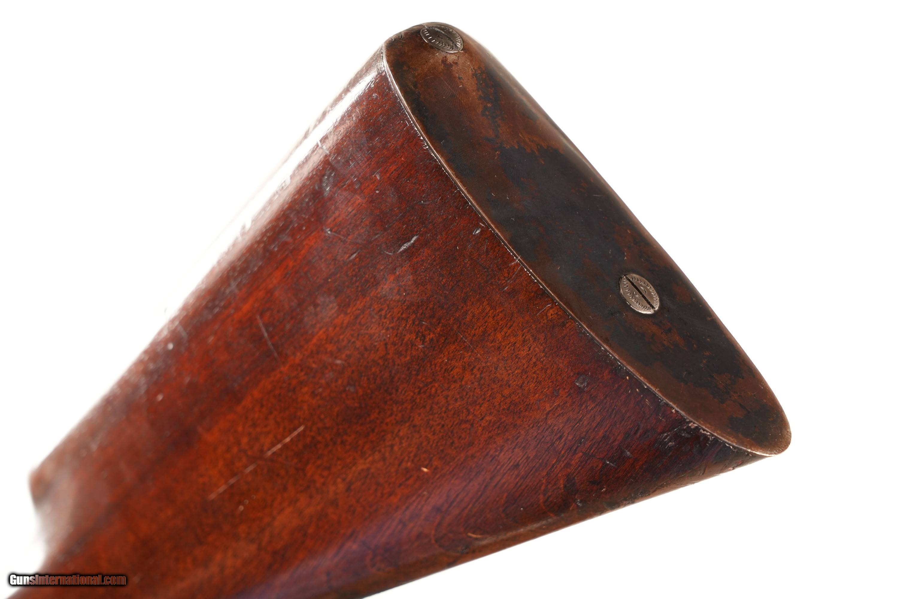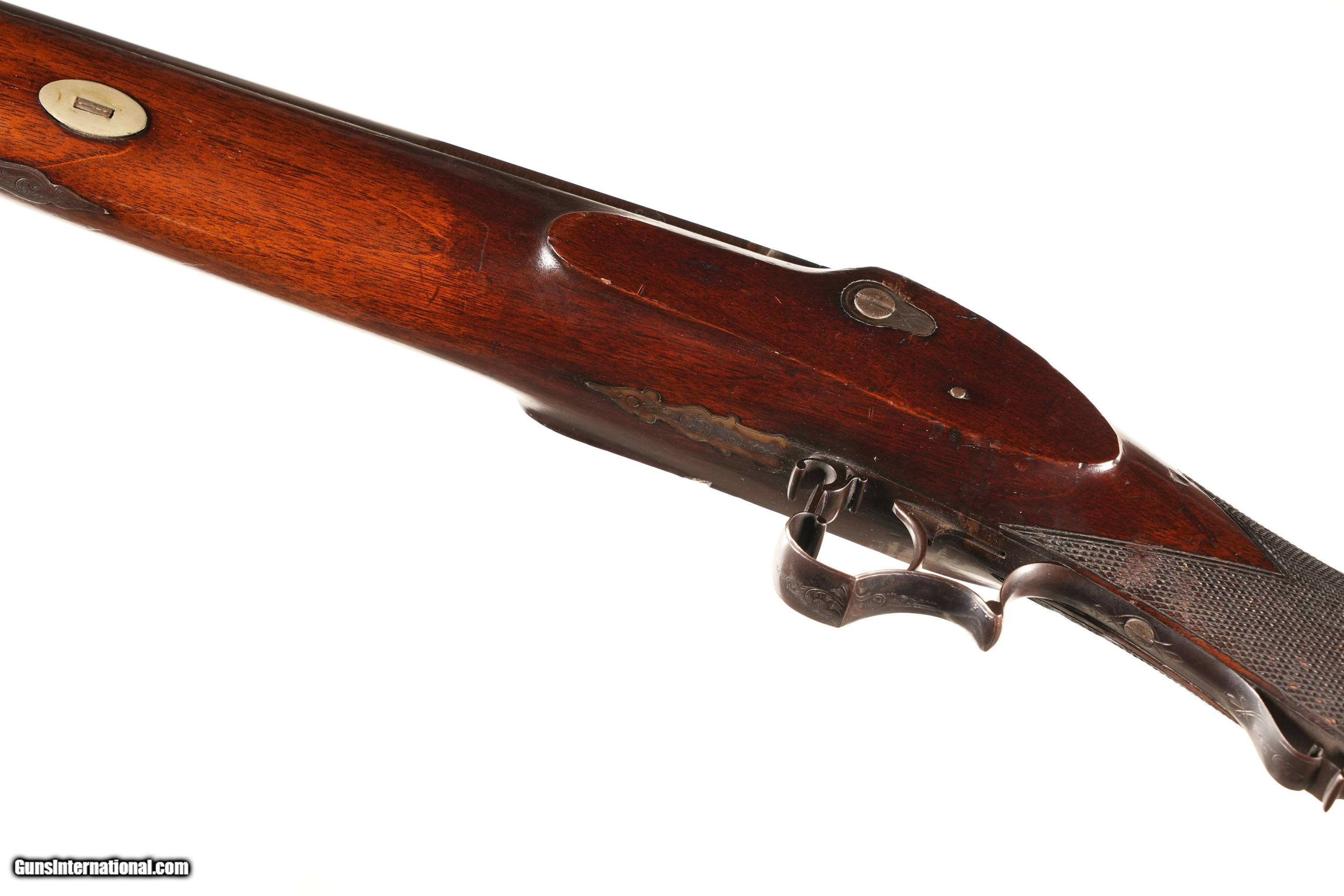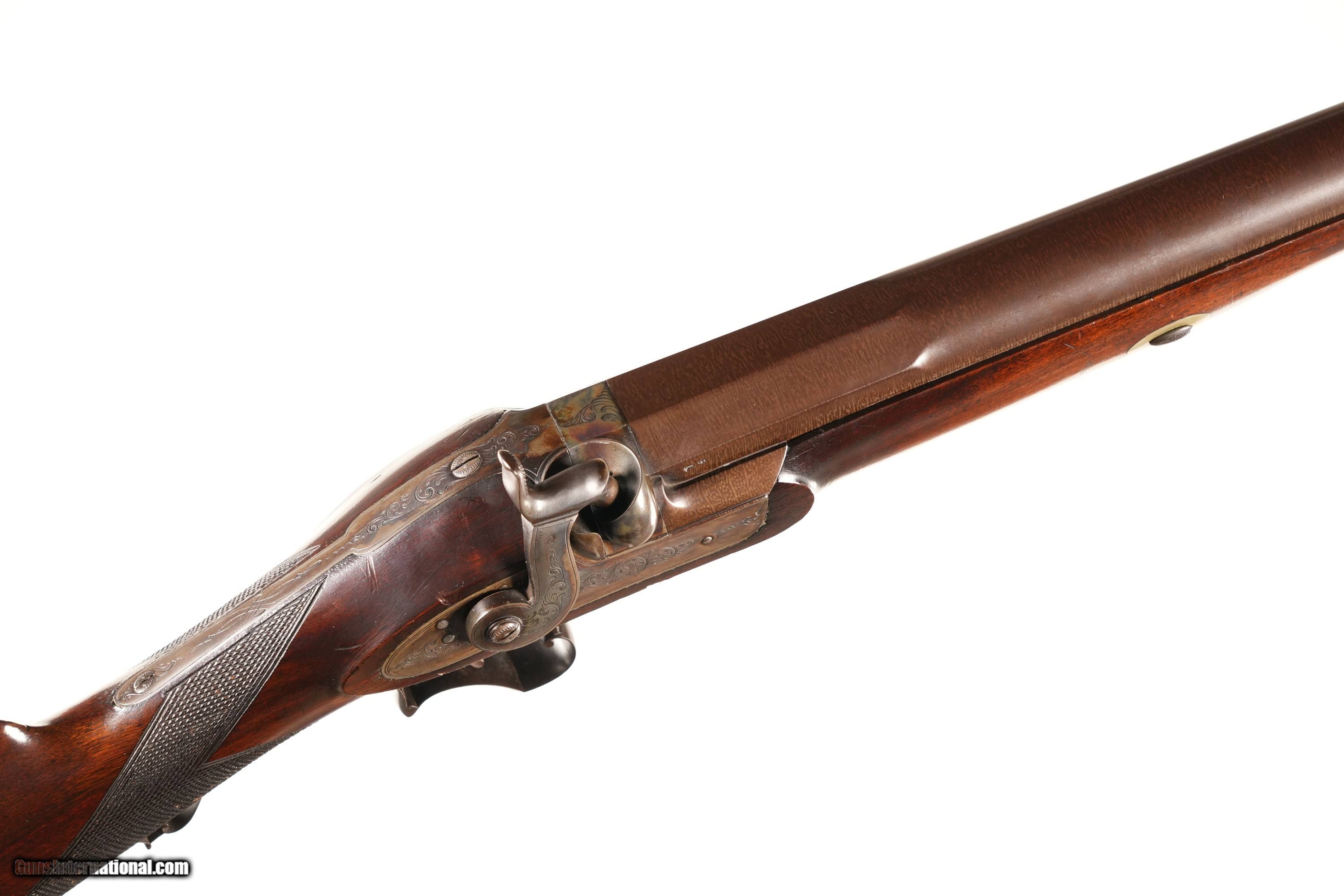 Description: 4 GA Serial # 9960 Leopold Bernard 1857 dated 4 ga Octagon to round vividly damascus patterned barrel with all markings on underside of breech. Case colored tang and patented breech with Case colored scroll engraved percussion lock. Outstanding styriaght grain oil finished walnut stock with blued iron furniture and mounts. Bore is bright and retains storage lacquer finish internal with bright breech face. Condition, Superb overall with some stock impressions and bruises from storage. Mechanically excellent Barrel 35" NO4473 • Free Shipping, No Credit Card Fees. • Lay-a-way available for this firearm. • 1/3 Down, a 1/3 in 30 Days 1/3 in 60 Days. SOLD Antique: Yes Manufacturer: Leopold Bernard Model: Percussion Serial Number: 9960 Barrel Length: 35 |