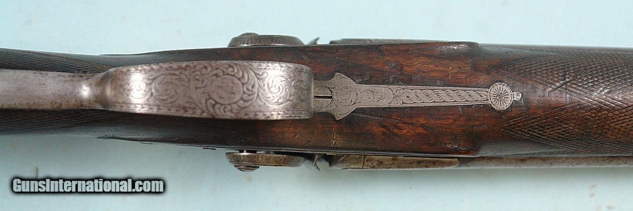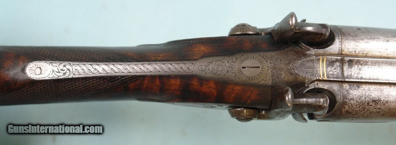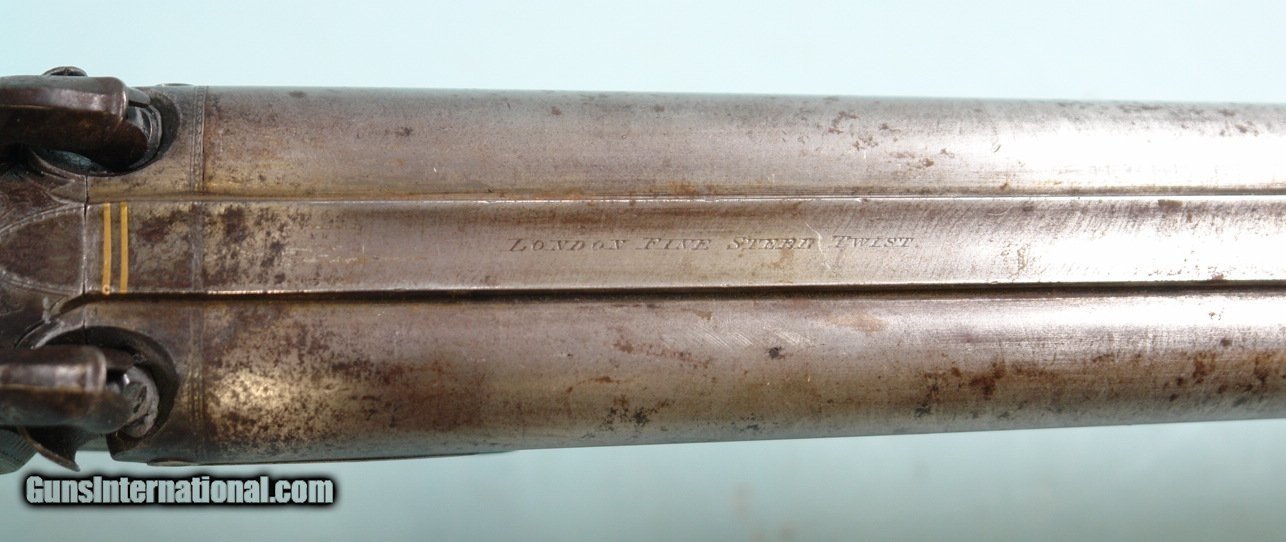 32891- LEWIS & TOMES, NEW YORK CITY IMPORT PERCUSSION 12 GA. SIDE X SIDE SHOTGUN CIRCA 1840. 47” o/a with 30” Damascus barrels engraved on rib “LONDON FINE STEEL TWIST” with Birmingham proofs on the underside and stamped in small letters “H & S” in front of the proofs for well known Birmingham makers Hollis & Sheath. Additionally stamped with the serial number “3750” between the barrels on the underside of the rib. Game scene engraving on locks and trigger guard and scroll engraved on hammers and steel mounts. Checkered deluxe grade walnut stock and forend. 14” pull to steel butt plate. Rosewood ramrod. Very good overall with grey metal and lightly worn original finish on wood. Lock in working order and reasonably good bore. Lewes & Tomes were located in Maiden’s Lane and were well known importers and dealers from as early as the 1820’s. $525.