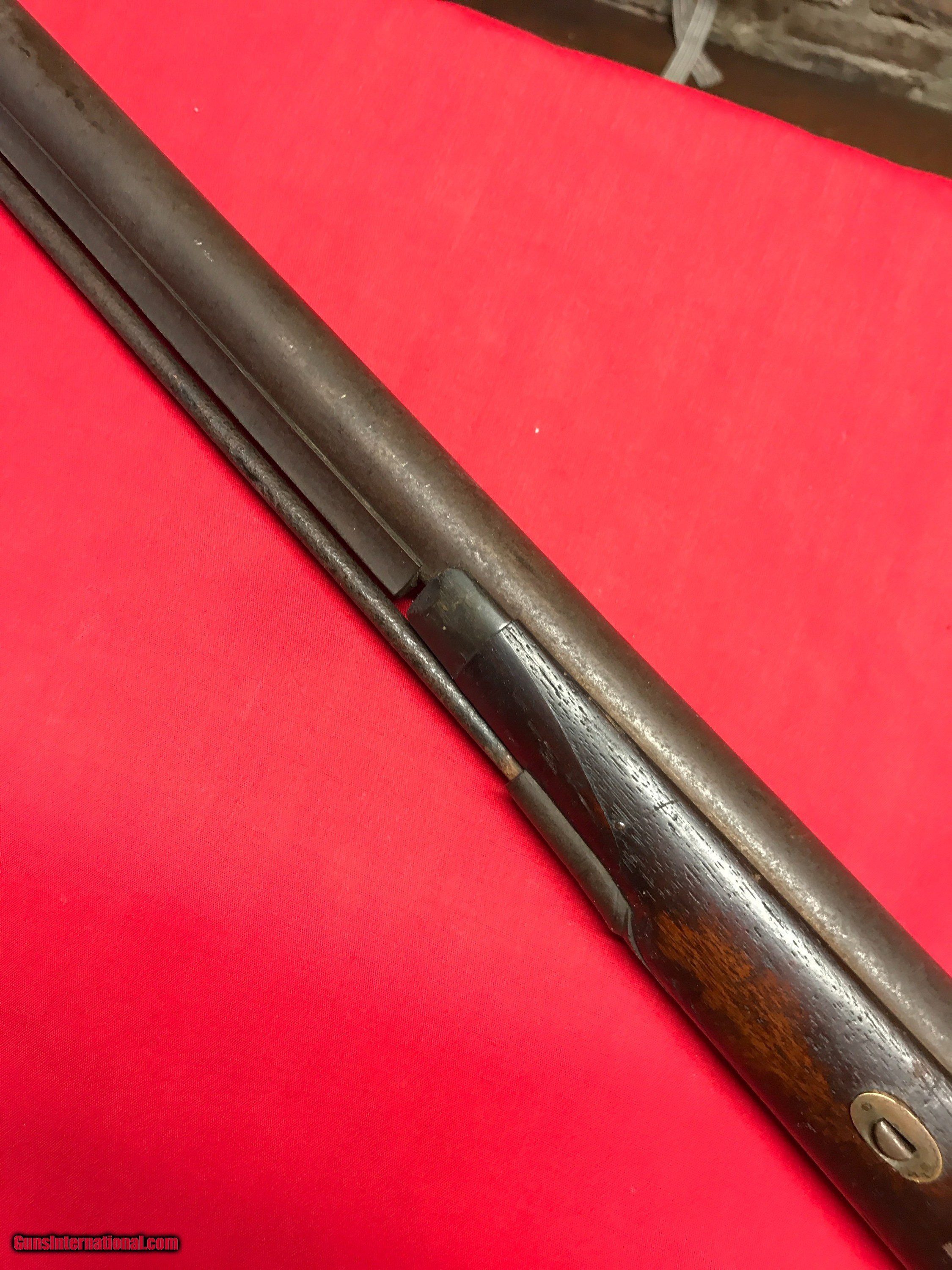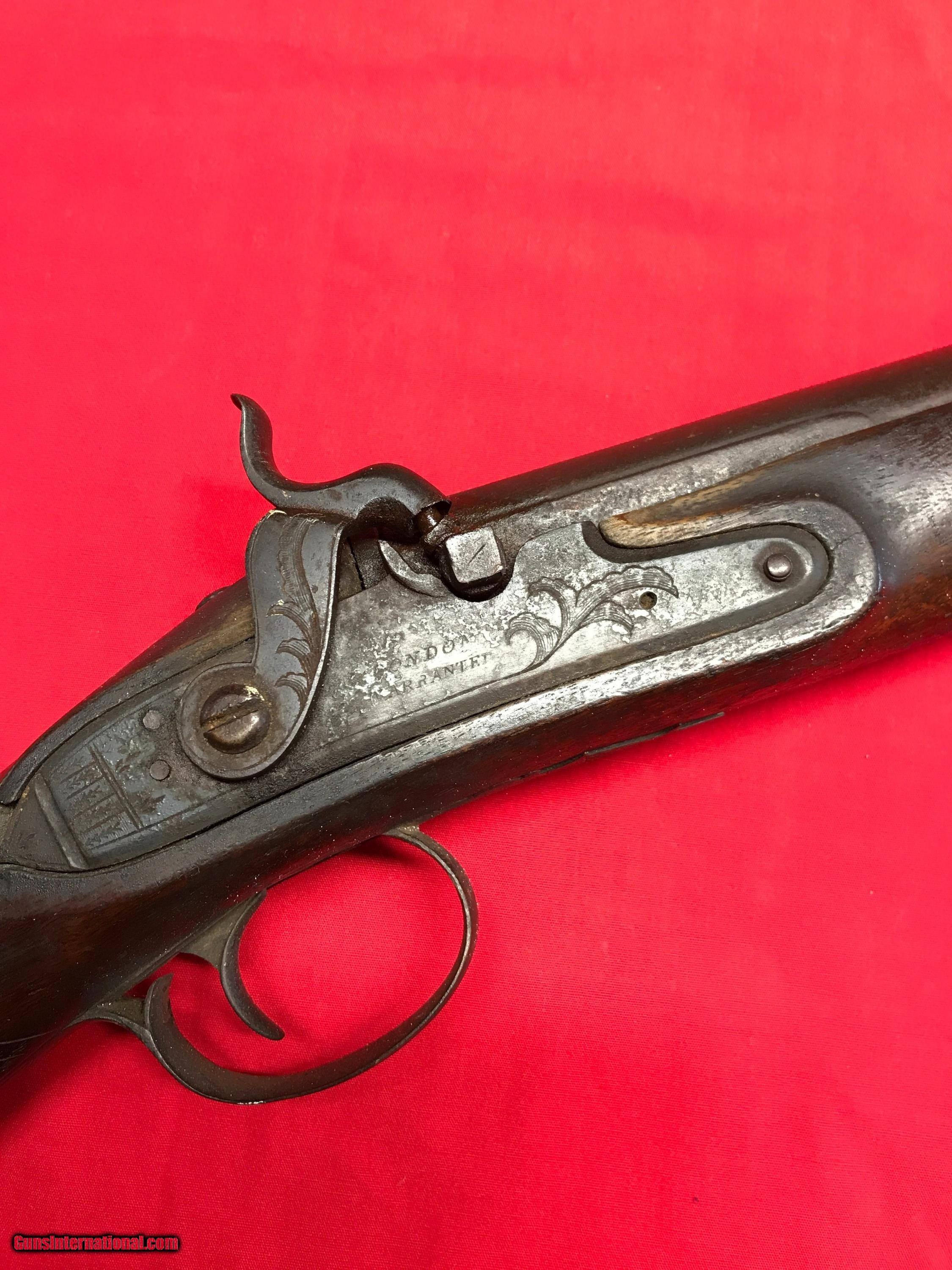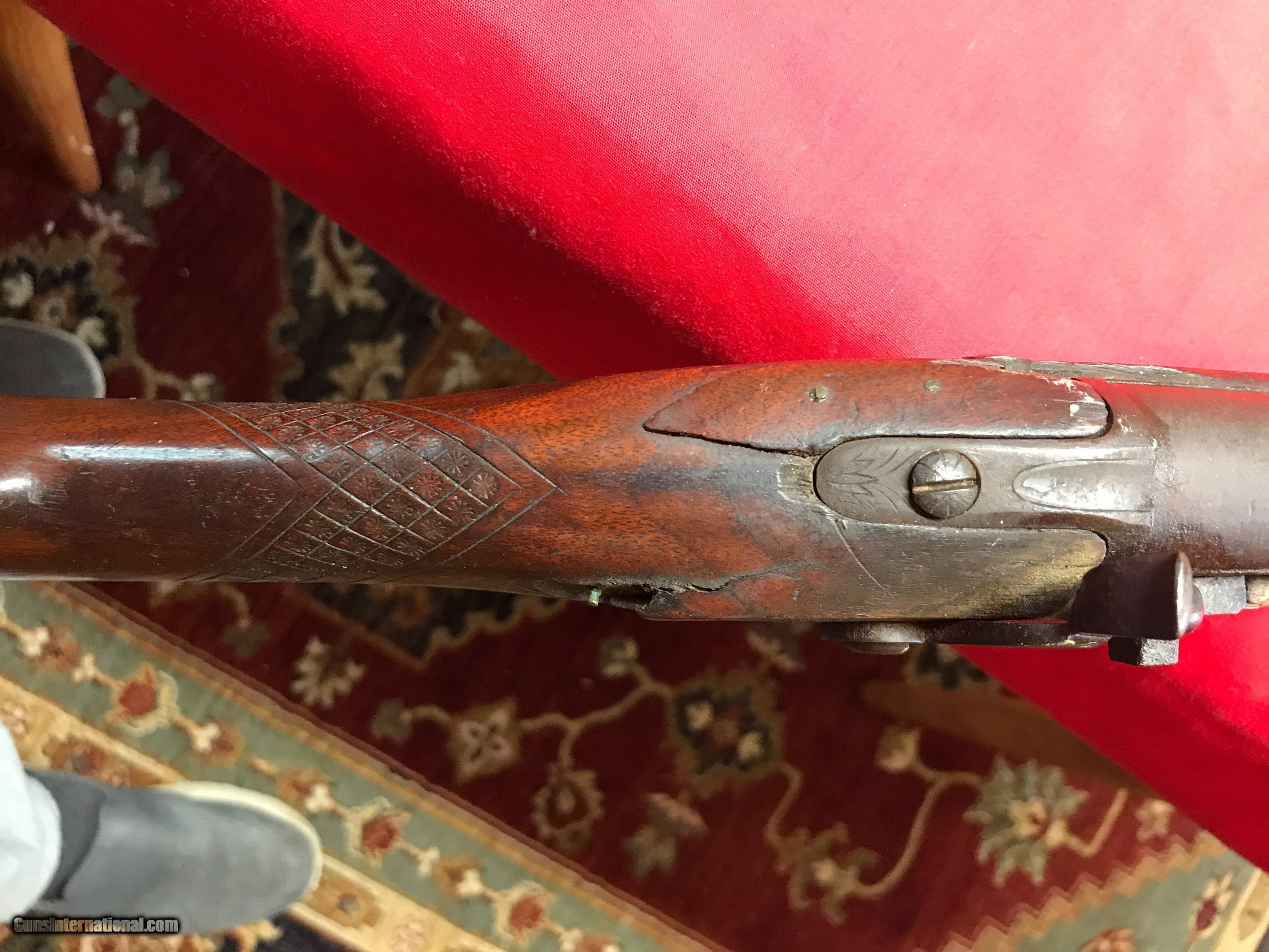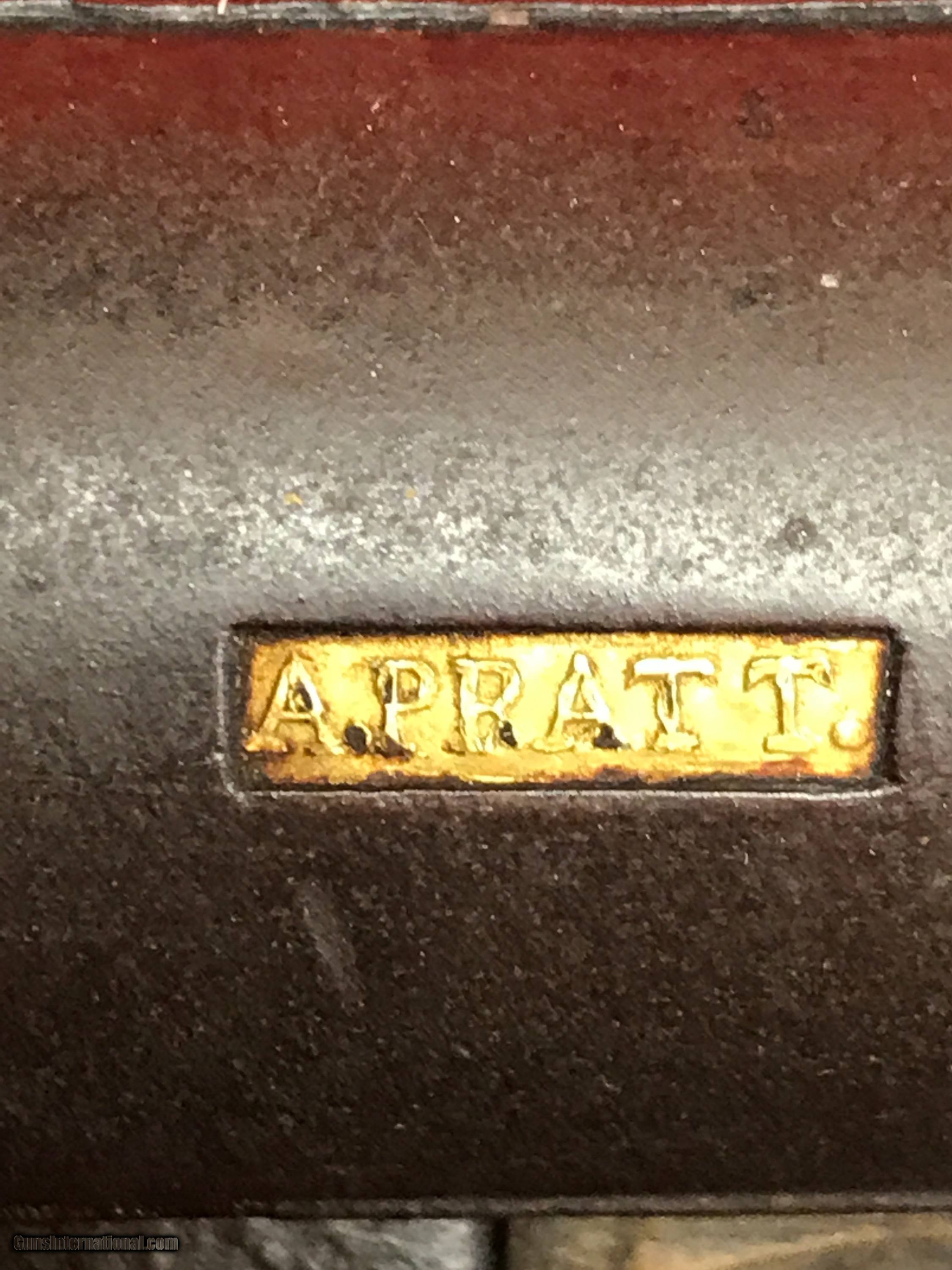 Description: This versitile hunting gun was most likely made by Alvan Pratt, of Concord, Mass, circa 1840...The heavy smooth bored 40" barrel is .69 caliber or 16 gauge...This was a stoutly made gun, suitable for shot and ball loads...Note the iron military style ramrod...Very good overall antique condition, with crudely repaired wood cracks and wood missing around the top tang...Nice to see the original checkering at the wrist and the gold A PRATT makers plate still on the barrel... SOLD Antique: Yes |