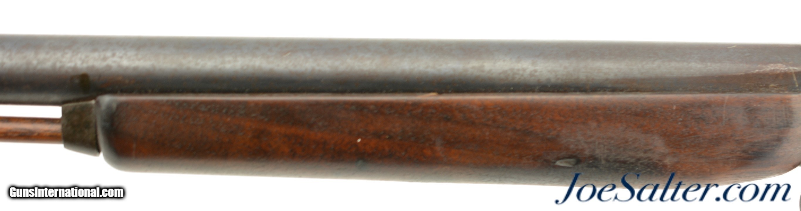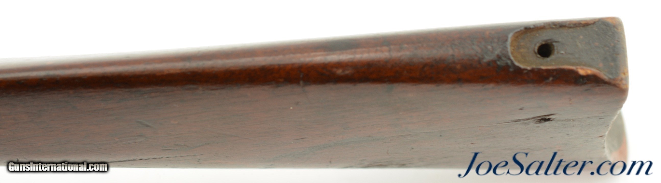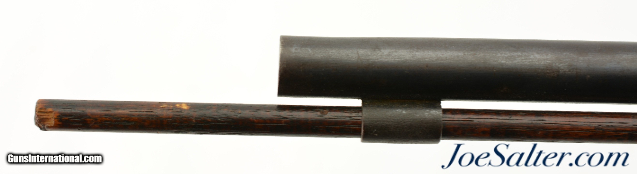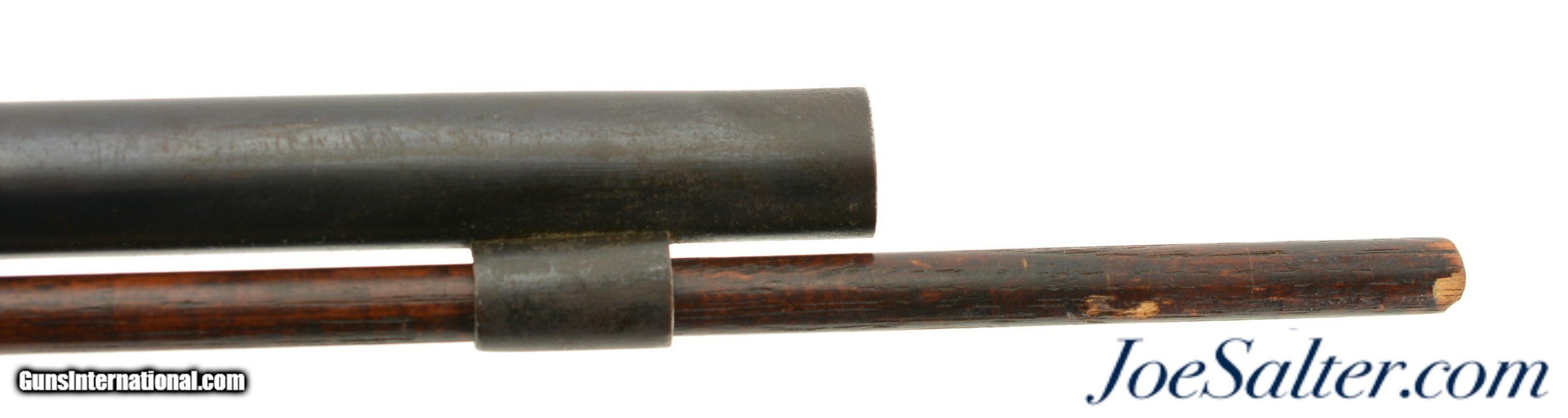 Description: Serial #672, 20 gauge black powder percussion, 32 5/8 inch (cut from a probable original 36") smooth bore barrel with a fine, dark, slightly rough bore. This is the Whitney Percussion single barrel shotgun manufactured from 1866-1869 with surplus 58 caliber rifled barrels that were reamed out to smoothbore. Quantities were quite limited and few of these single barrels survive today. This example is nicely marked on the barrel top "WHITNEY ARMS CO. WHITNEYVILLE CONN" with a blue/ brown patina having scattered freckling. It is missing the butt plate and has a replaced trigger-guard and now ill fitting ramrod that may have been original before the barrel was cut. The stock and forearm appear original with correct matching numbers on the butt and are solid with a stable crack below the top of the comb. The action functions holding at half and full cock. A rare and interesting piece of post Civil War firearms history. Antique: Yes Price: $495.00 Contact Seller |